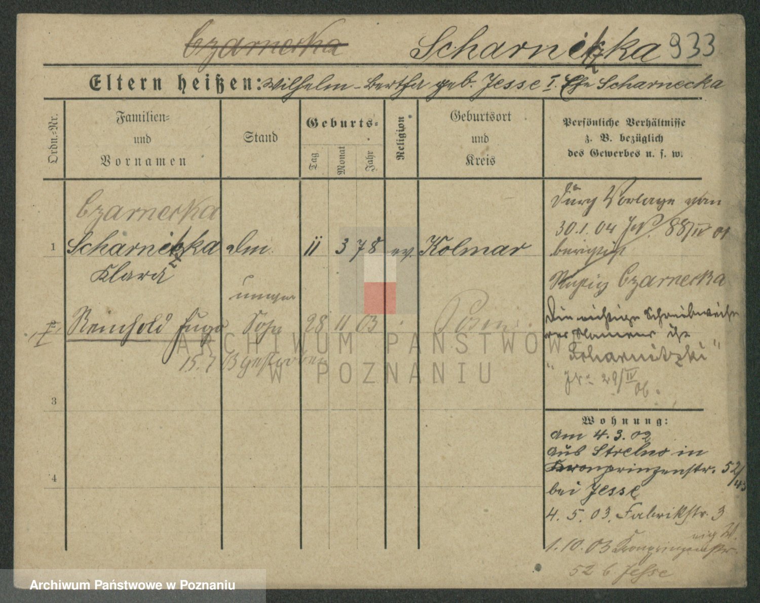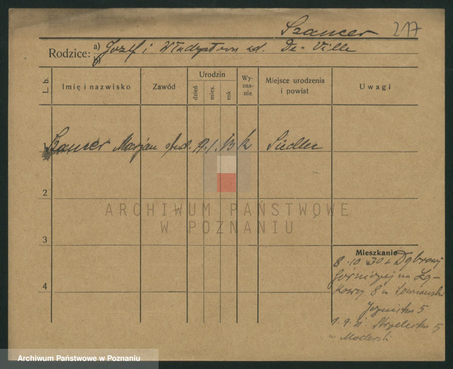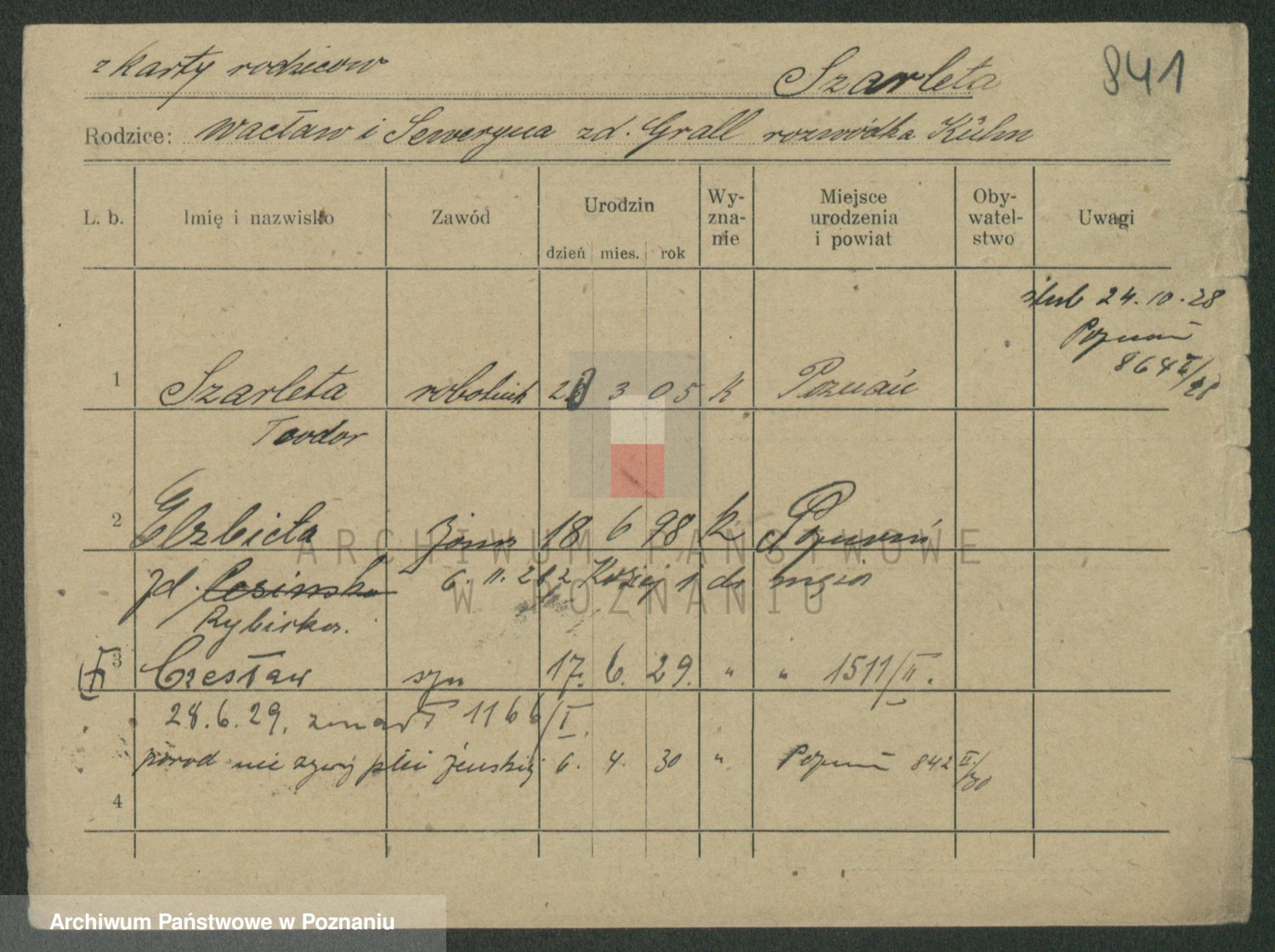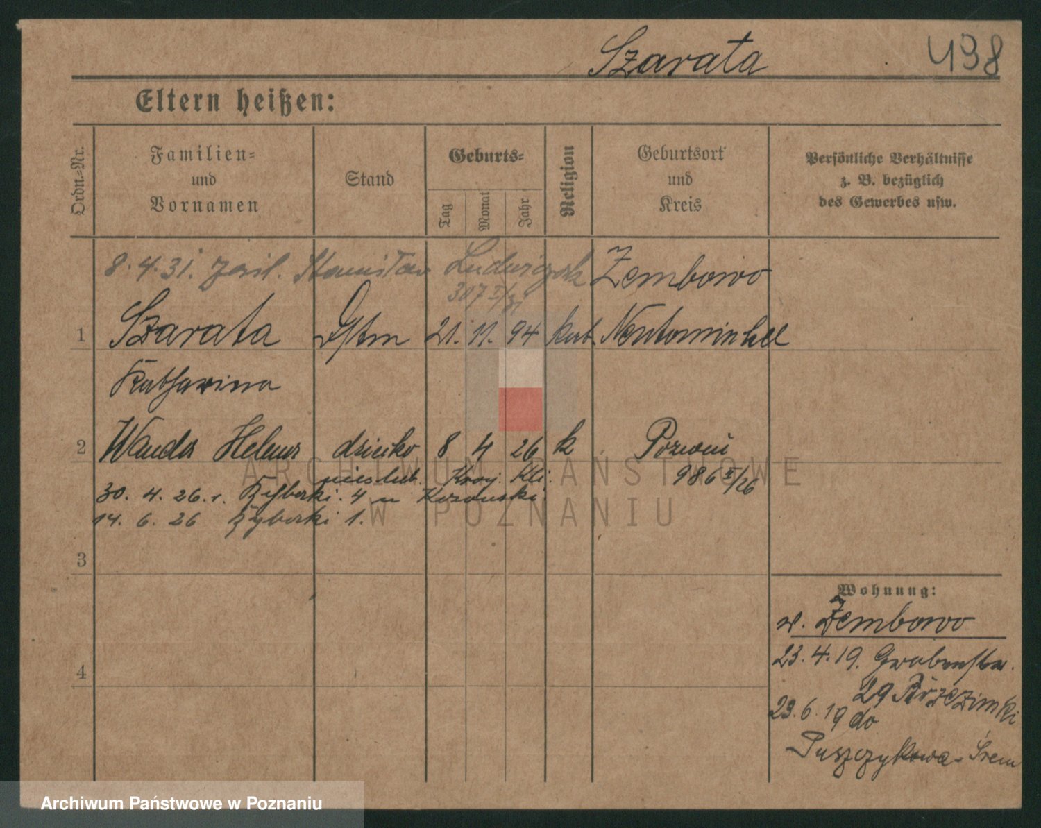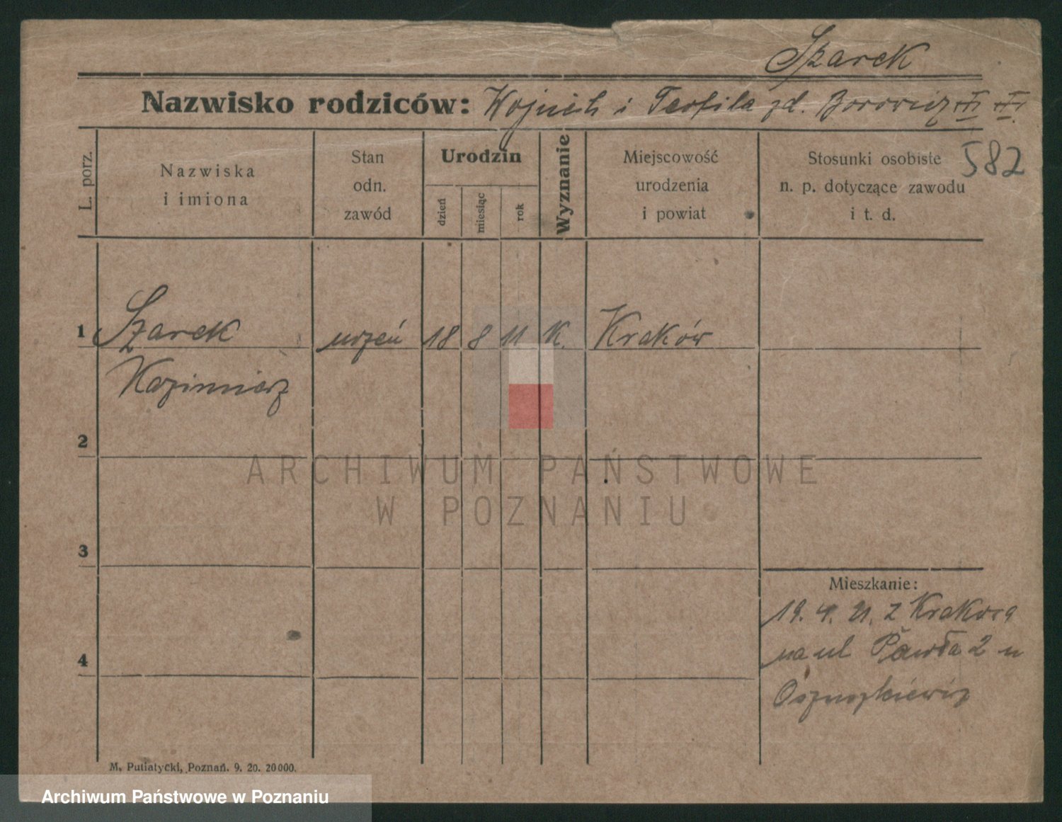 Podgląd karty osobowej dostępny jest po kliknięciu na nazwisko lub ikonkę karty. Można dokonywać powiększenia (ikony na górze) lub przechodzić między kolejnymi skanami (strzałki po bokach).