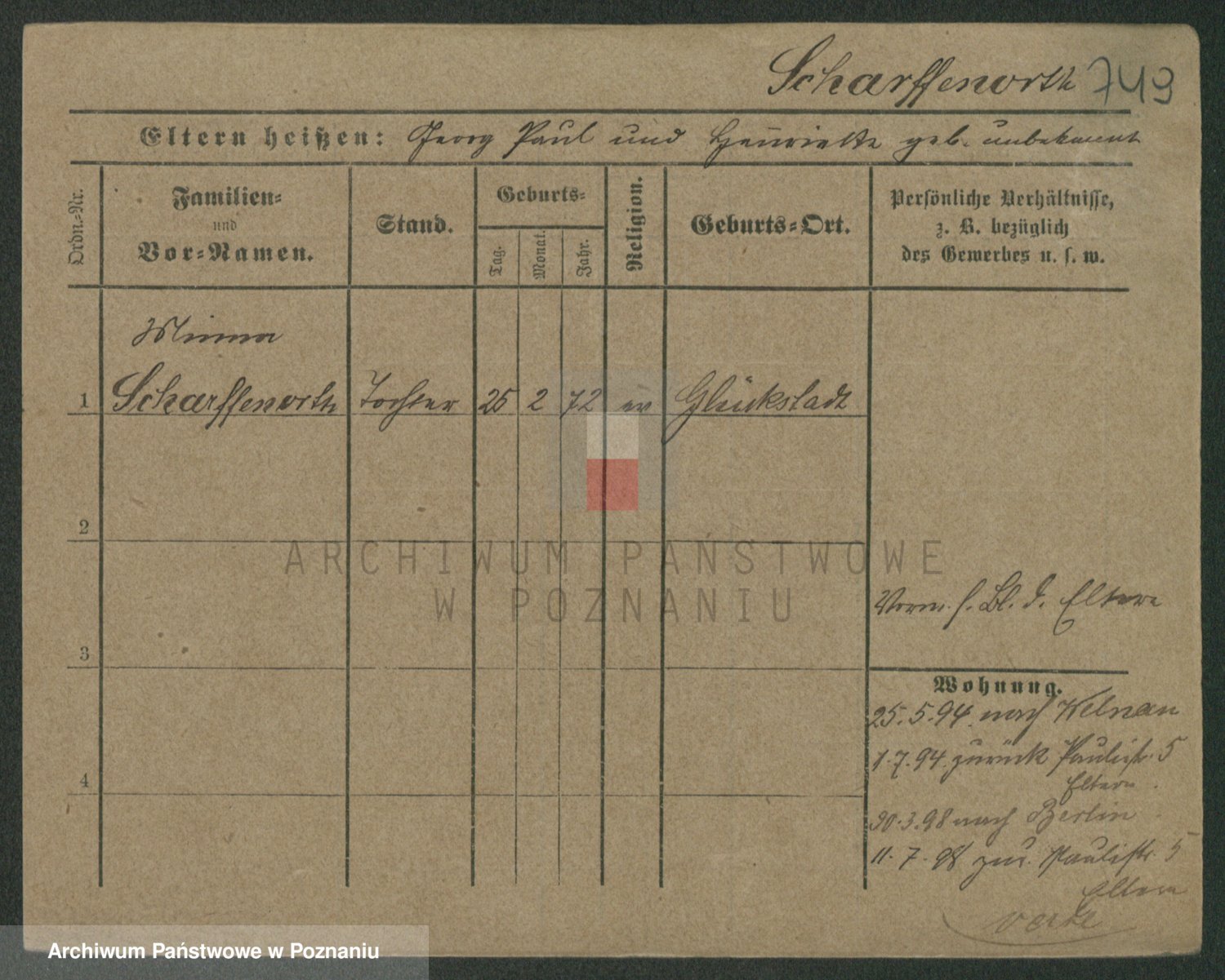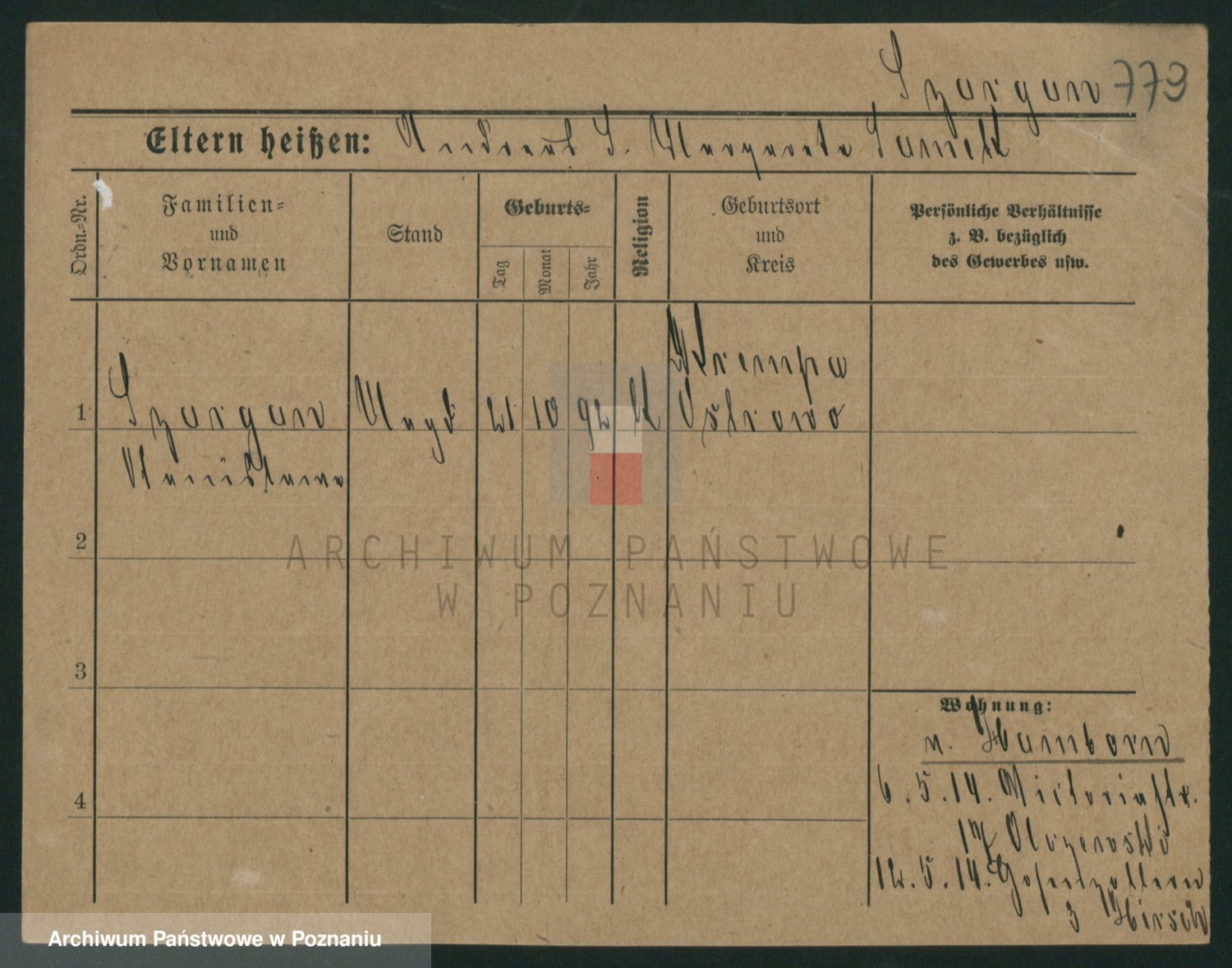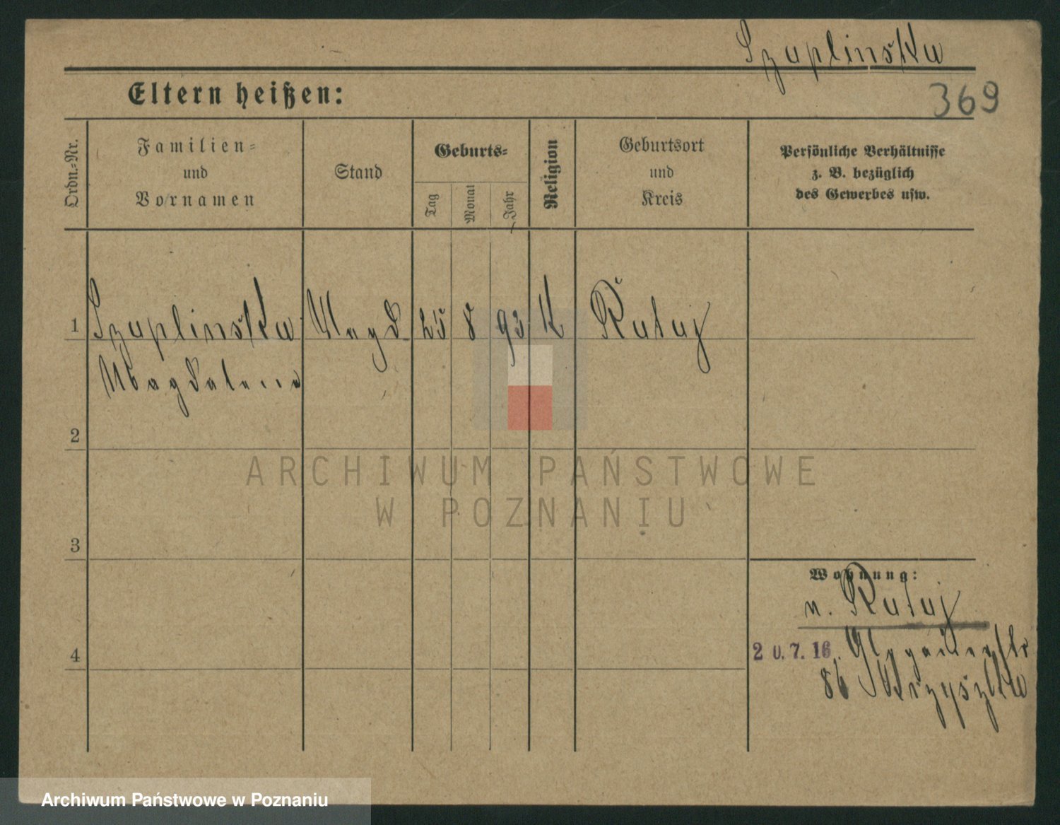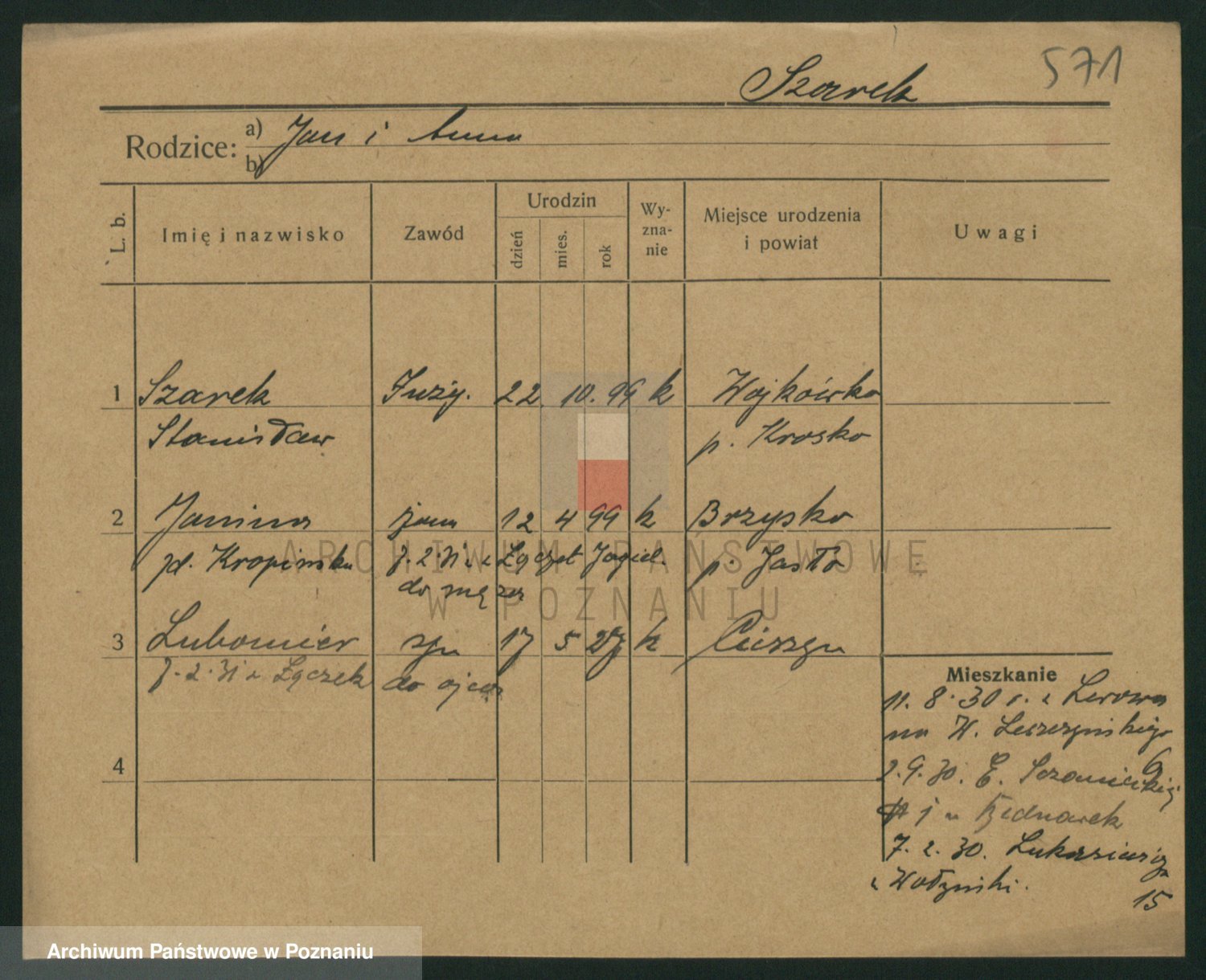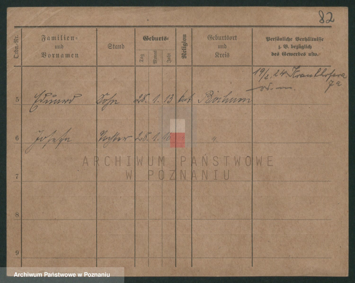 Podgląd karty osobowej dostępny jest po kliknięciu na nazwisko lub ikonkę karty. Można dokonywać powiększenia (ikony na górze) lub przechodzić między kolejnymi skanami (strzałki po bokach).