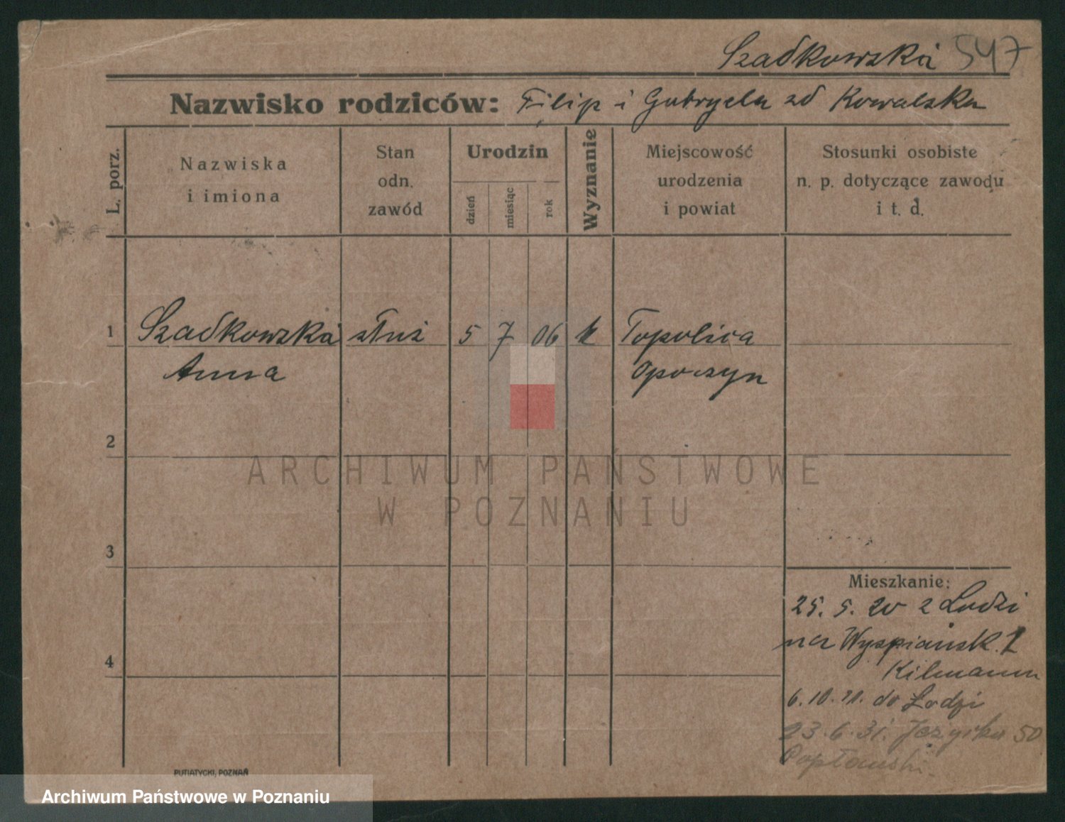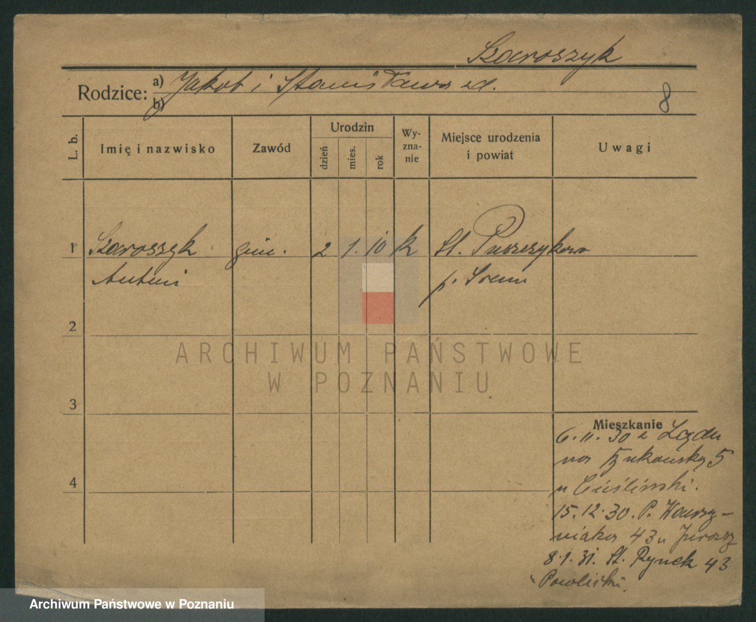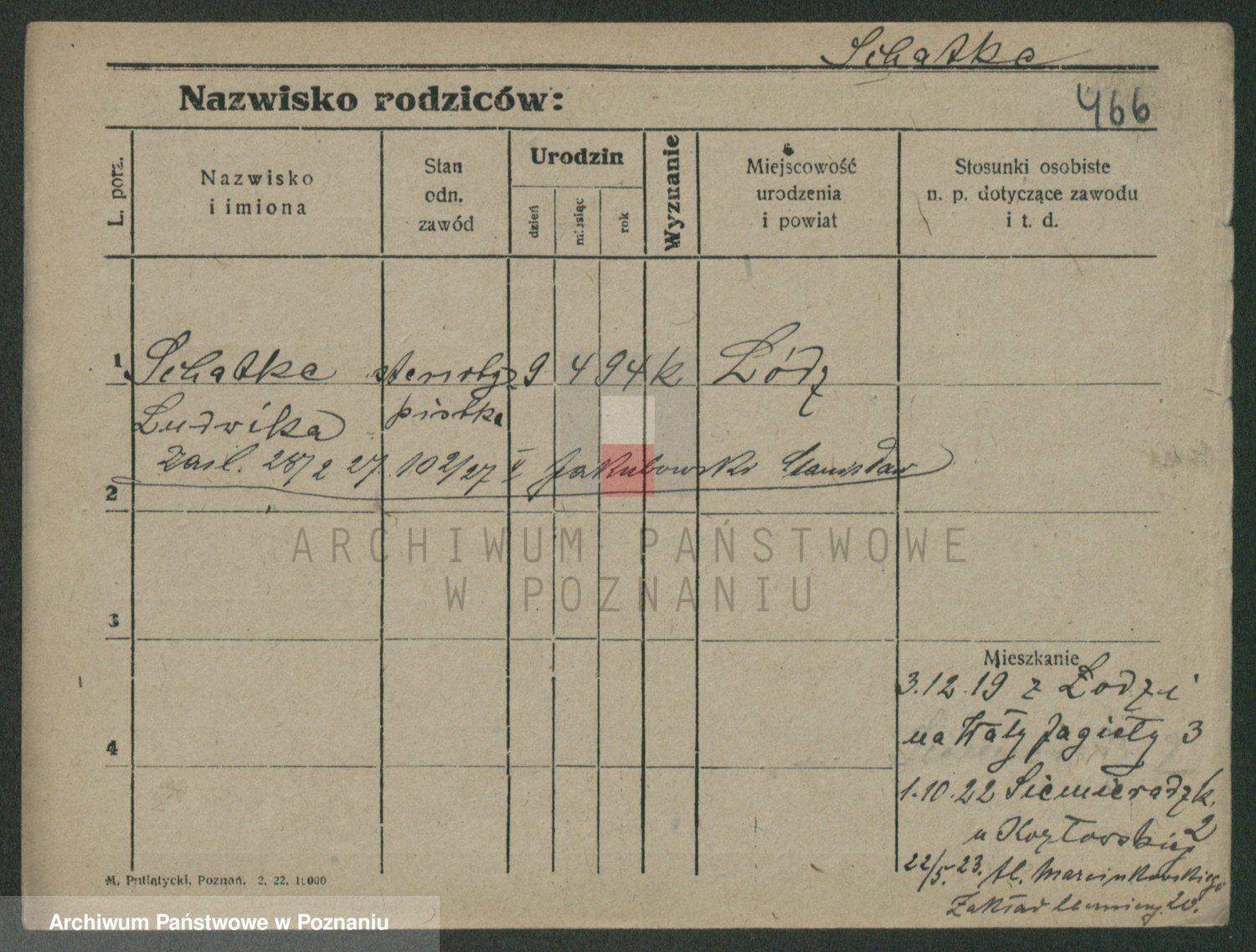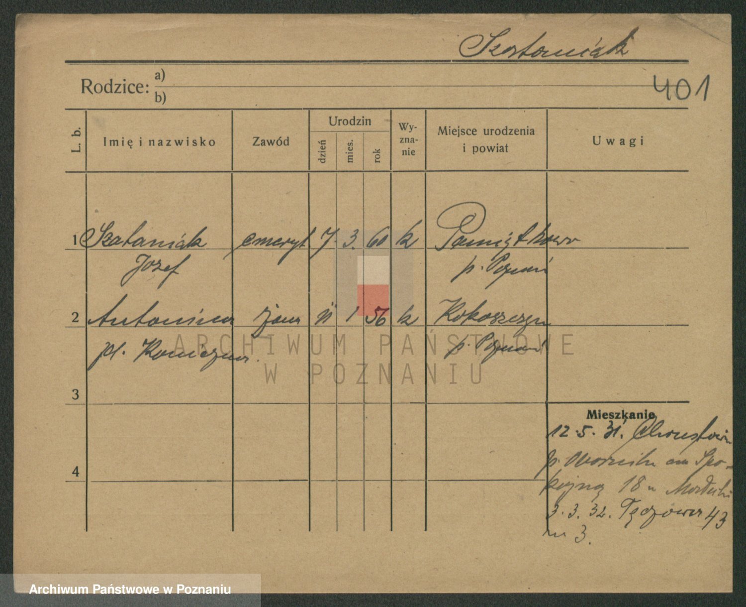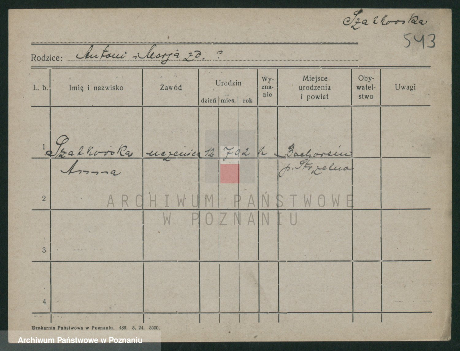 Podgląd karty osobowej dostępny jest po kliknięciu na nazwisko lub ikonkę karty. Można dokonywać powiększenia (ikony na górze) lub przechodzić między kolejnymi skanami (strzałki po bokach).
