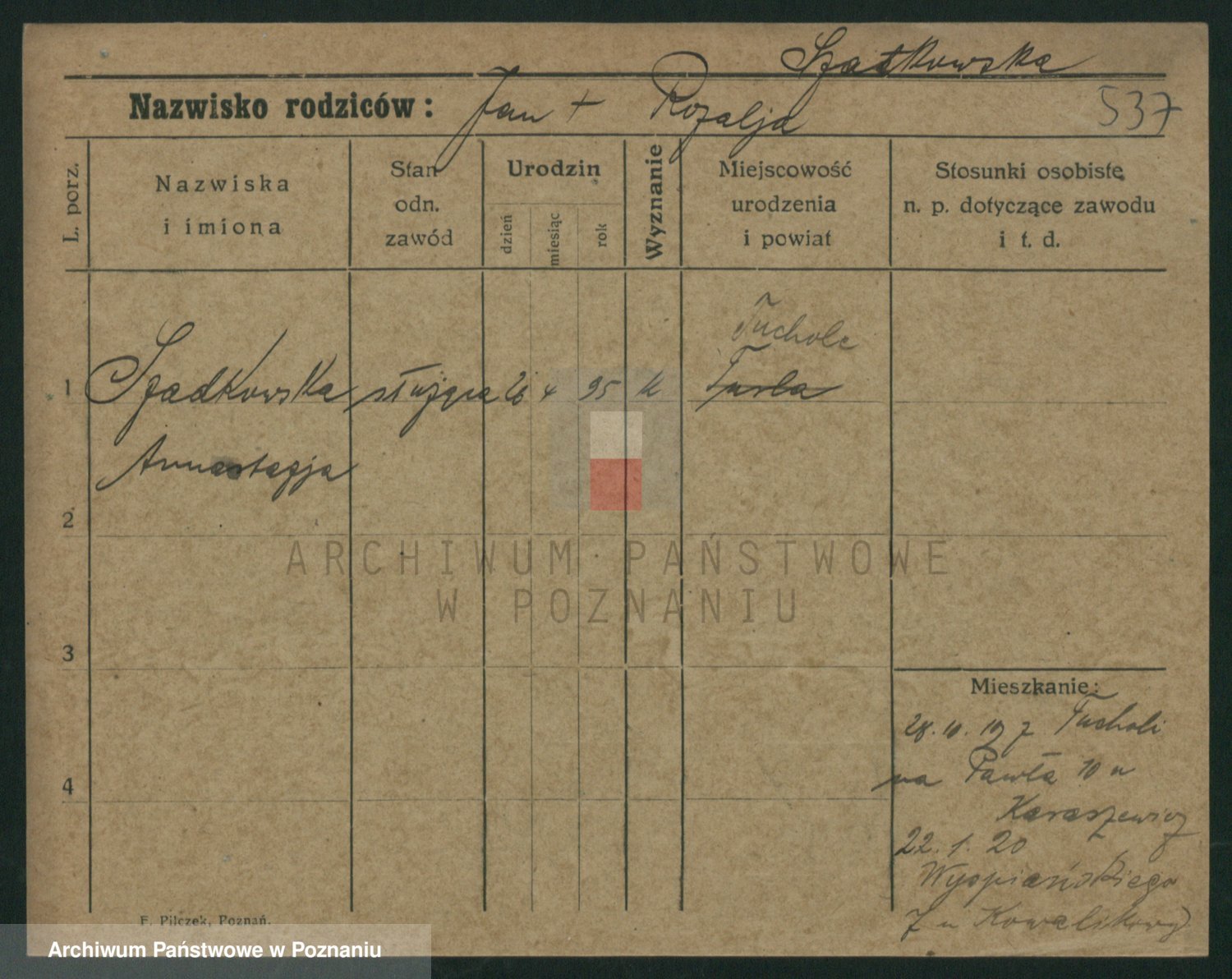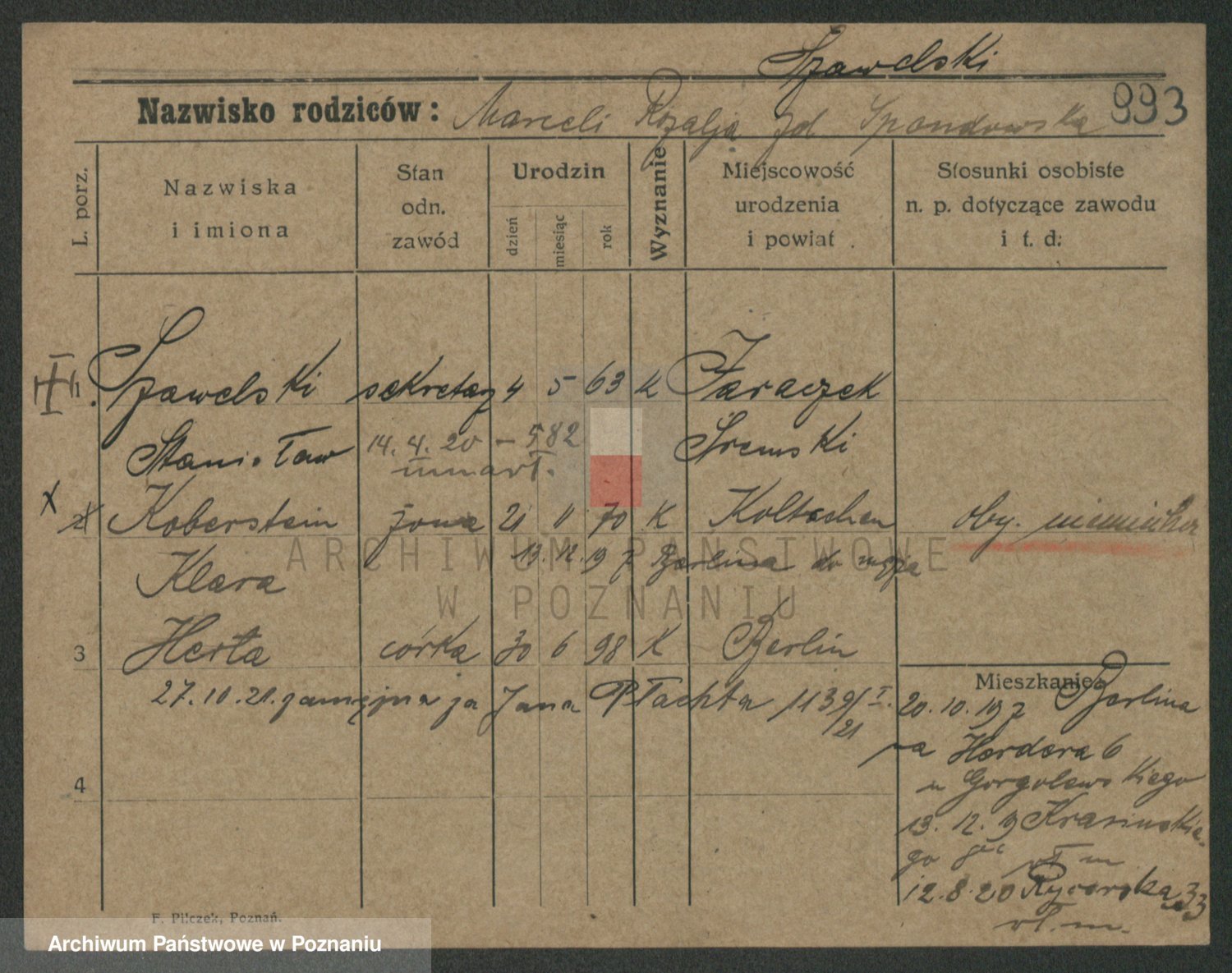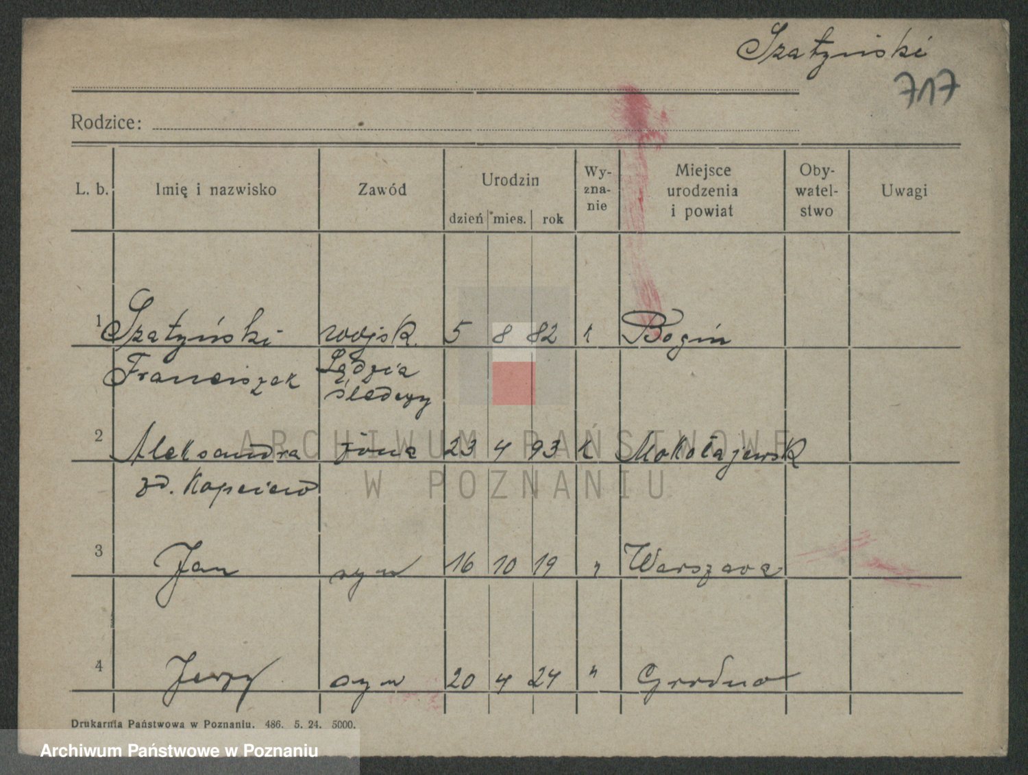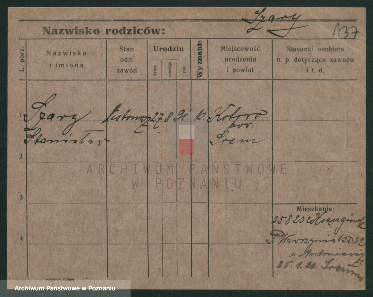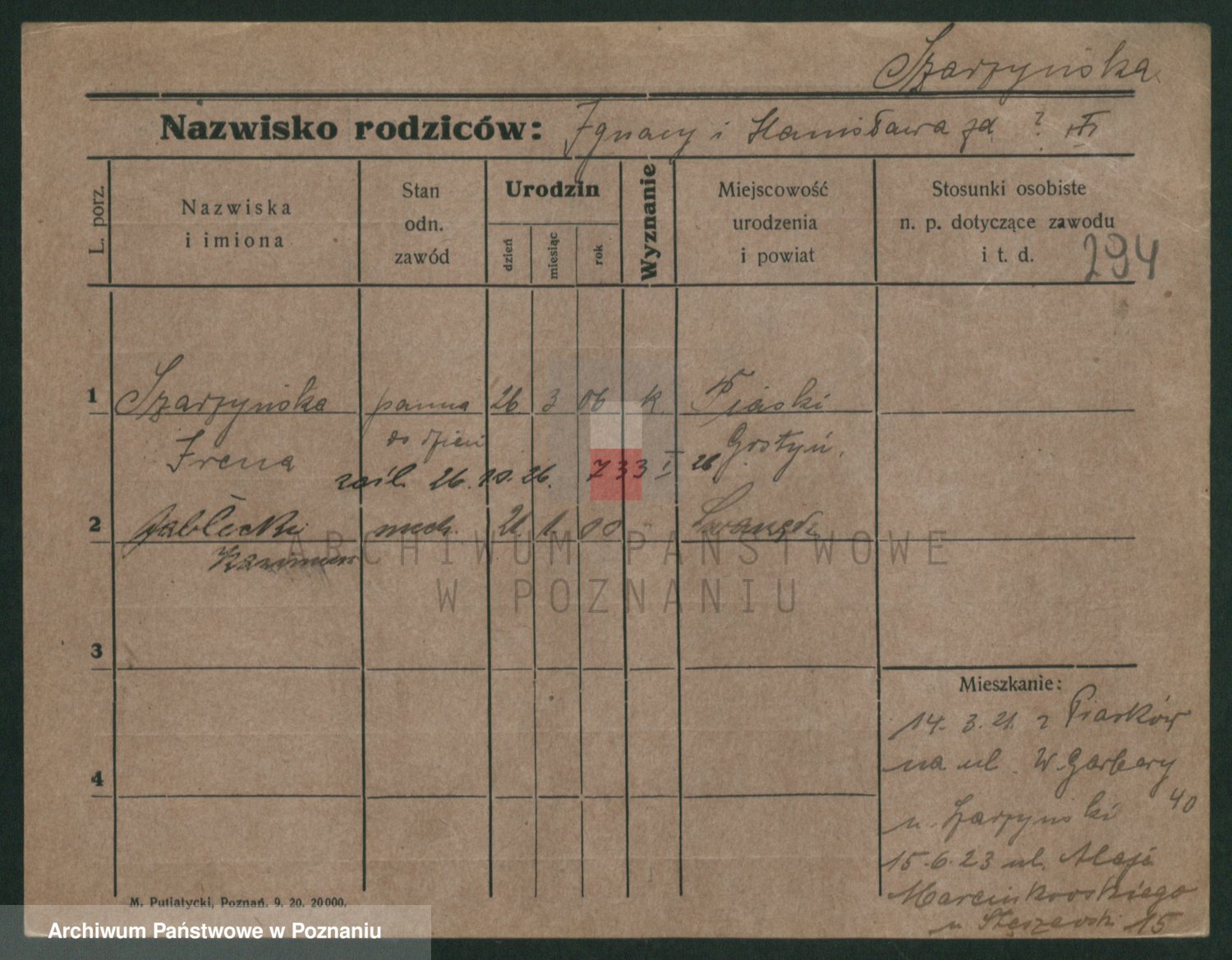Podgląd karty osobowej dostępny jest po kliknięciu na nazwisko lub ikonkę karty. Można dokonywać powiększenia (ikony na górze) lub przechodzić między kolejnymi skanami (strzałki po bokach).