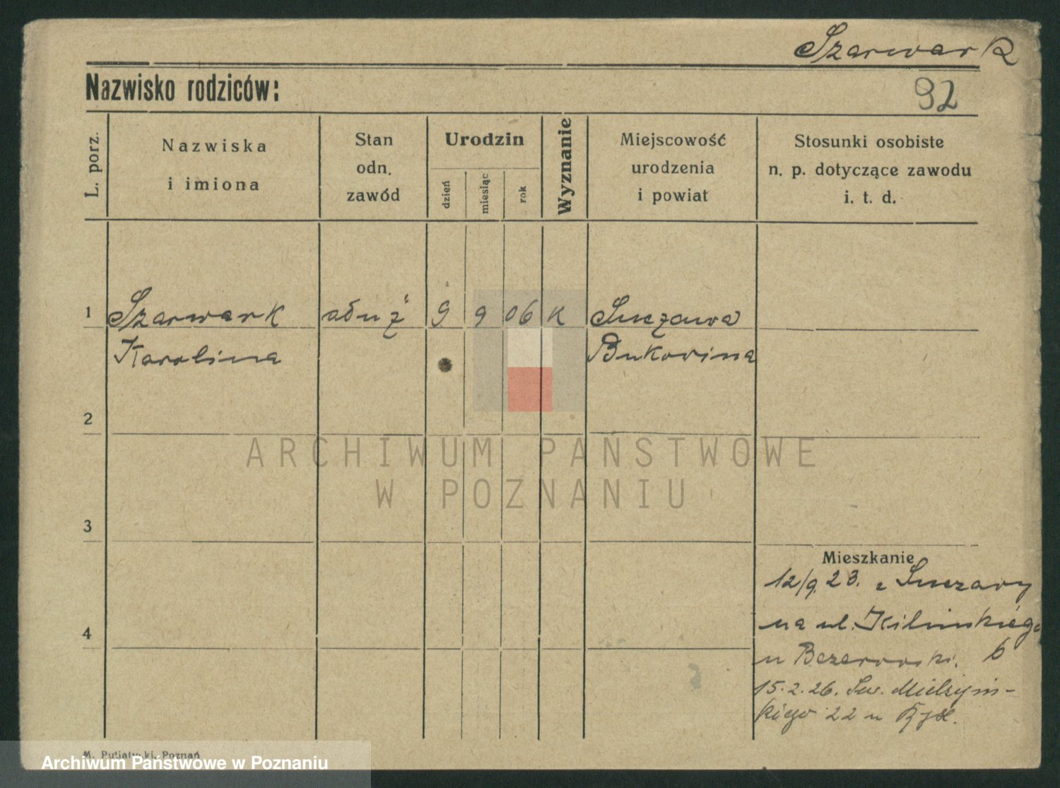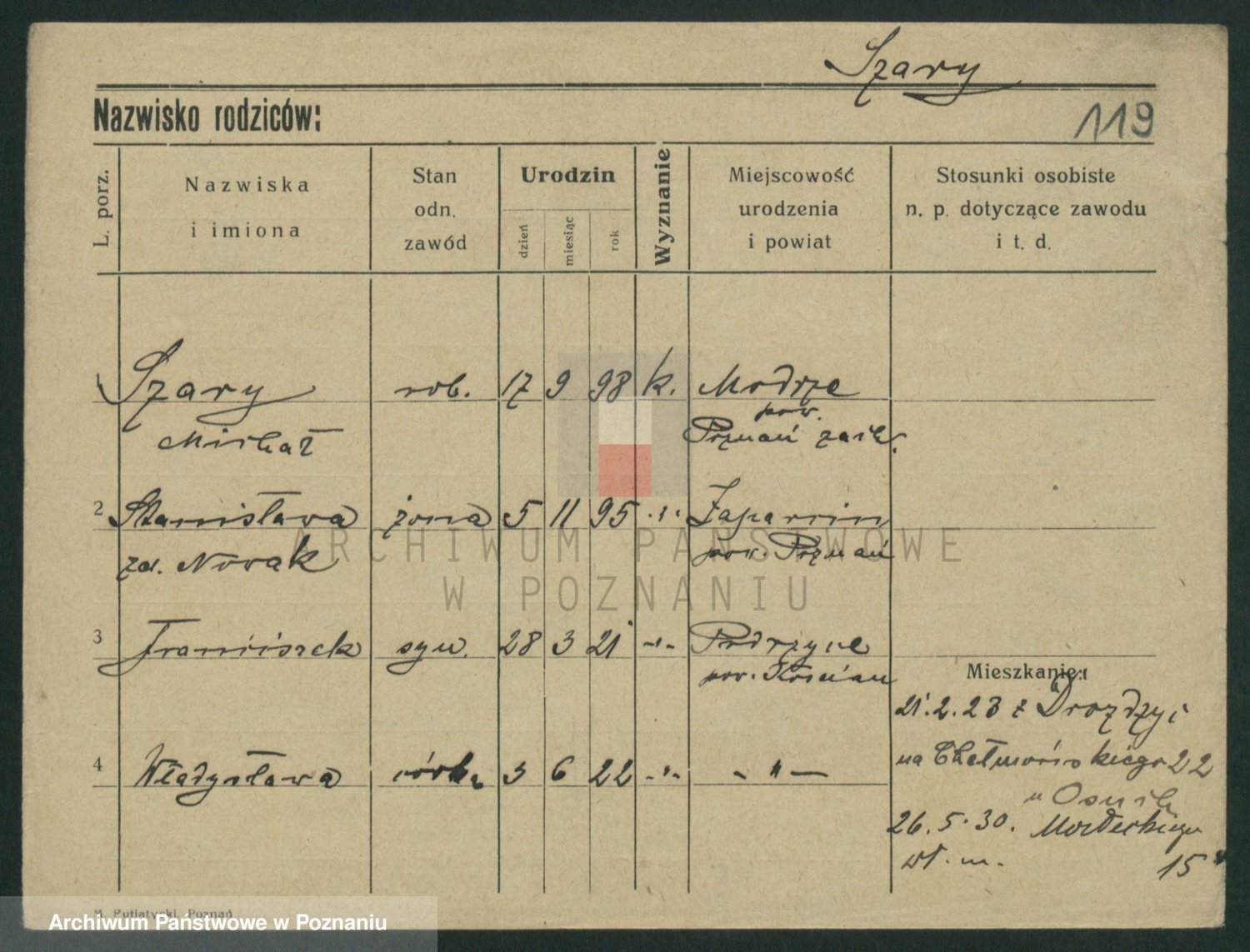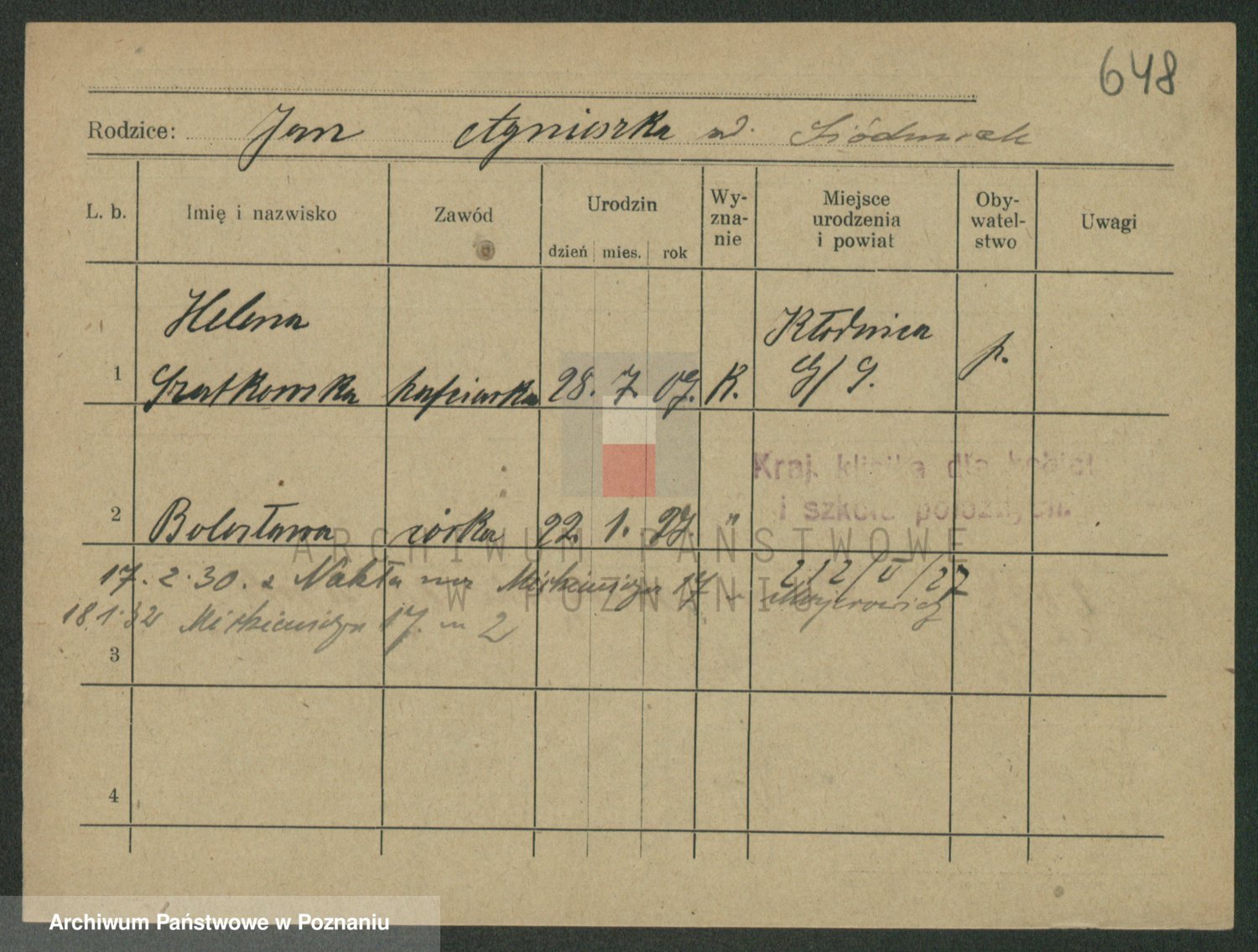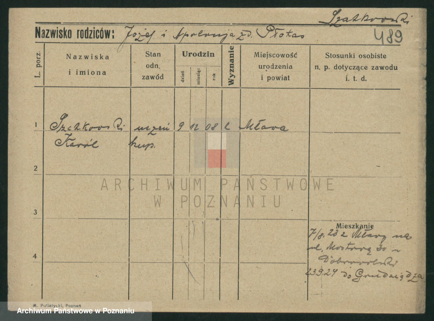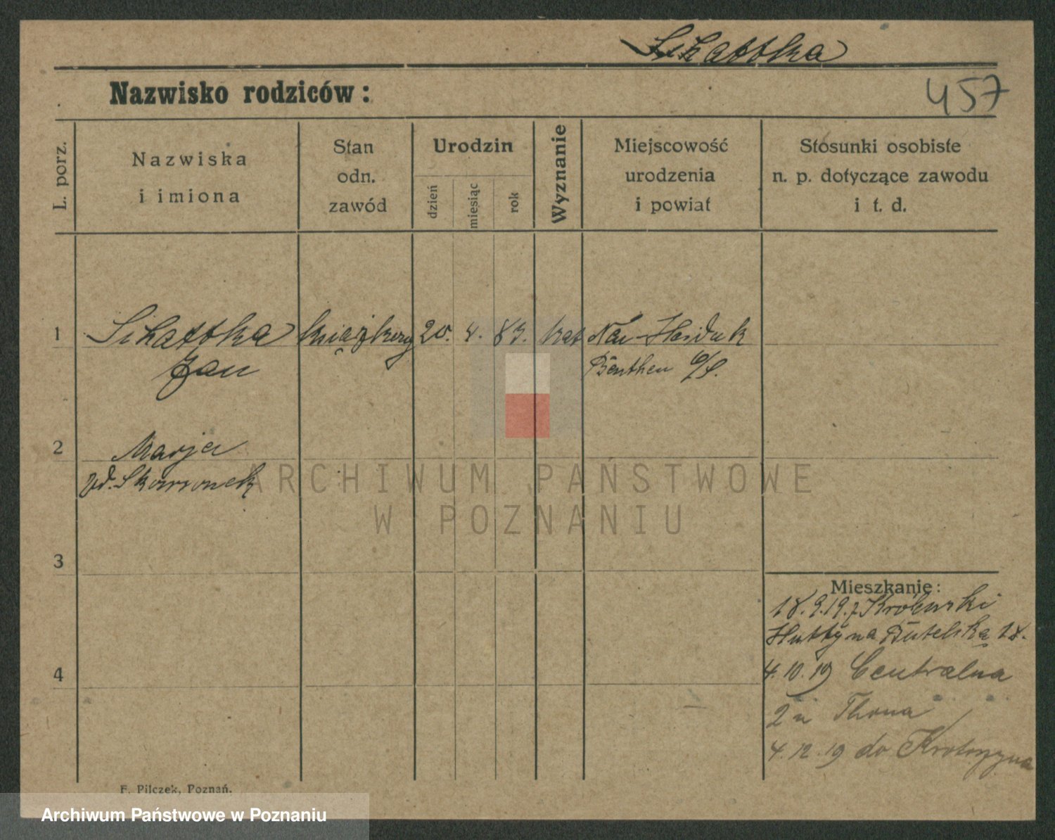 Podgląd karty osobowej dostępny jest po kliknięciu na nazwisko lub ikonkę karty. Można dokonywać powiększenia (ikony na górze) lub przechodzić między kolejnymi skanami (strzałki po bokach).