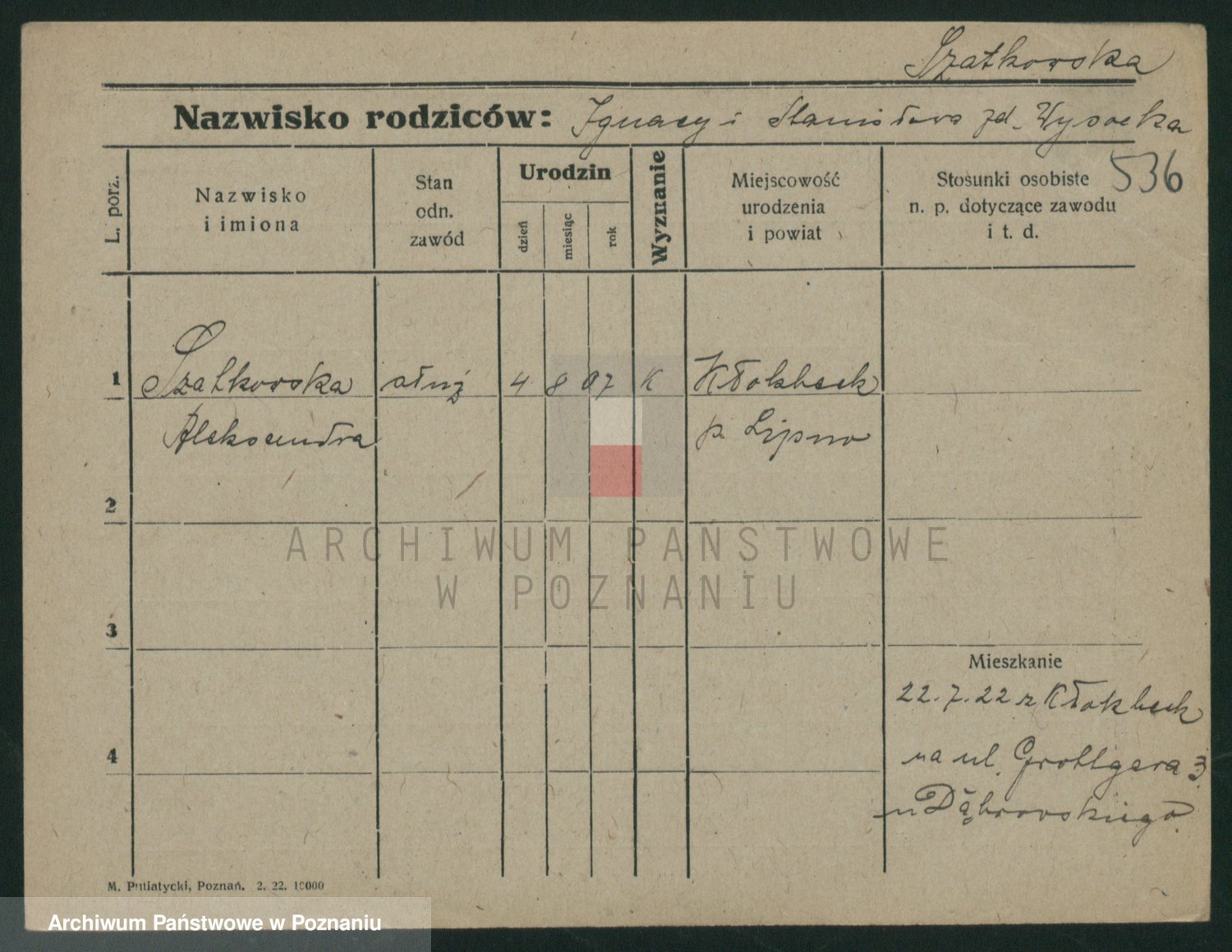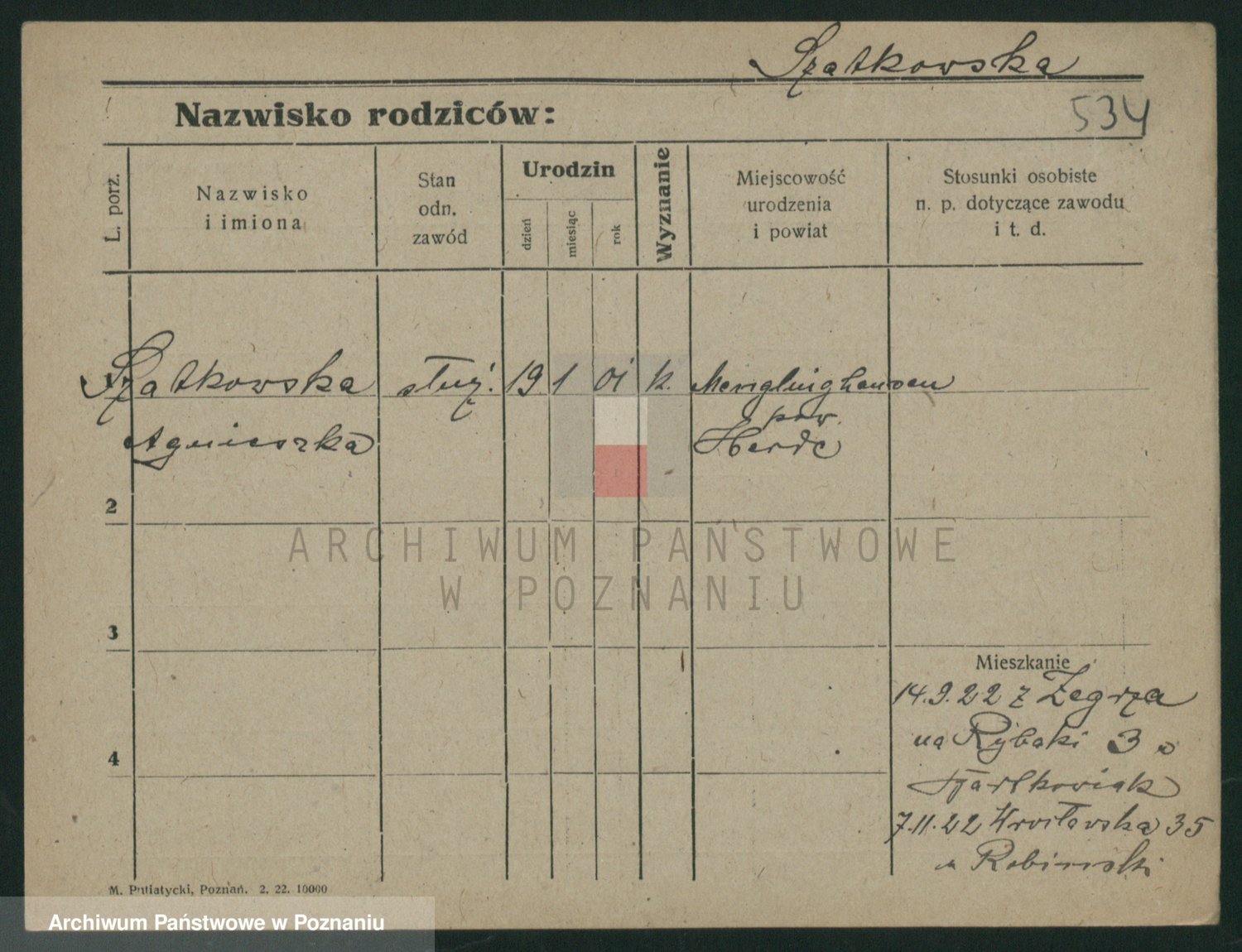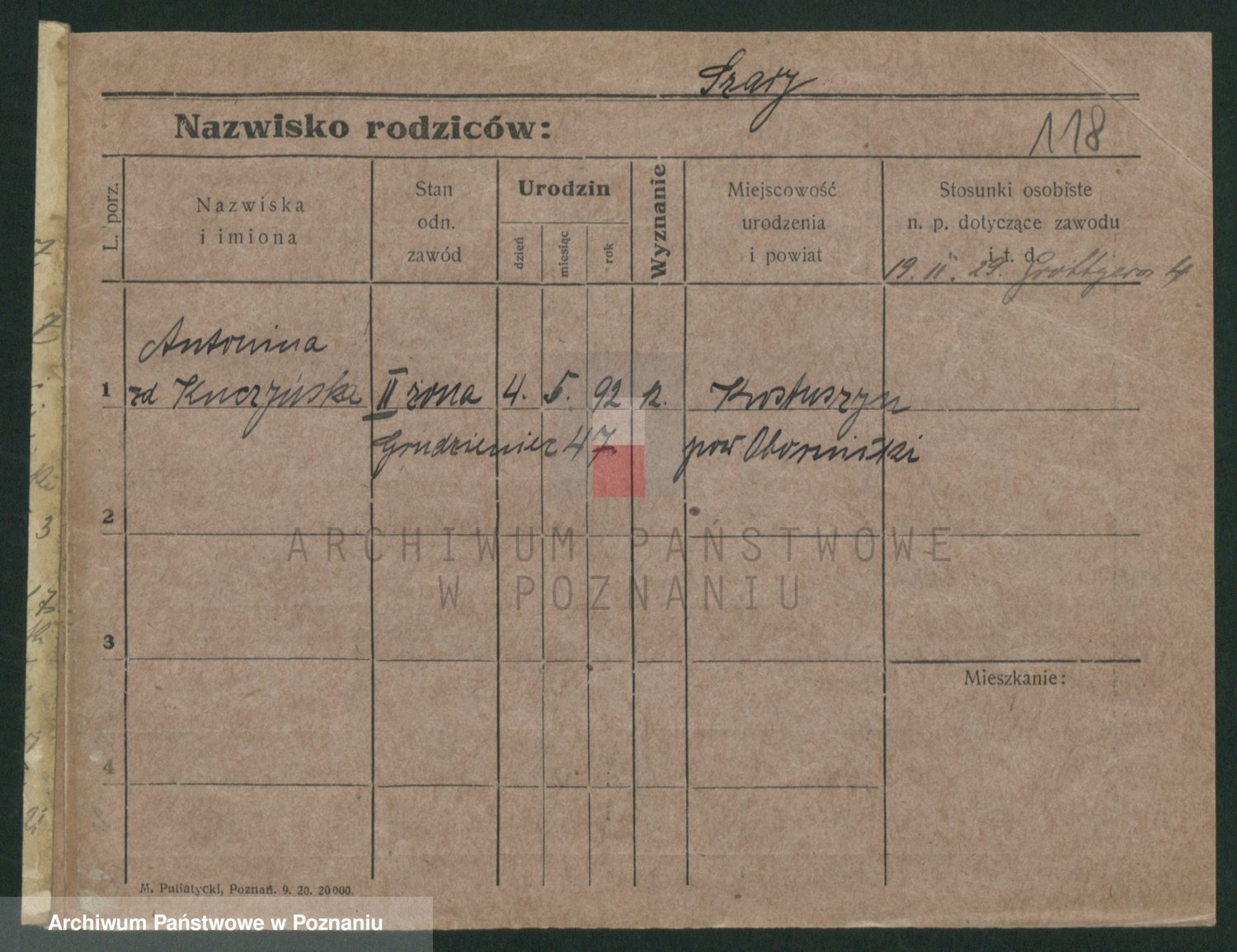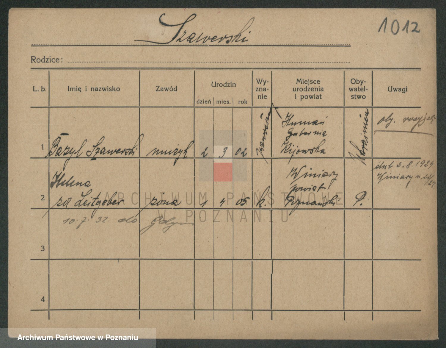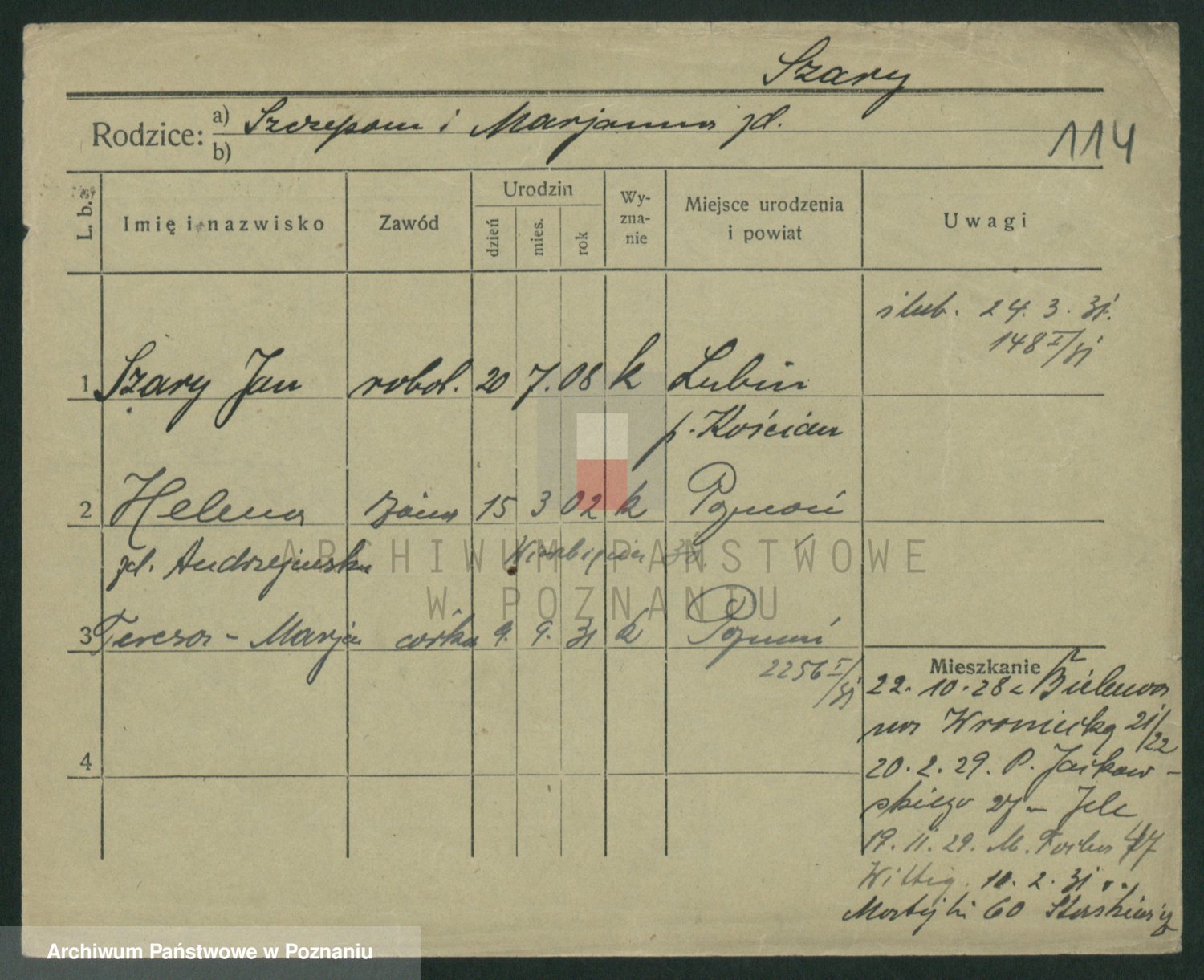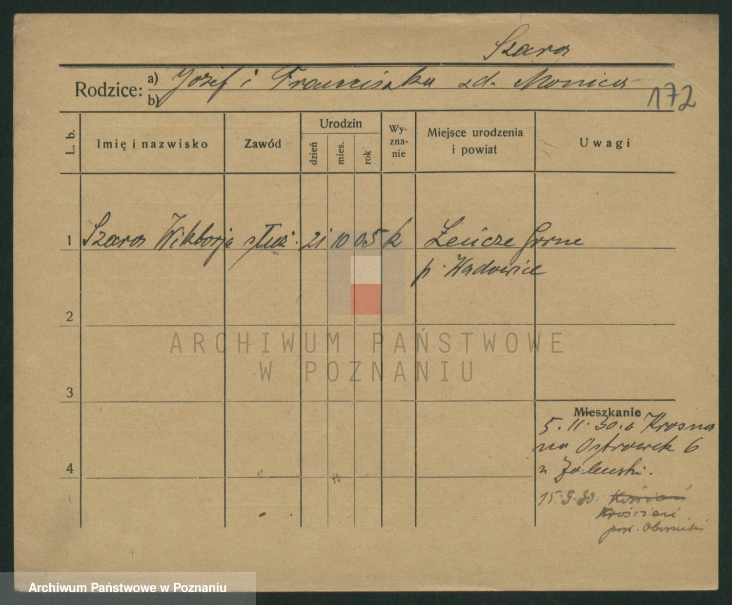 Podgląd karty osobowej dostępny jest po kliknięciu na nazwisko lub ikonkę karty. Można dokonywać powiększenia (ikony na górze) lub przechodzić między kolejnymi skanami (strzałki po bokach).