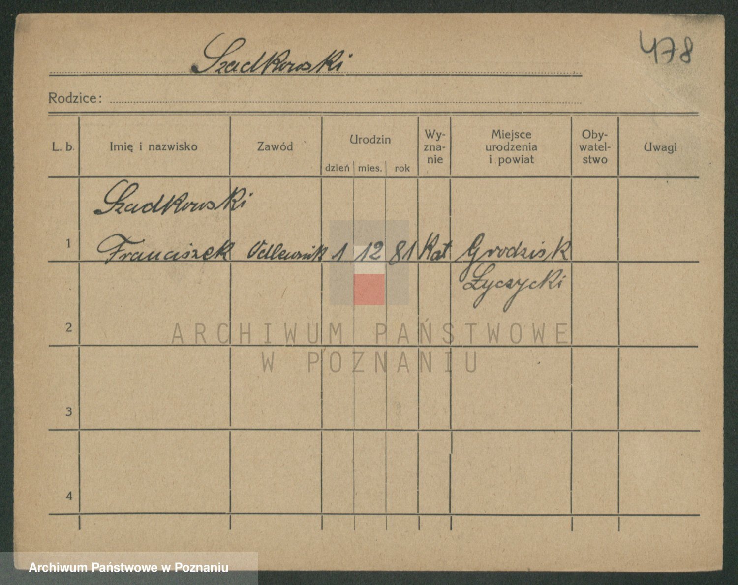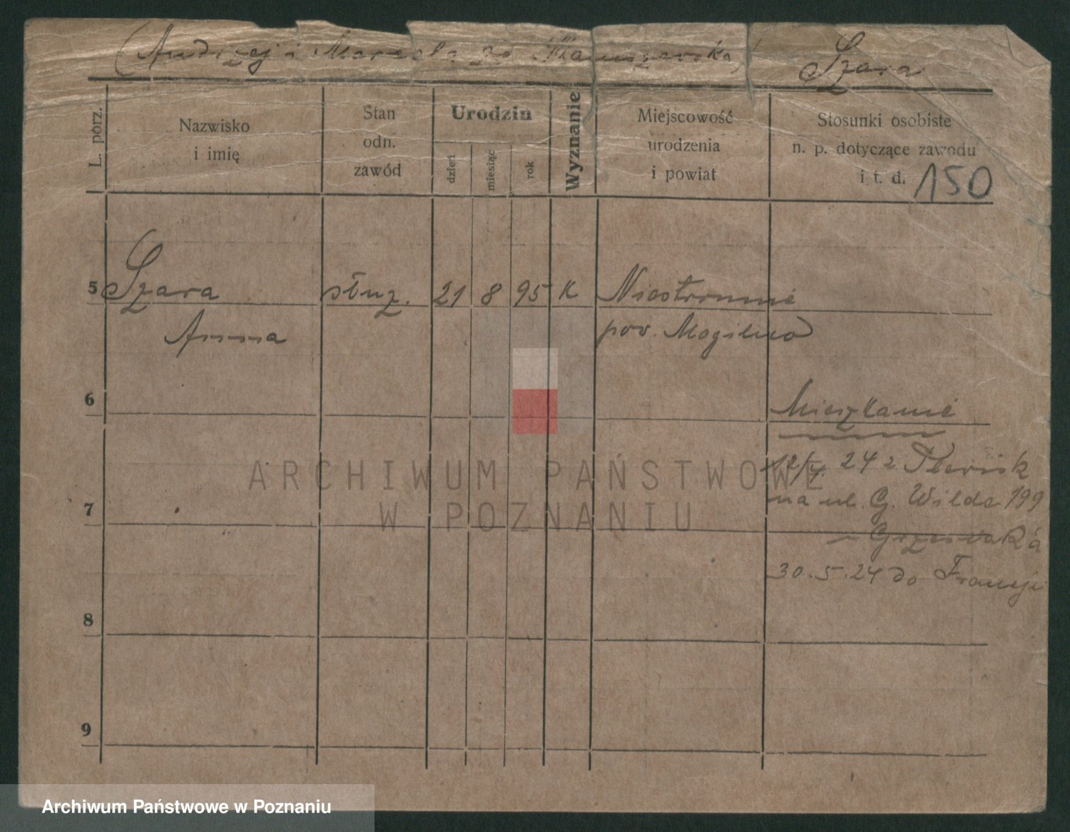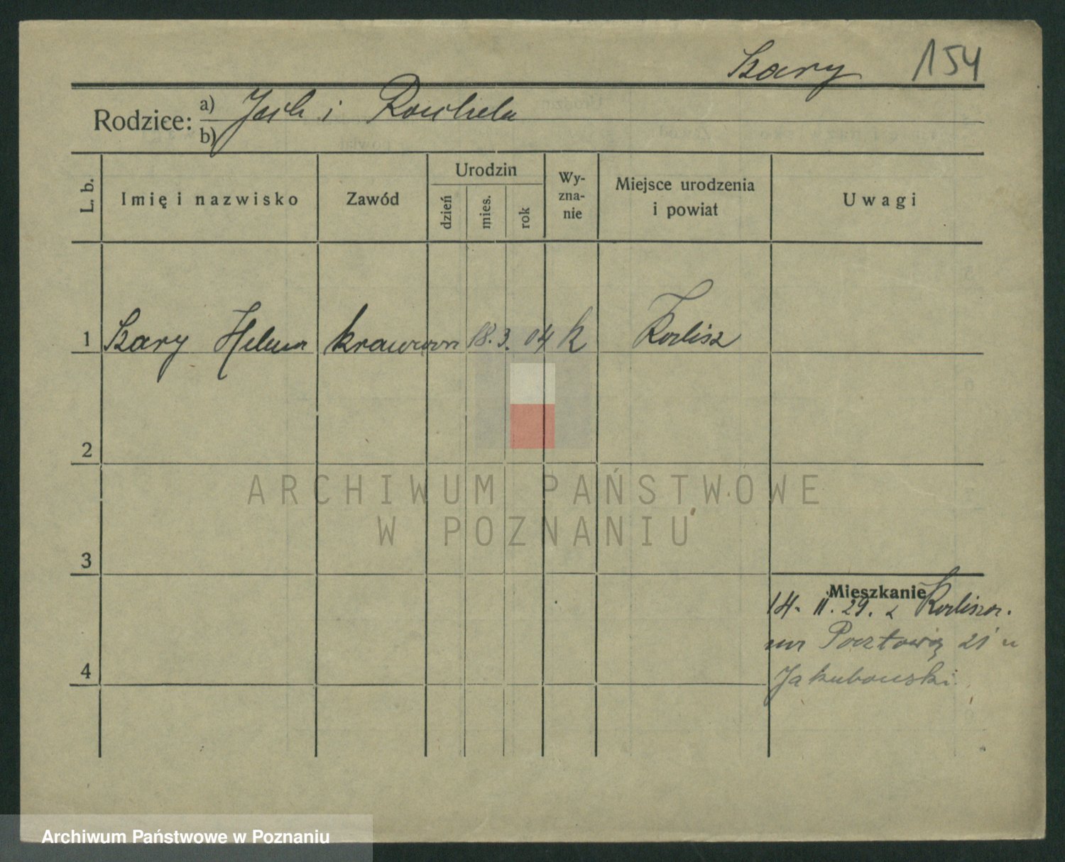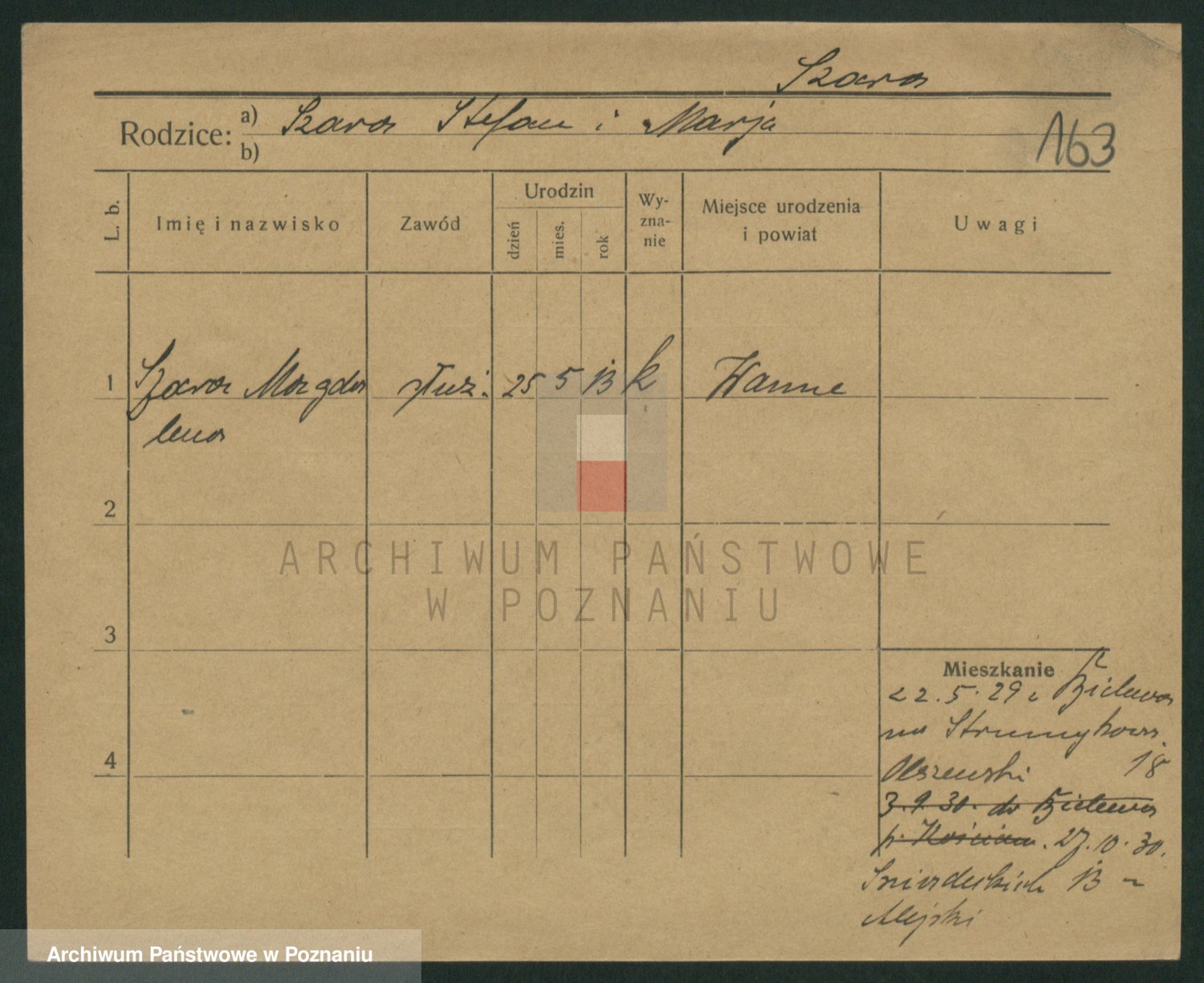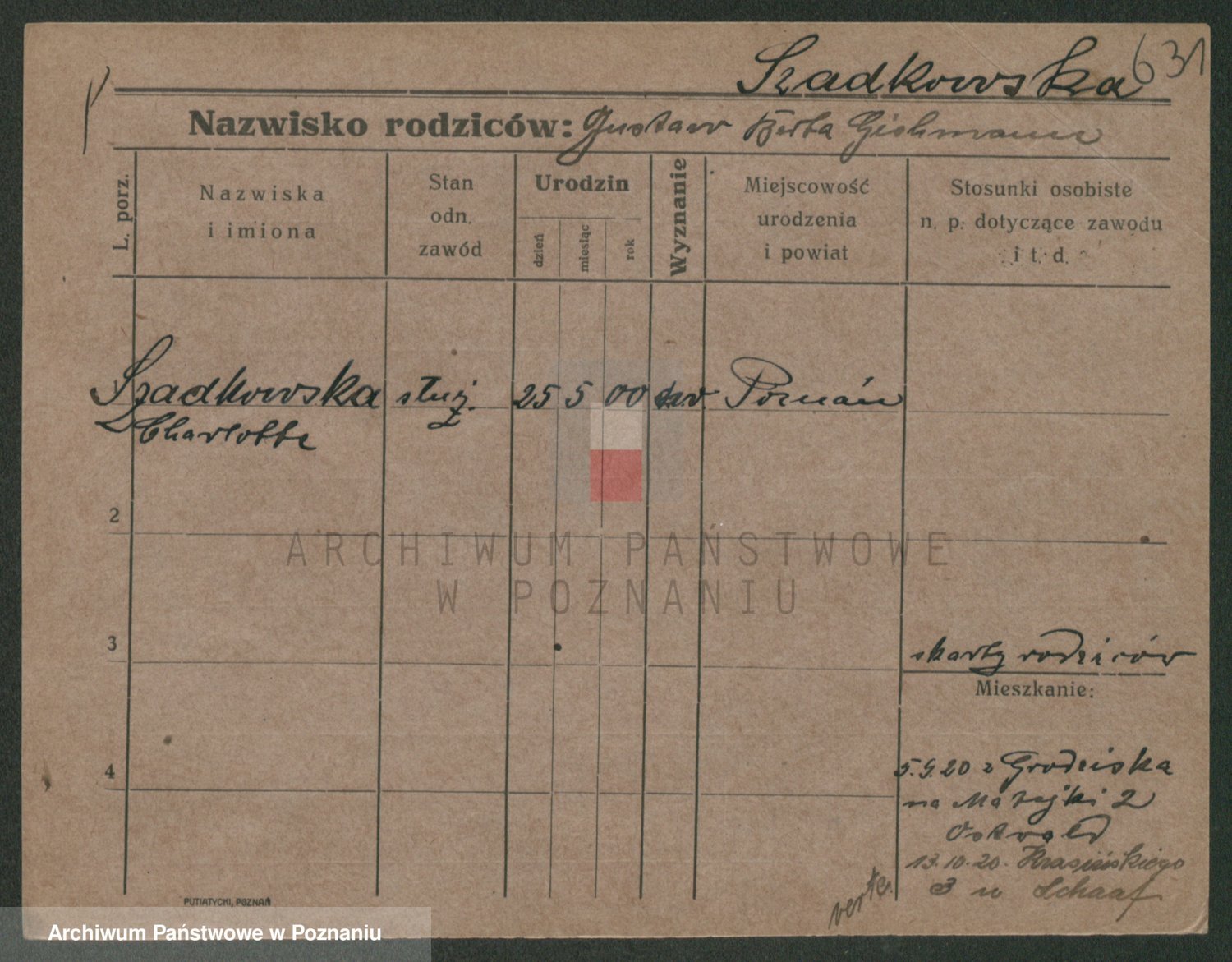 Podgląd karty osobowej dostępny jest po kliknięciu na nazwisko lub ikonkę karty. Można dokonywać powiększenia (ikony na górze) lub przechodzić między kolejnymi skanami (strzałki po bokach).