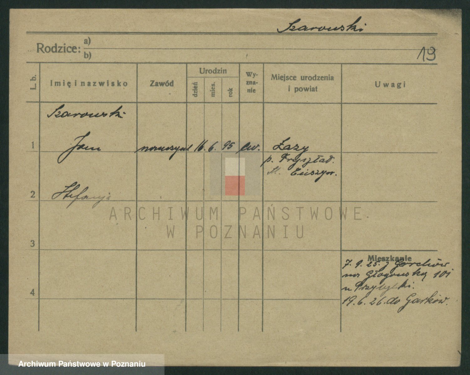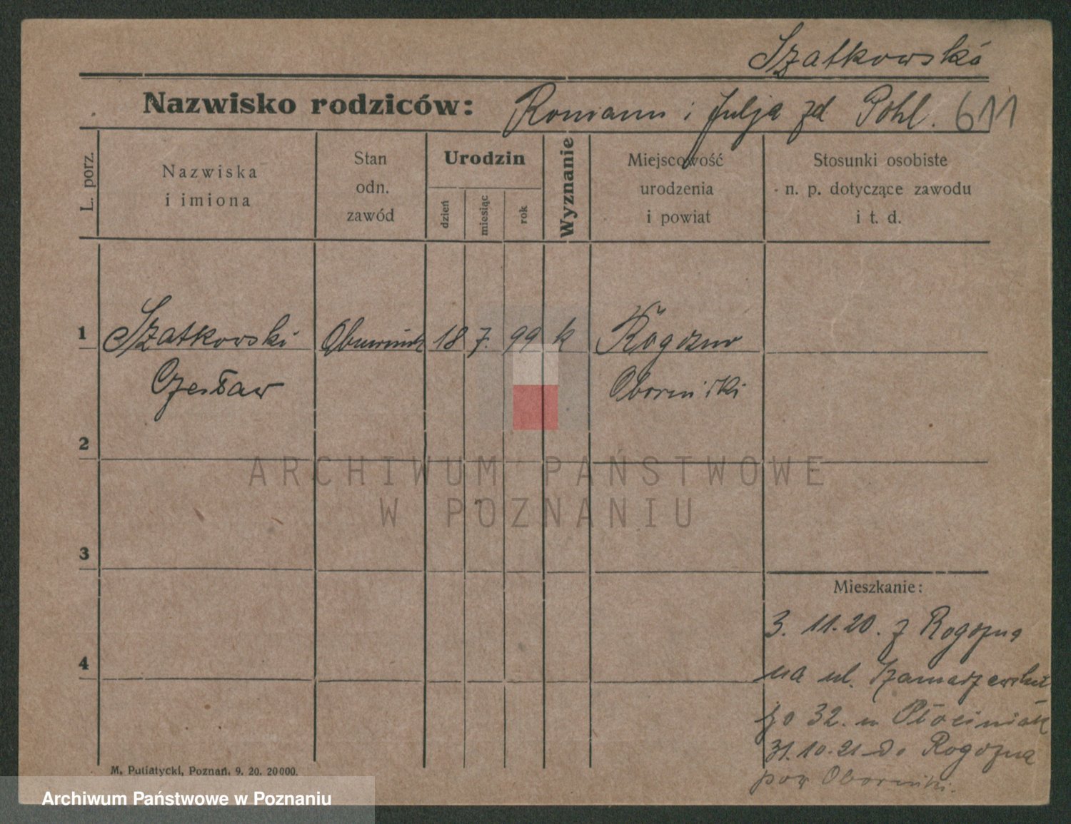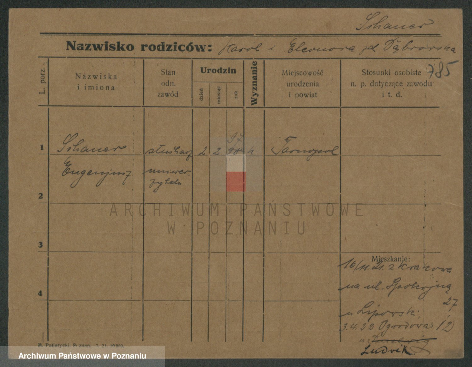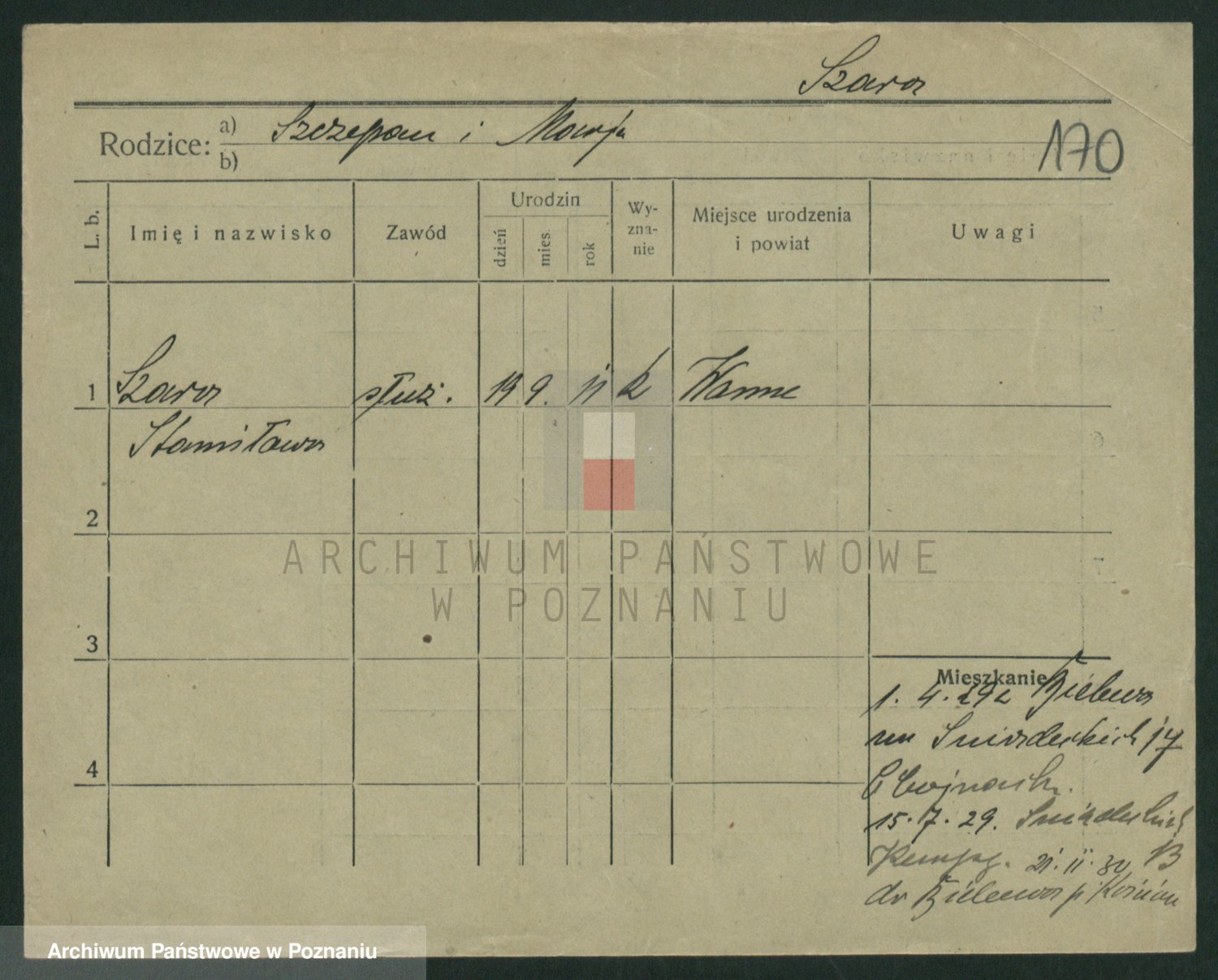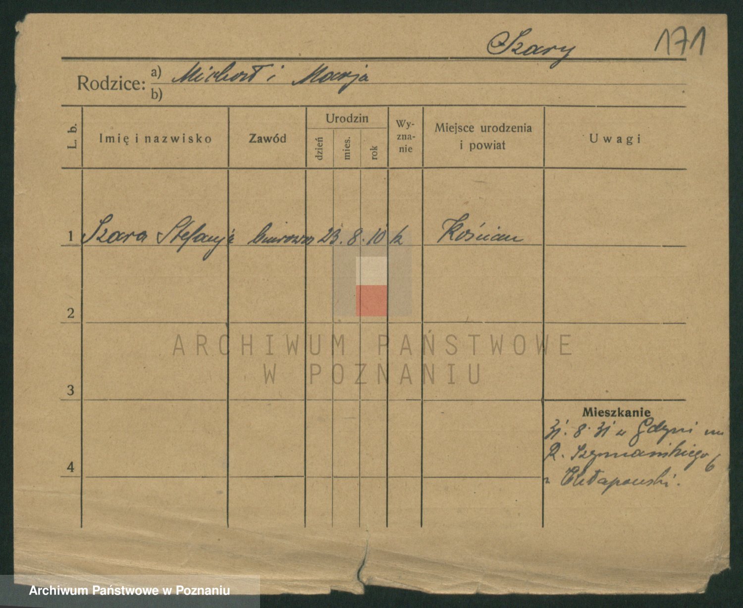 Podgląd karty osobowej dostępny jest po kliknięciu na nazwisko lub ikonkę karty. Można dokonywać powiększenia (ikony na górze) lub przechodzić między kolejnymi skanami (strzałki po bokach).