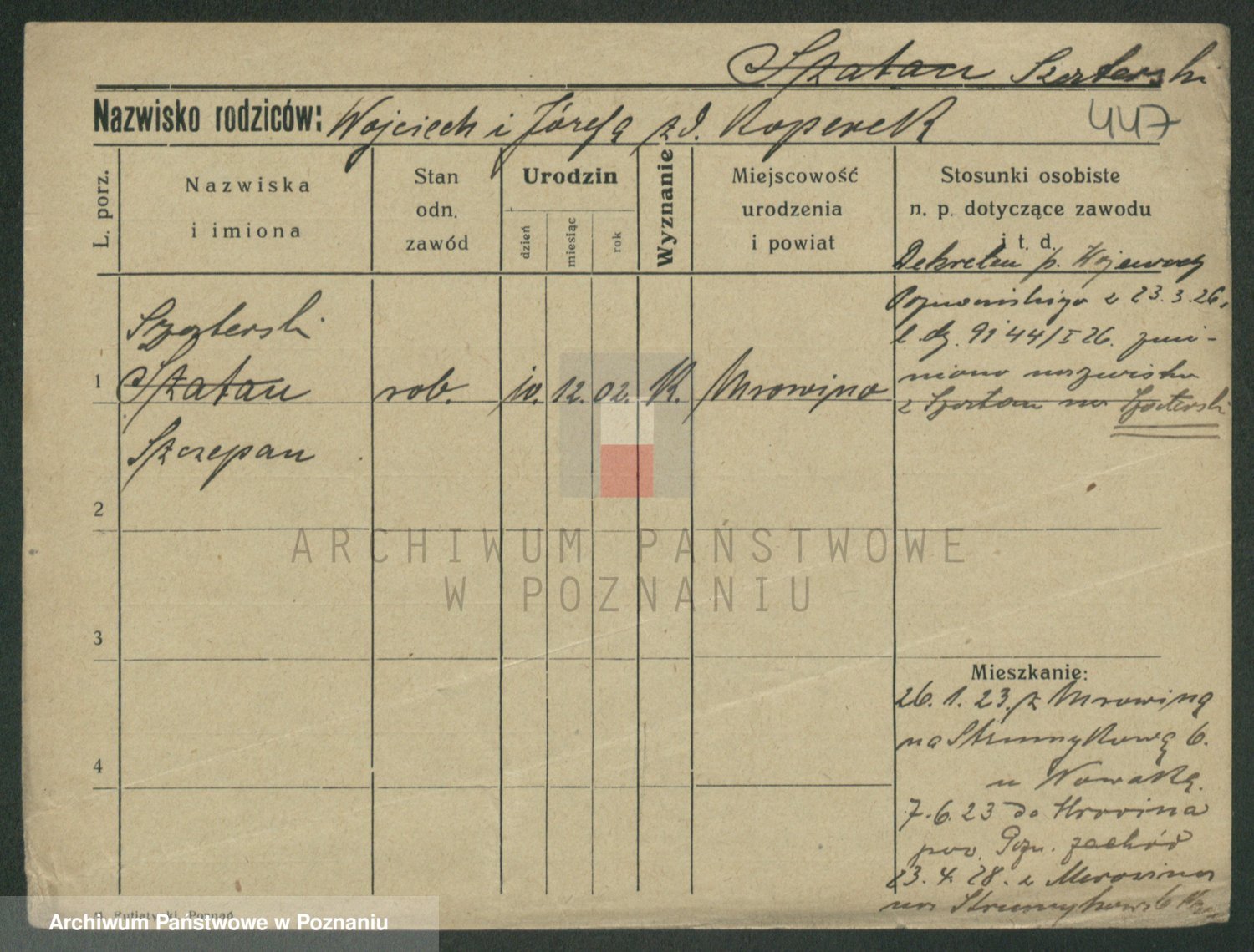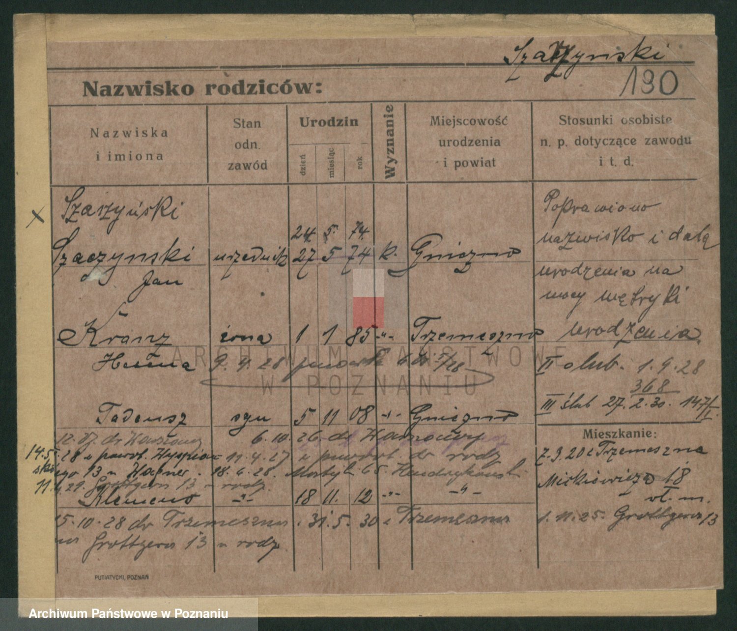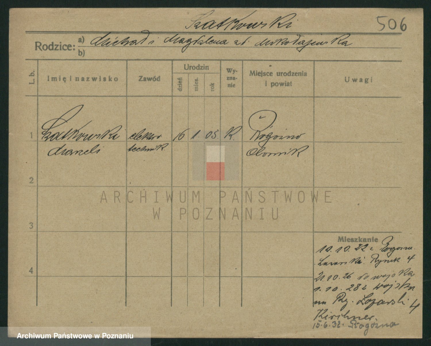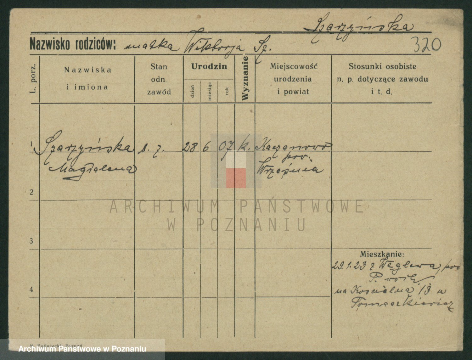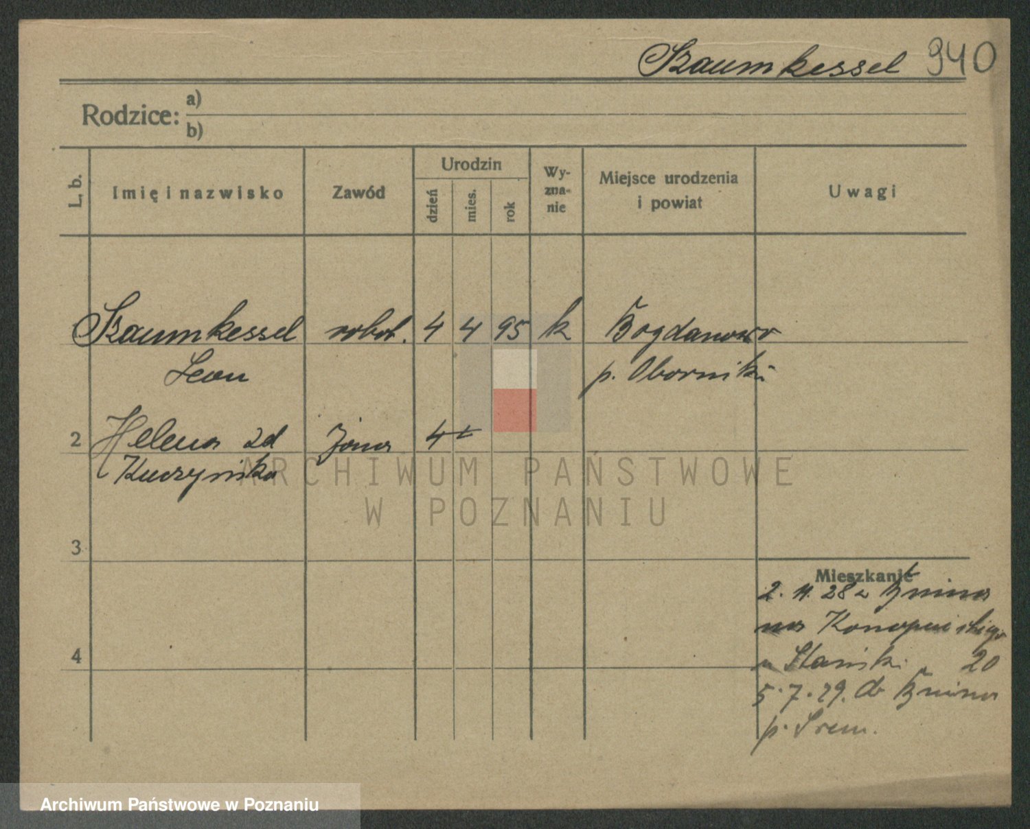 Podgląd karty osobowej dostępny jest po kliknięciu na nazwisko lub ikonkę karty. Można dokonywać powiększenia (ikony na górze) lub przechodzić między kolejnymi skanami (strzałki po bokach).