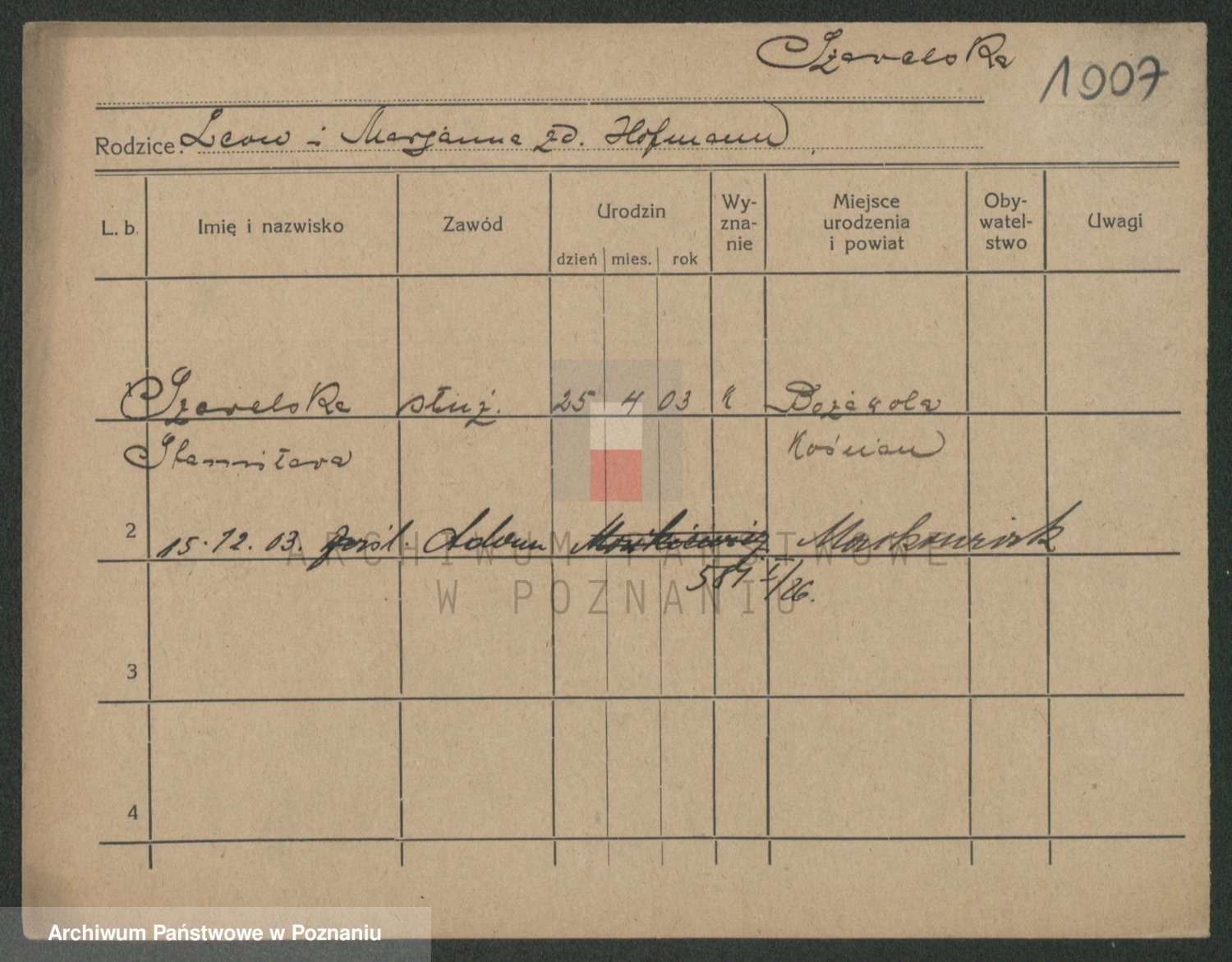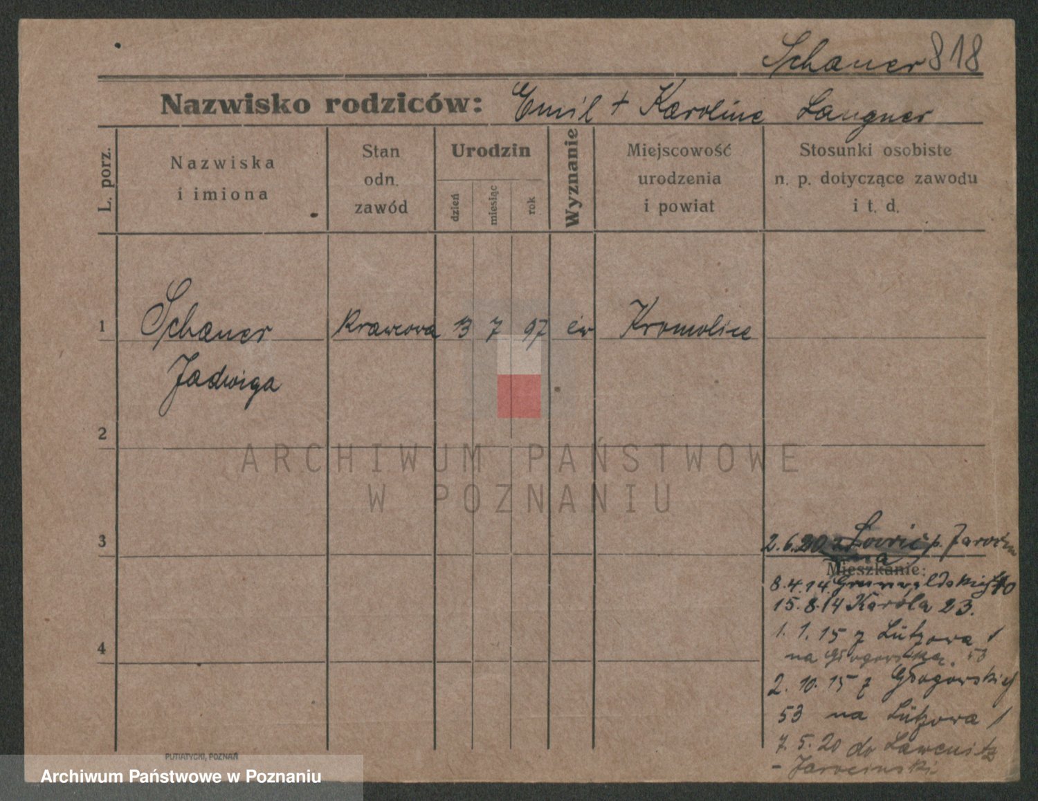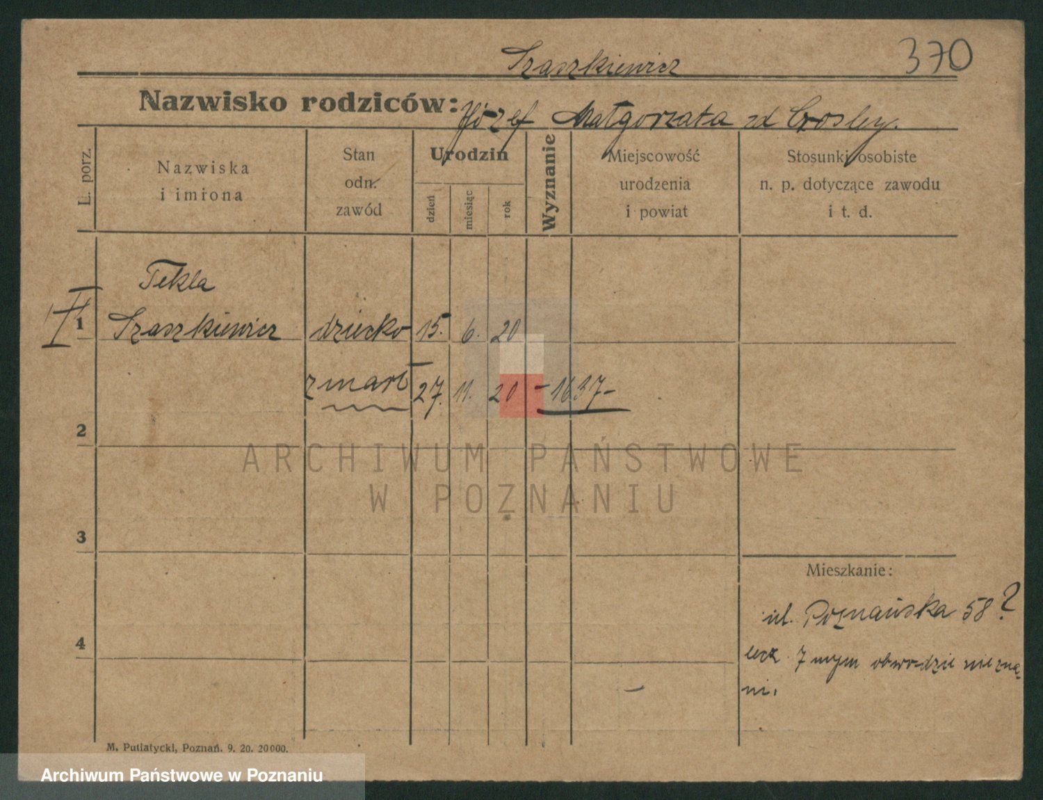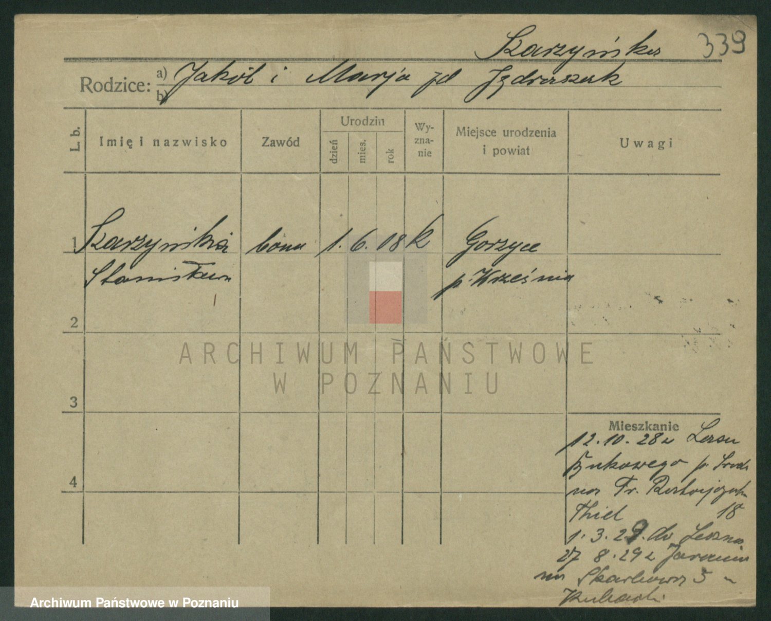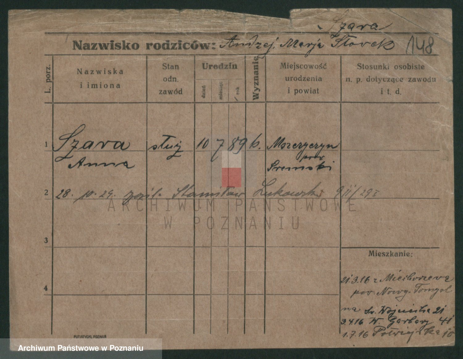 Podgląd karty osobowej dostępny jest po kliknięciu na nazwisko lub ikonkę karty. Można dokonywać powiększenia (ikony na górze) lub przechodzić między kolejnymi skanami (strzałki po bokach).