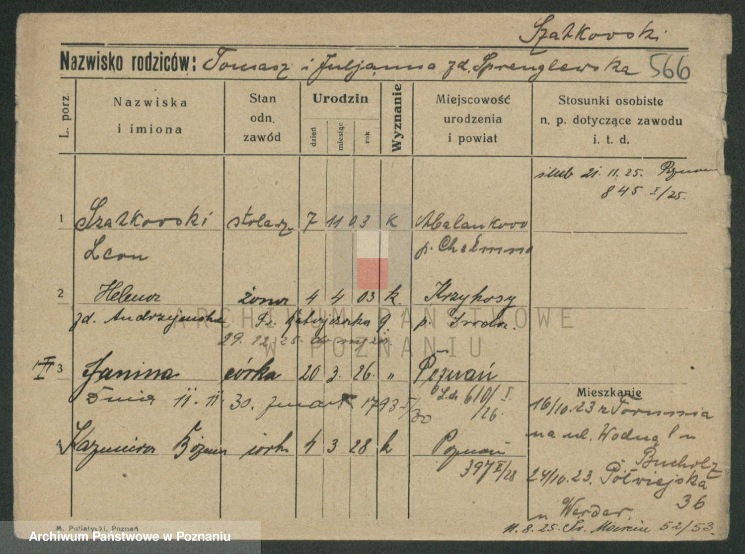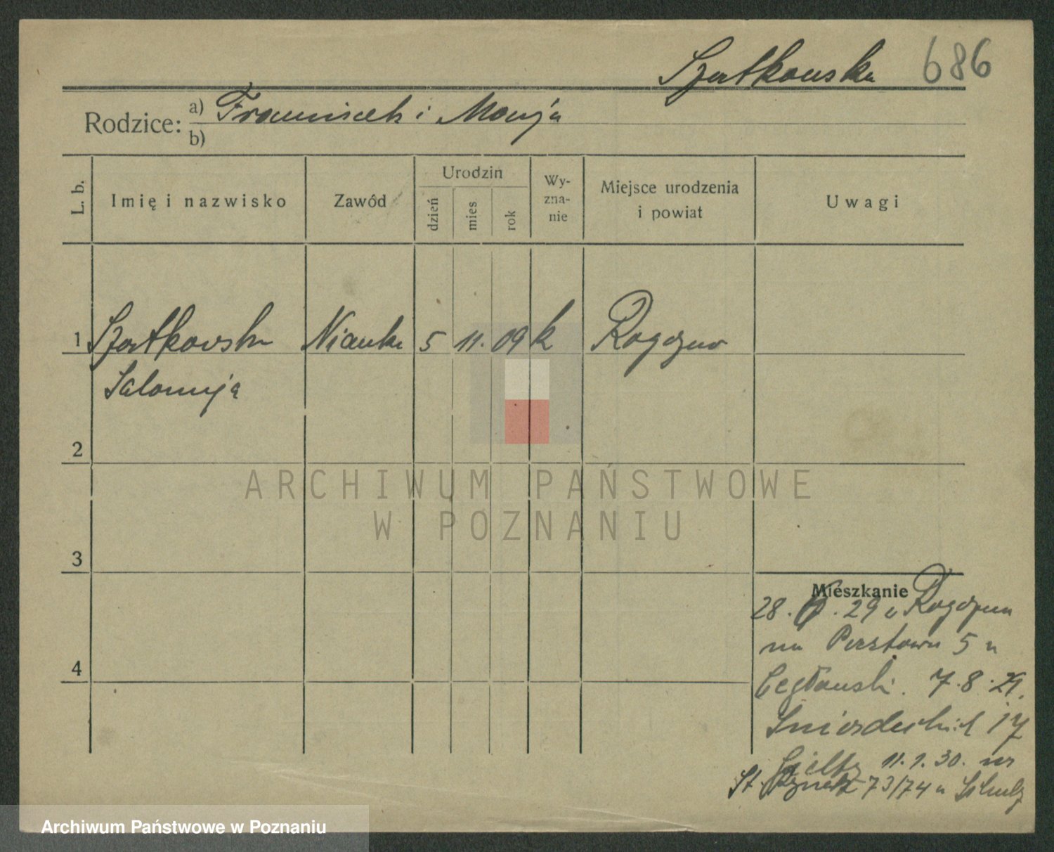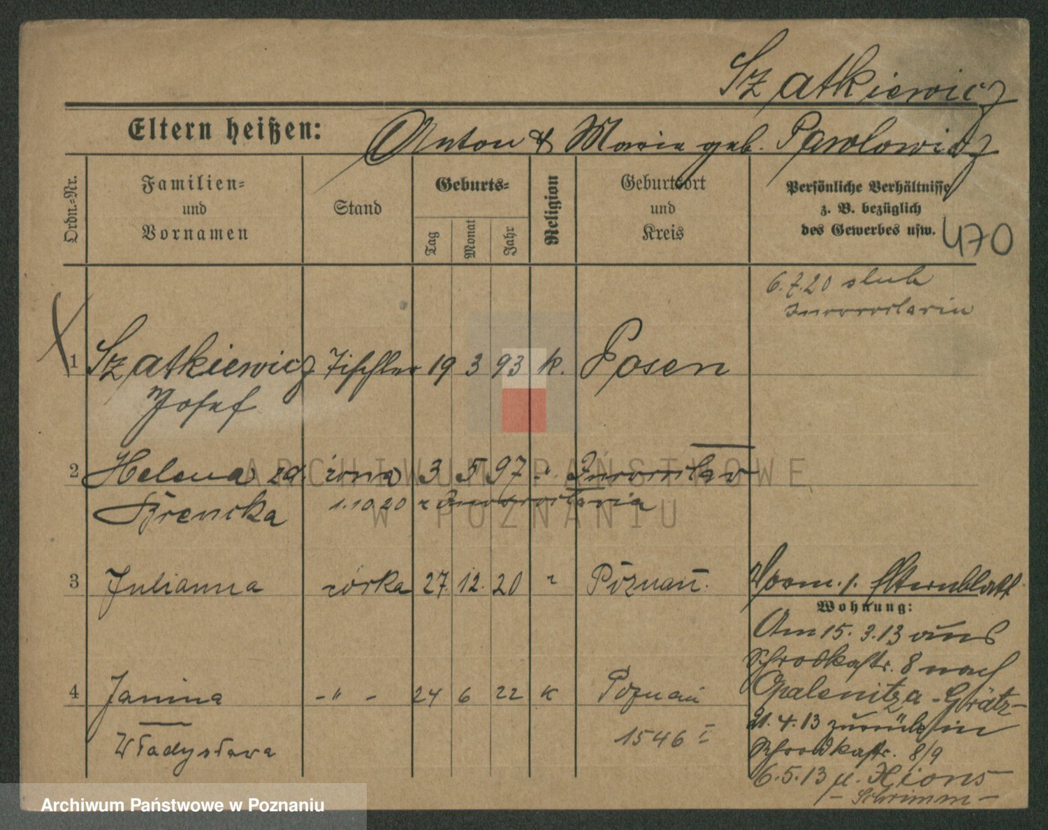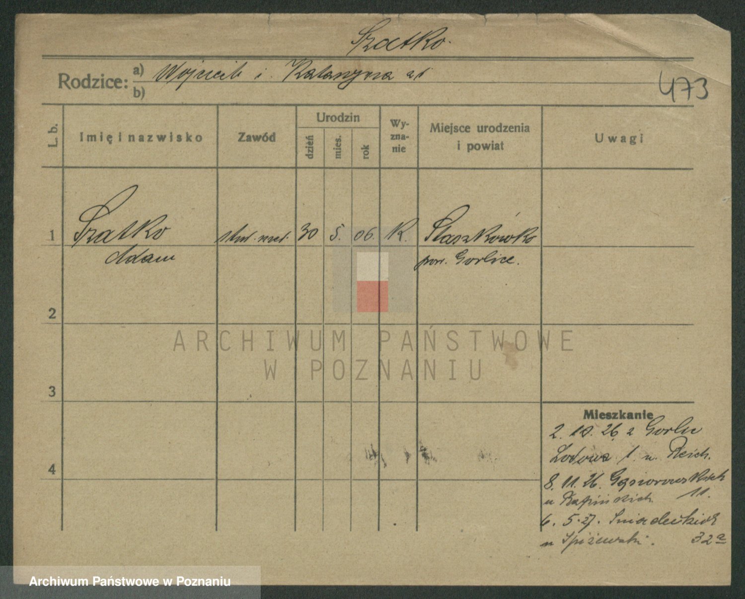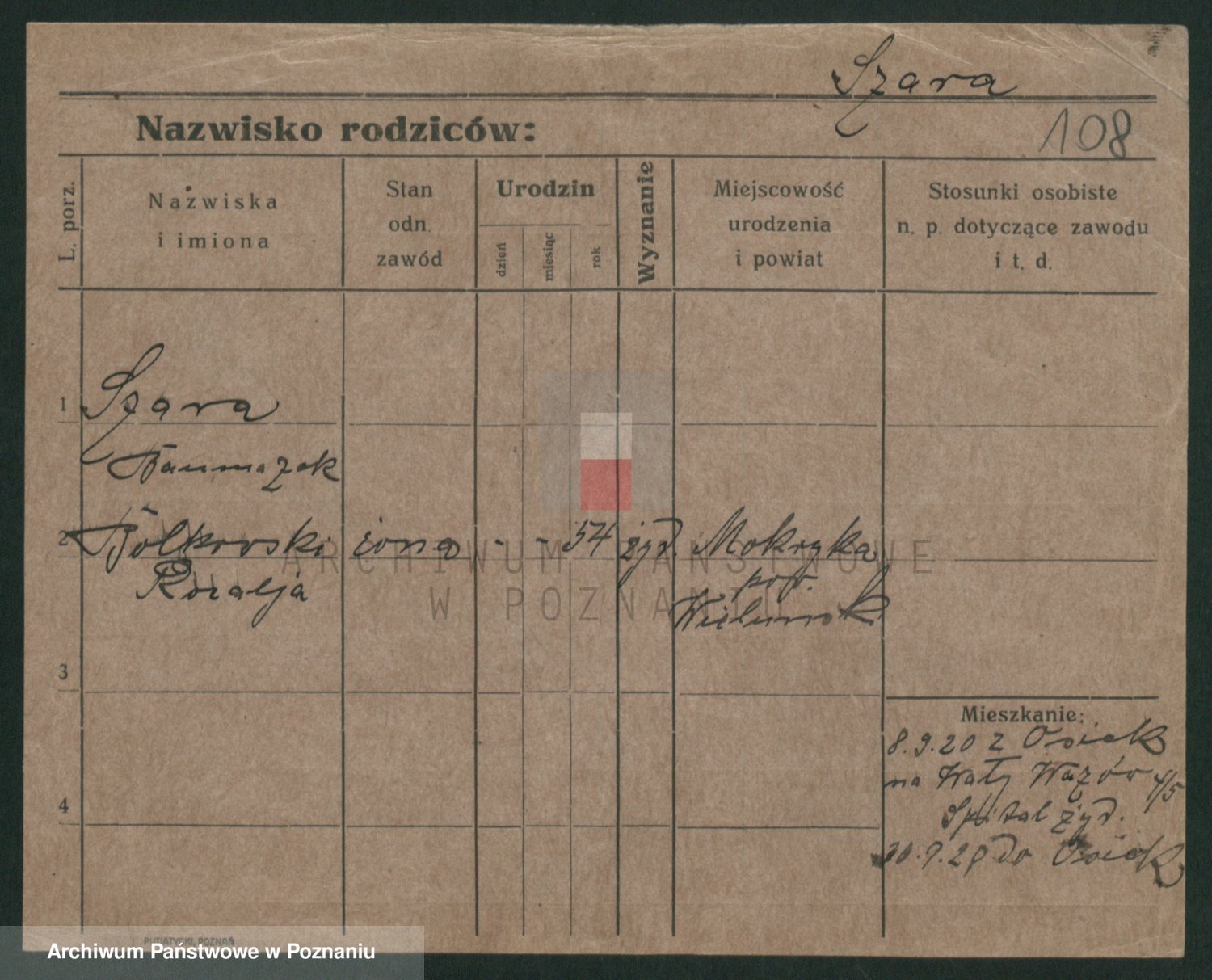 Podgląd karty osobowej dostępny jest po kliknięciu na nazwisko lub ikonkę karty. Można dokonywać powiększenia (ikony na górze) lub przechodzić między kolejnymi skanami (strzałki po bokach).