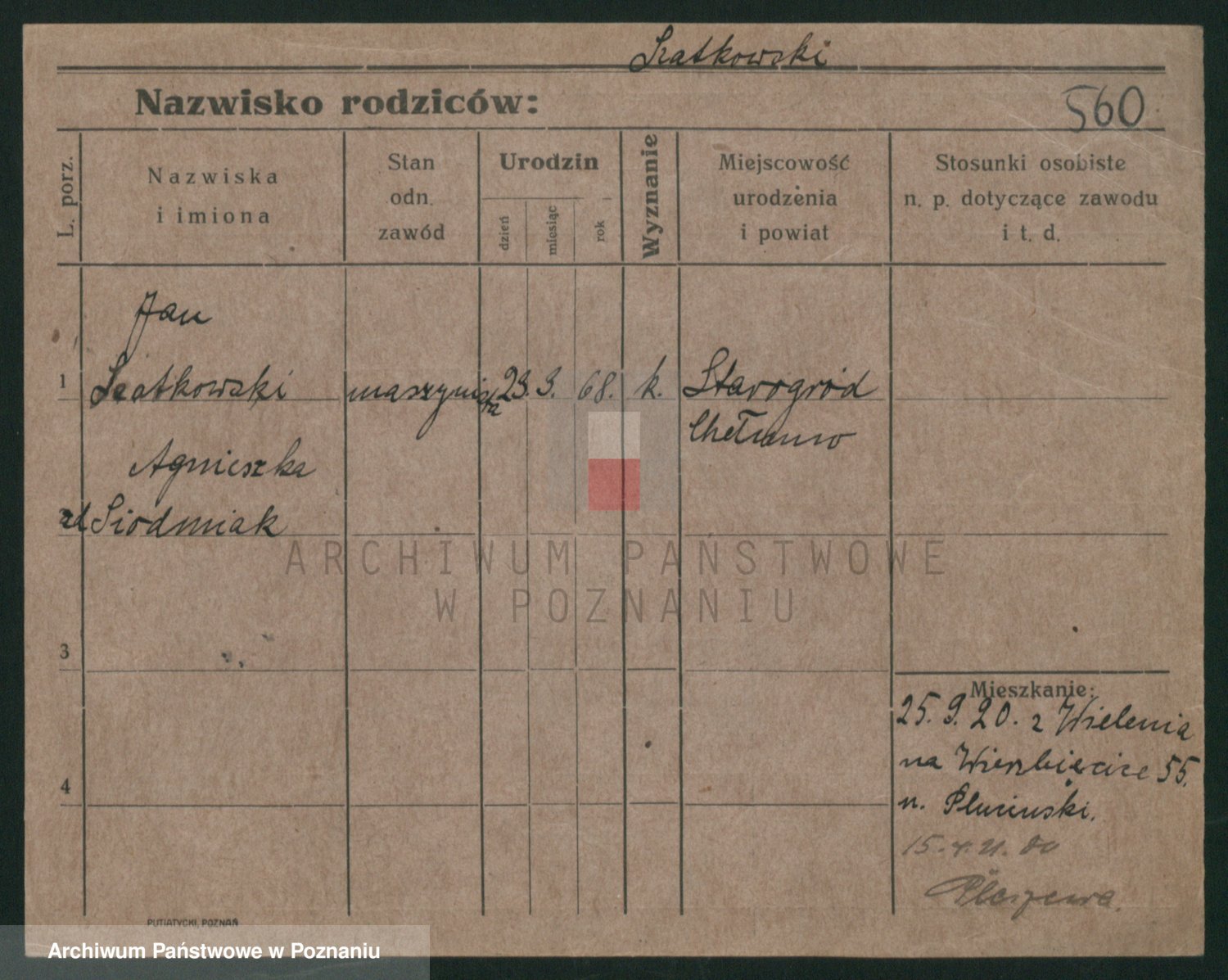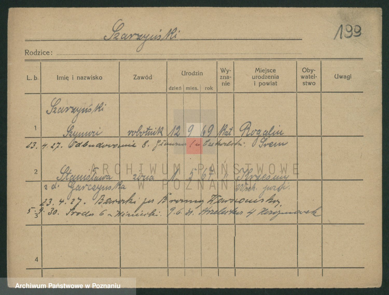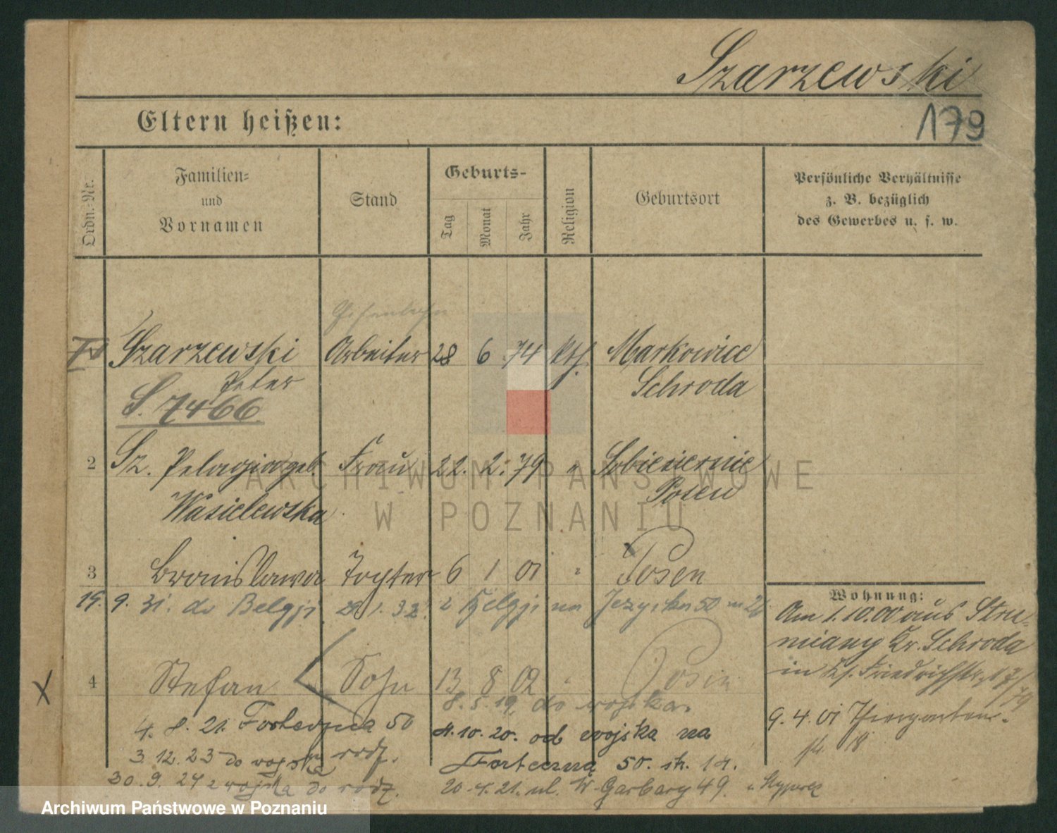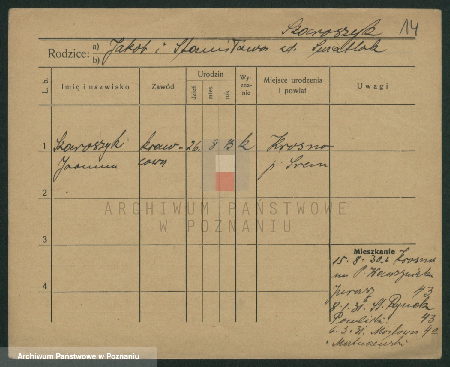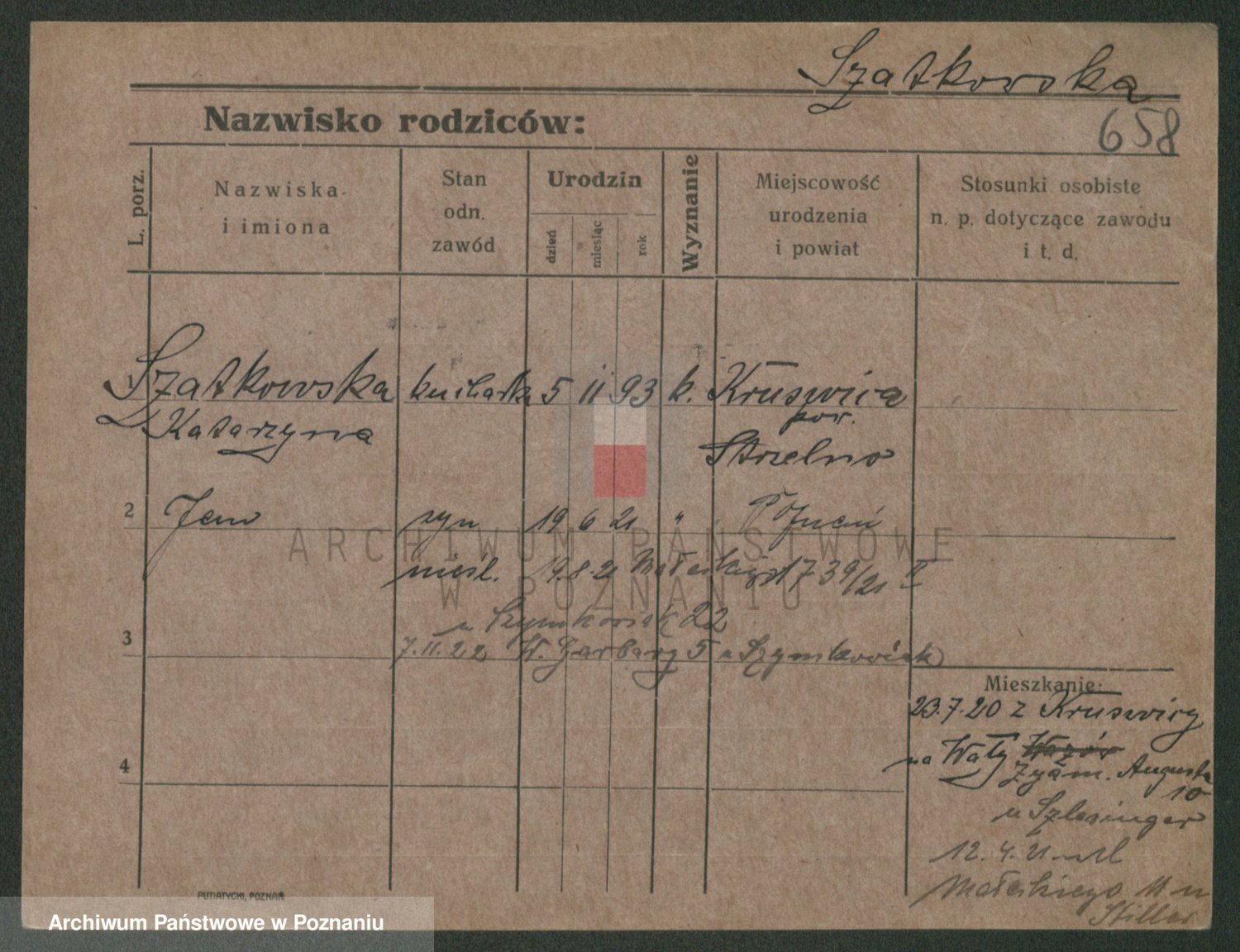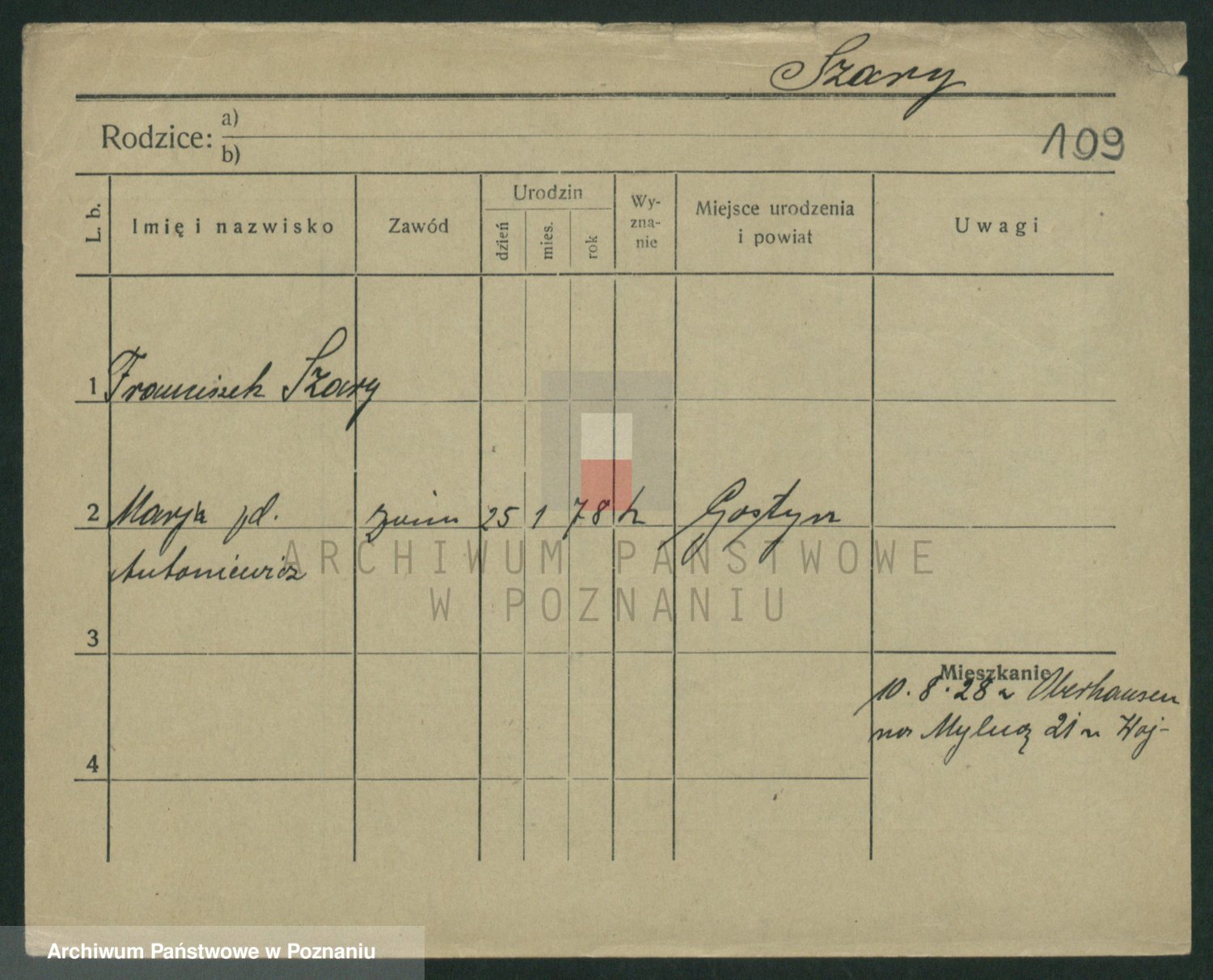 Podgląd karty osobowej dostępny jest po kliknięciu na nazwisko lub ikonkę karty. Można dokonywać powiększenia (ikony na górze) lub przechodzić między kolejnymi skanami (strzałki po bokach).