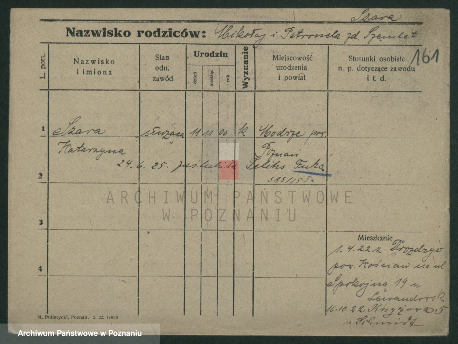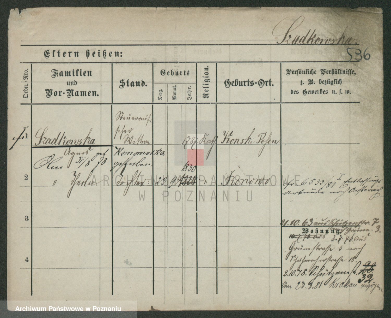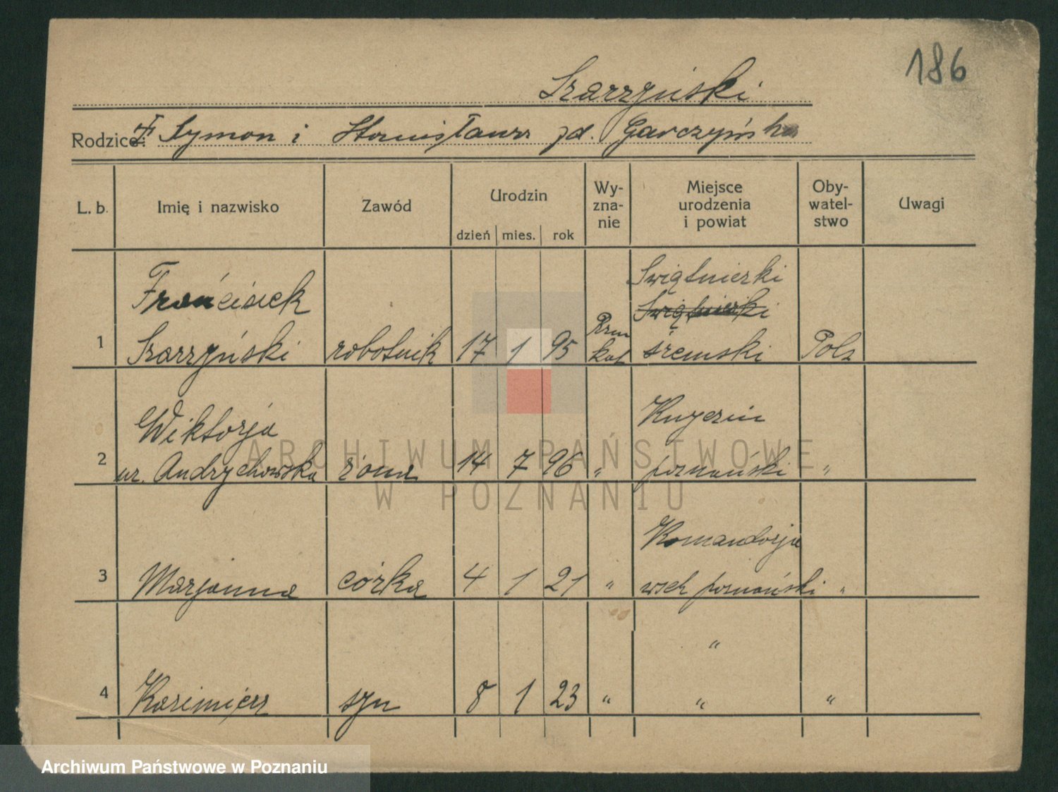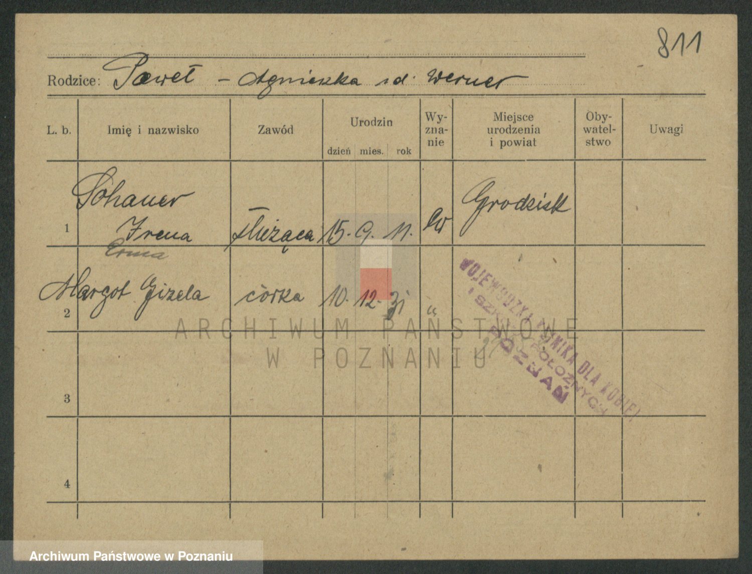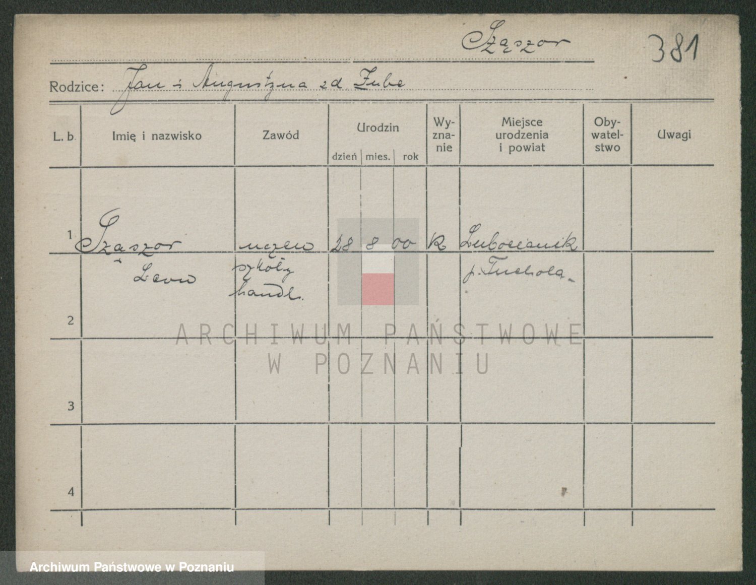 Podgląd karty osobowej dostępny jest po kliknięciu na nazwisko lub ikonkę karty. Można dokonywać powiększenia (ikony na górze) lub przechodzić między kolejnymi skanami (strzałki po bokach).