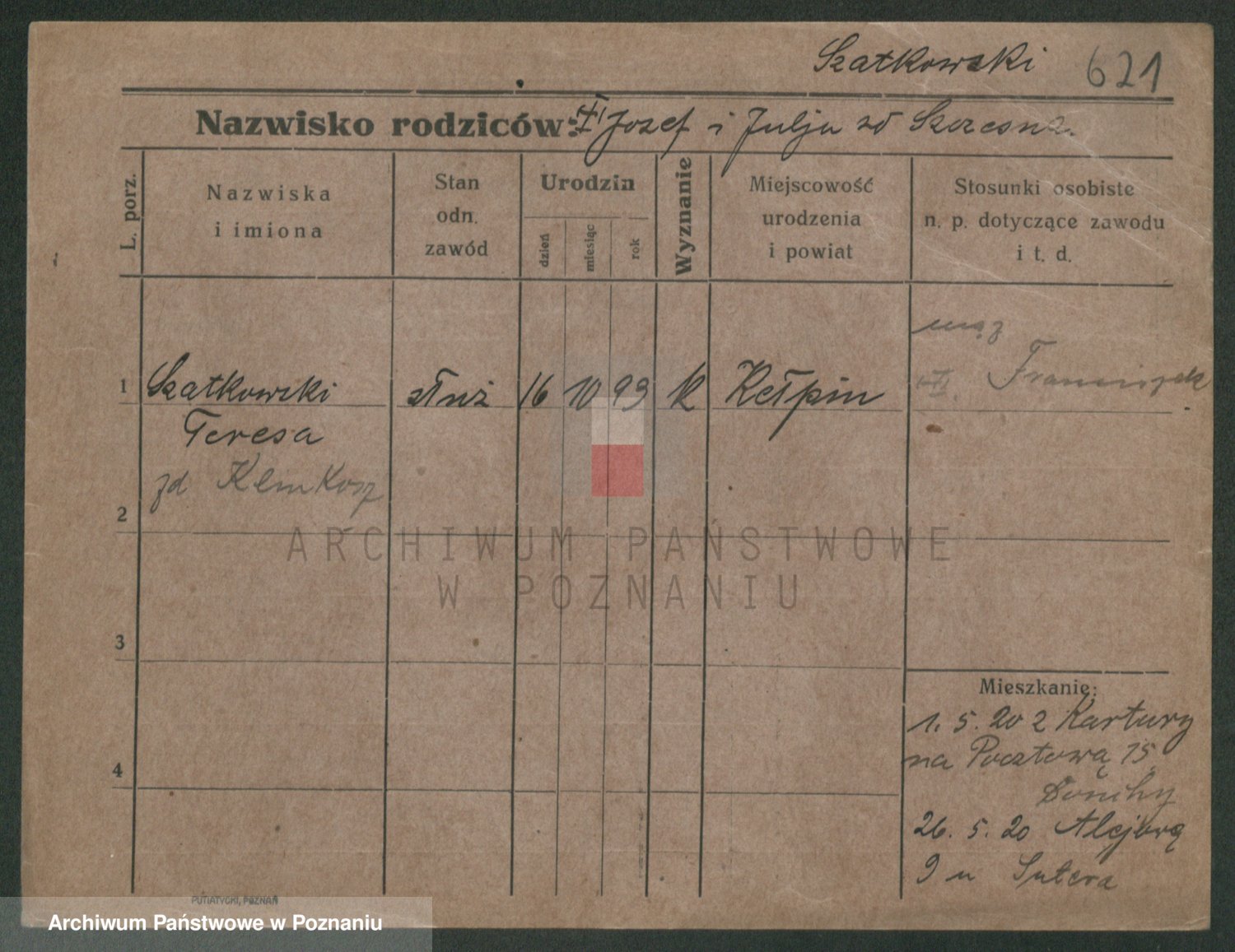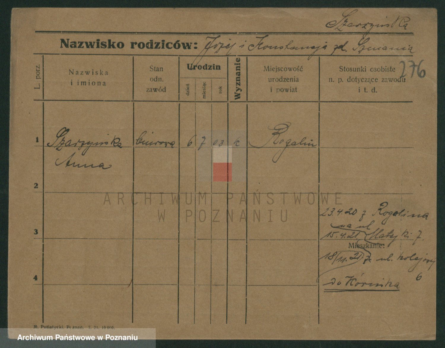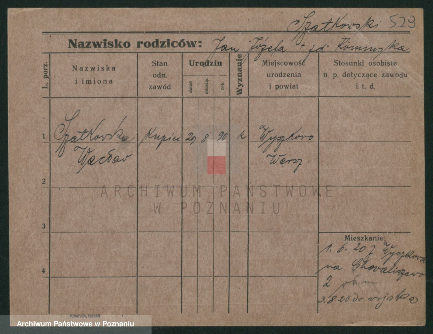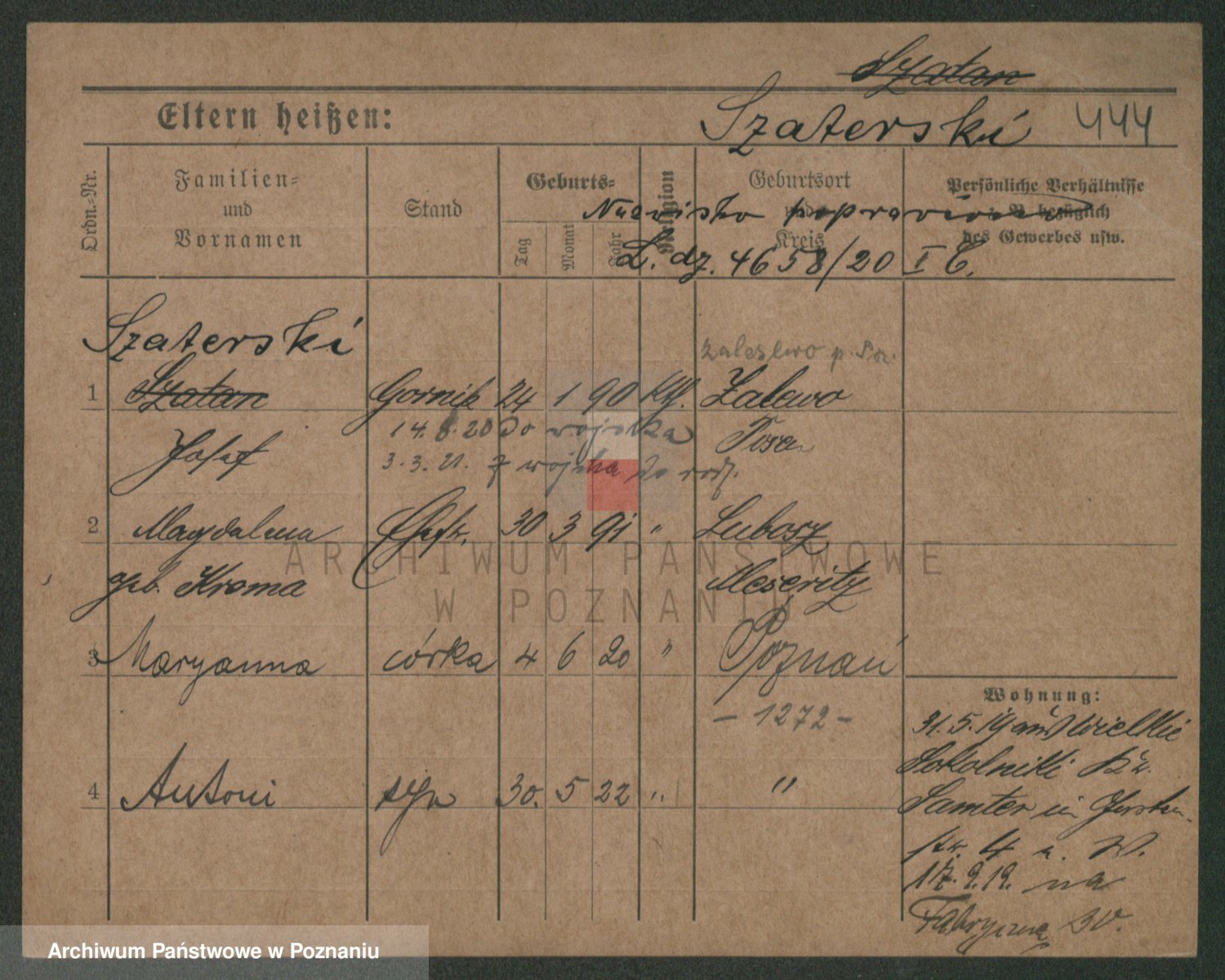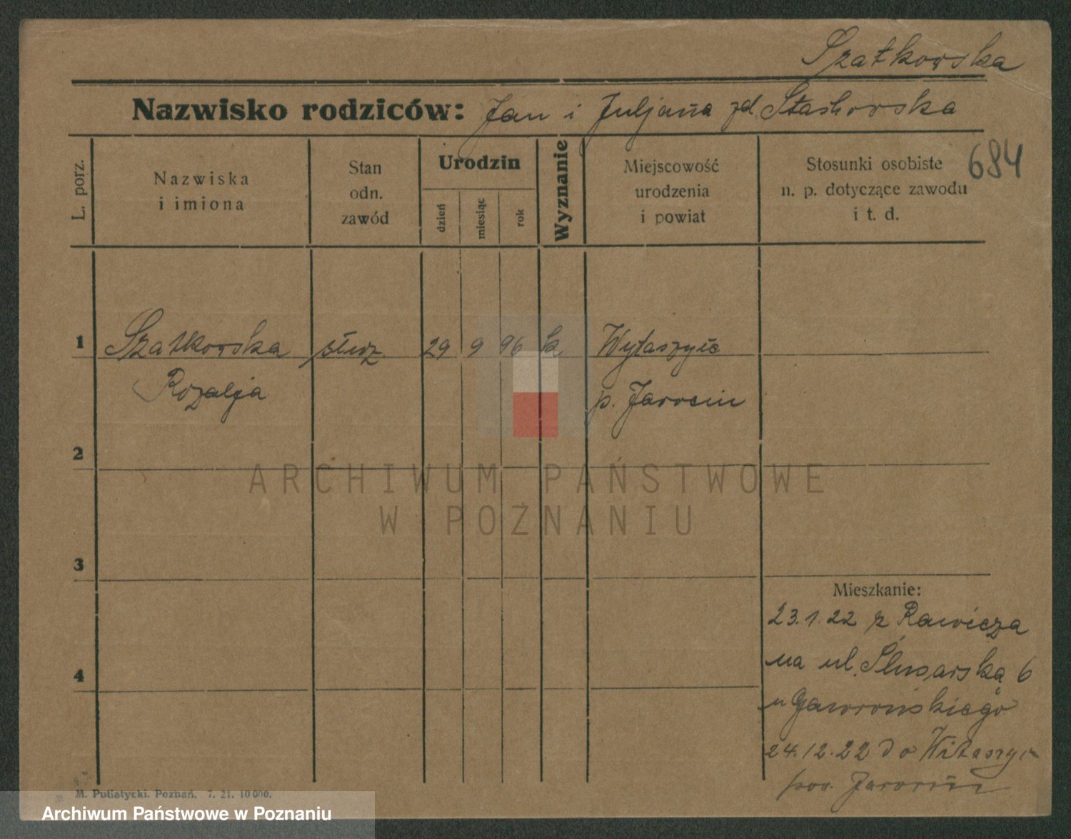 Podgląd karty osobowej dostępny jest po kliknięciu na nazwisko lub ikonkę karty. Można dokonywać powiększenia (ikony na górze) lub przechodzić między kolejnymi skanami (strzałki po bokach).