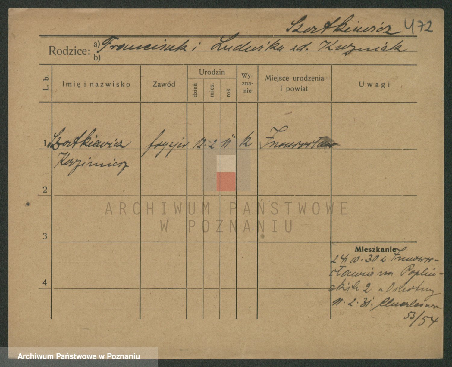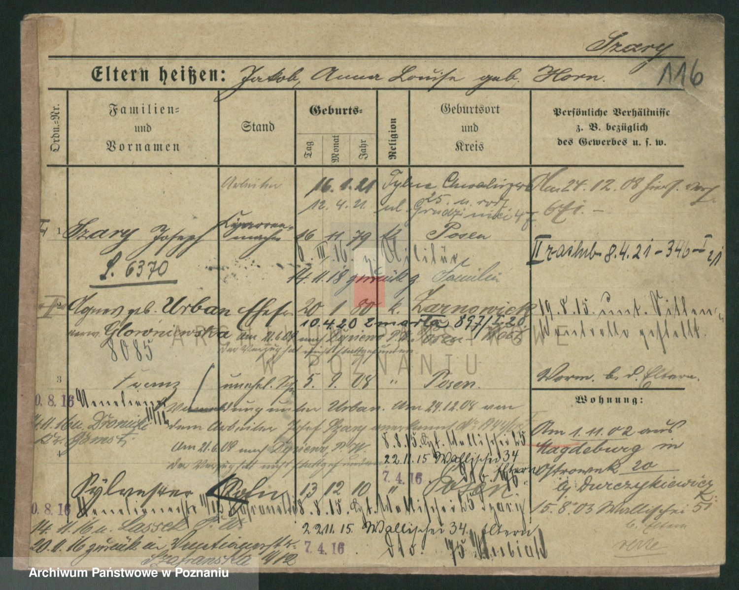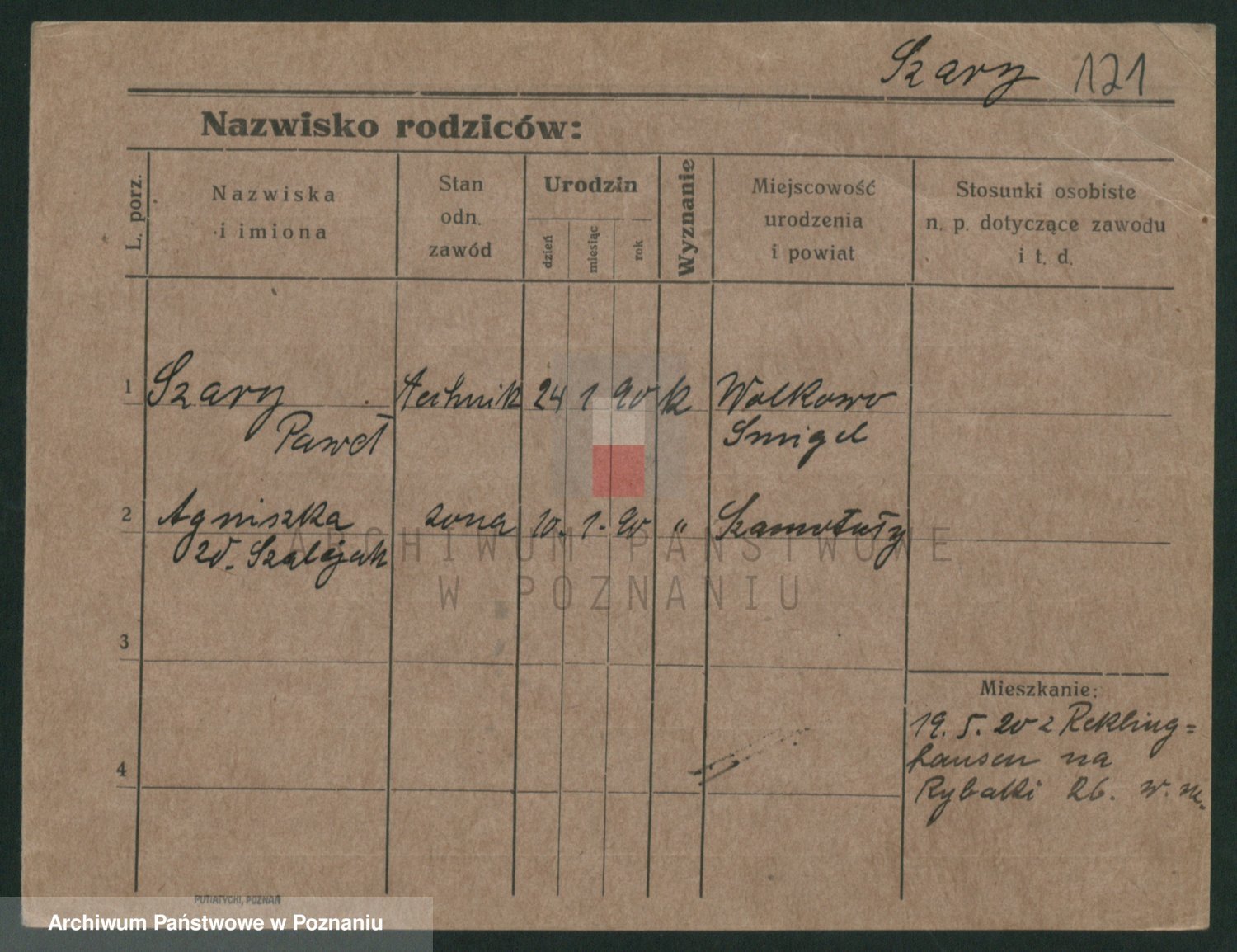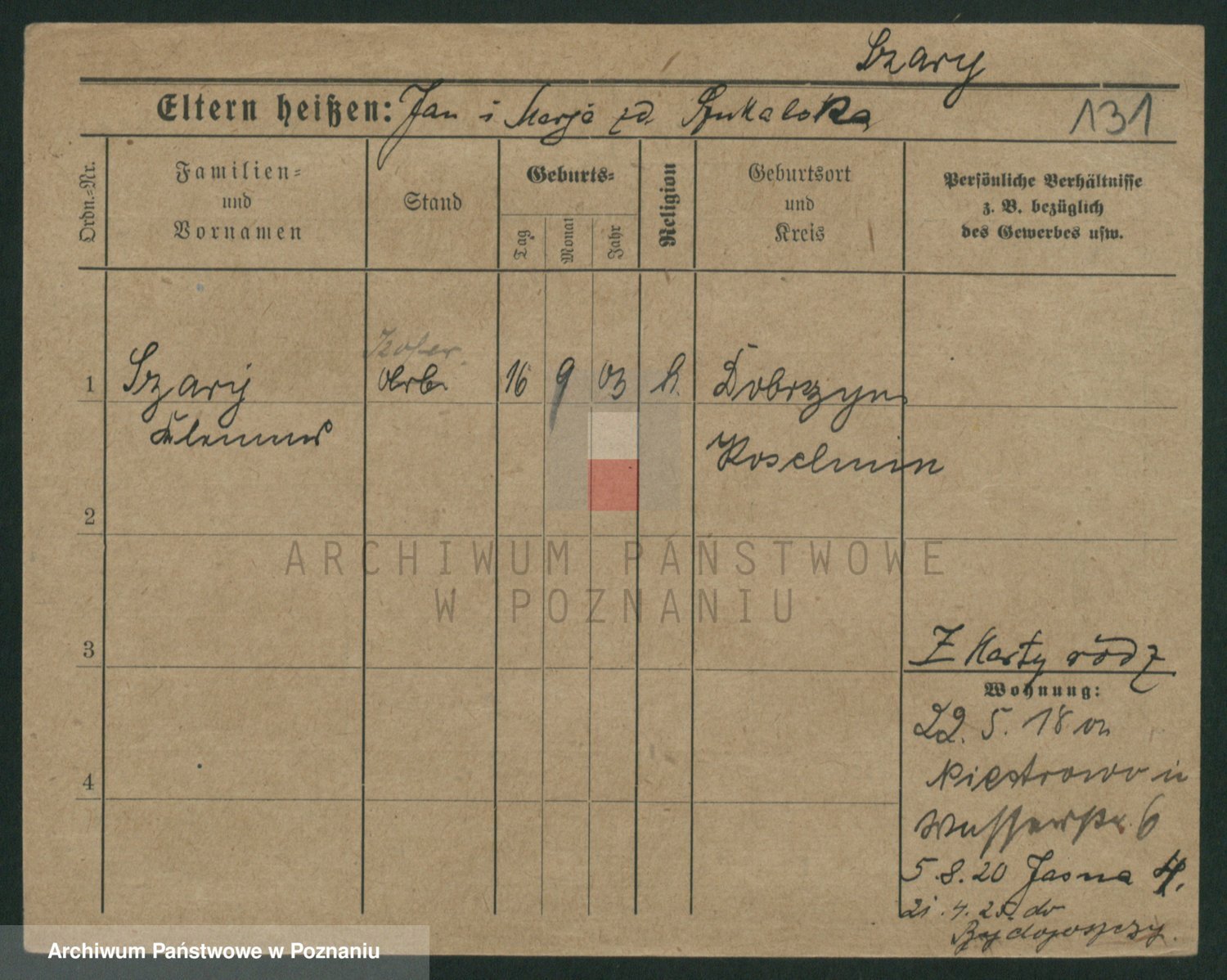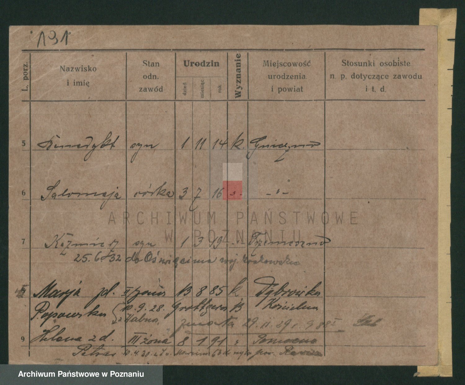 Podgląd karty osobowej dostępny jest po kliknięciu na nazwisko lub ikonkę karty. Można dokonywać powiększenia (ikony na górze) lub przechodzić między kolejnymi skanami (strzałki po bokach).