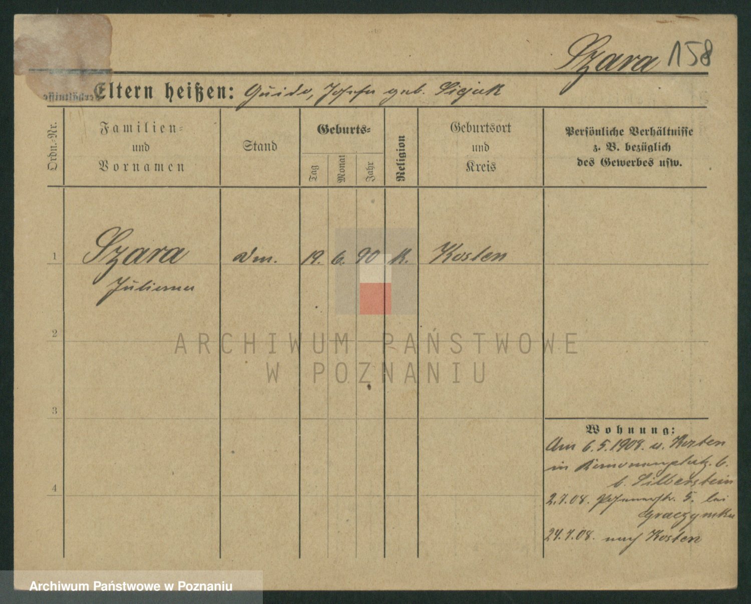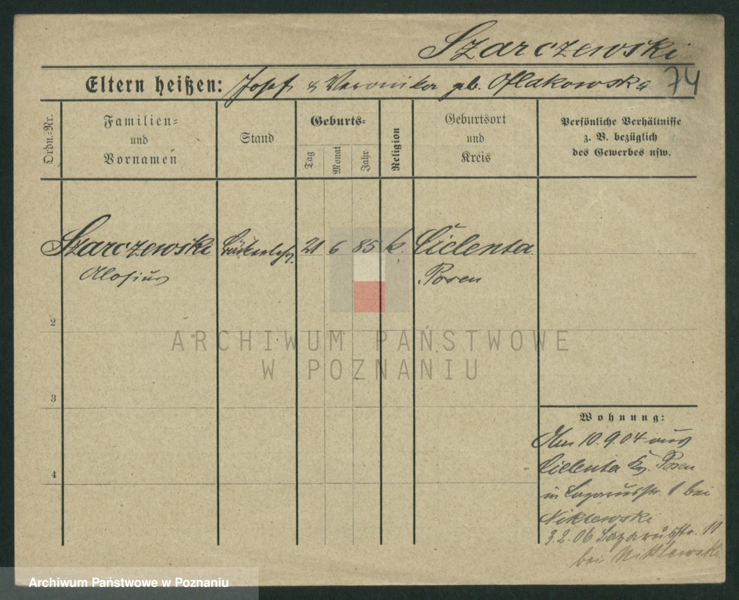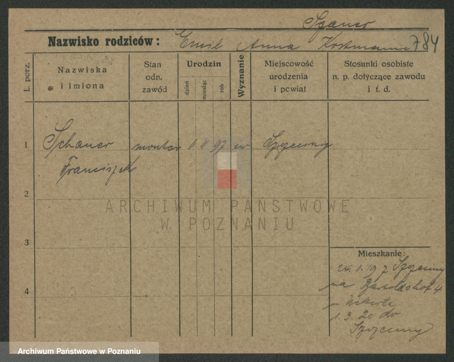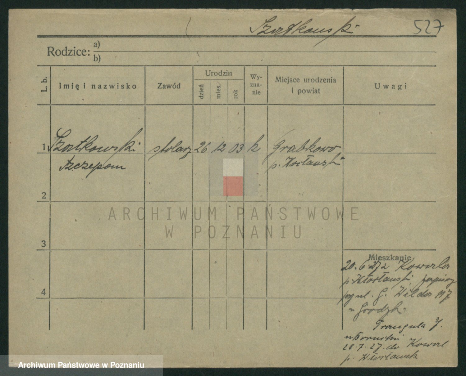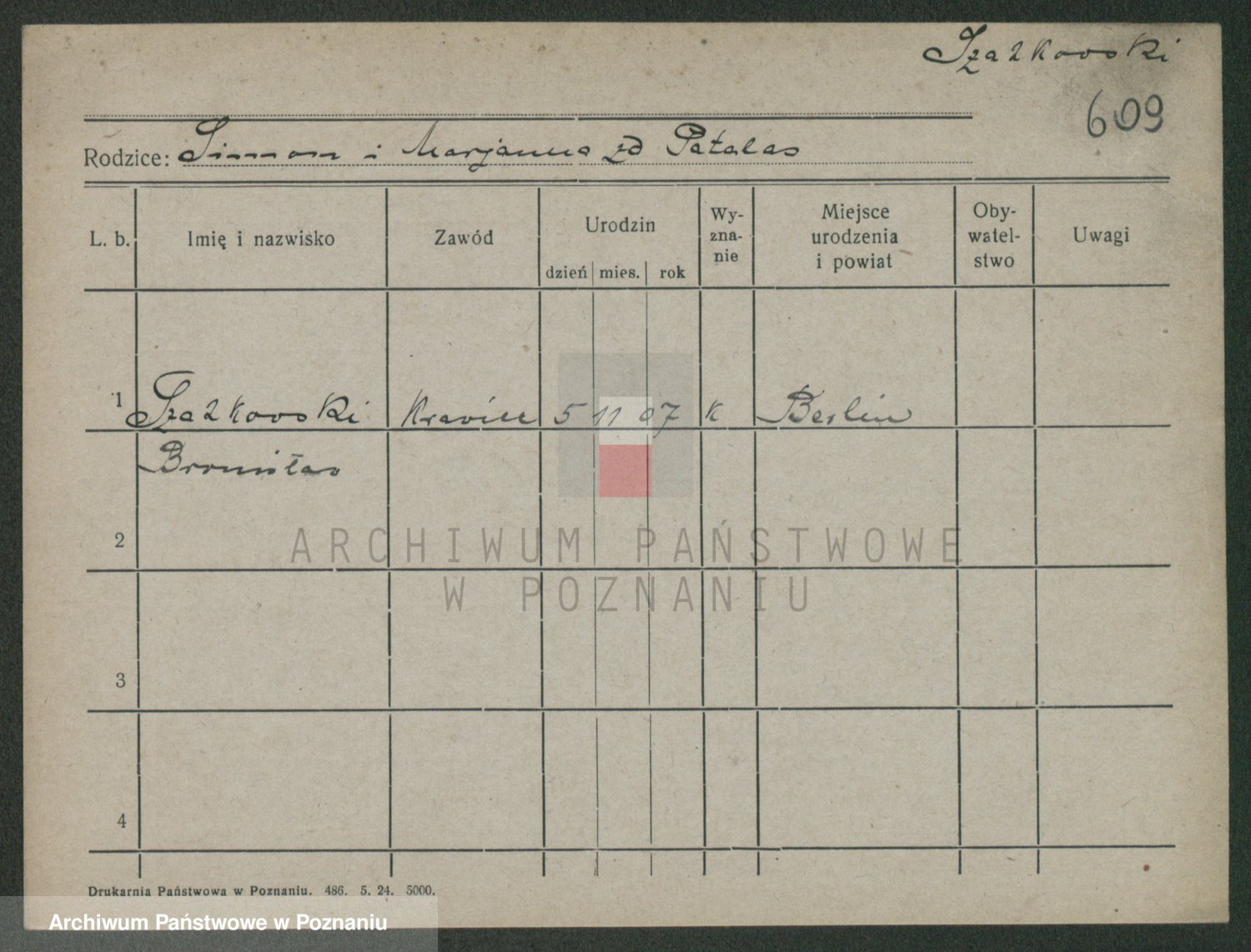 Podgląd karty osobowej dostępny jest po kliknięciu na nazwisko lub ikonkę karty. Można dokonywać powiększenia (ikony na górze) lub przechodzić między kolejnymi skanami (strzałki po bokach).