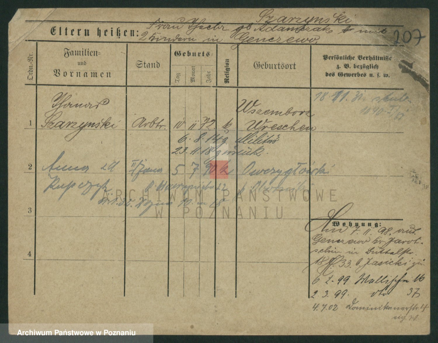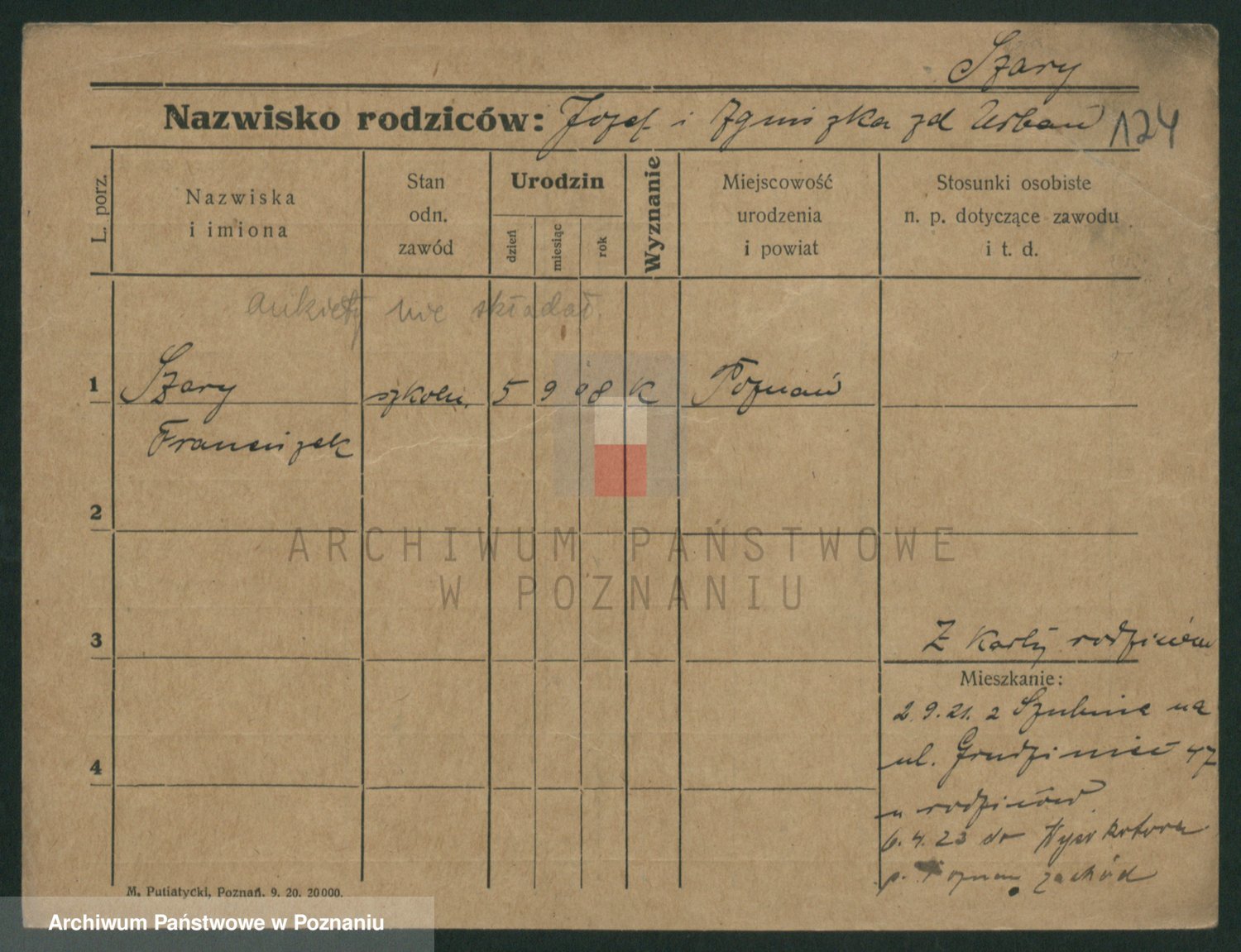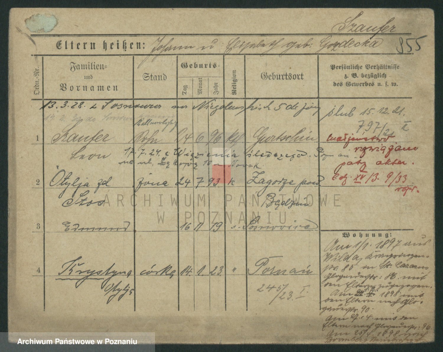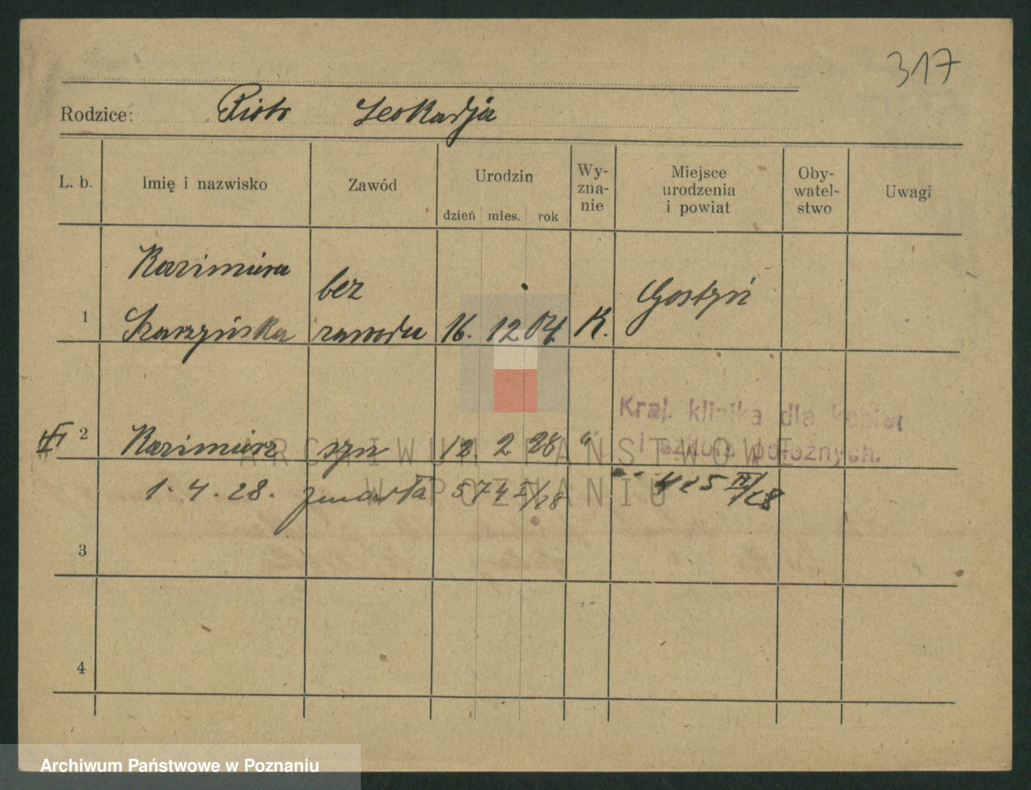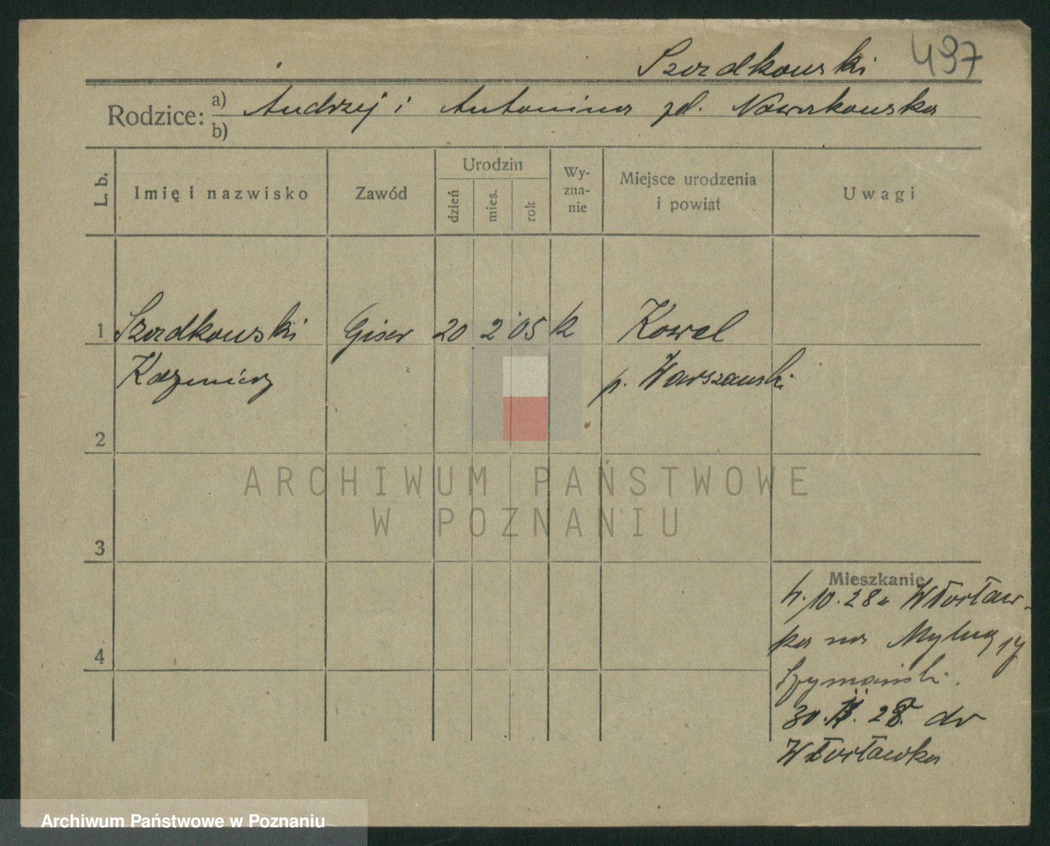 Podgląd karty osobowej dostępny jest po kliknięciu na nazwisko lub ikonkę karty. Można dokonywać powiększenia (ikony na górze) lub przechodzić między kolejnymi skanami (strzałki po bokach).