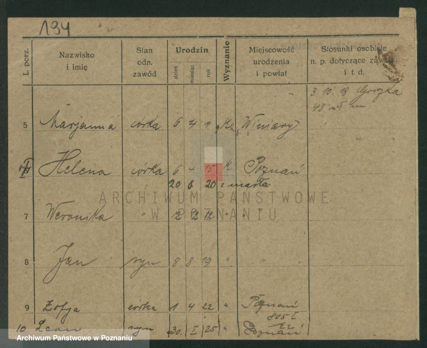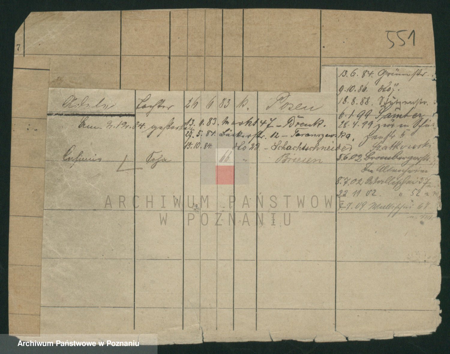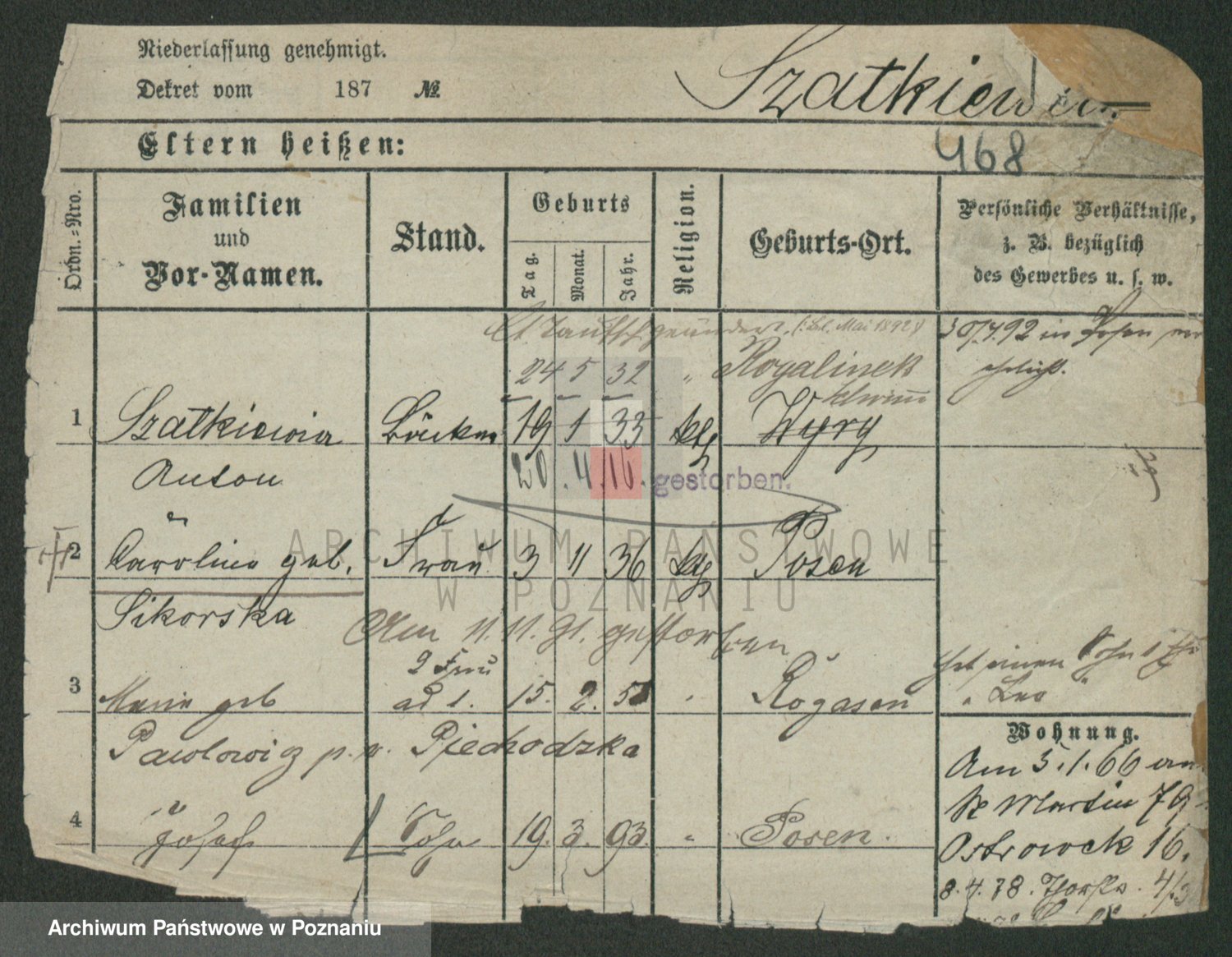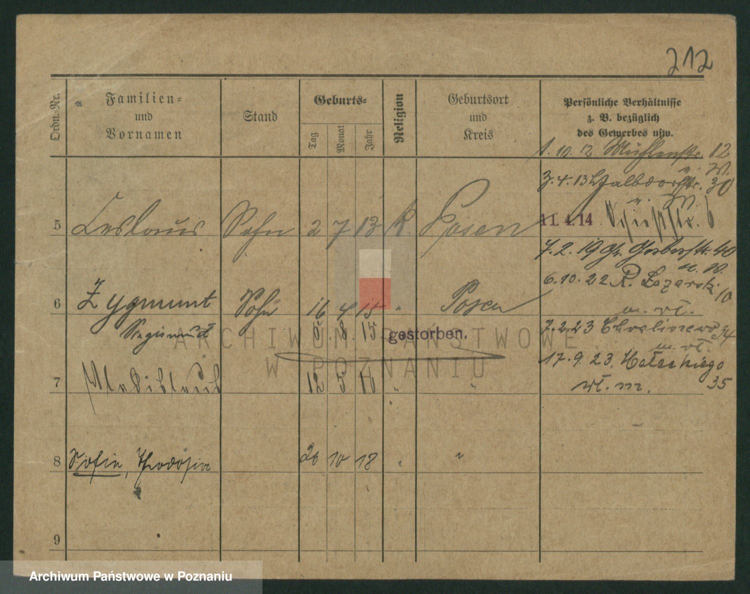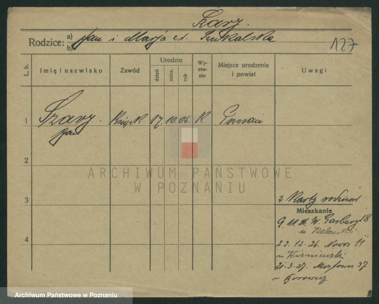 Podgląd karty osobowej dostępny jest po kliknięciu na nazwisko lub ikonkę karty. Można dokonywać powiększenia (ikony na górze) lub przechodzić między kolejnymi skanami (strzałki po bokach).