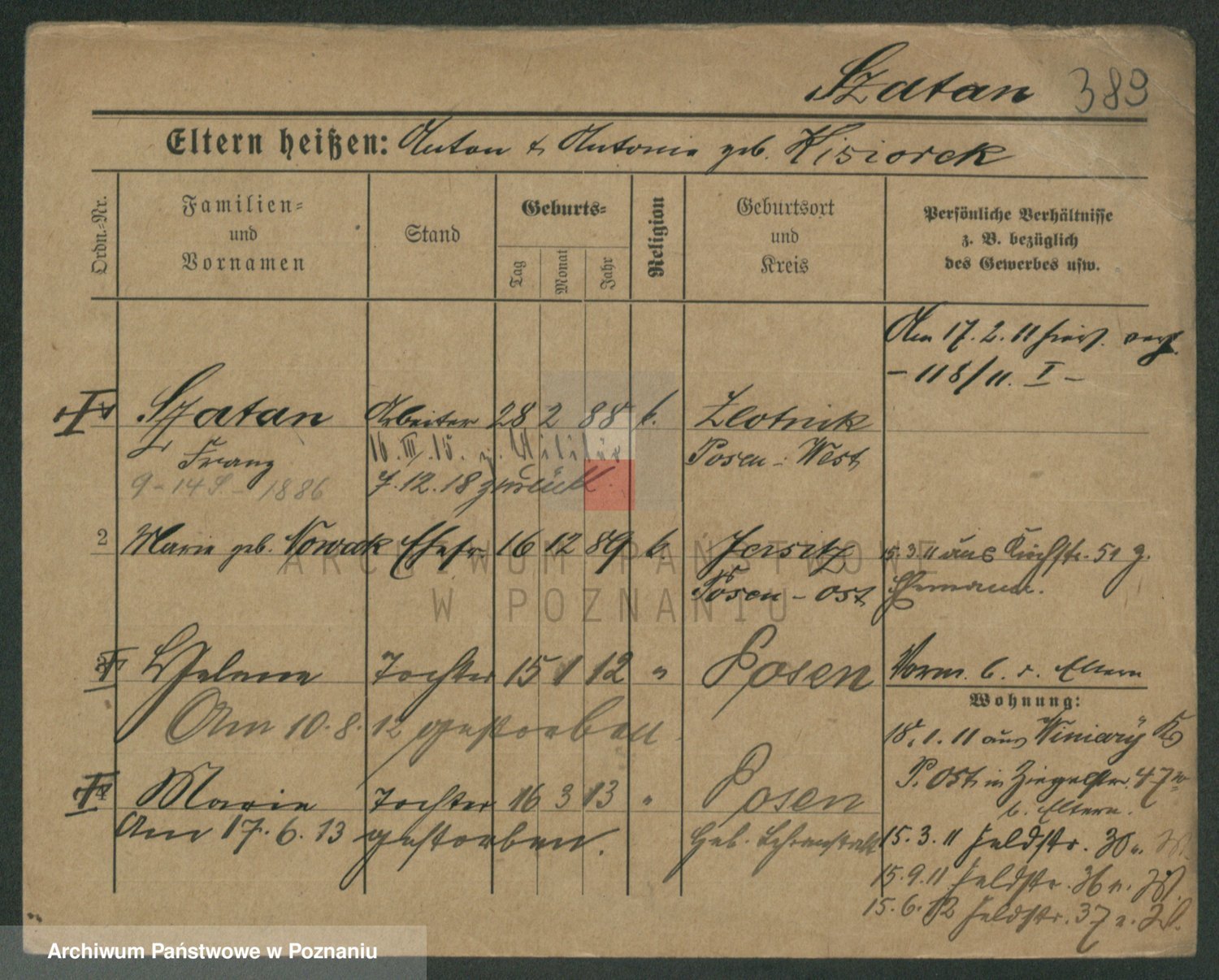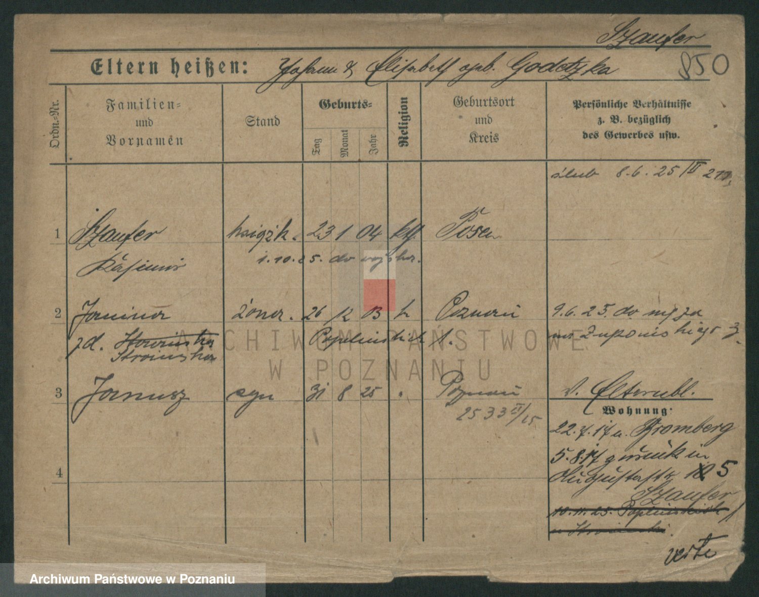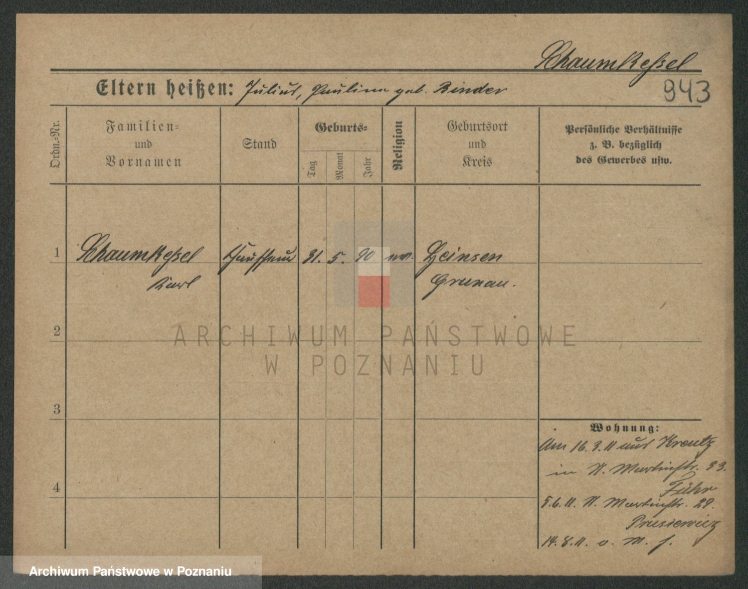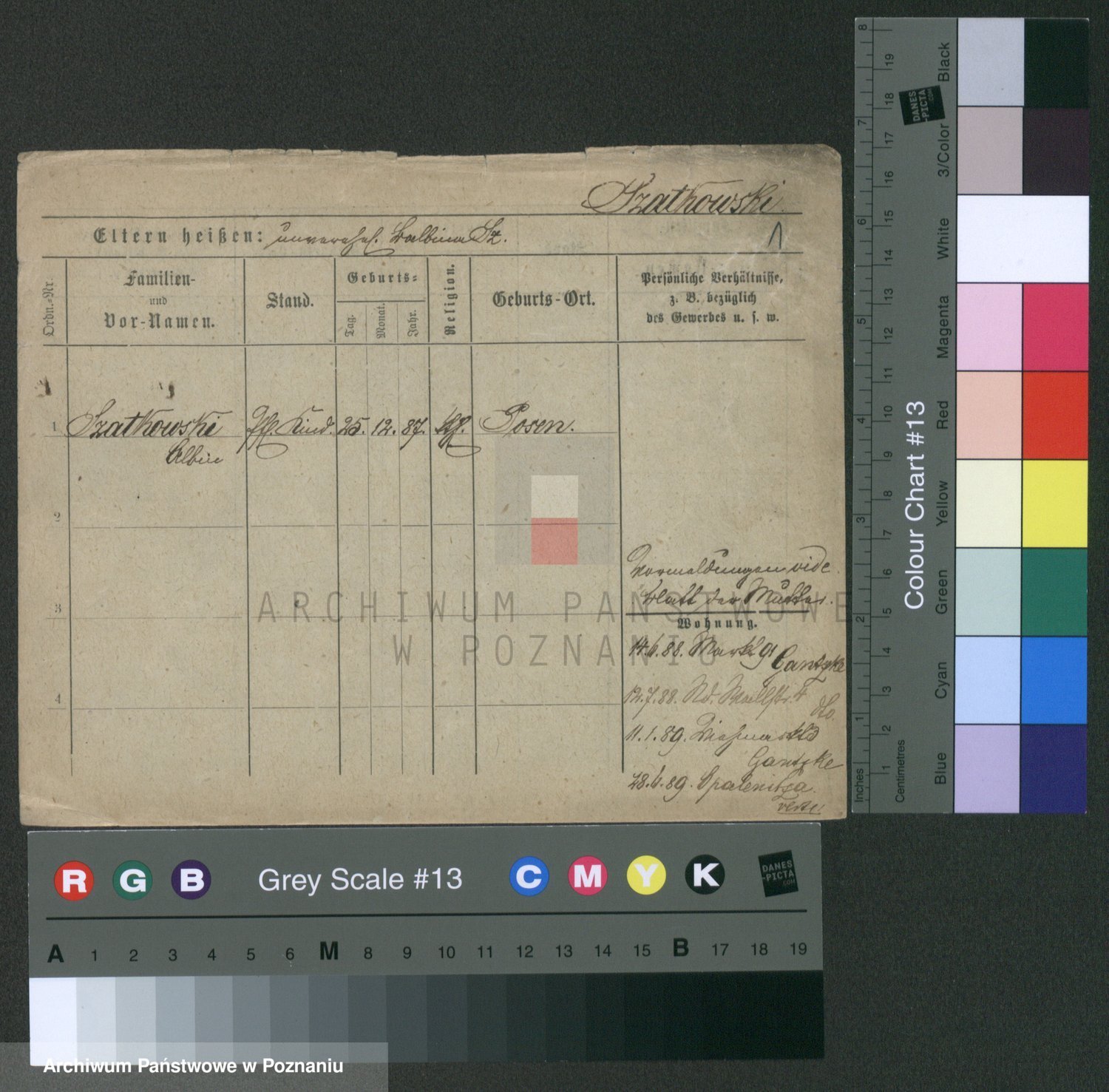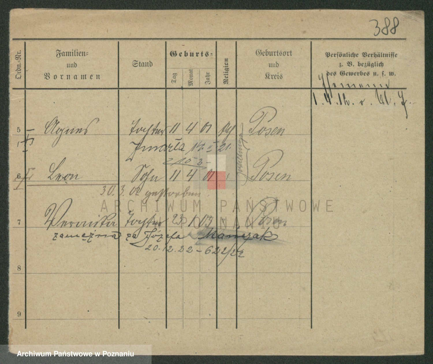 Podgląd karty osobowej dostępny jest po kliknięciu na nazwisko lub ikonkę karty. Można dokonywać powiększenia (ikony na górze) lub przechodzić między kolejnymi skanami (strzałki po bokach).