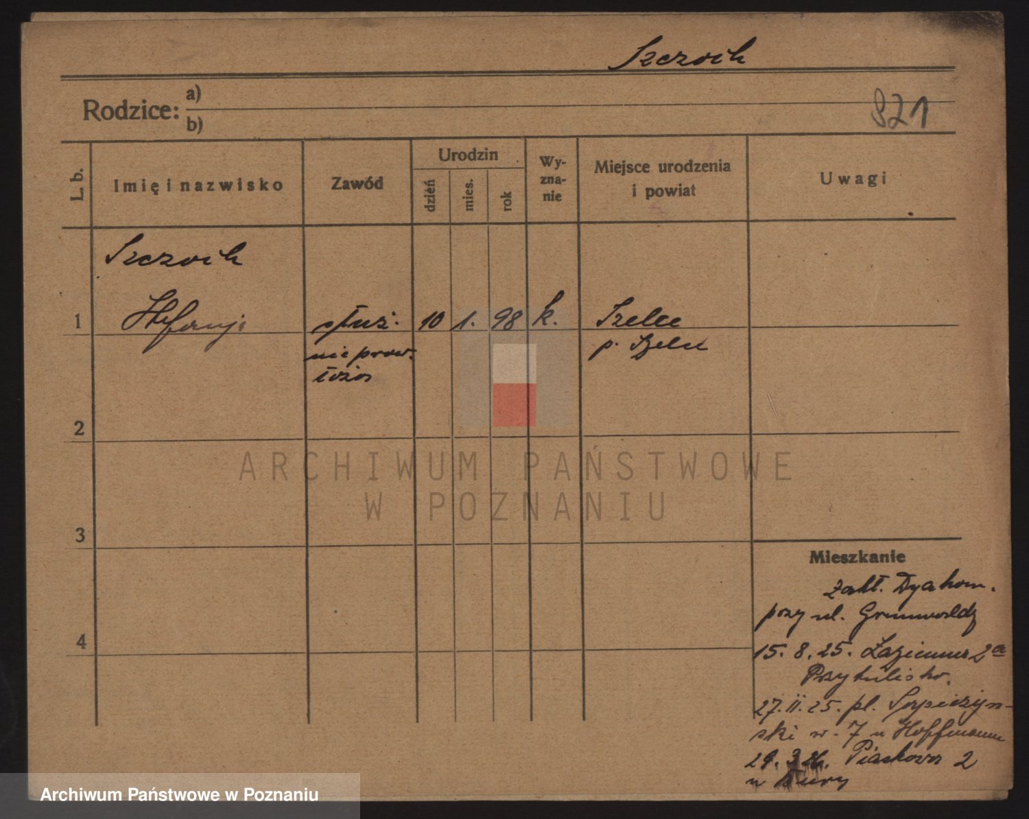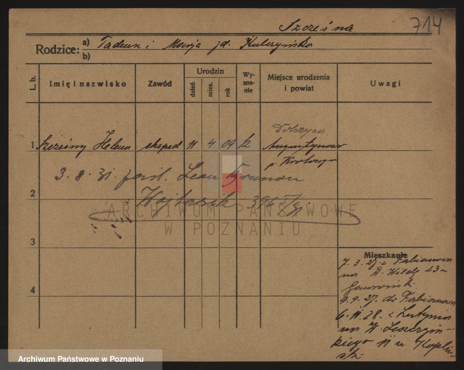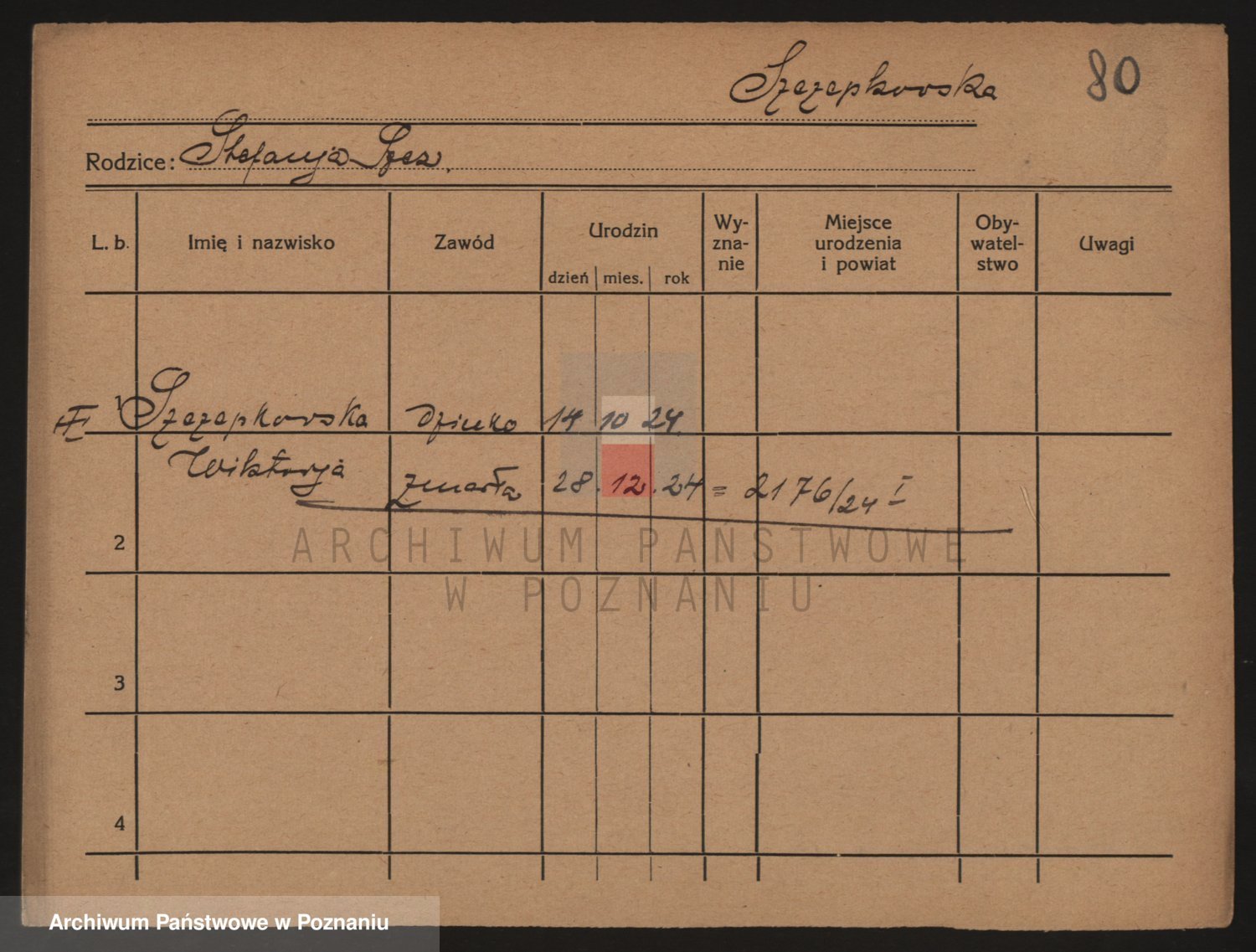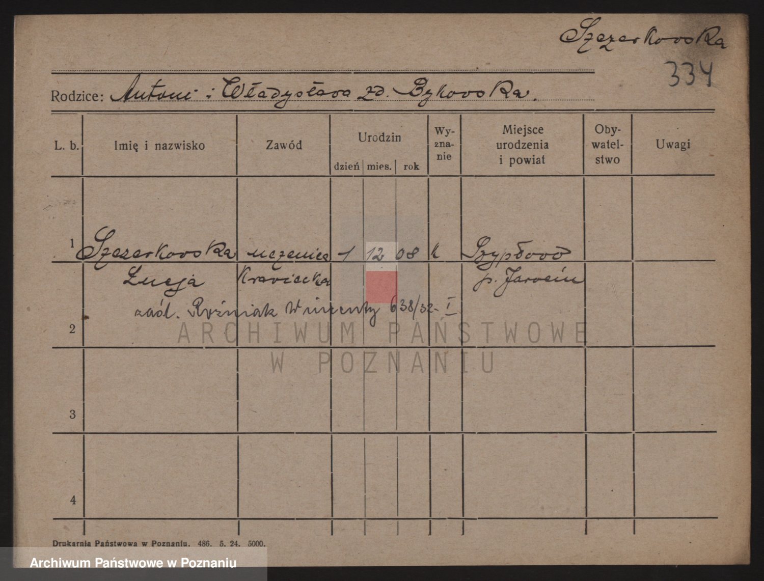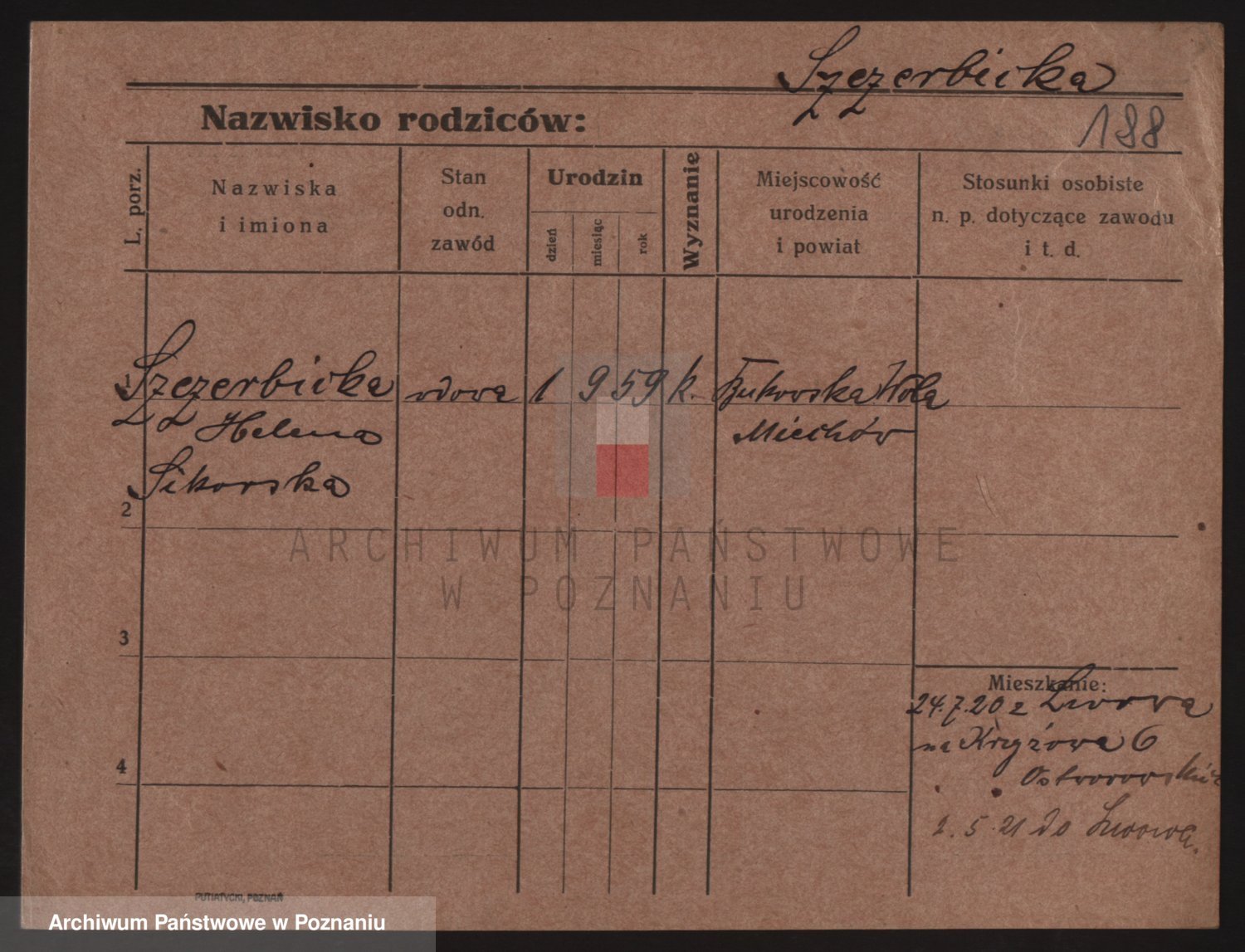 Podgląd karty osobowej dostępny jest po kliknięciu na nazwisko lub ikonkę karty. Można dokonywać powiększenia (ikony na górze) lub przechodzić między kolejnymi skanami (strzałki po bokach).