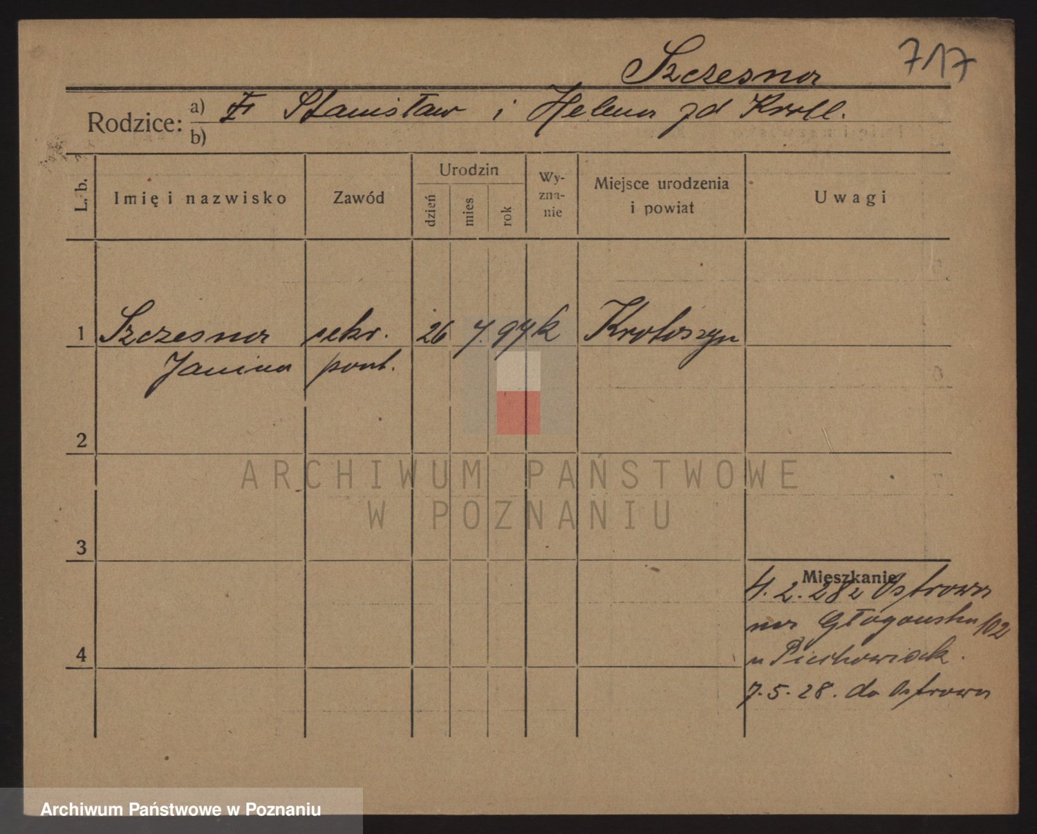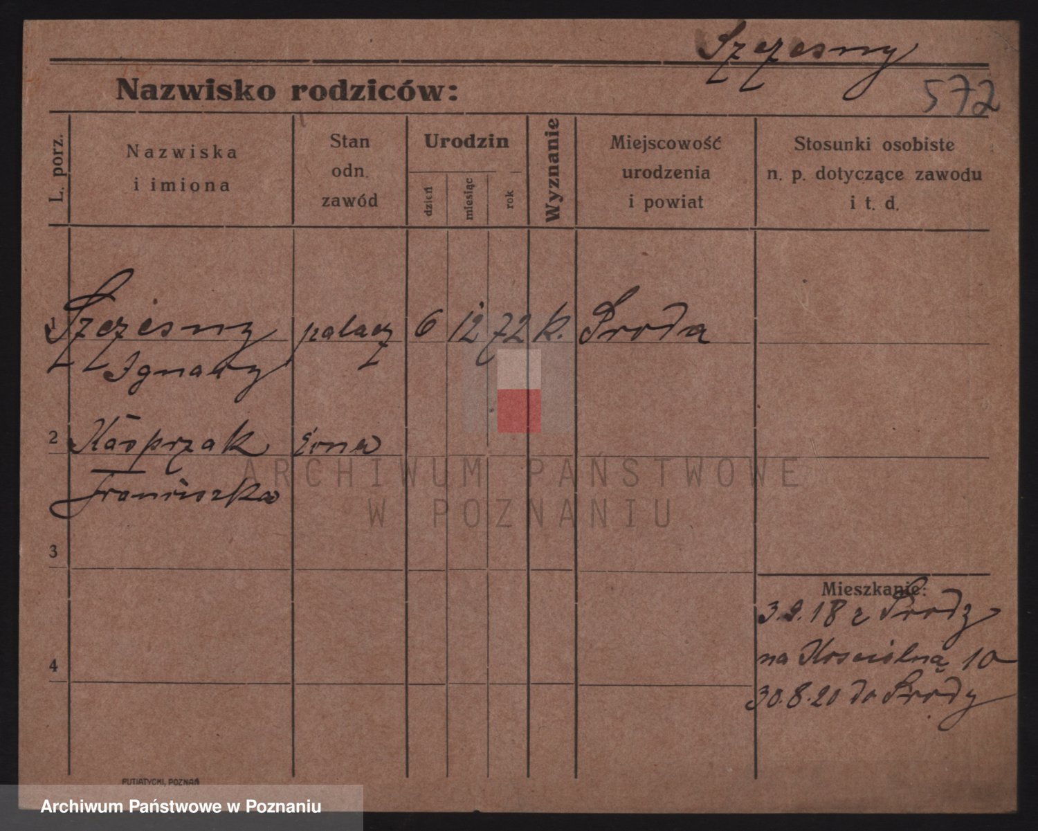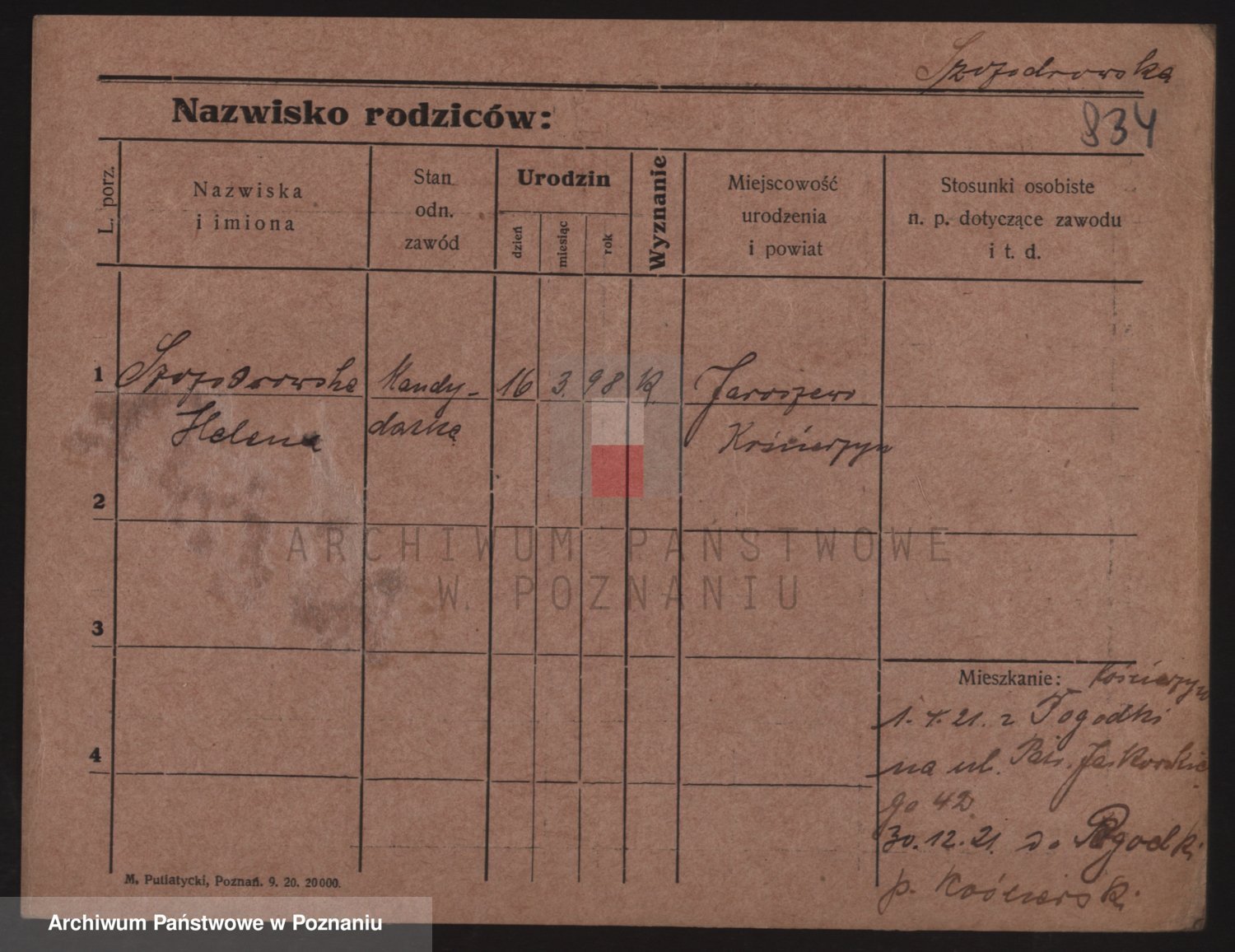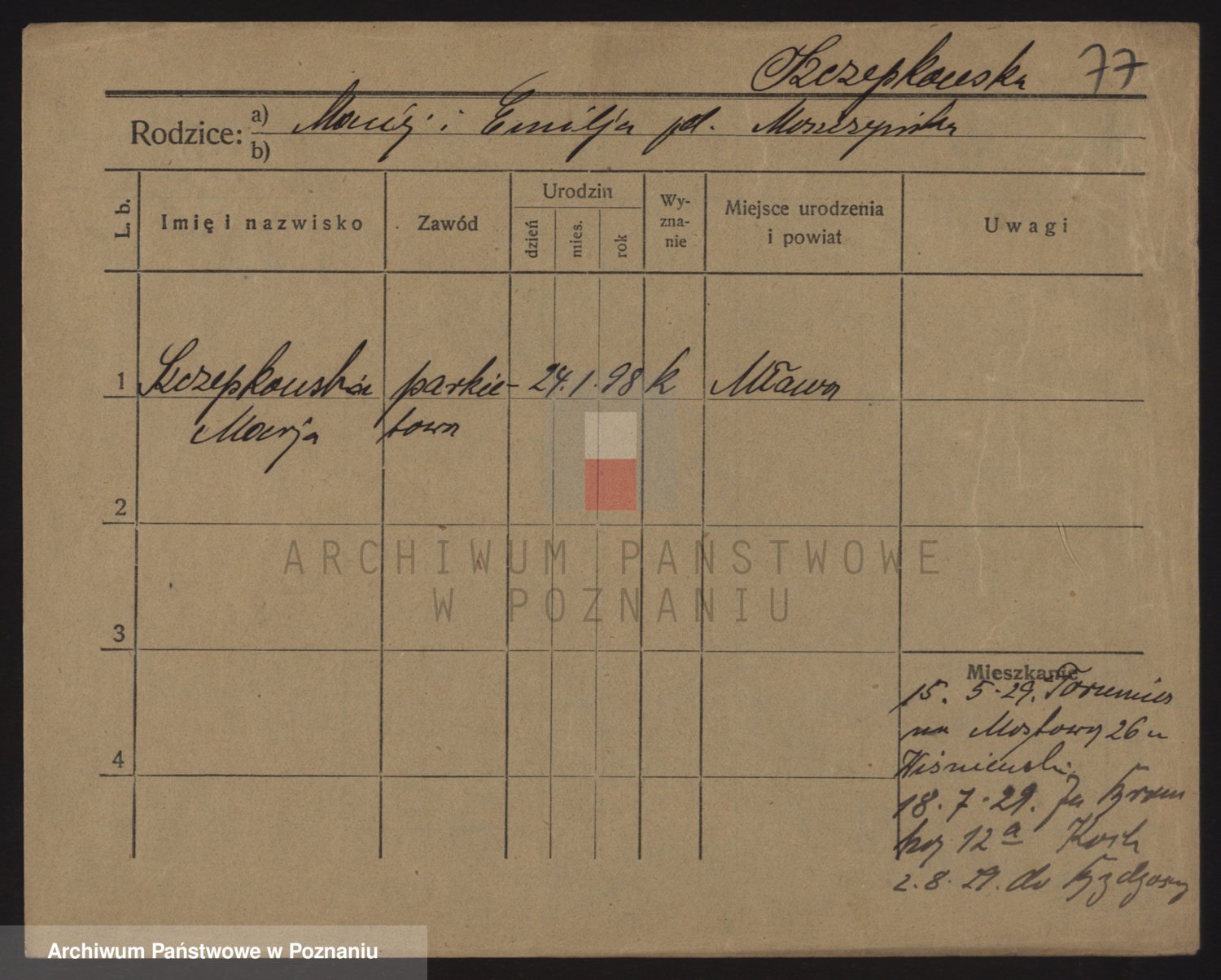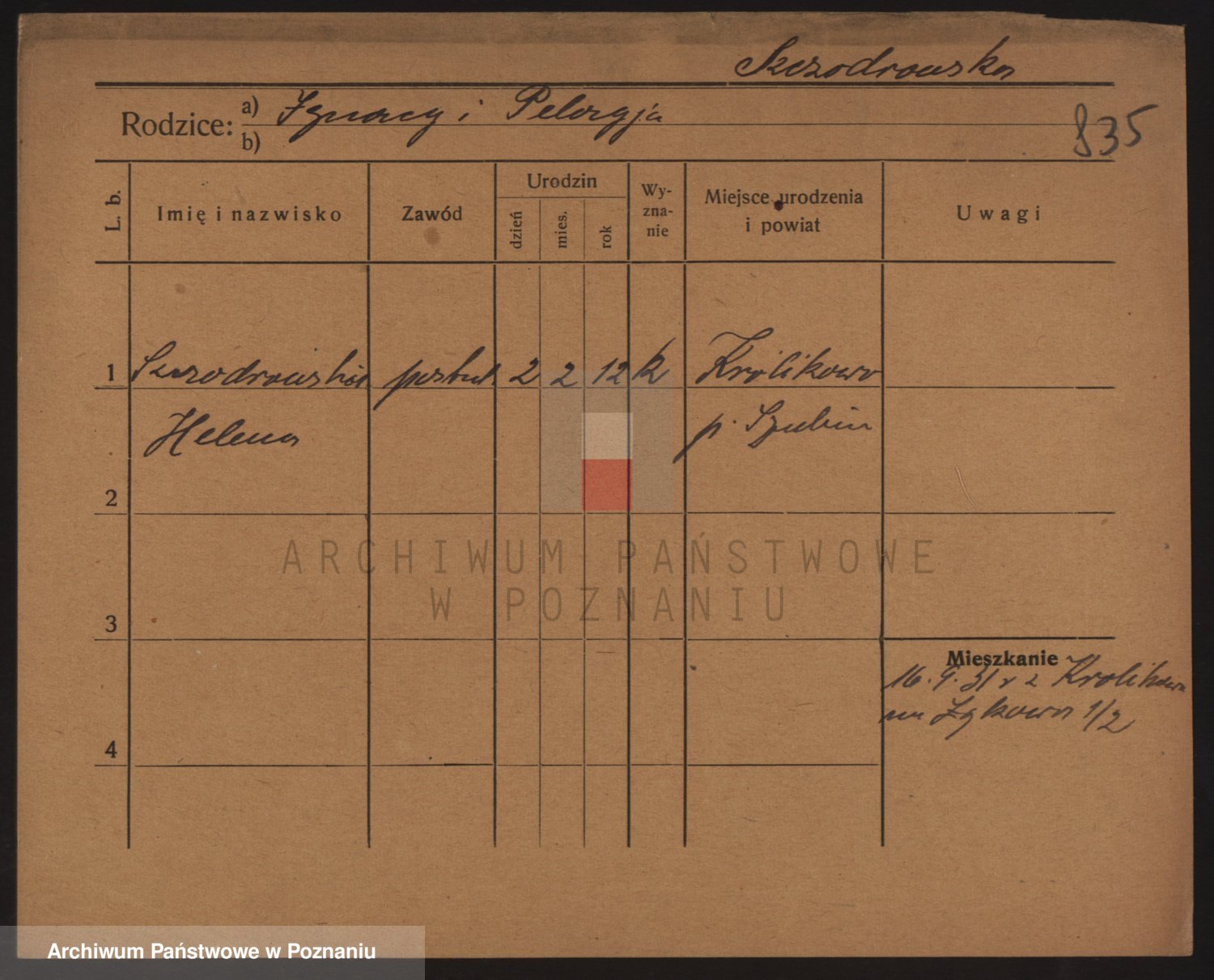 Podgląd karty osobowej dostępny jest po kliknięciu na nazwisko lub ikonkę karty. Można dokonywać powiększenia (ikony na górze) lub przechodzić między kolejnymi skanami (strzałki po bokach).
