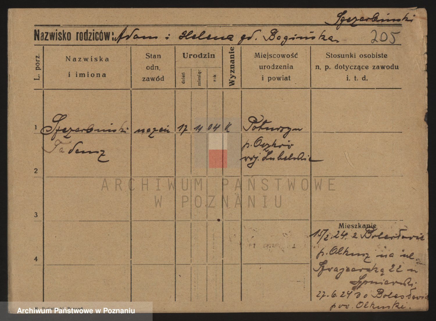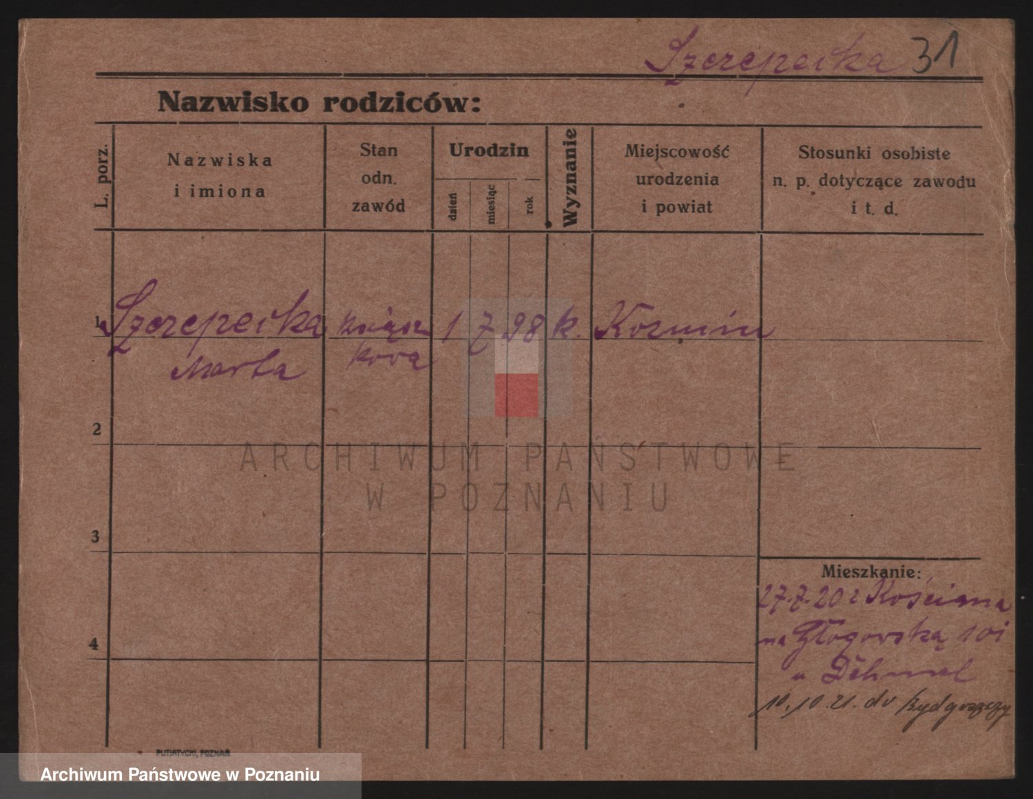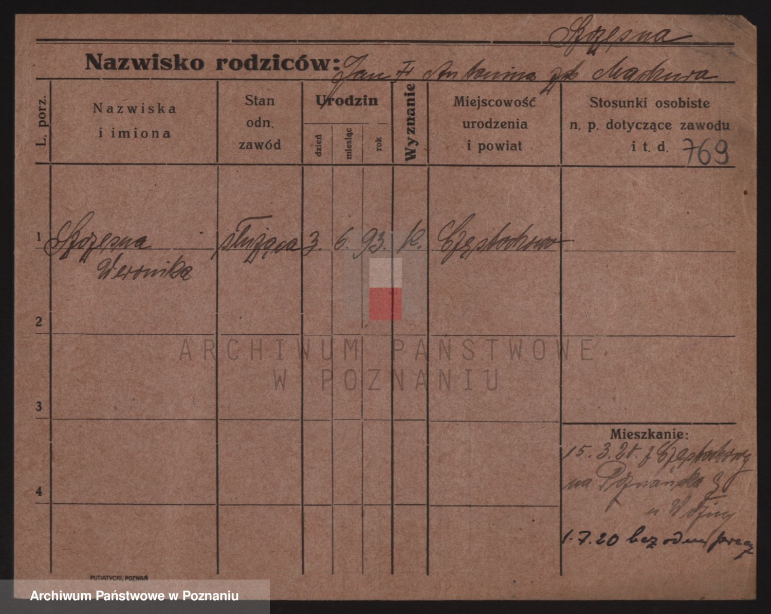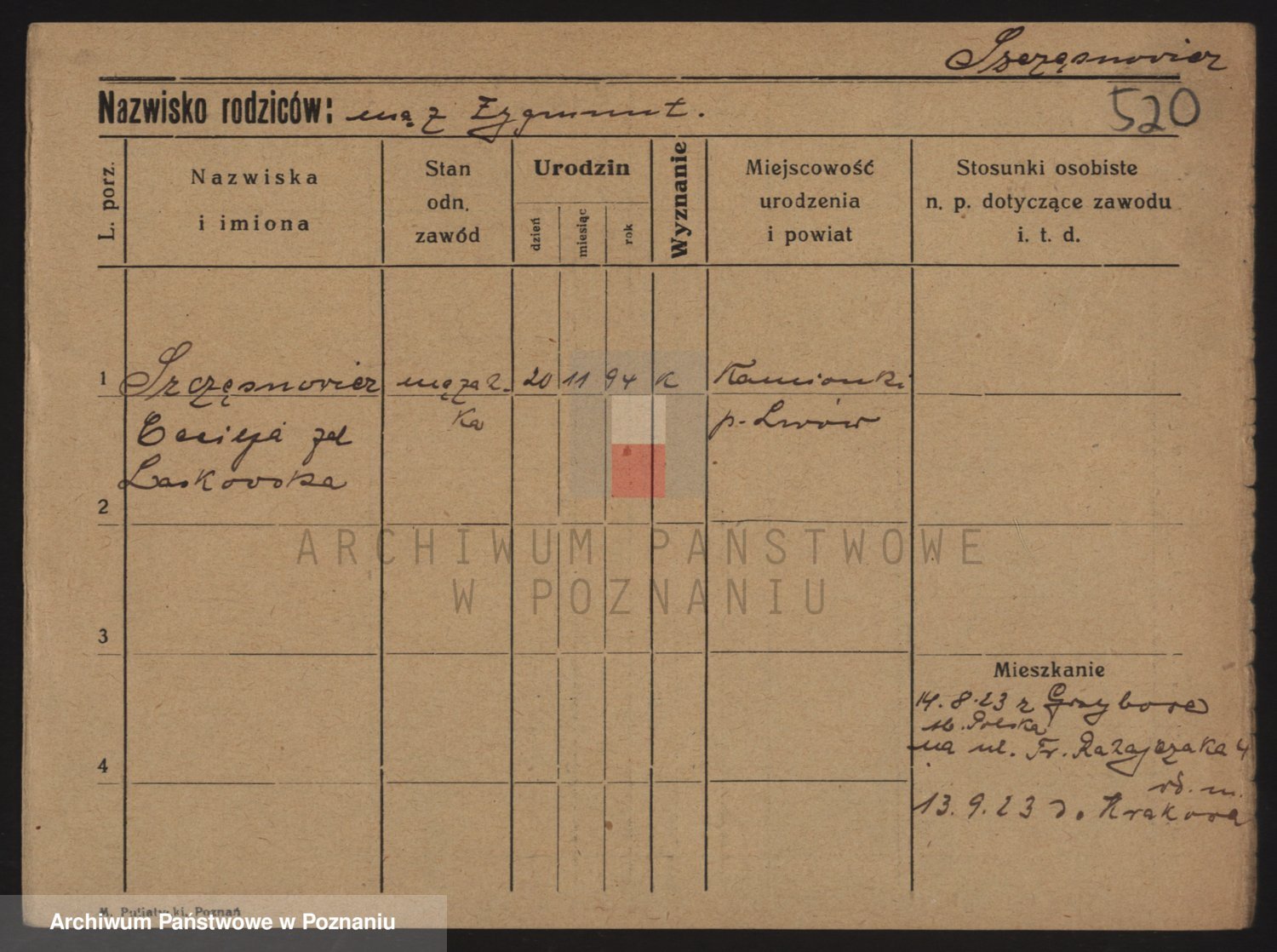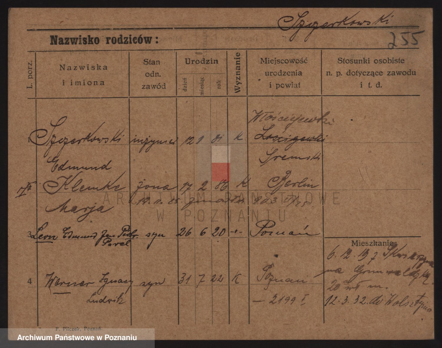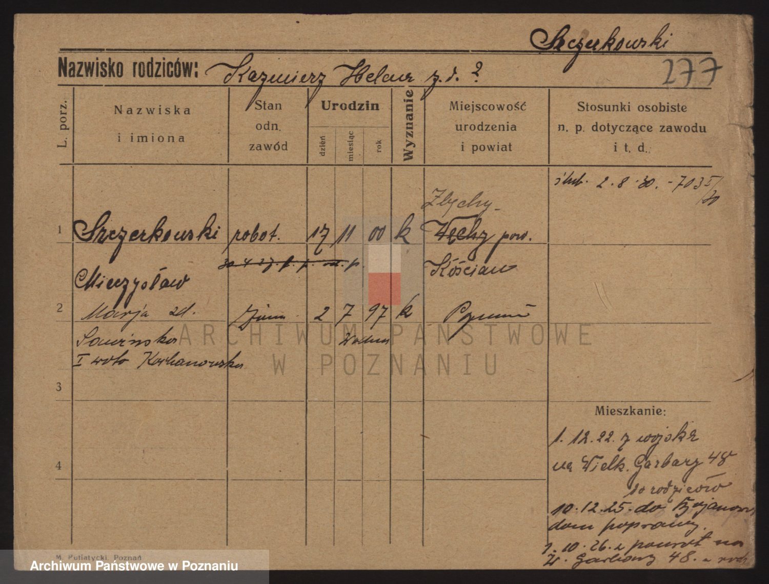 Podgląd karty osobowej dostępny jest po kliknięciu na nazwisko lub ikonkę karty. Można dokonywać powiększenia (ikony na górze) lub przechodzić między kolejnymi skanami (strzałki po bokach).