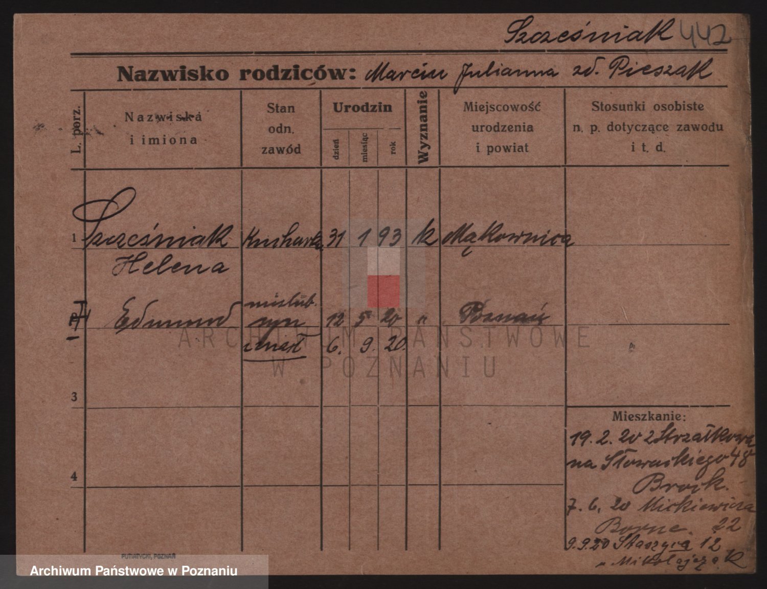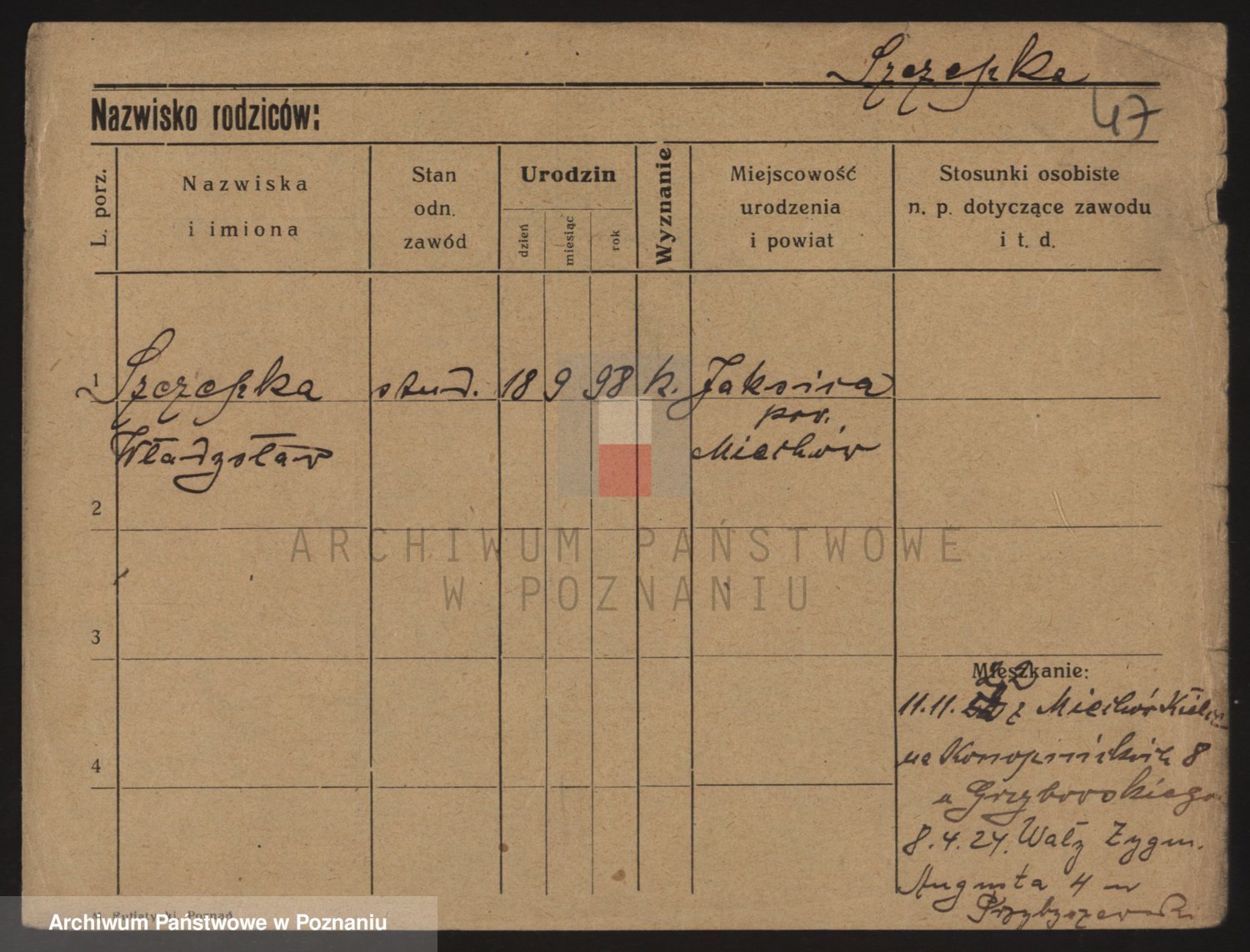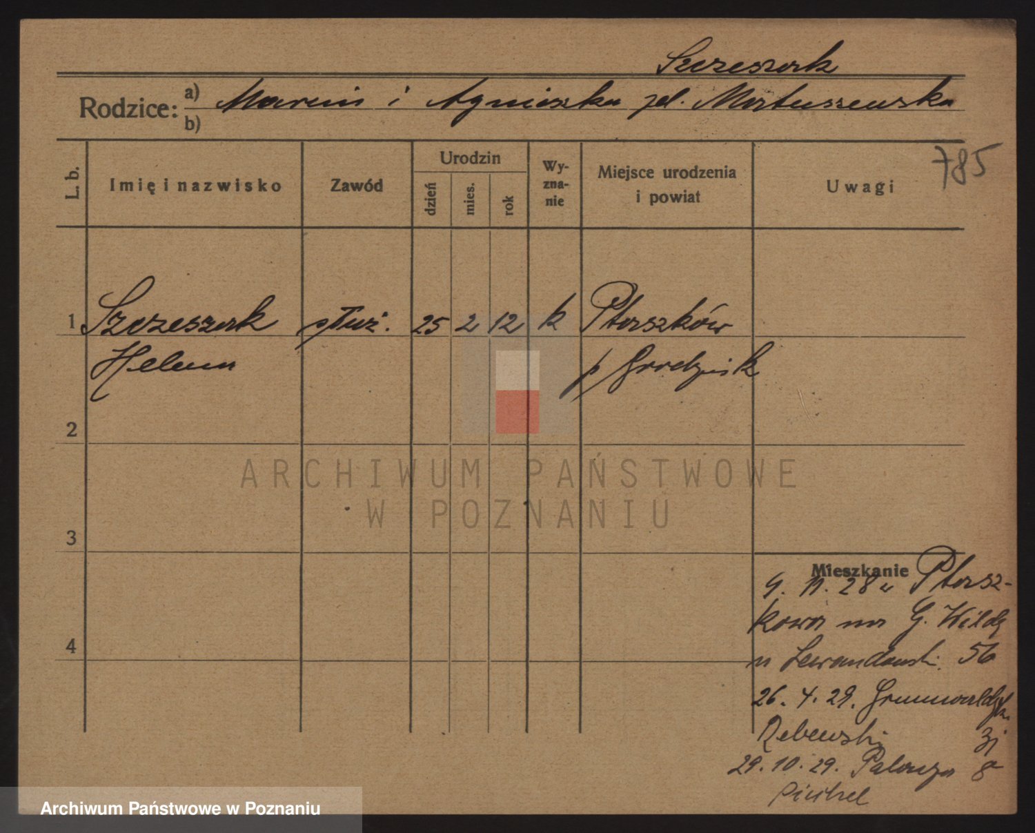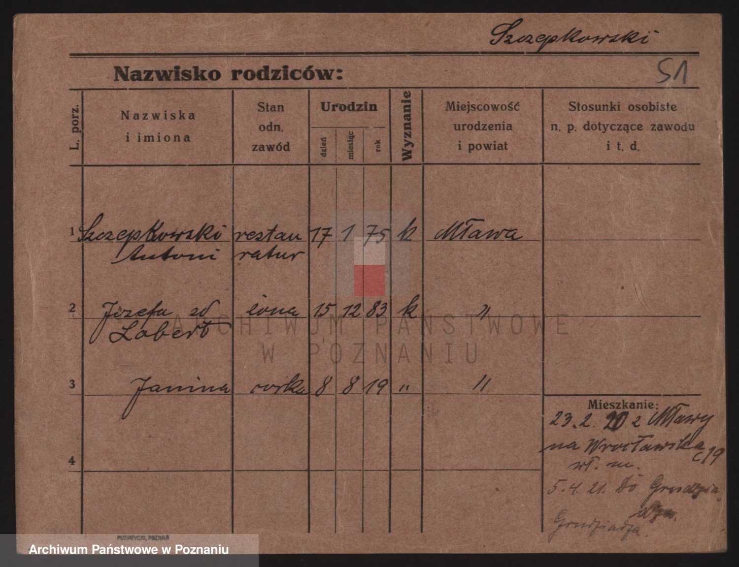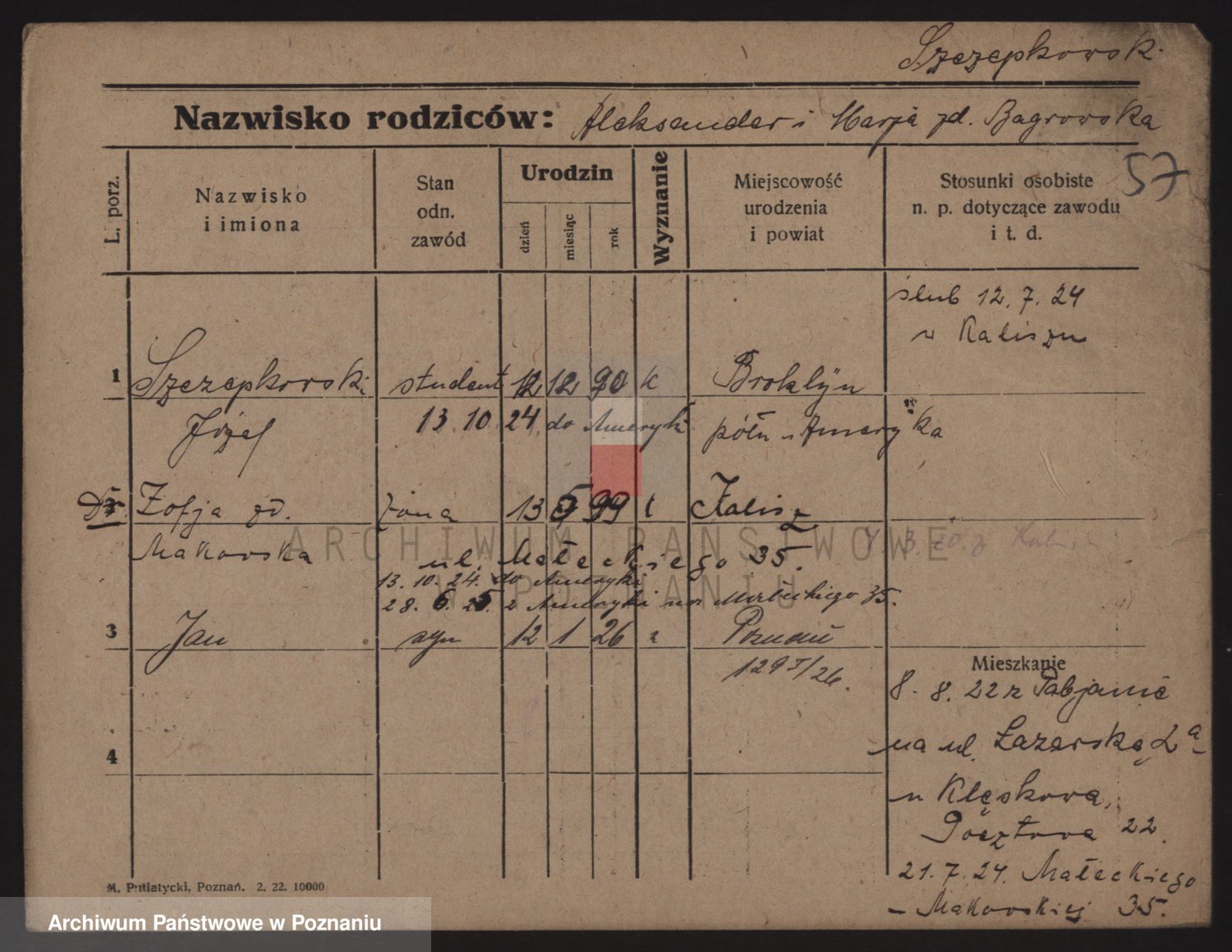 Podgląd karty osobowej dostępny jest po kliknięciu na nazwisko lub ikonkę karty. Można dokonywać powiększenia (ikony na górze) lub przechodzić między kolejnymi skanami (strzałki po bokach).