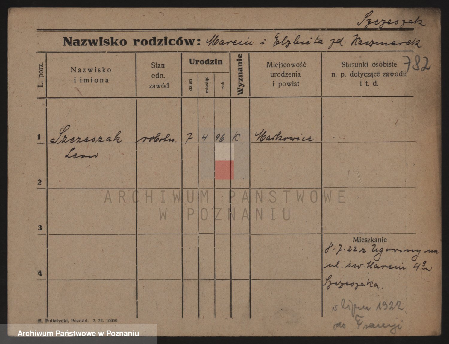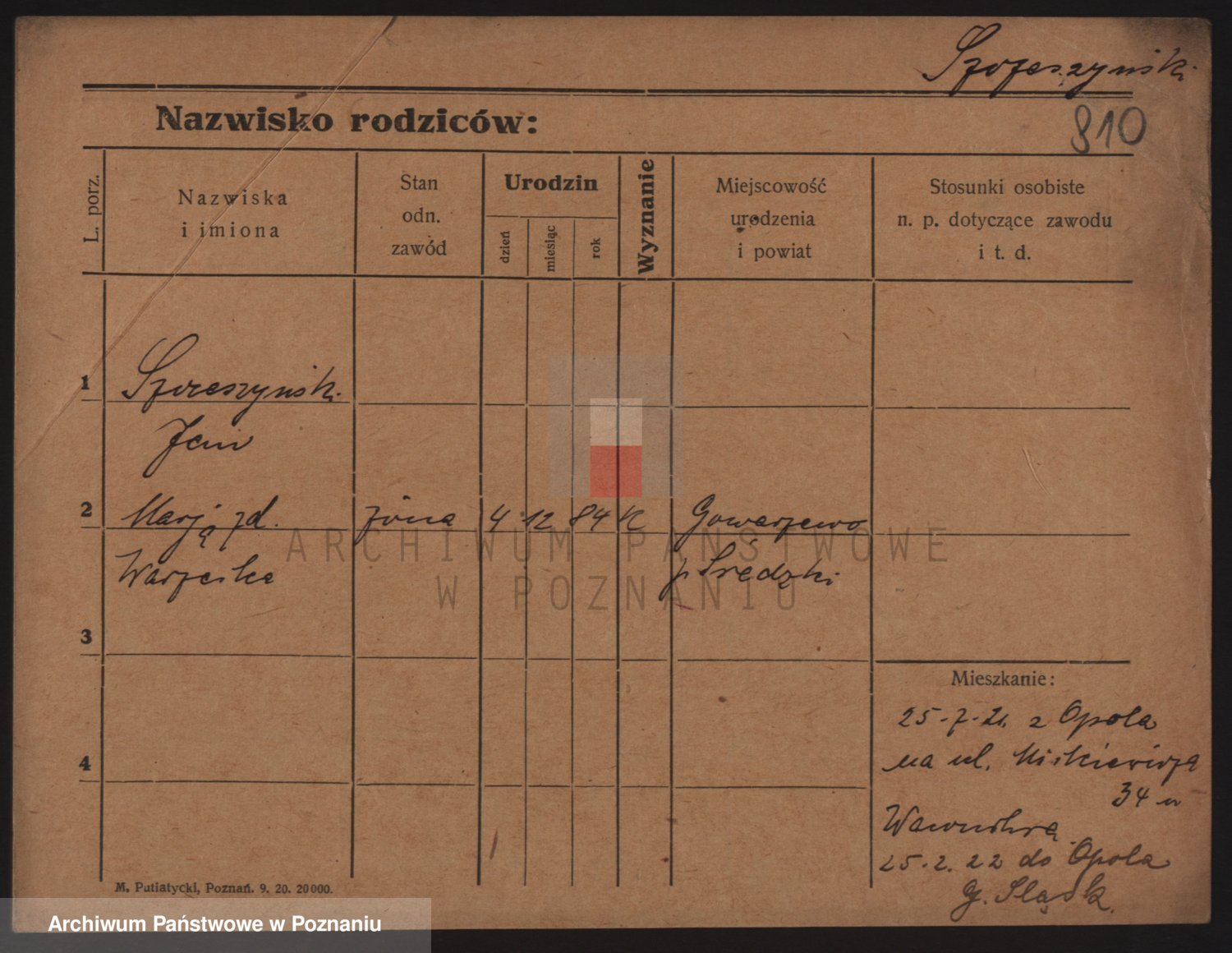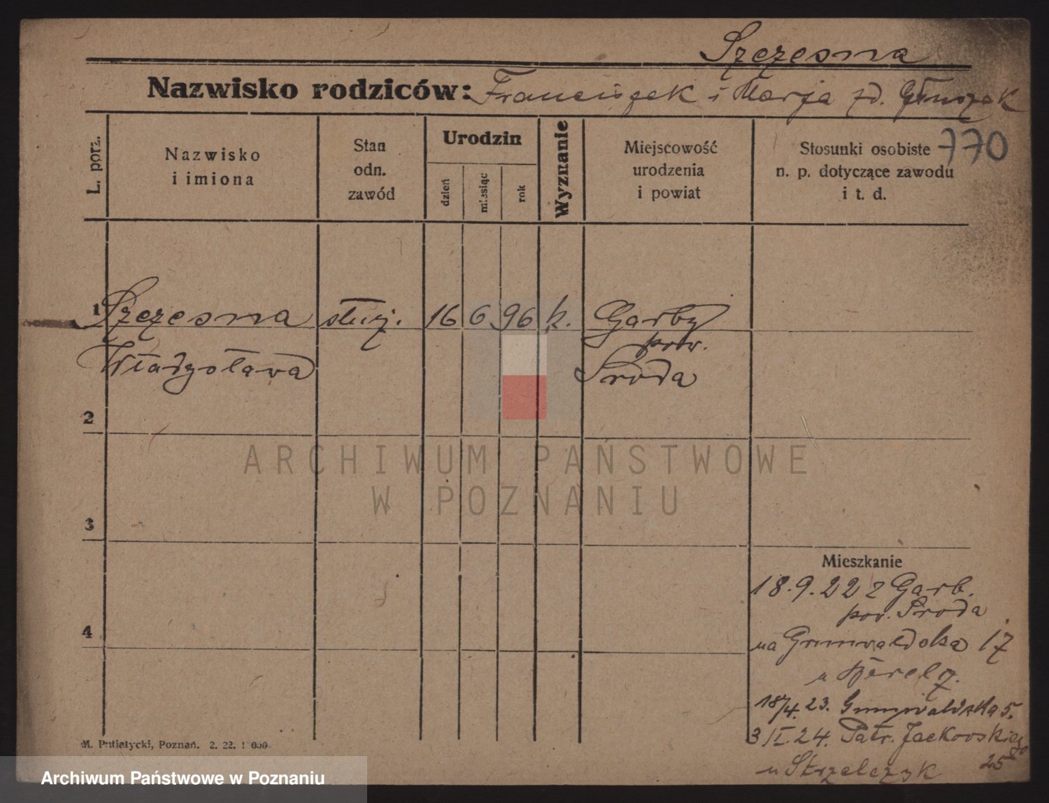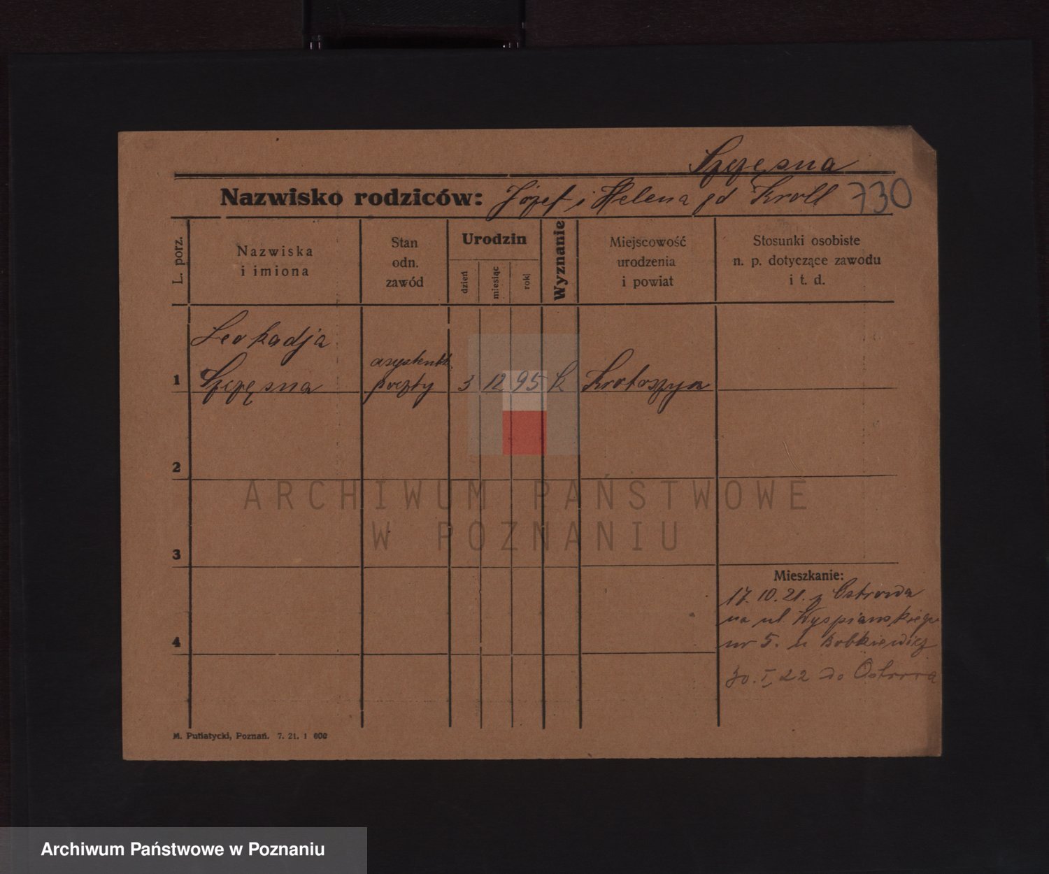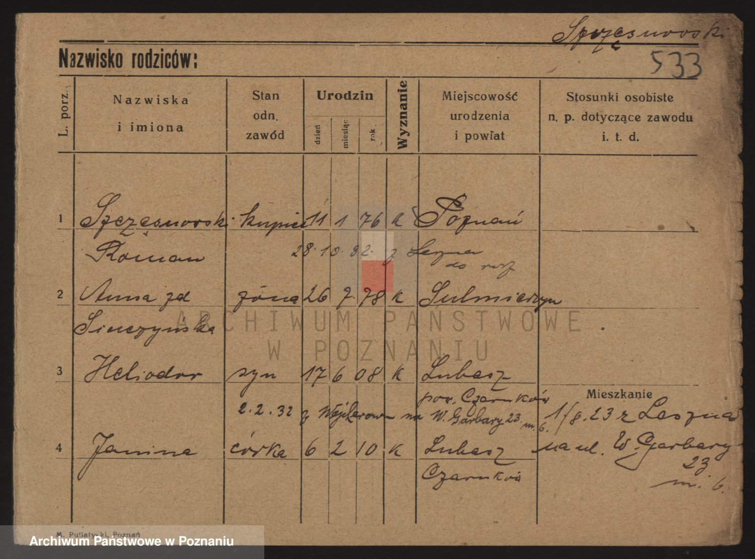 Podgląd karty osobowej dostępny jest po kliknięciu na nazwisko lub ikonkę karty. Można dokonywać powiększenia (ikony na górze) lub przechodzić między kolejnymi skanami (strzałki po bokach).