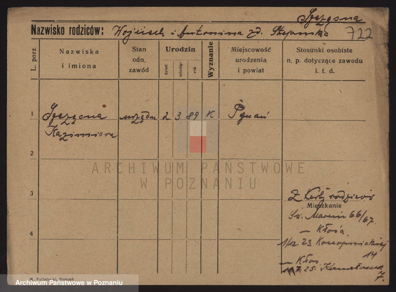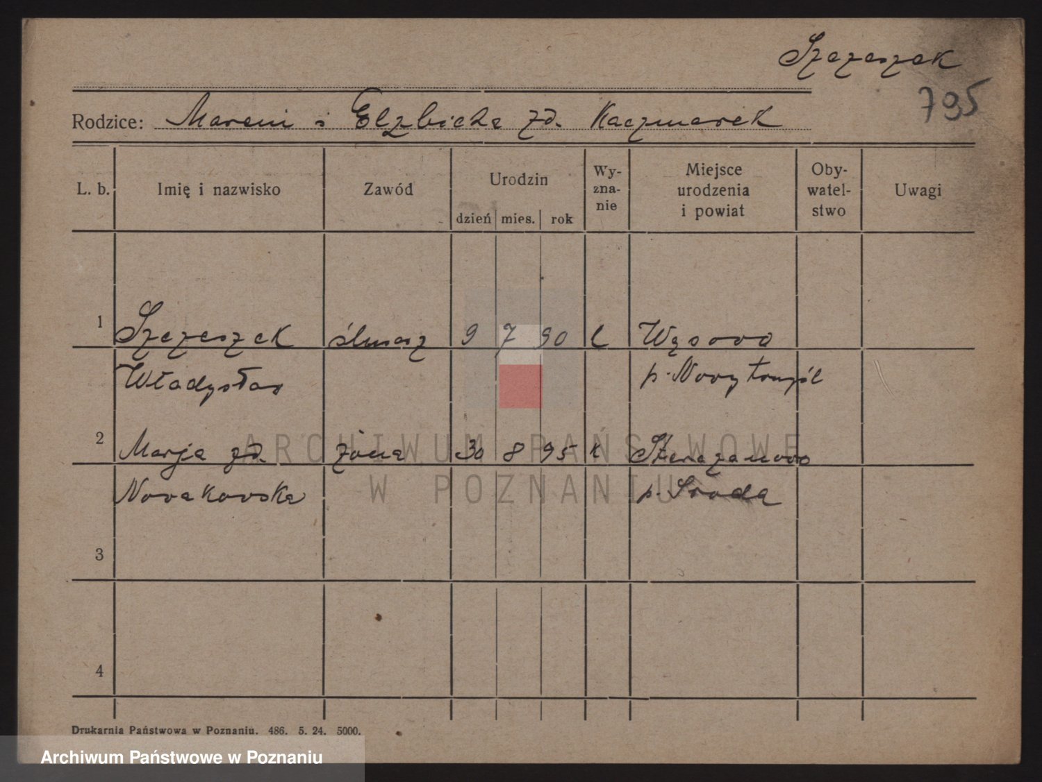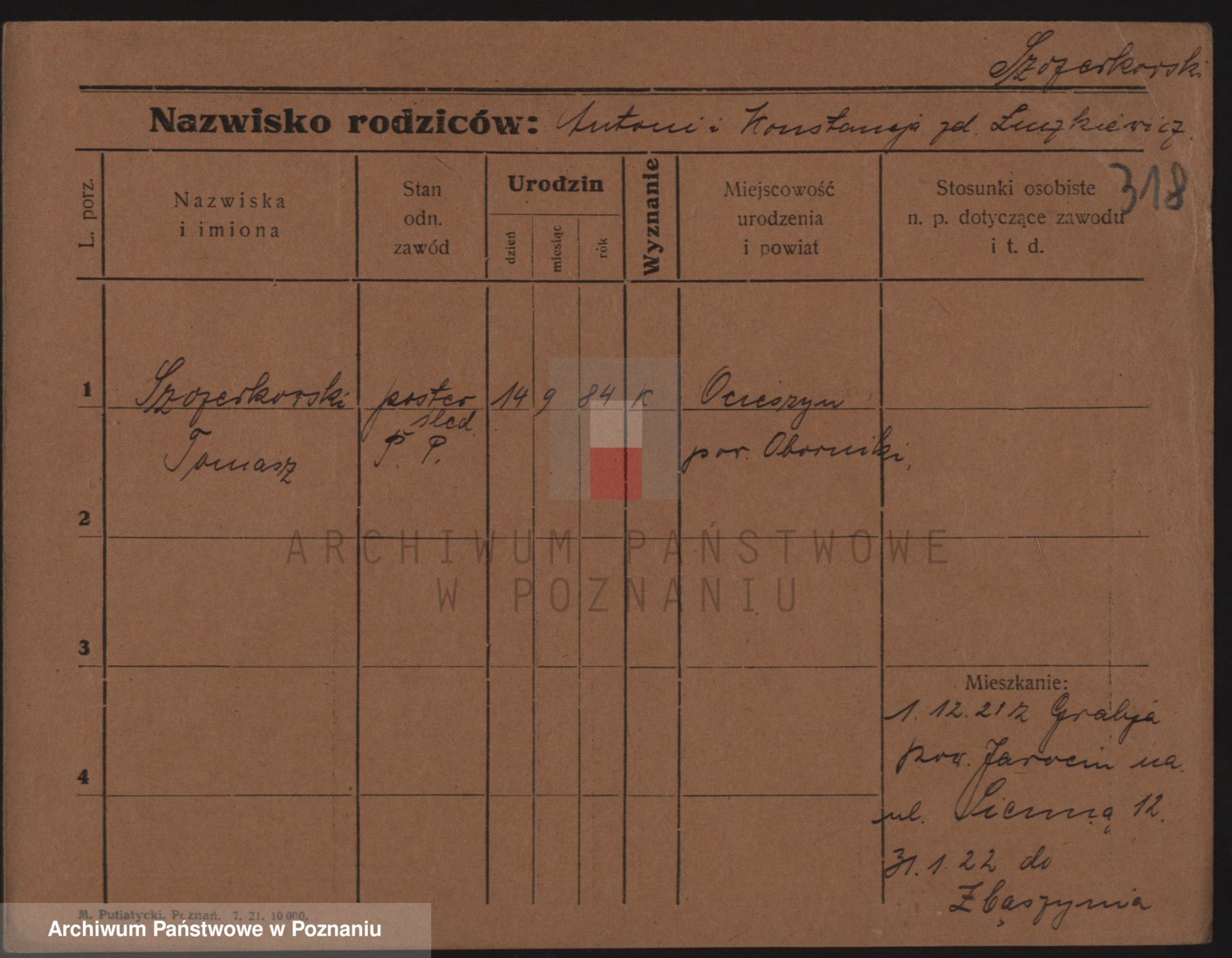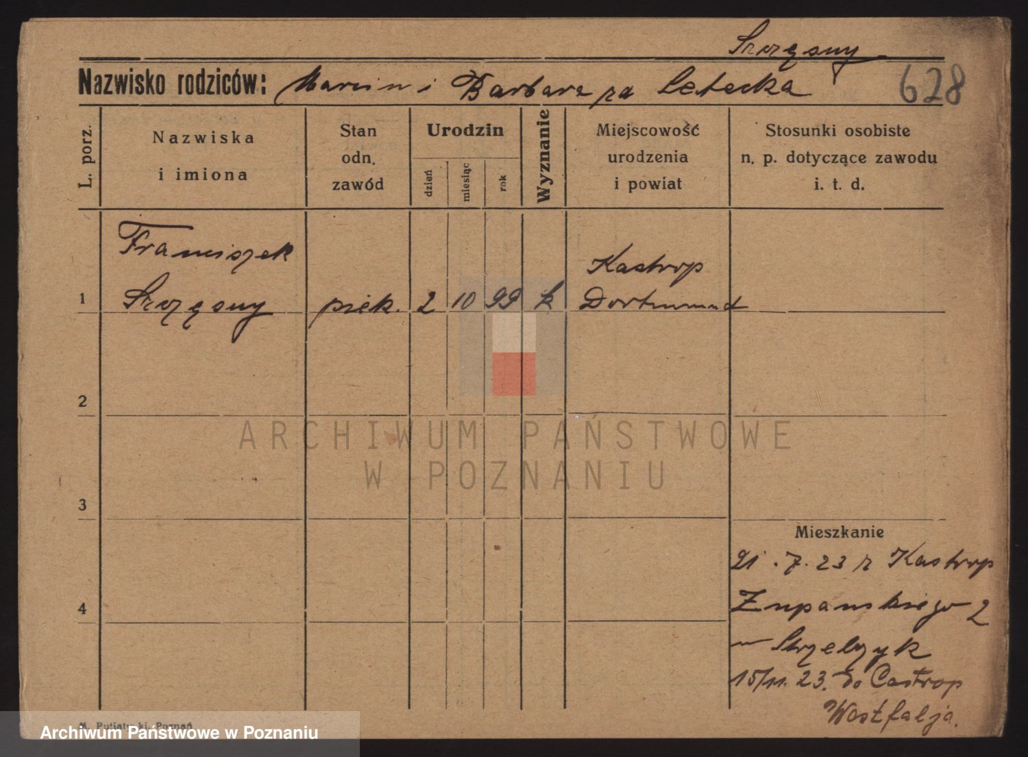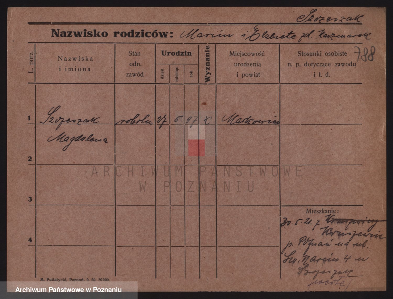 Podgląd karty osobowej dostępny jest po kliknięciu na nazwisko lub ikonkę karty. Można dokonywać powiększenia (ikony na górze) lub przechodzić między kolejnymi skanami (strzałki po bokach).