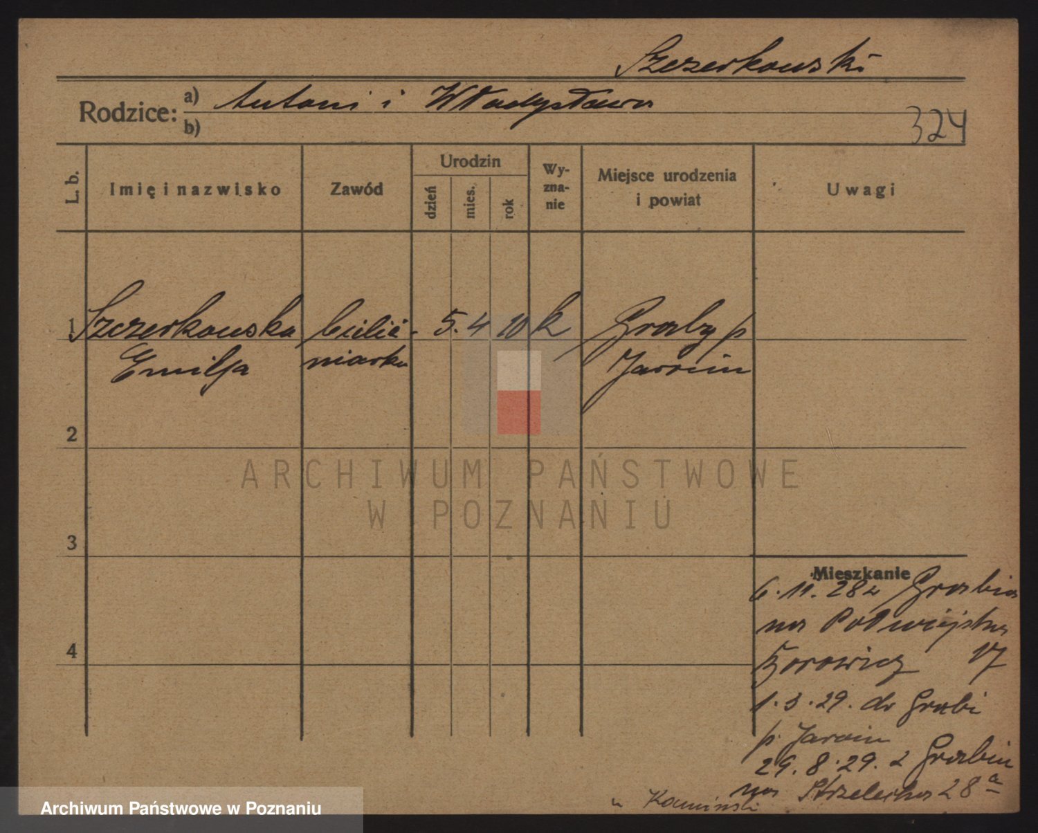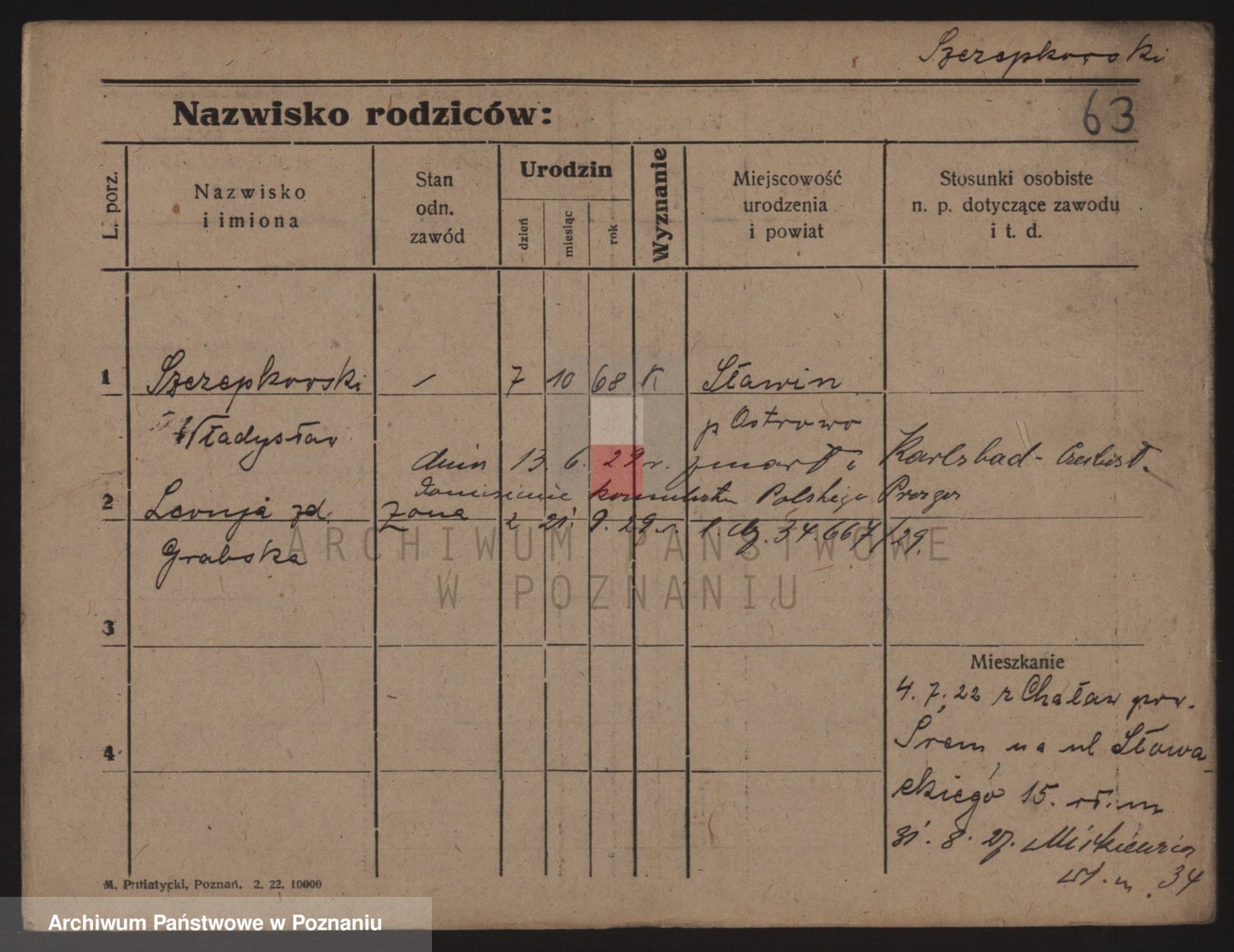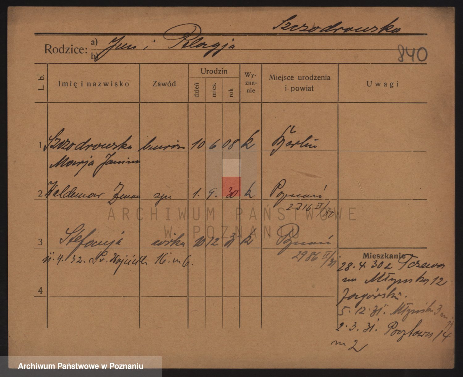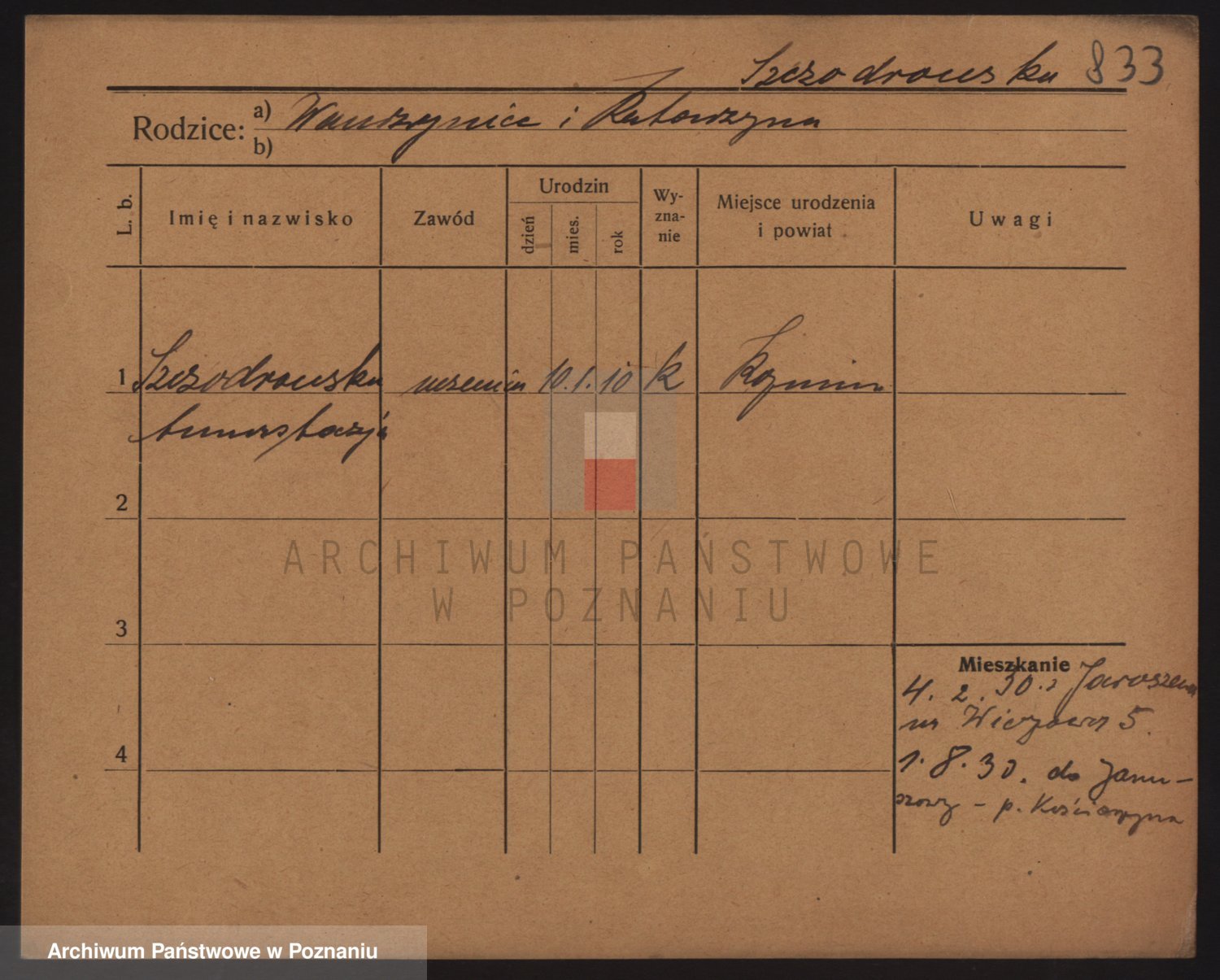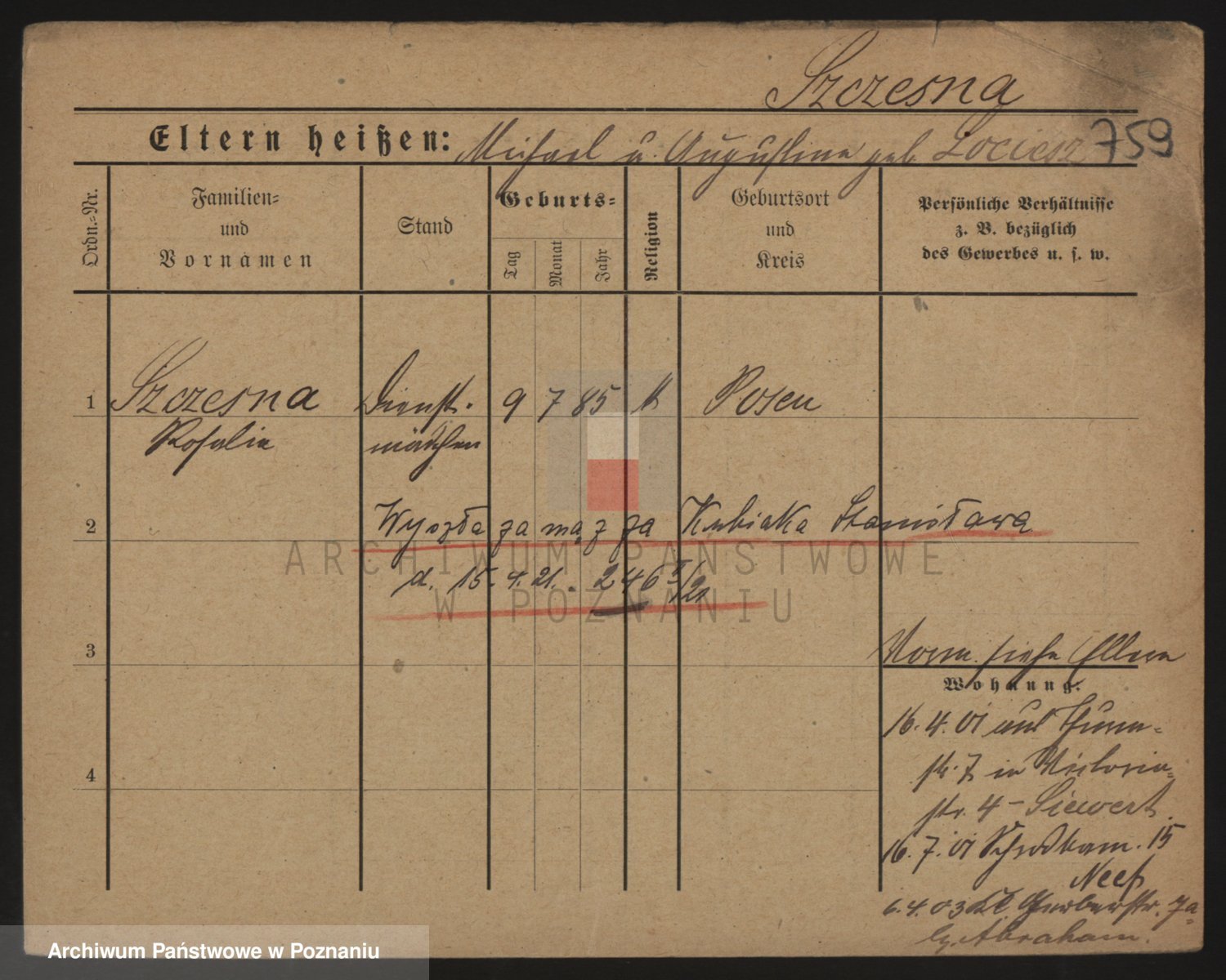 Podgląd karty osobowej dostępny jest po kliknięciu na nazwisko lub ikonkę karty. Można dokonywać powiększenia (ikony na górze) lub przechodzić między kolejnymi skanami (strzałki po bokach).