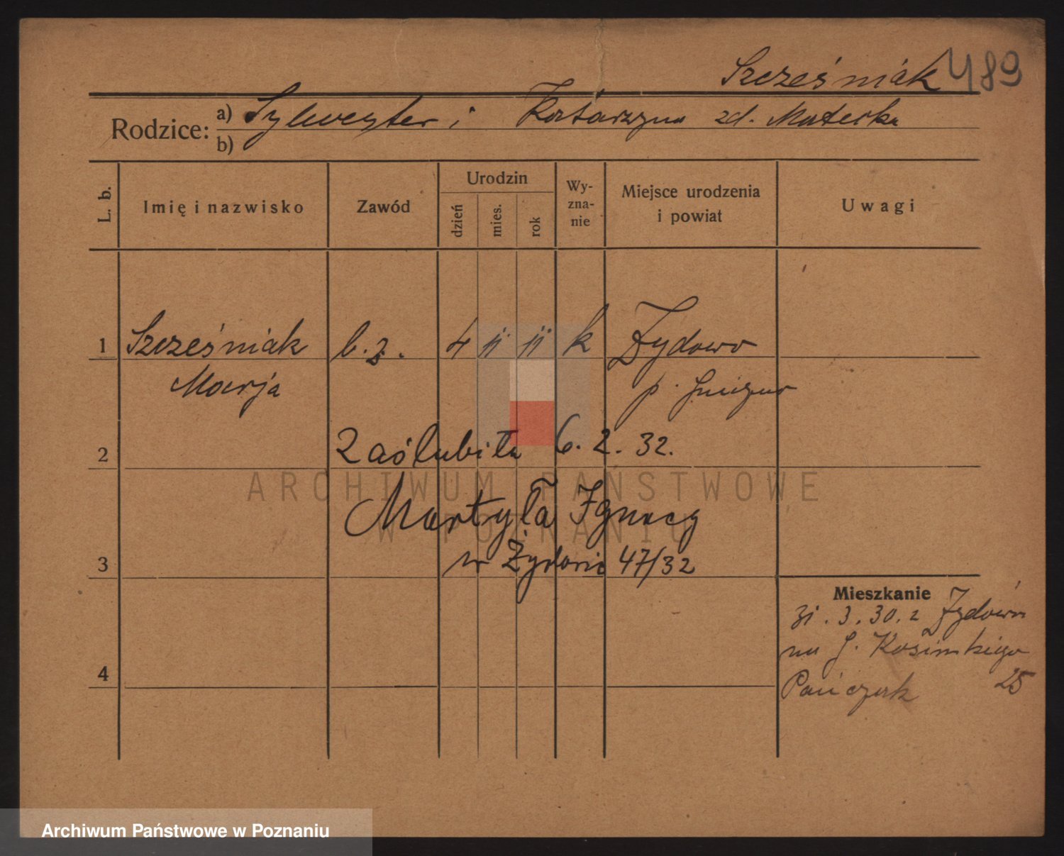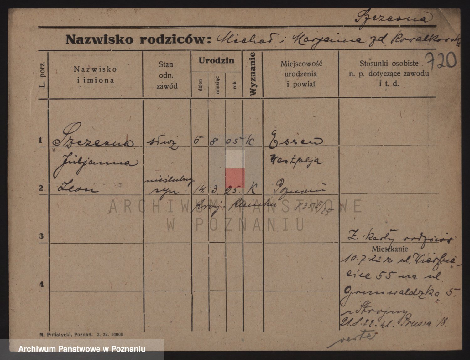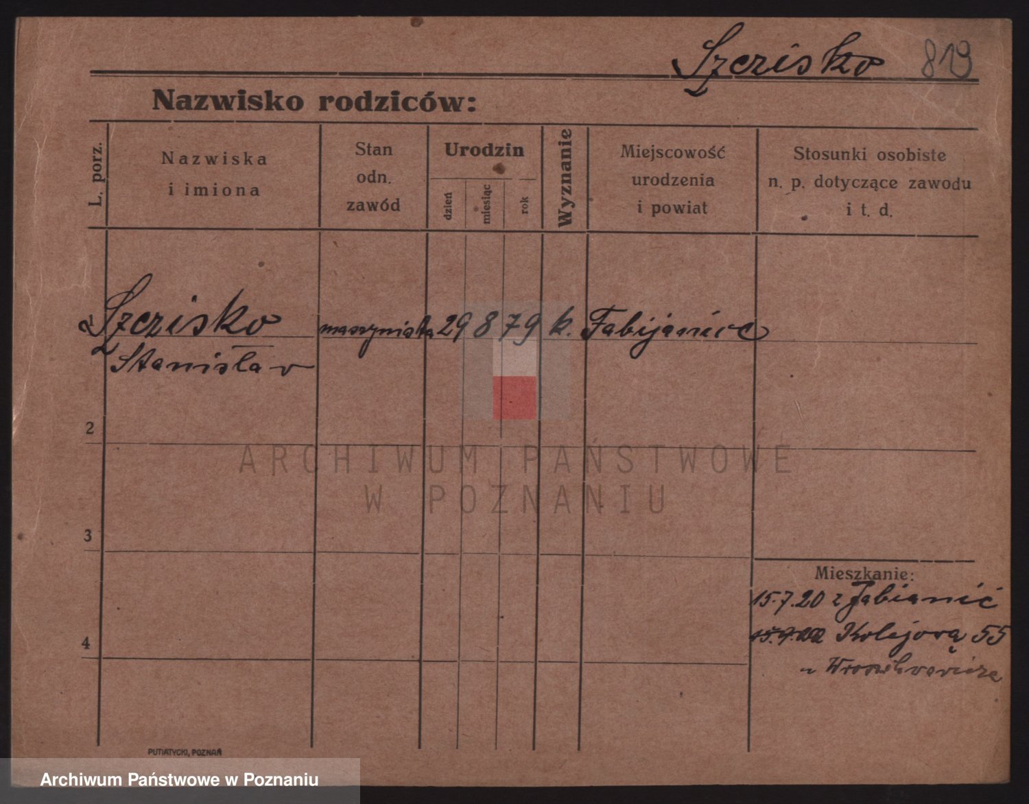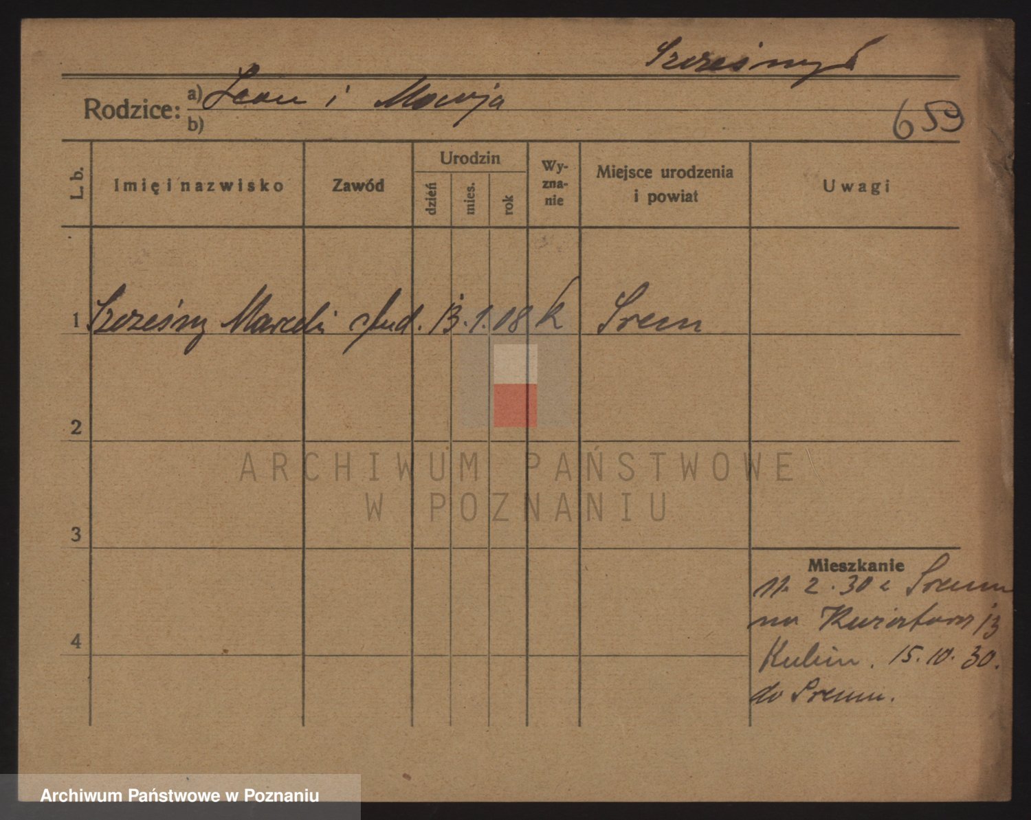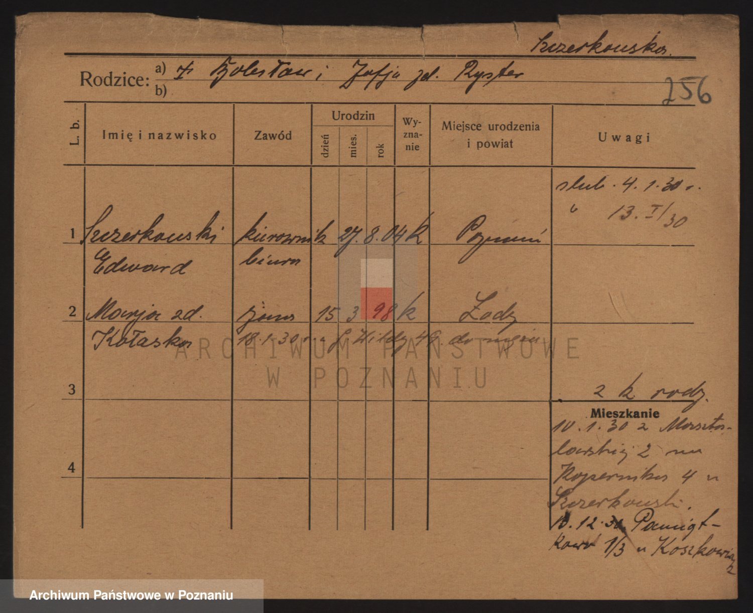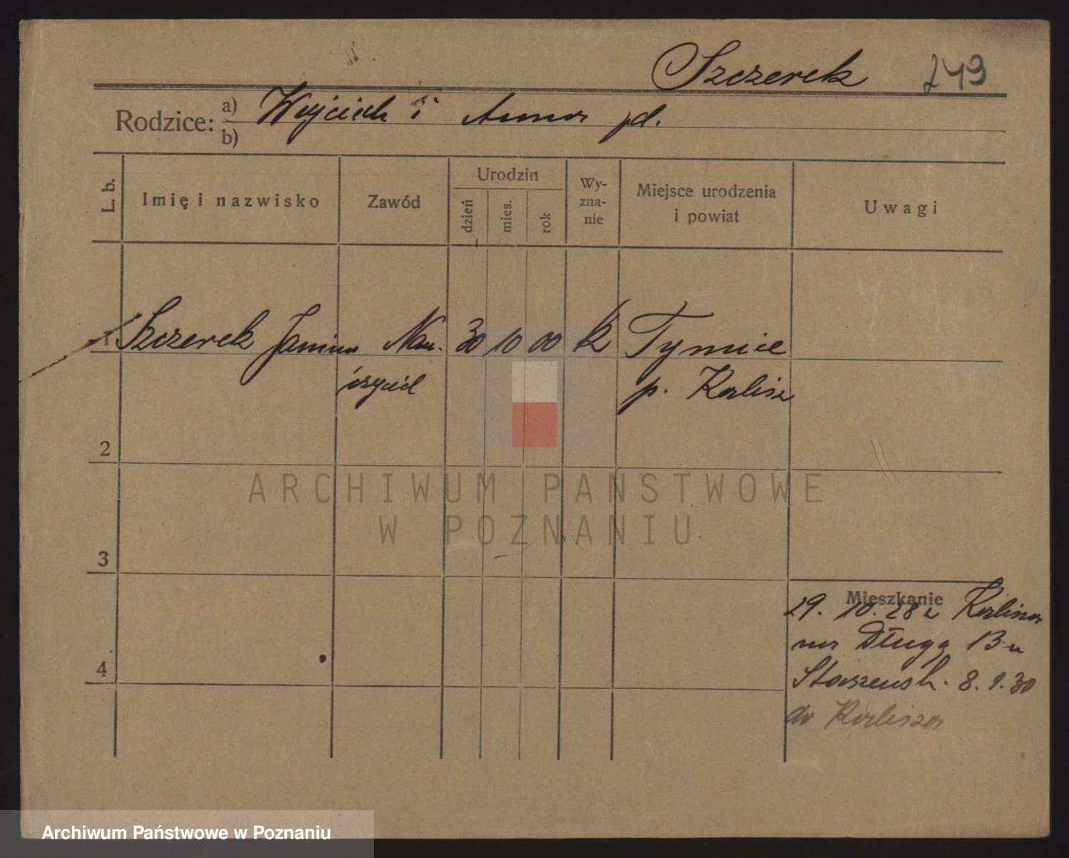 Podgląd karty osobowej dostępny jest po kliknięciu na nazwisko lub ikonkę karty. Można dokonywać powiększenia (ikony na górze) lub przechodzić między kolejnymi skanami (strzałki po bokach).