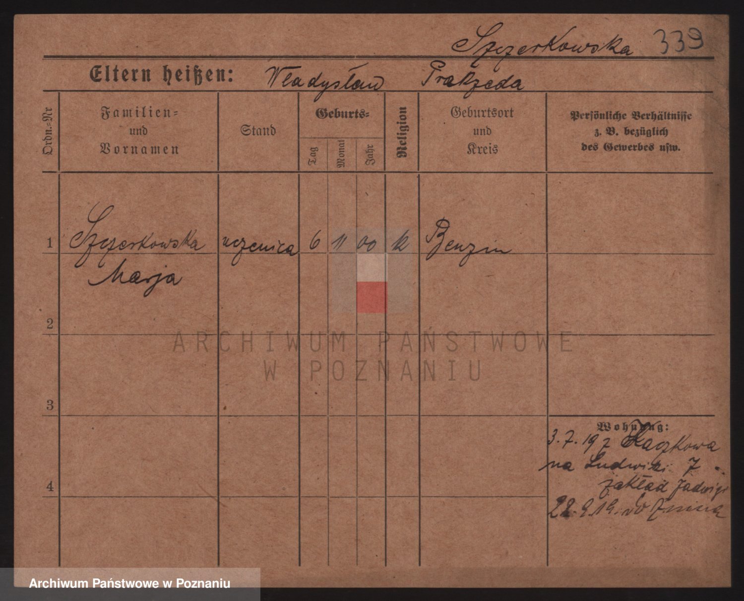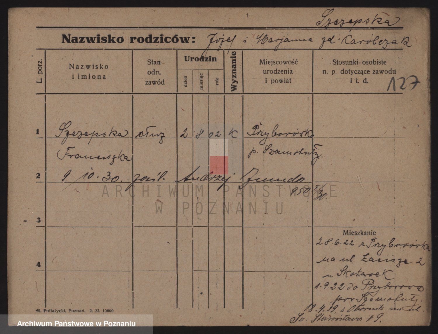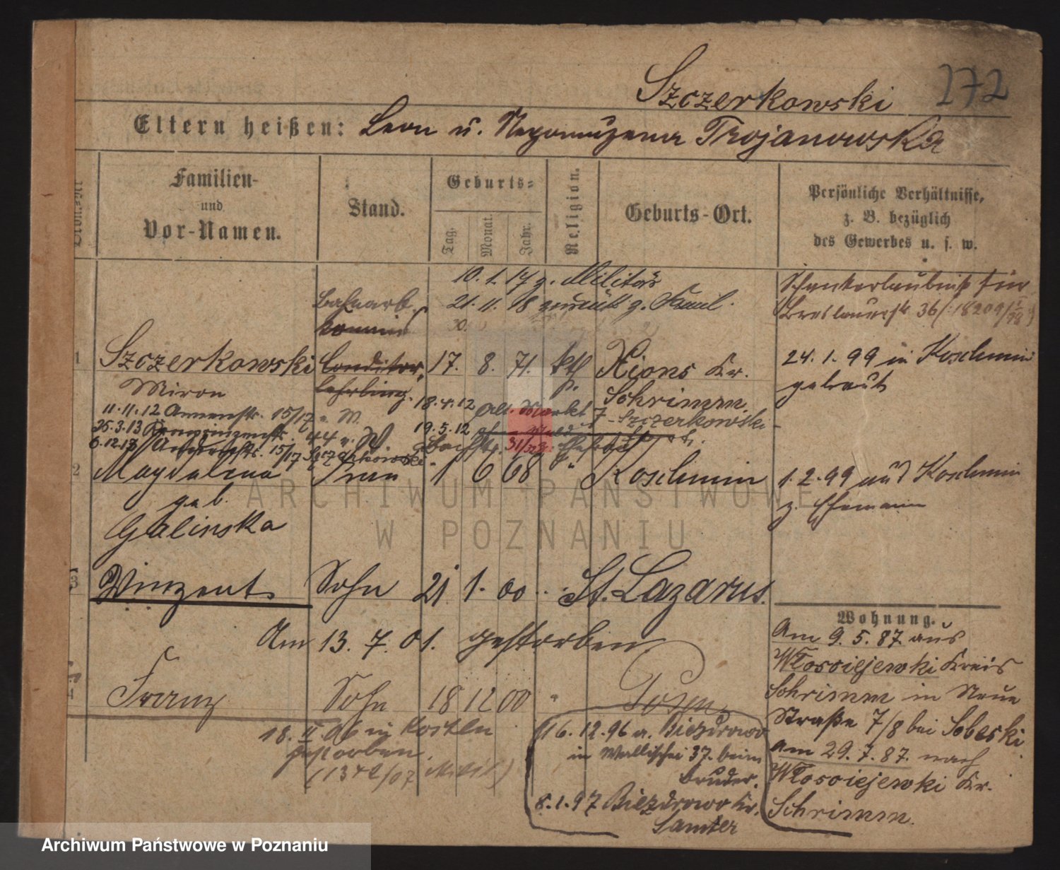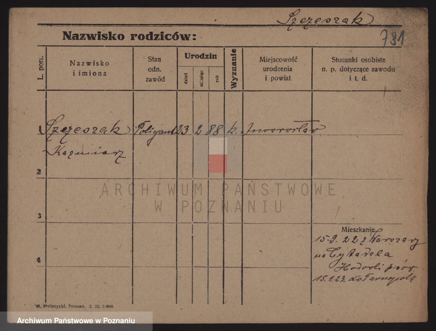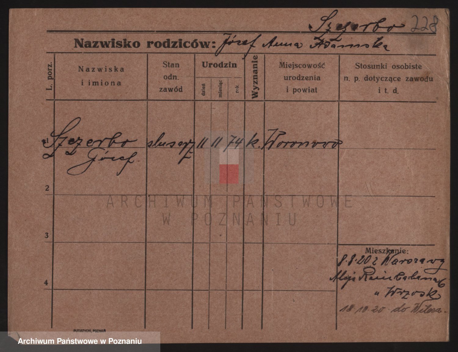 Podgląd karty osobowej dostępny jest po kliknięciu na nazwisko lub ikonkę karty. Można dokonywać powiększenia (ikony na górze) lub przechodzić między kolejnymi skanami (strzałki po bokach).
