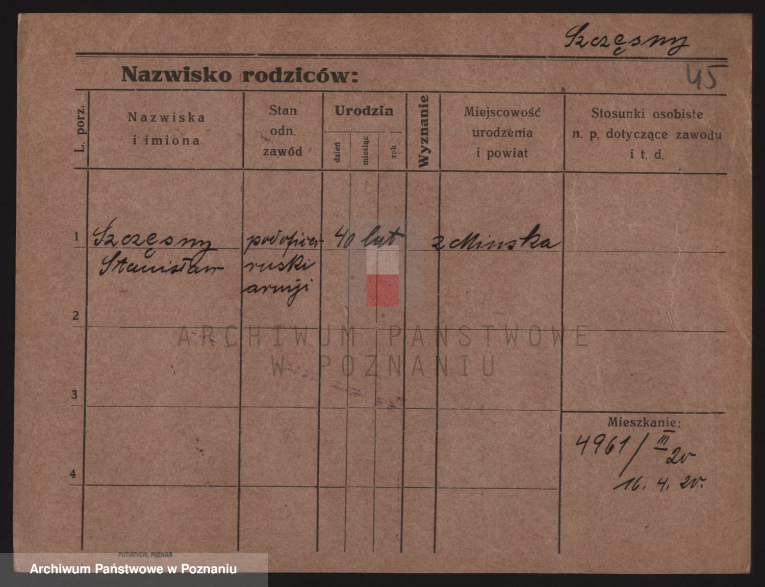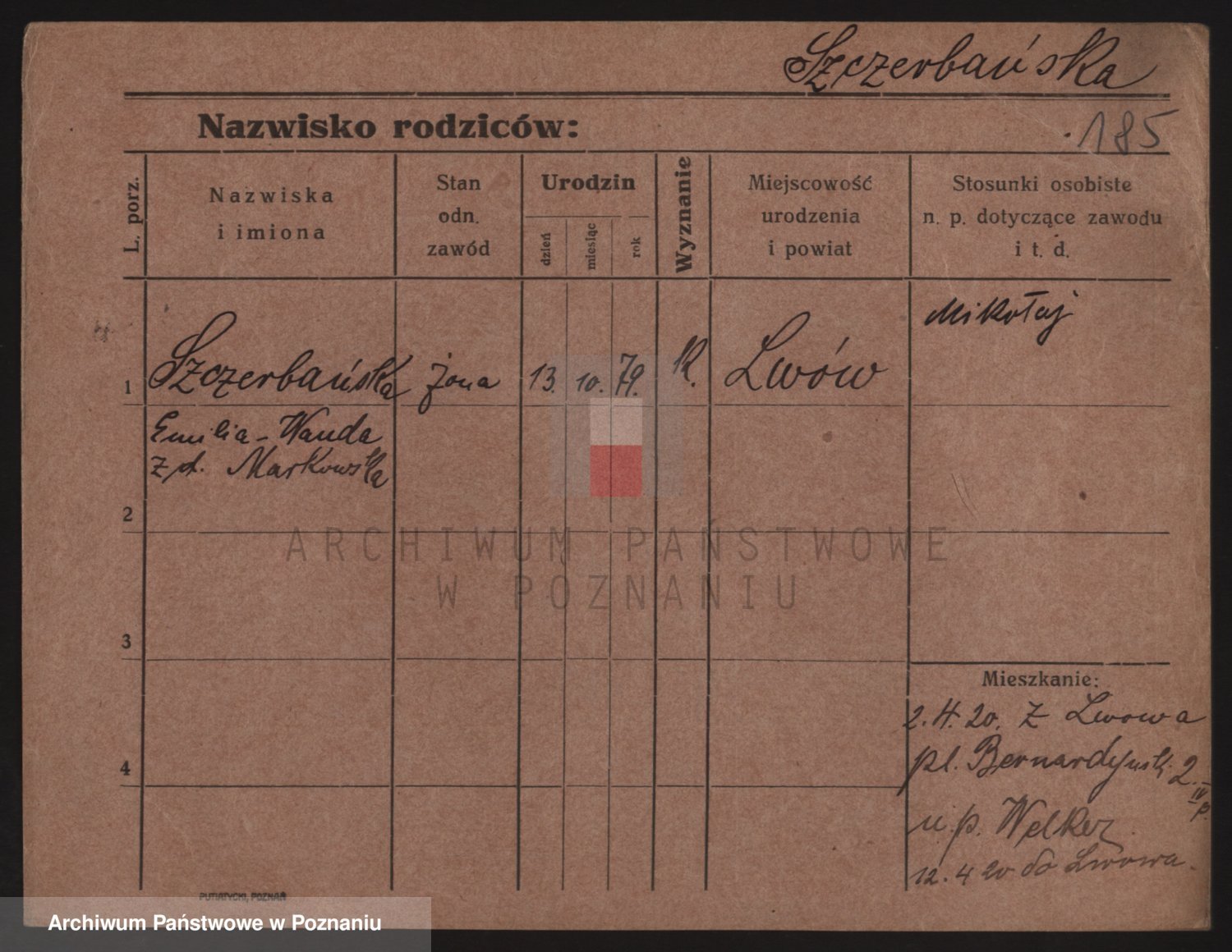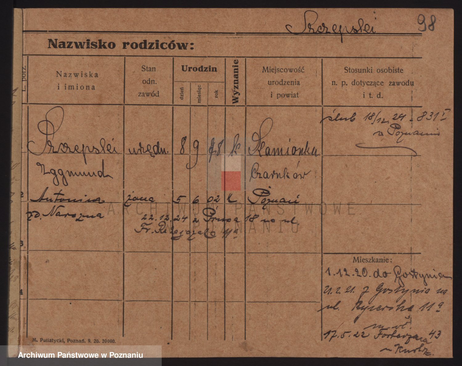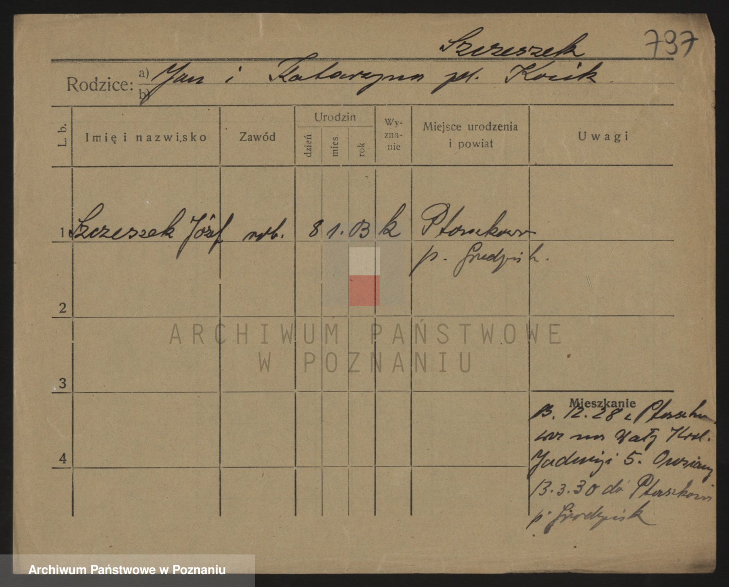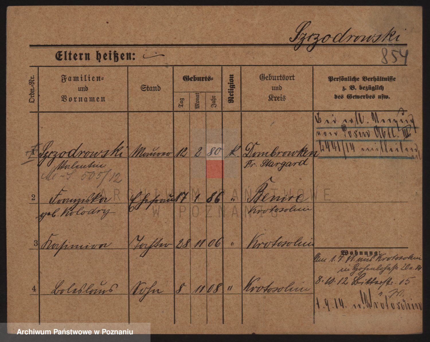 Podgląd karty osobowej dostępny jest po kliknięciu na nazwisko lub ikonkę karty. Można dokonywać powiększenia (ikony na górze) lub przechodzić między kolejnymi skanami (strzałki po bokach).