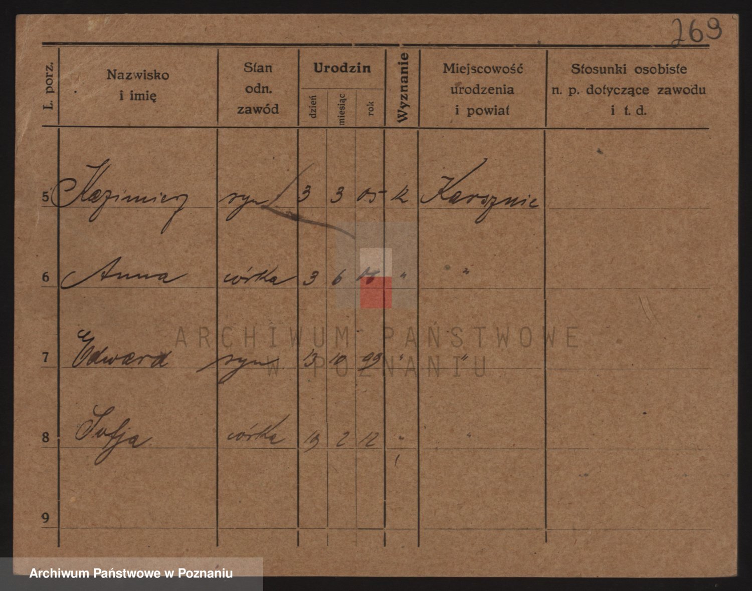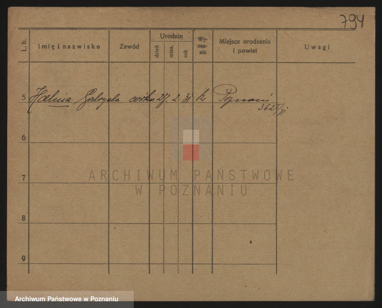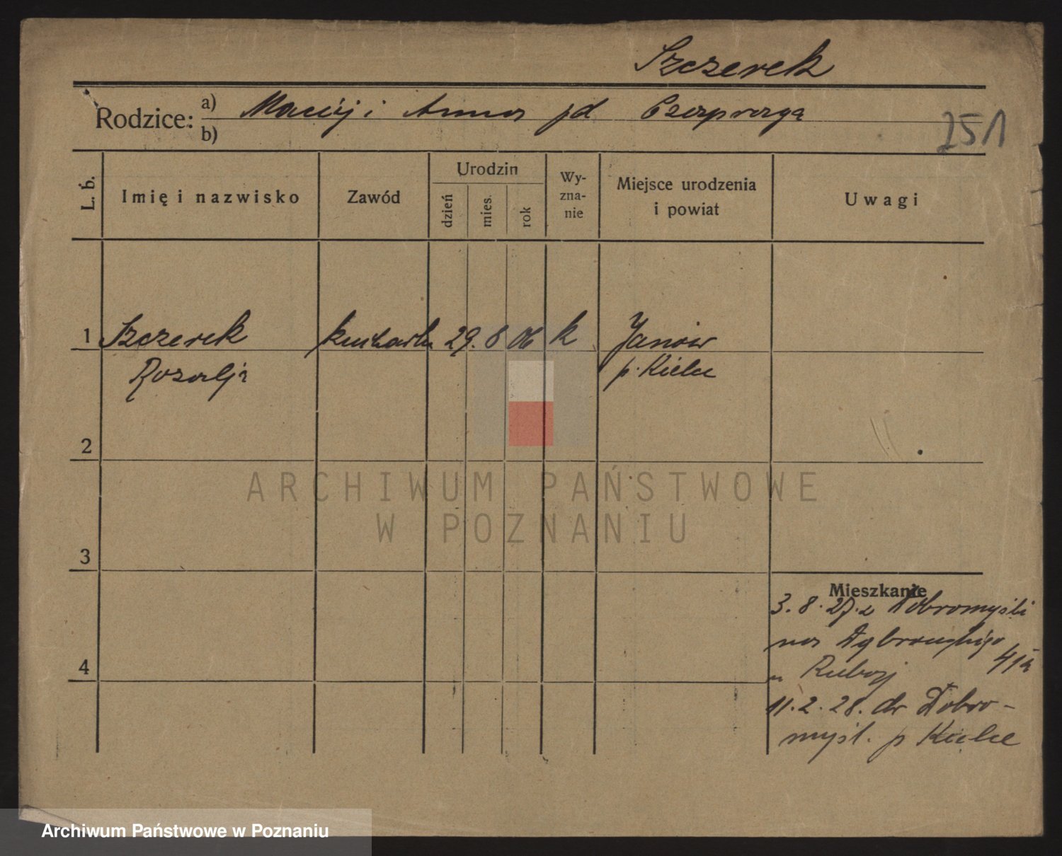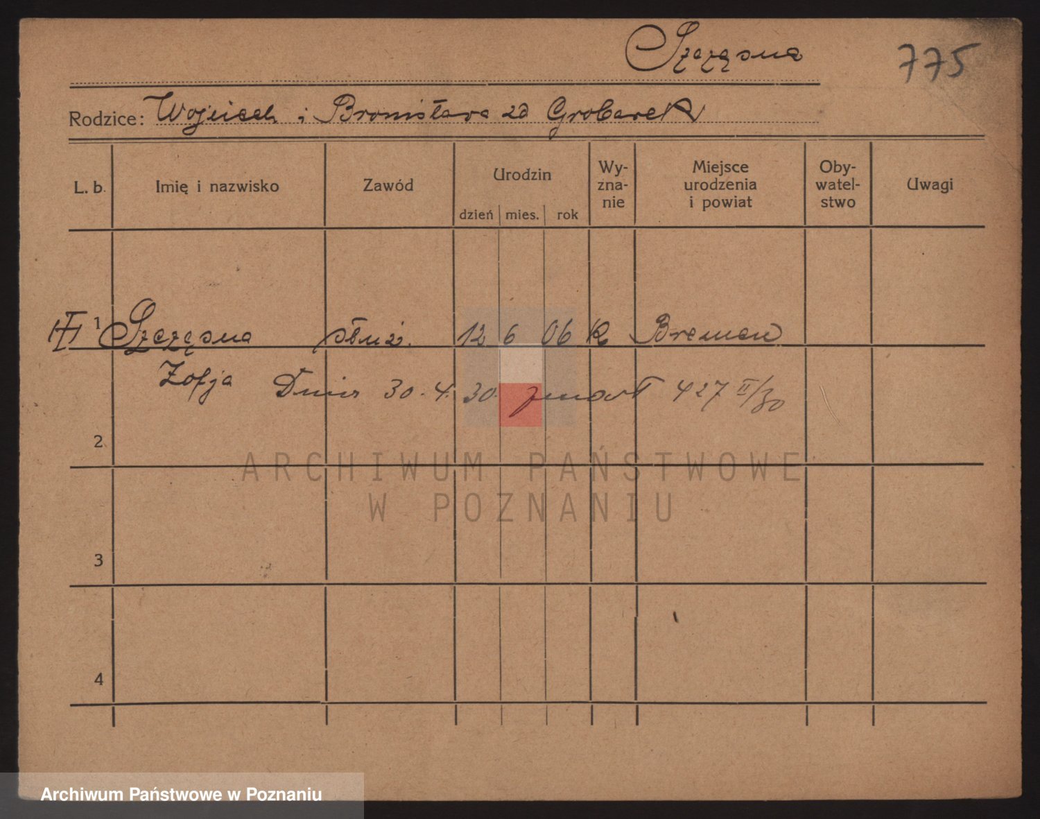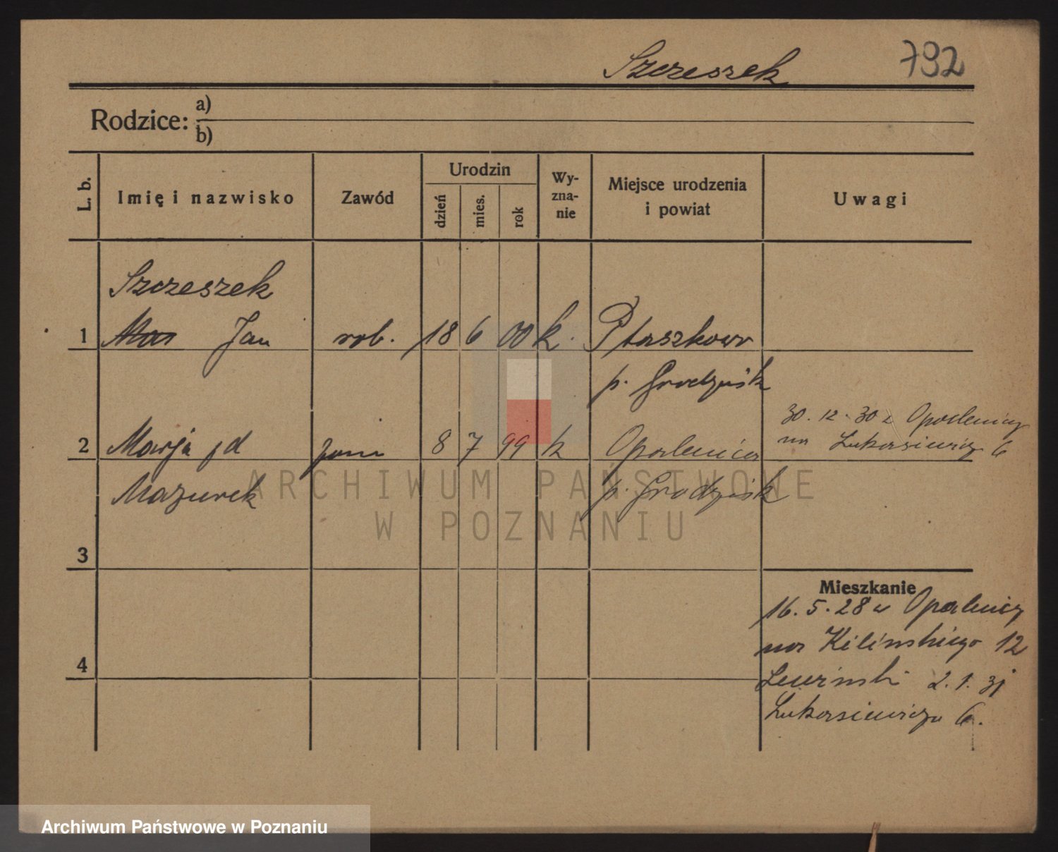 Podgląd karty osobowej dostępny jest po kliknięciu na nazwisko lub ikonkę karty. Można dokonywać powiększenia (ikony na górze) lub przechodzić między kolejnymi skanami (strzałki po bokach).