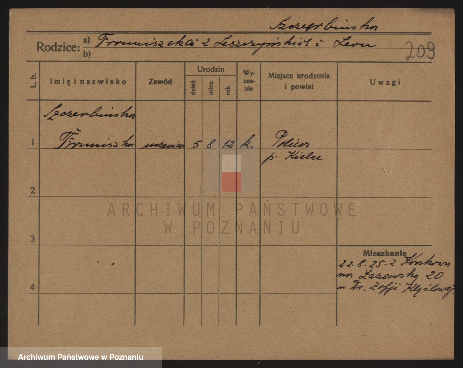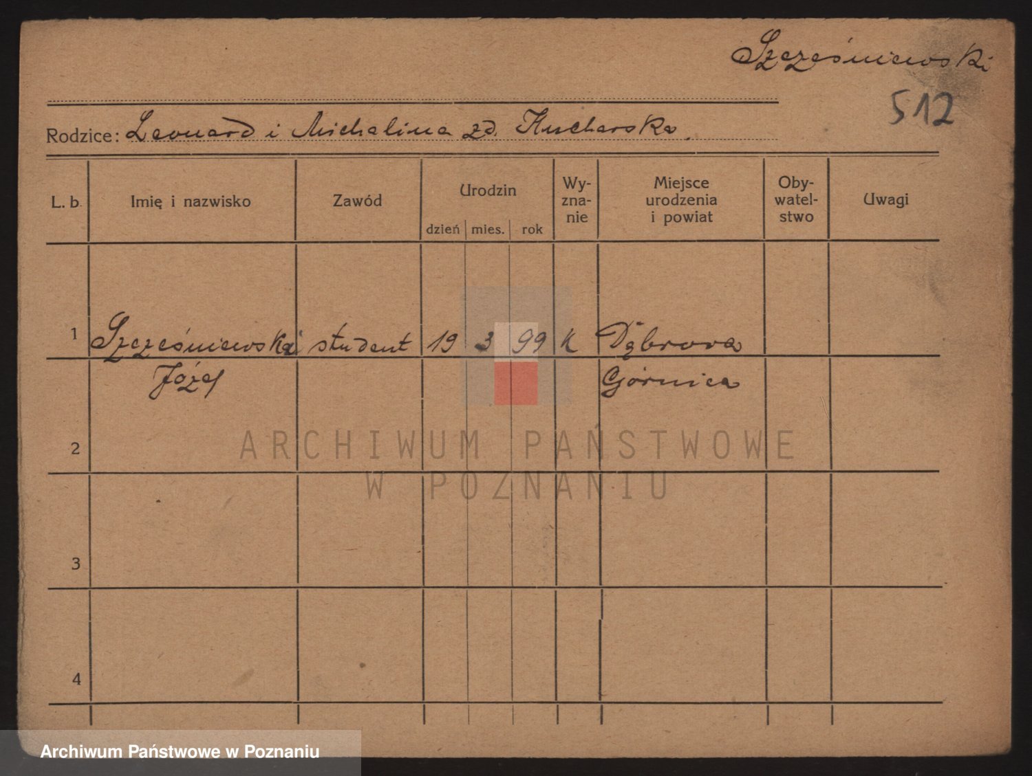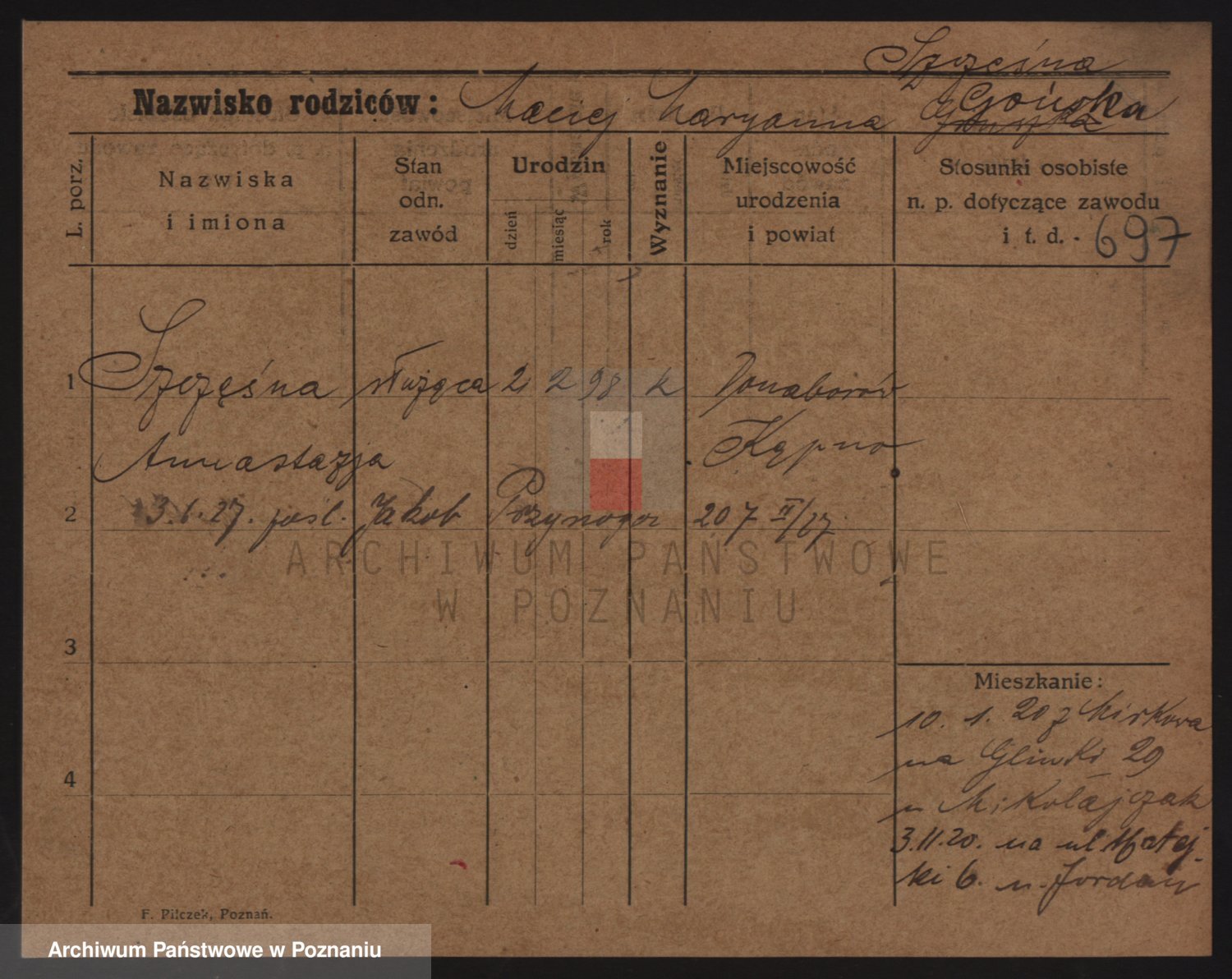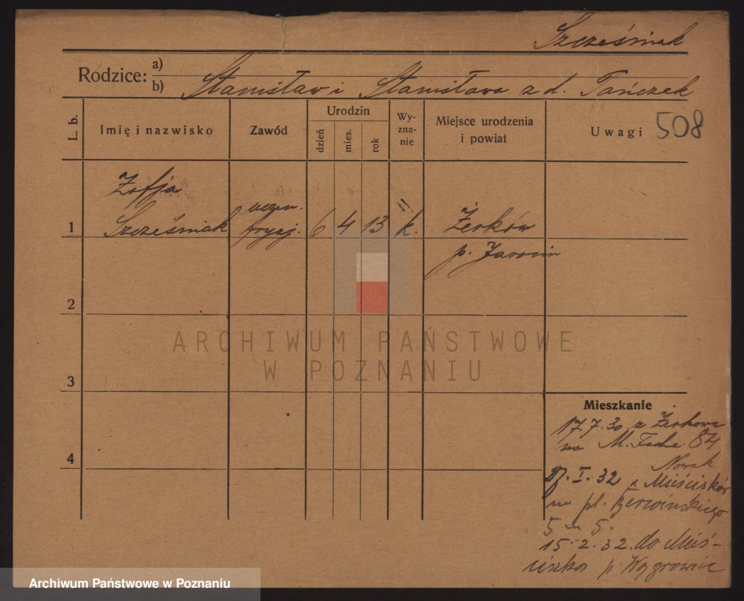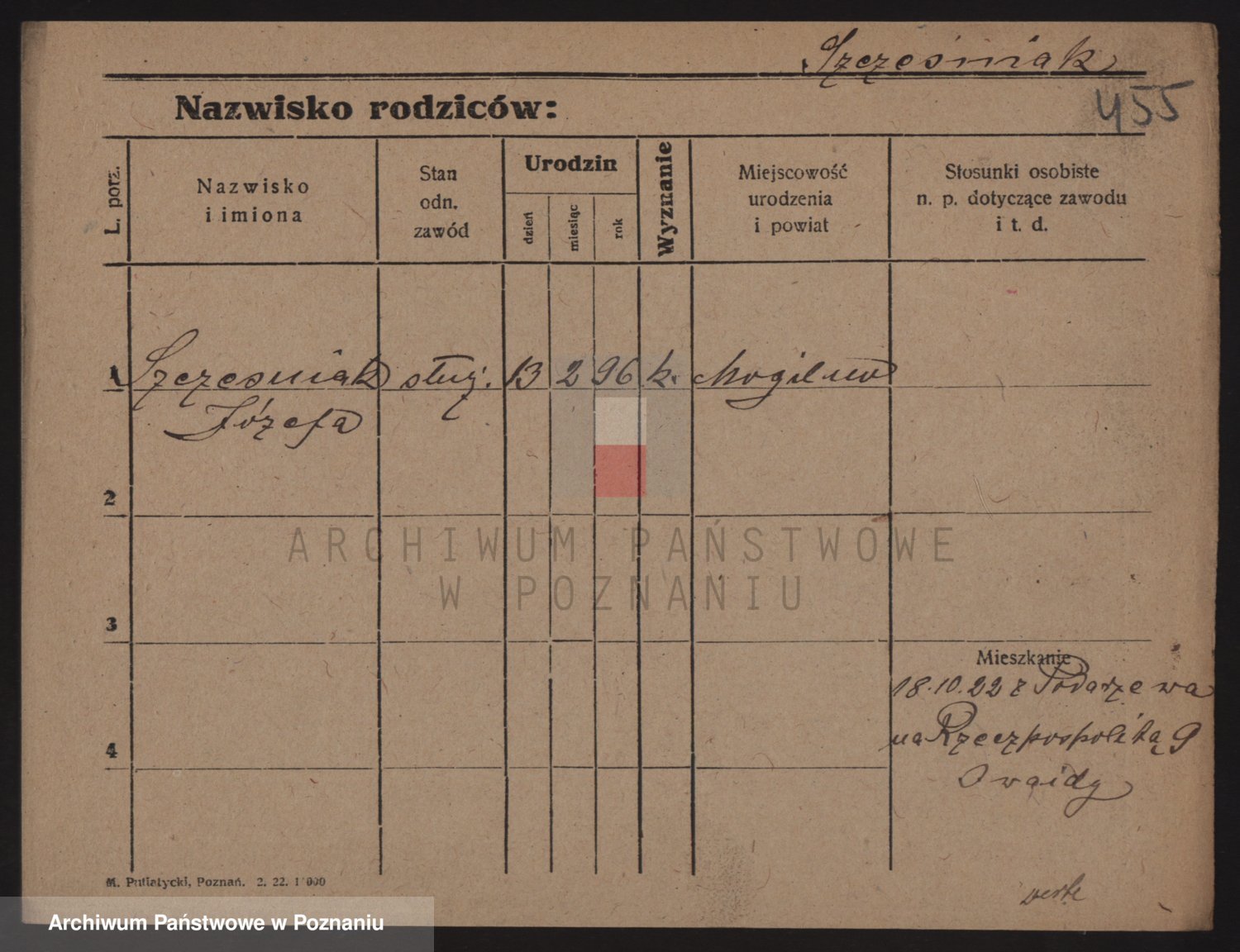 Podgląd karty osobowej dostępny jest po kliknięciu na nazwisko lub ikonkę karty. Można dokonywać powiększenia (ikony na górze) lub przechodzić między kolejnymi skanami (strzałki po bokach).