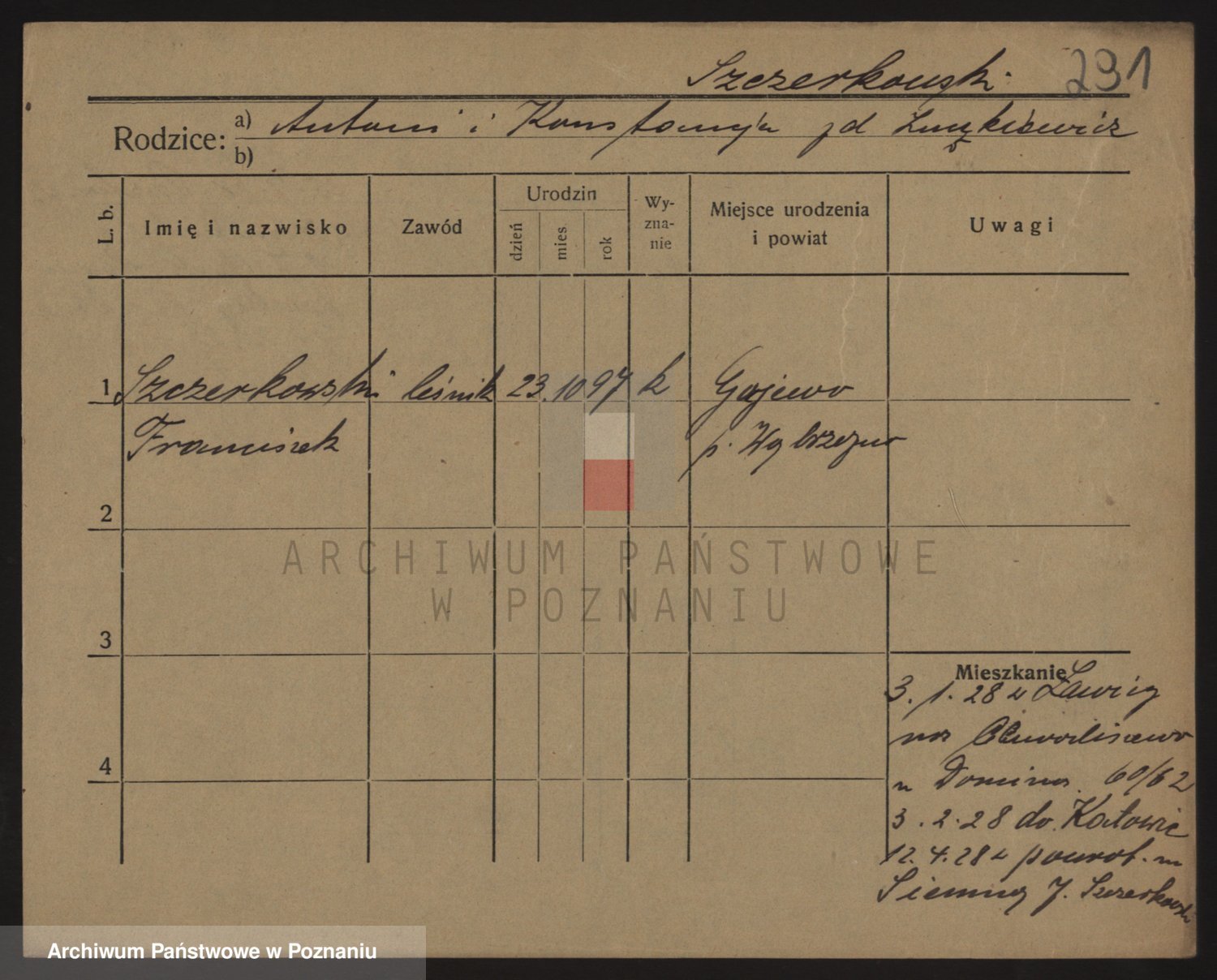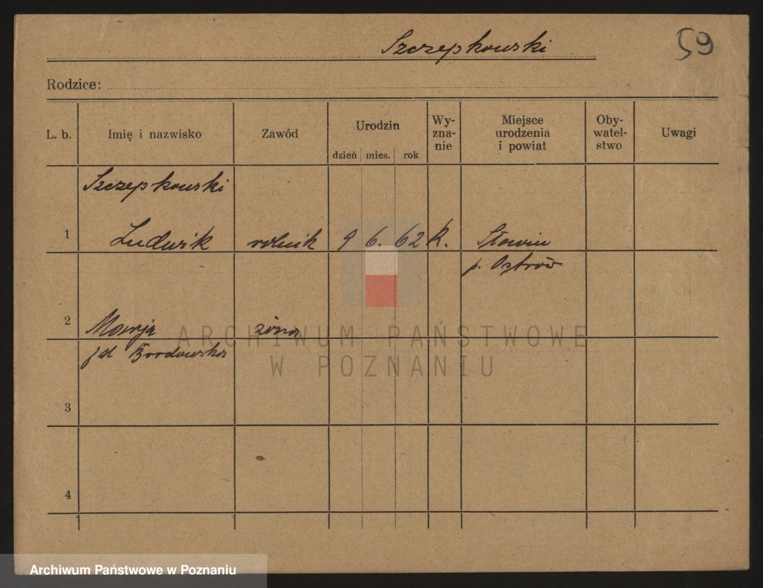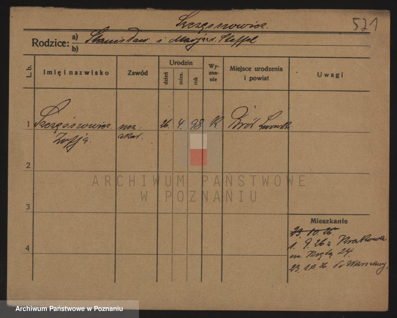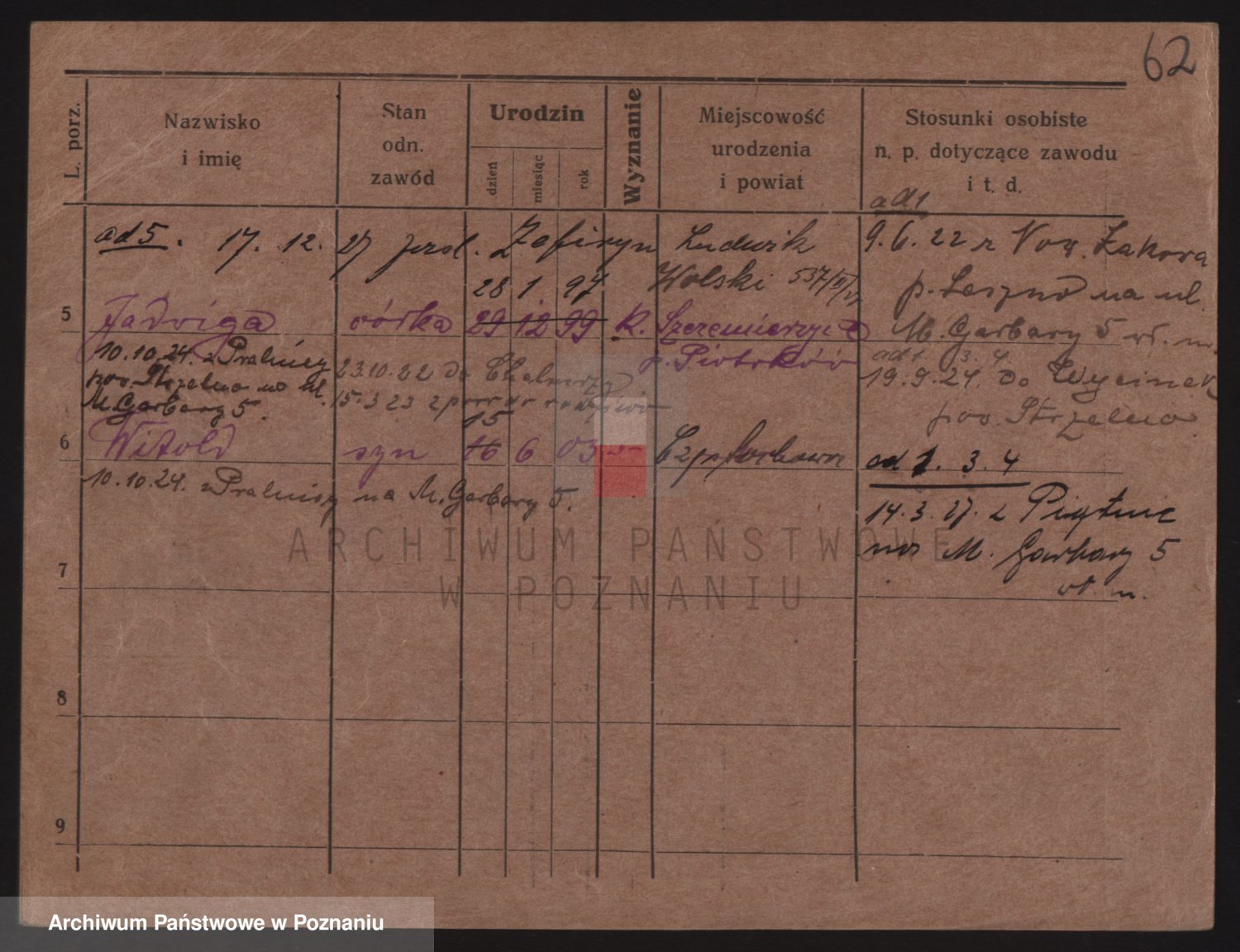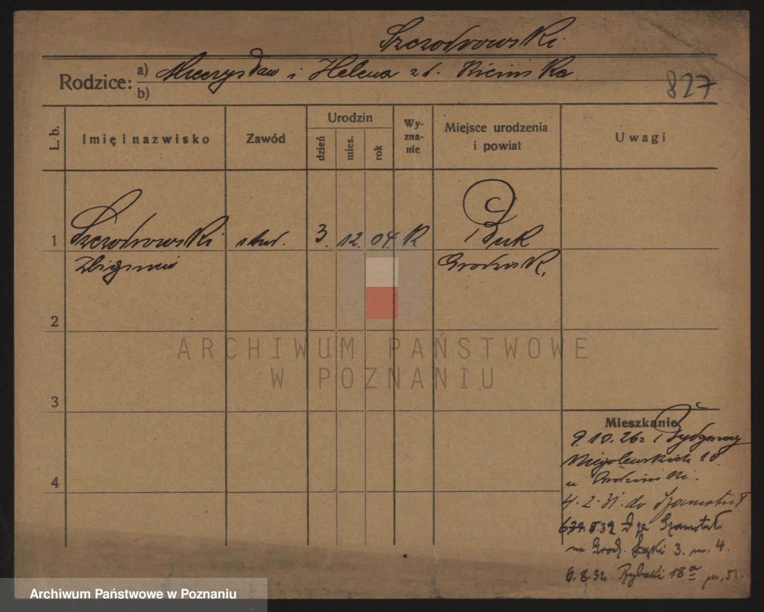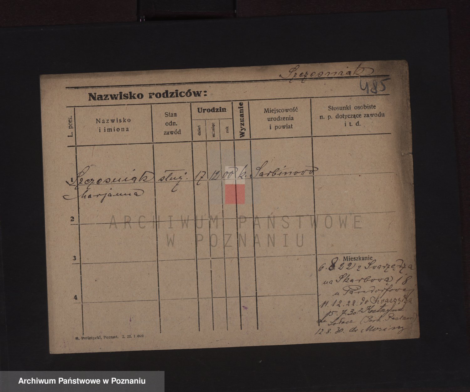 Podgląd karty osobowej dostępny jest po kliknięciu na nazwisko lub ikonkę karty. Można dokonywać powiększenia (ikony na górze) lub przechodzić między kolejnymi skanami (strzałki po bokach).