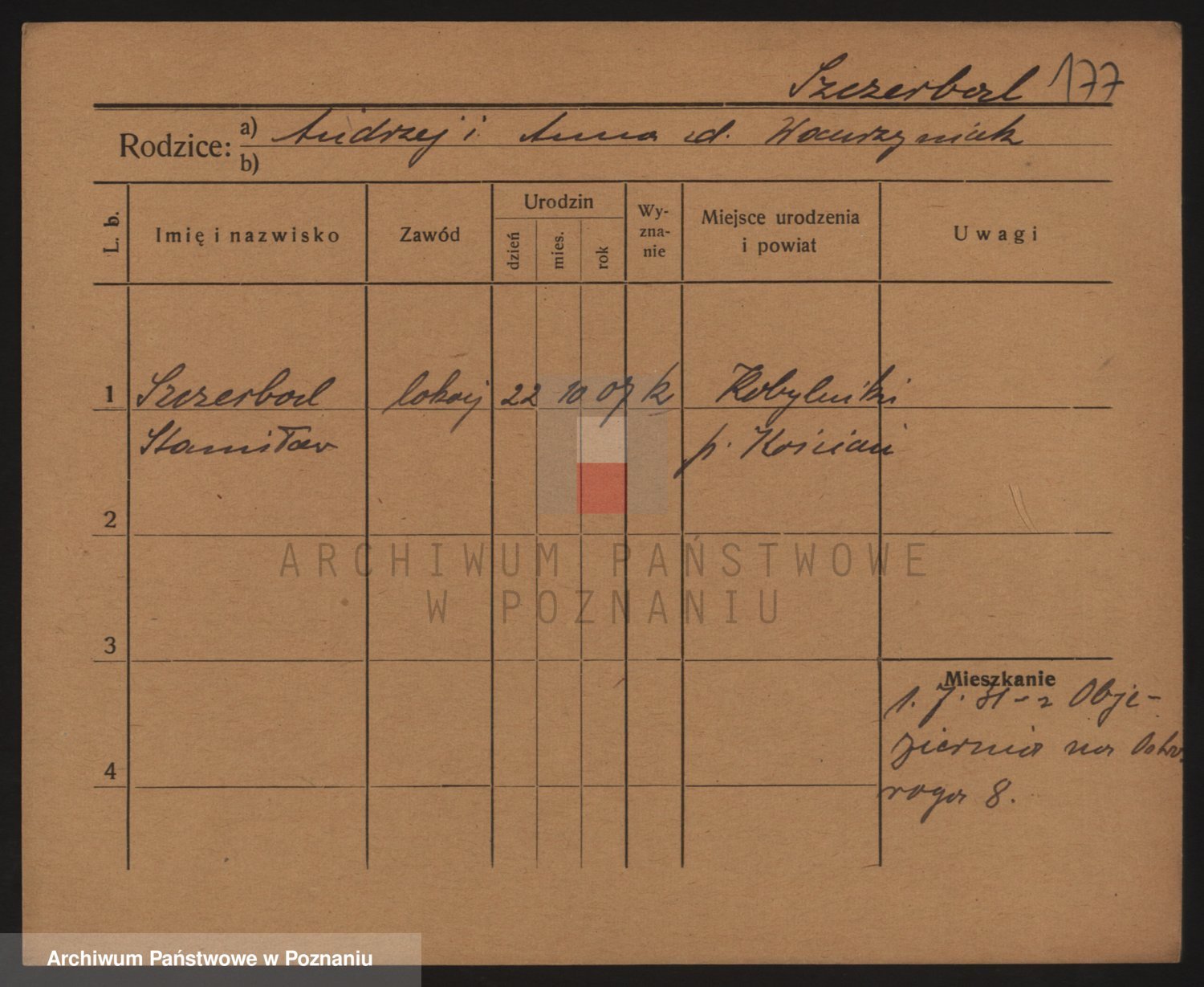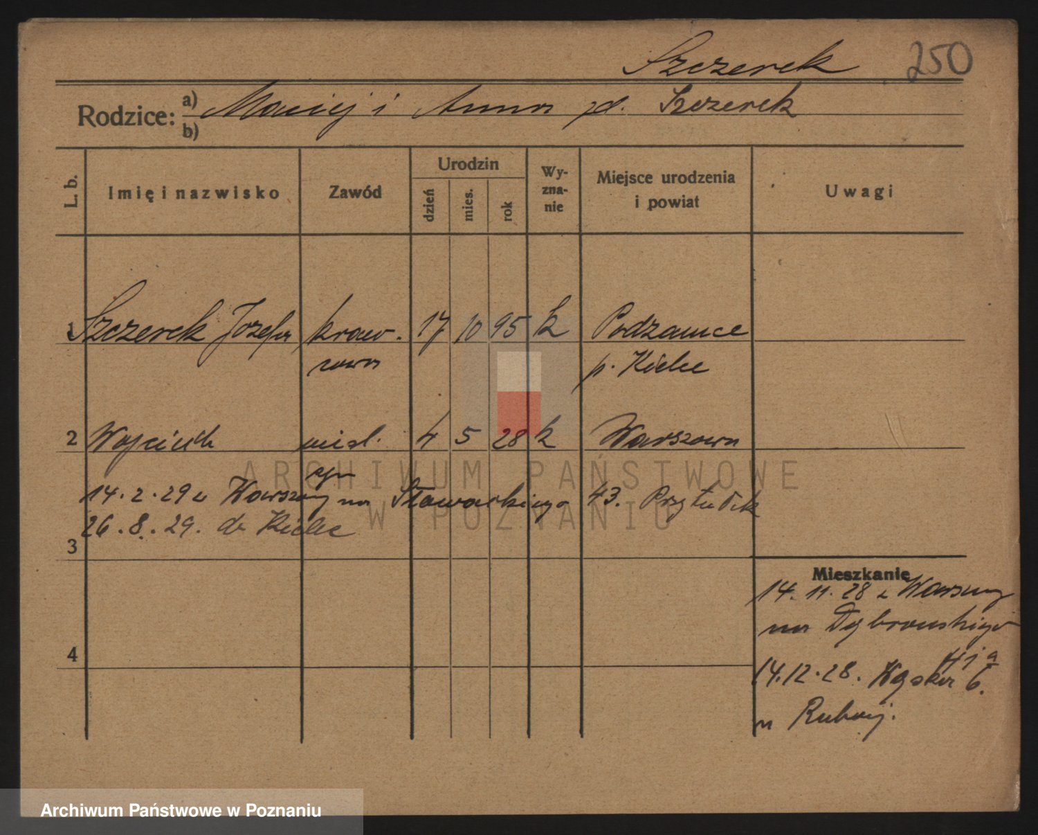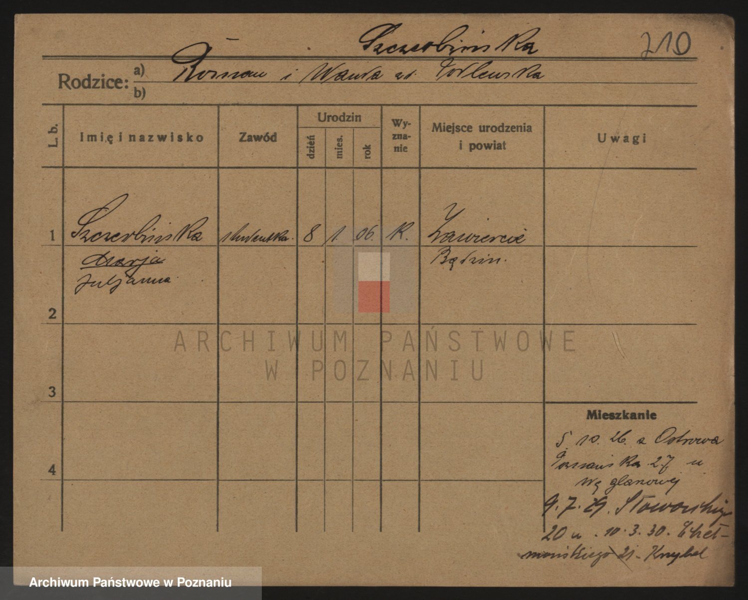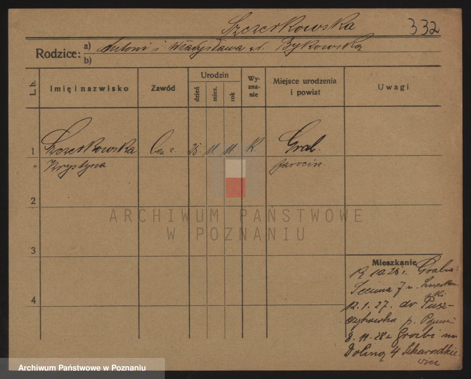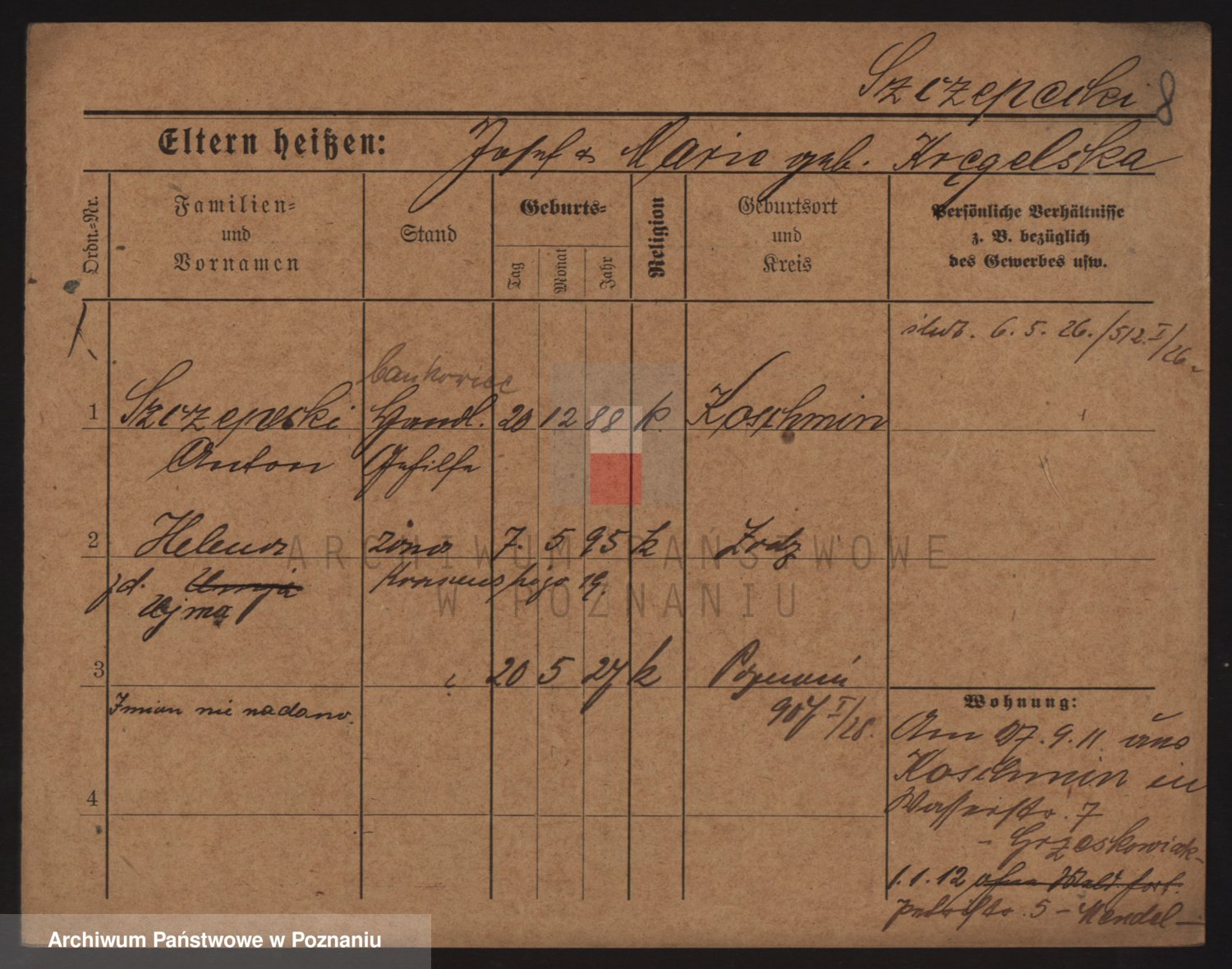 Podgląd karty osobowej dostępny jest po kliknięciu na nazwisko lub ikonkę karty. Można dokonywać powiększenia (ikony na górze) lub przechodzić między kolejnymi skanami (strzałki po bokach).