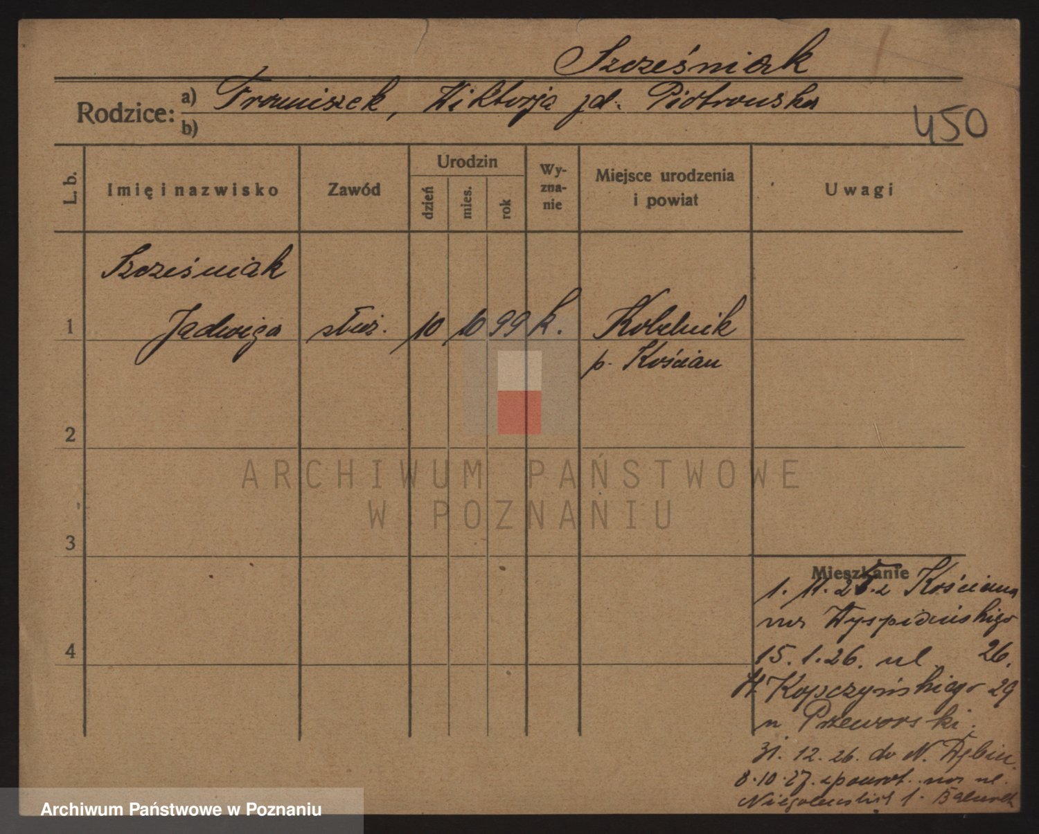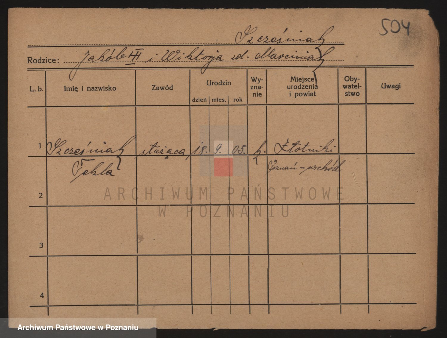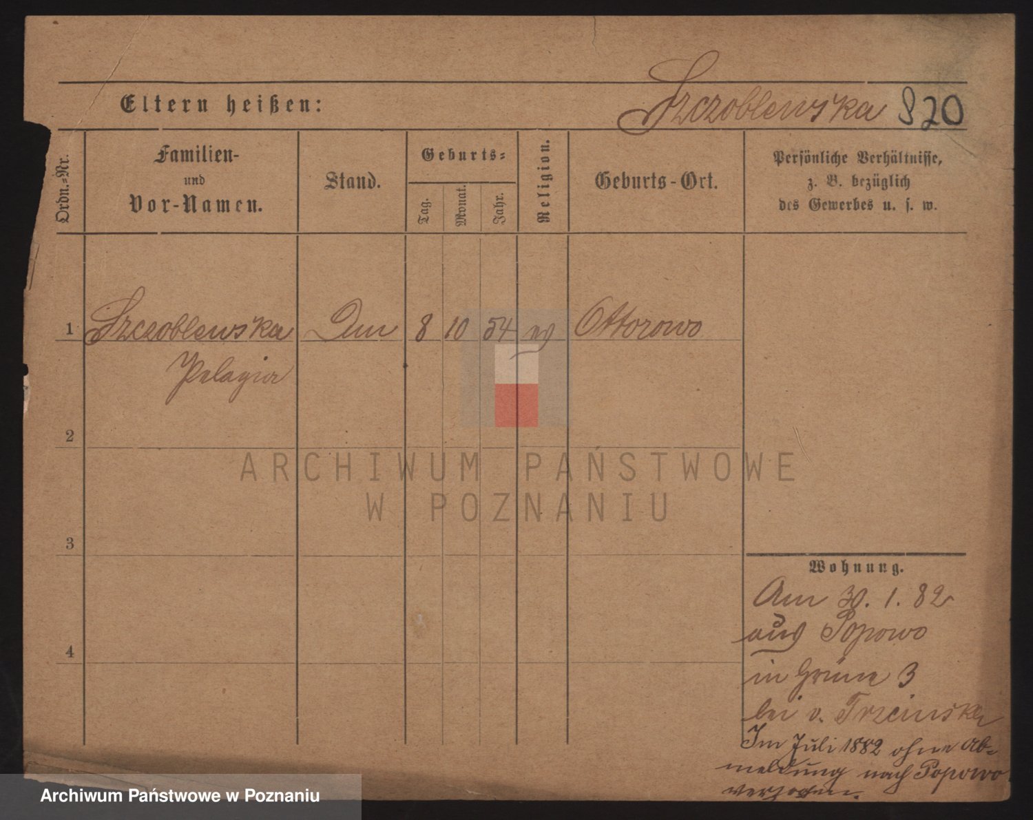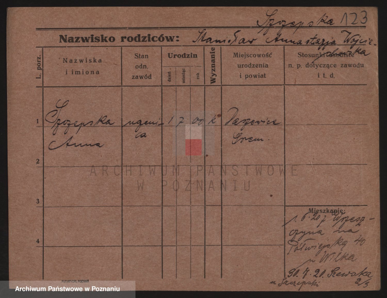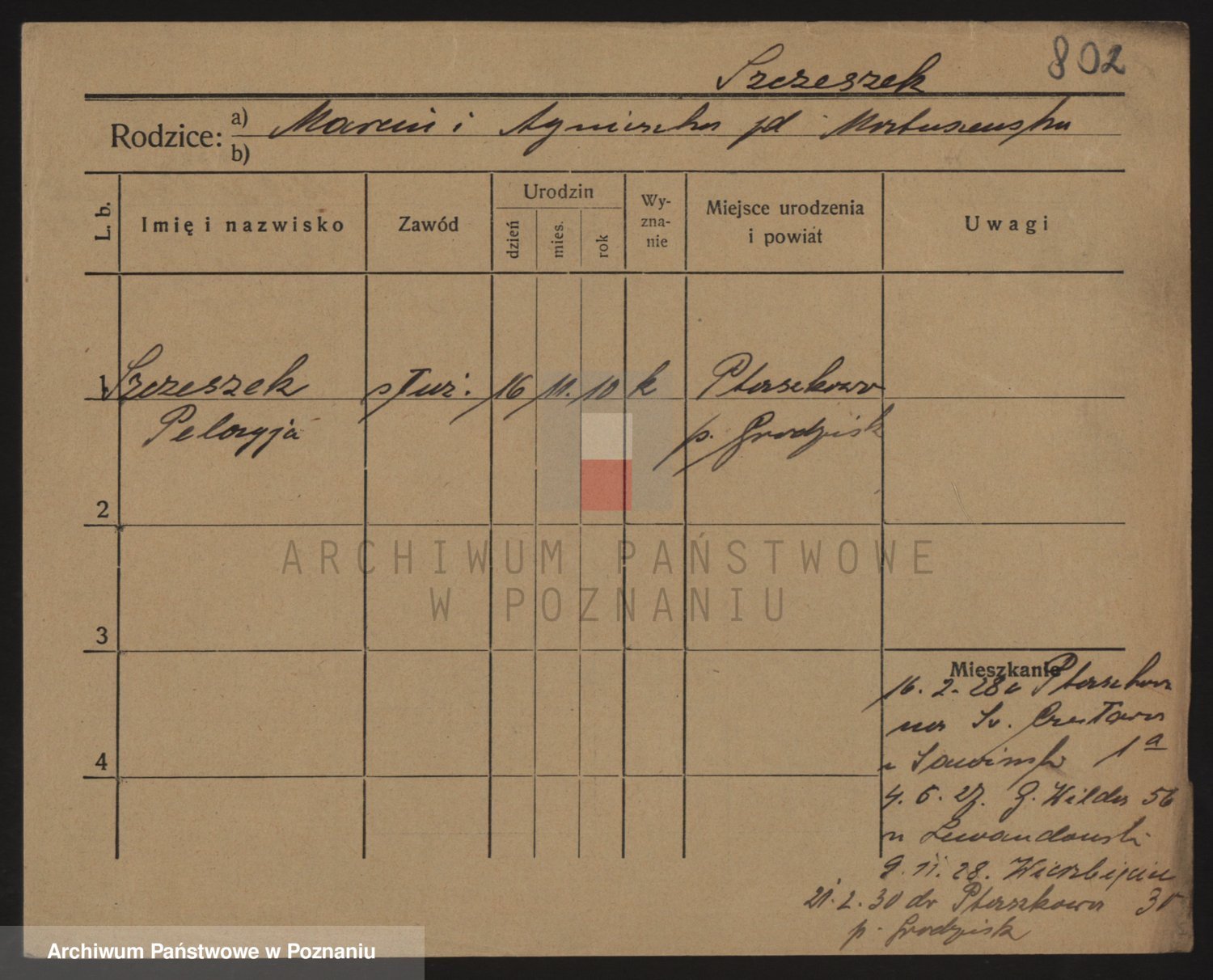 Podgląd karty osobowej dostępny jest po kliknięciu na nazwisko lub ikonkę karty. Można dokonywać powiększenia (ikony na górze) lub przechodzić między kolejnymi skanami (strzałki po bokach).