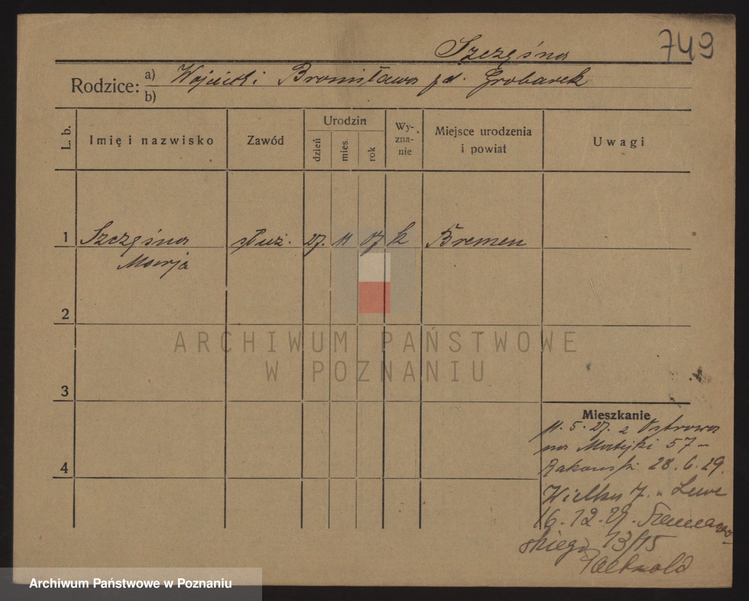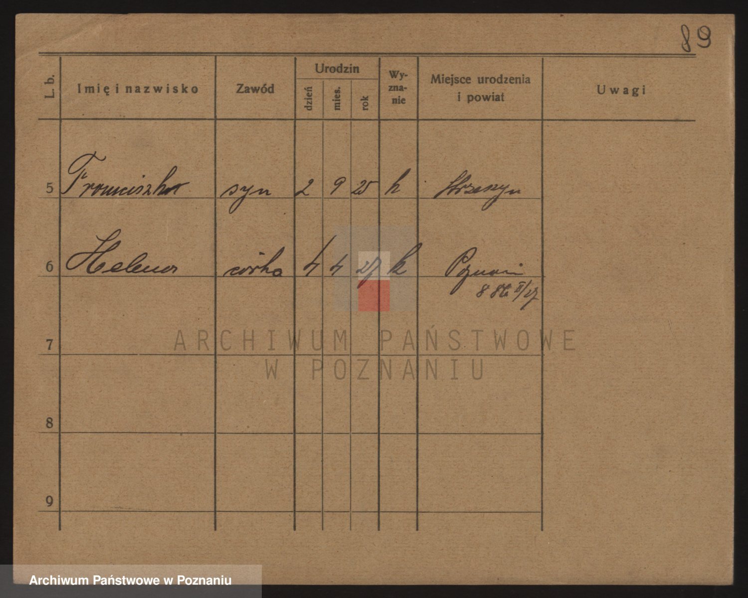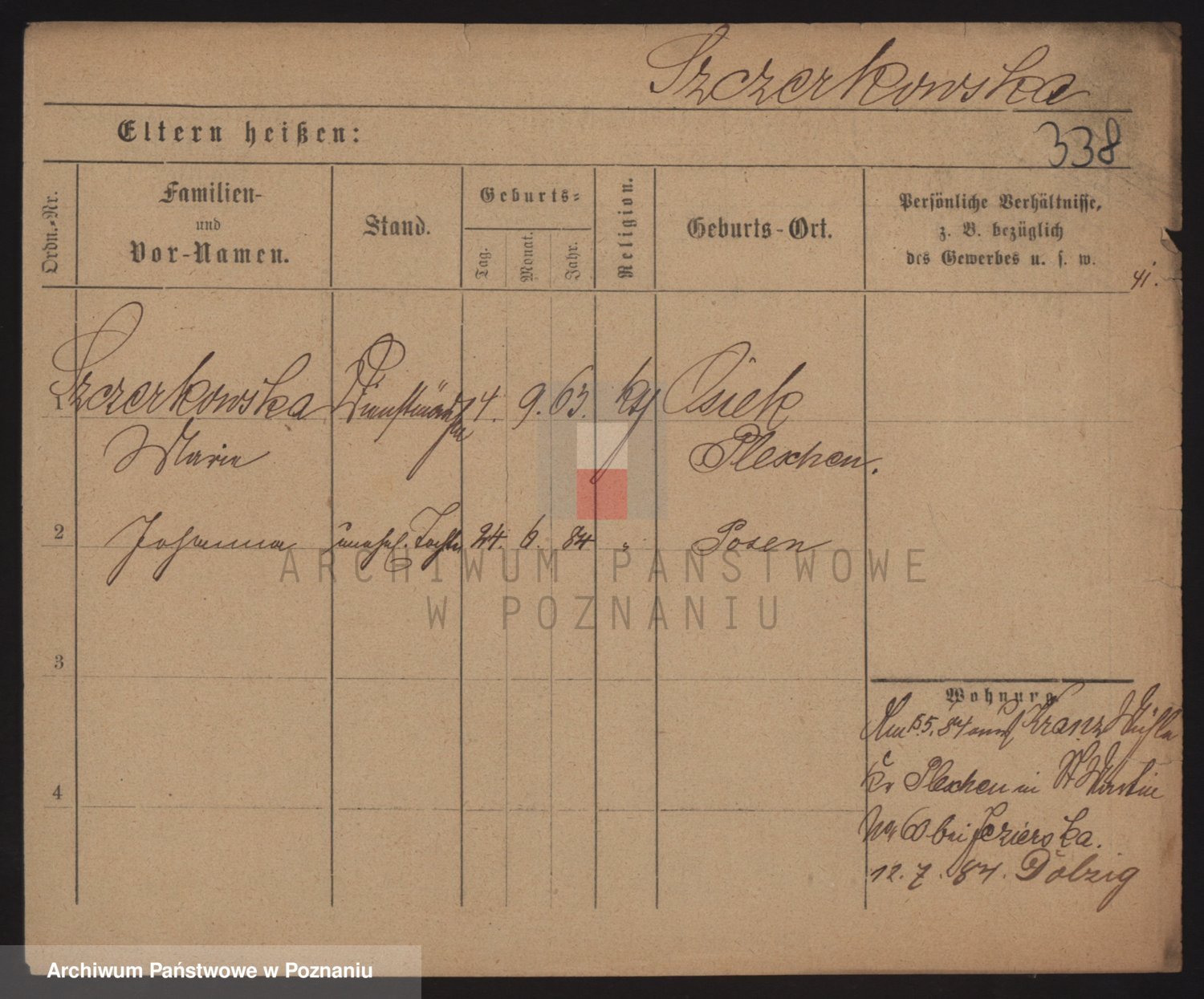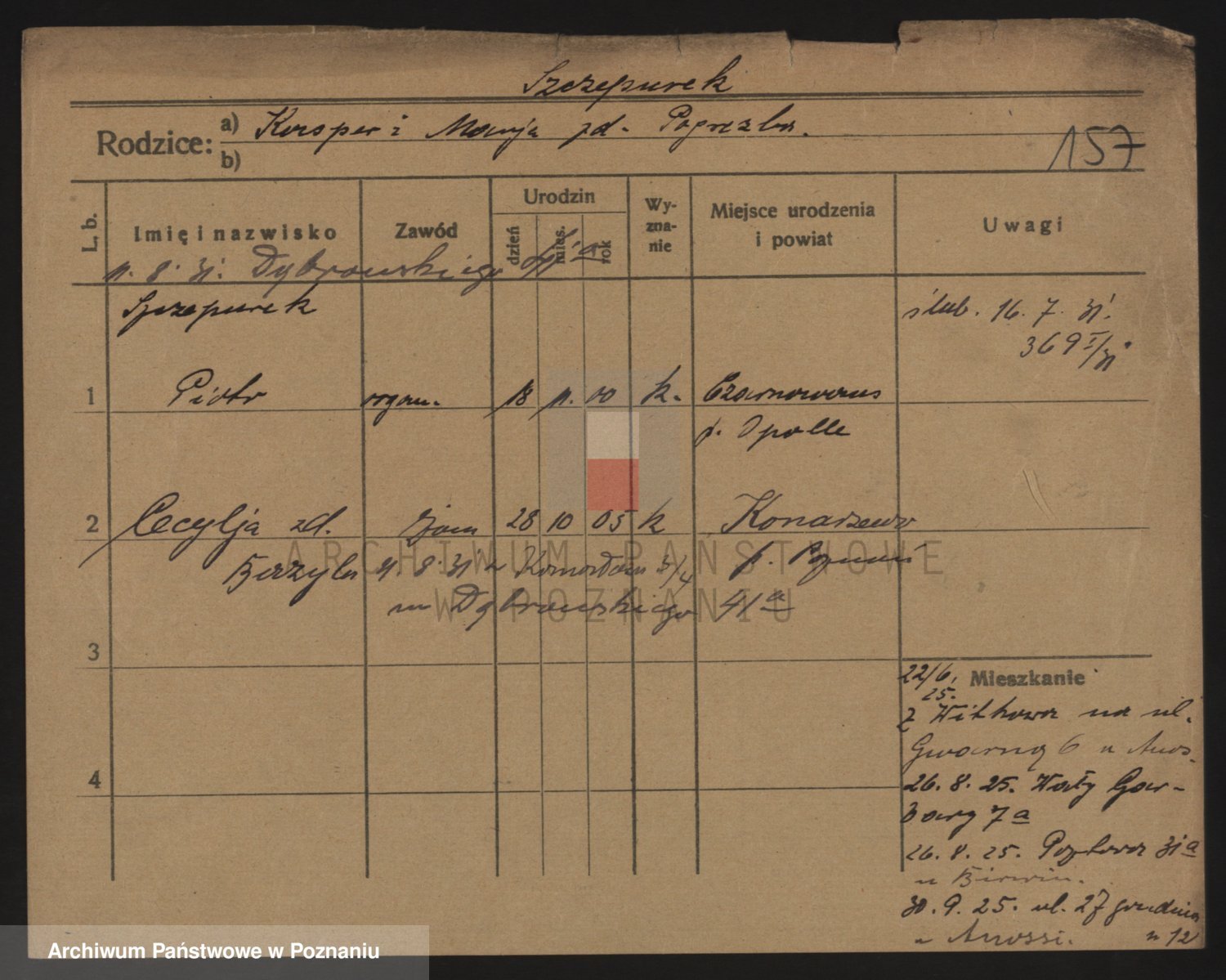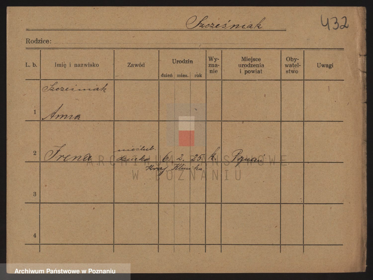 Podgląd karty osobowej dostępny jest po kliknięciu na nazwisko lub ikonkę karty. Można dokonywać powiększenia (ikony na górze) lub przechodzić między kolejnymi skanami (strzałki po bokach).