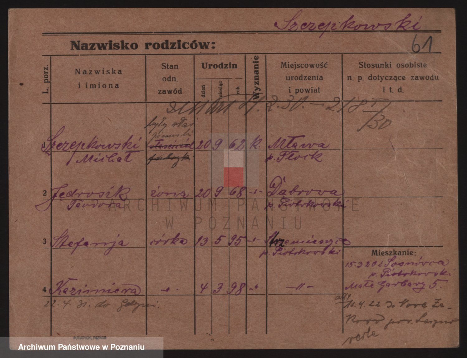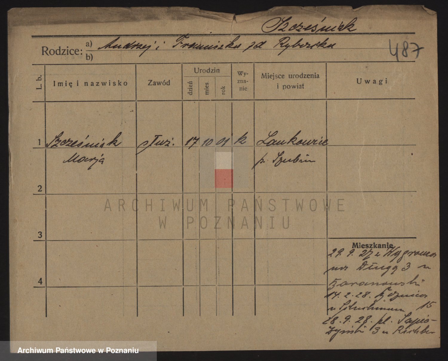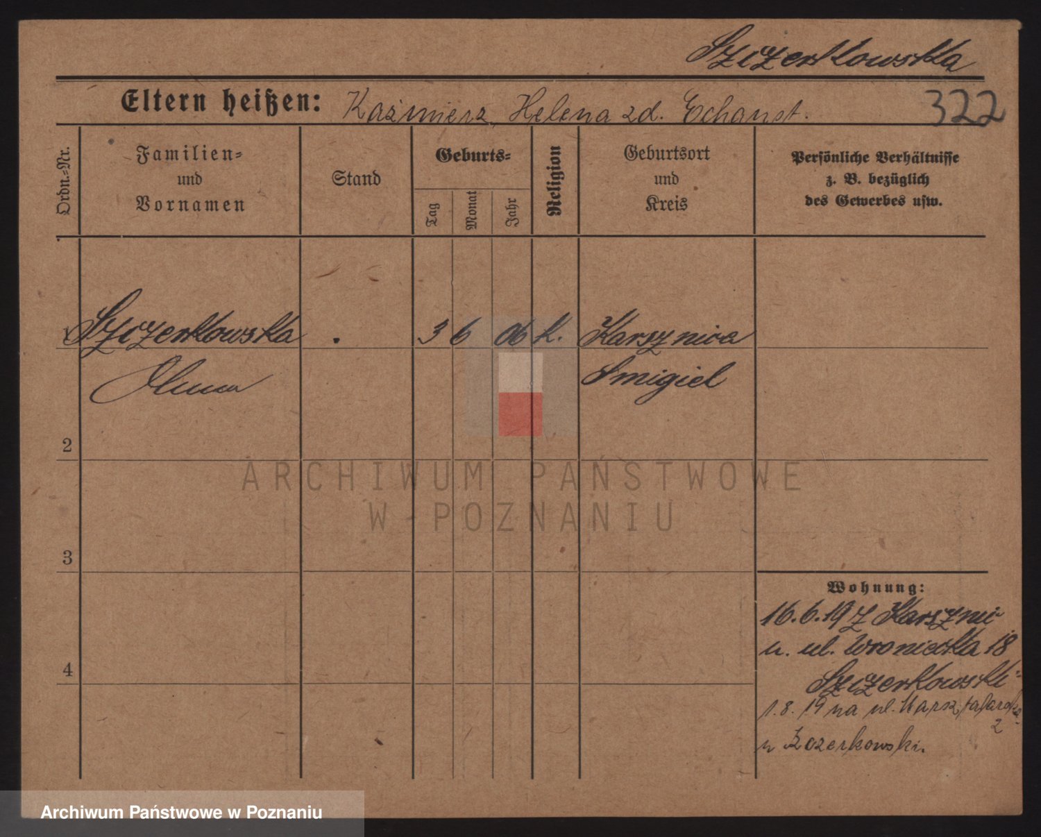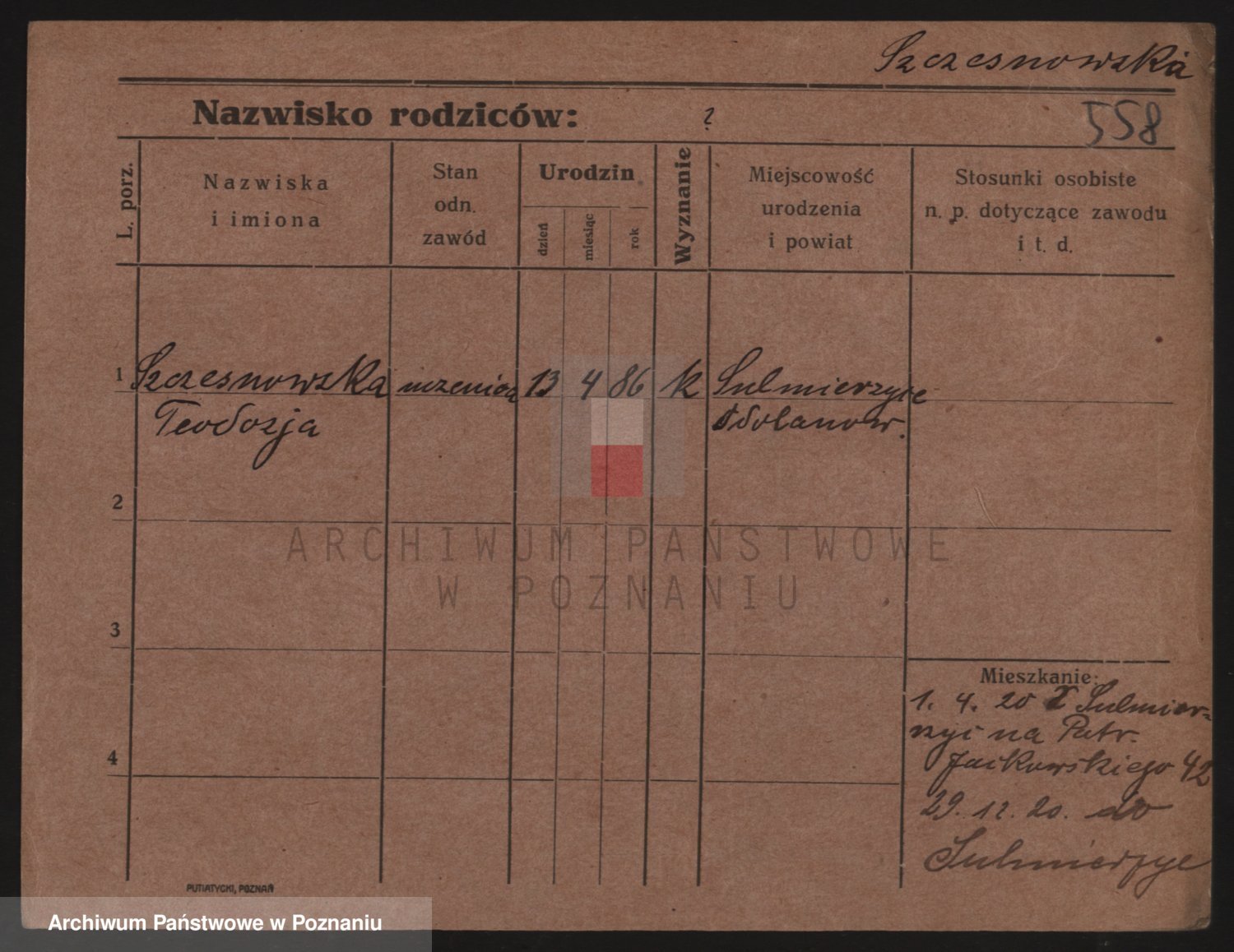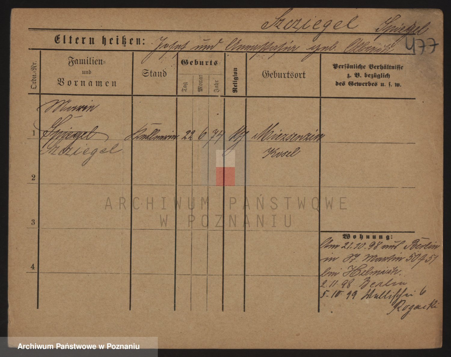 Podgląd karty osobowej dostępny jest po kliknięciu na nazwisko lub ikonkę karty. Można dokonywać powiększenia (ikony na górze) lub przechodzić między kolejnymi skanami (strzałki po bokach).