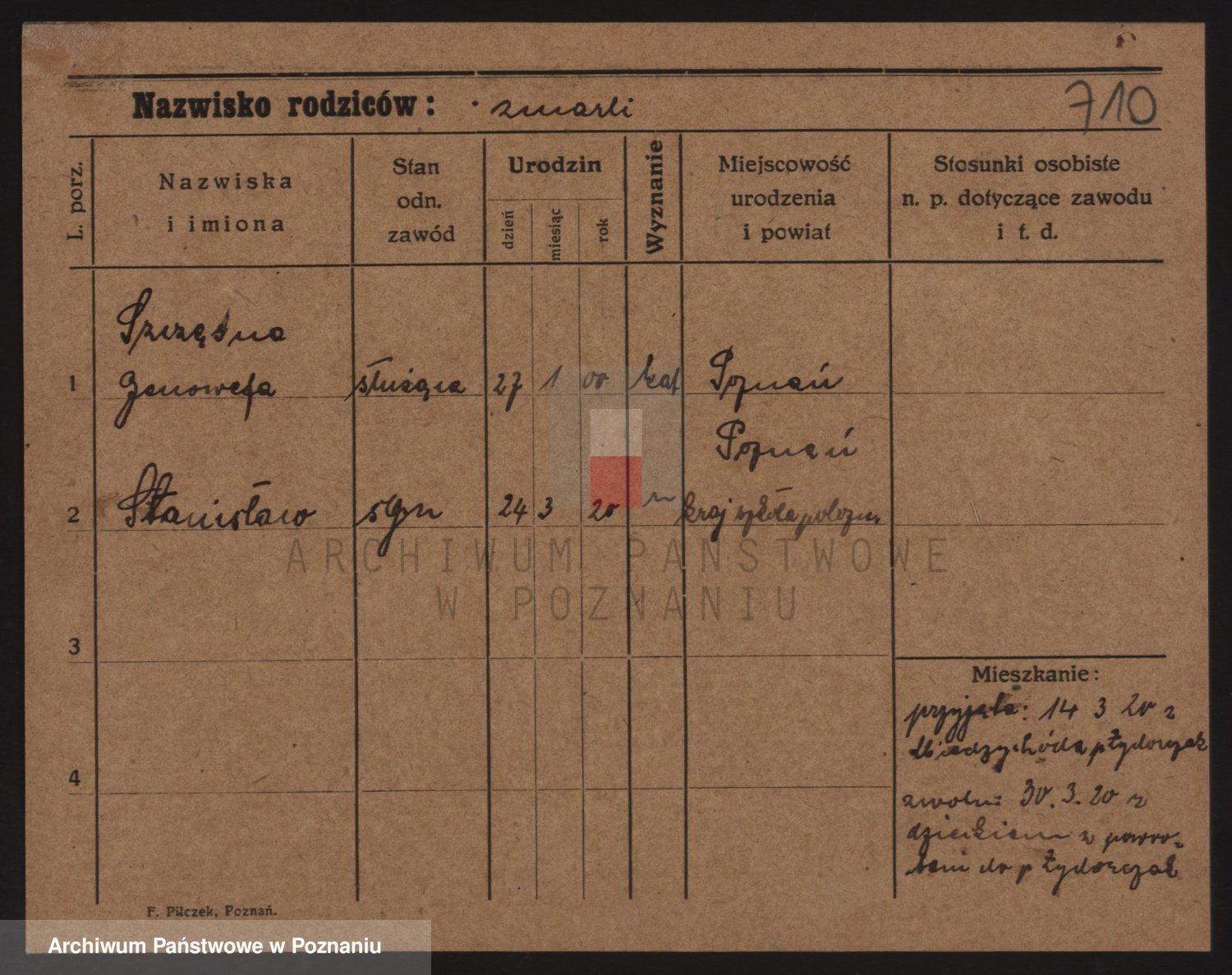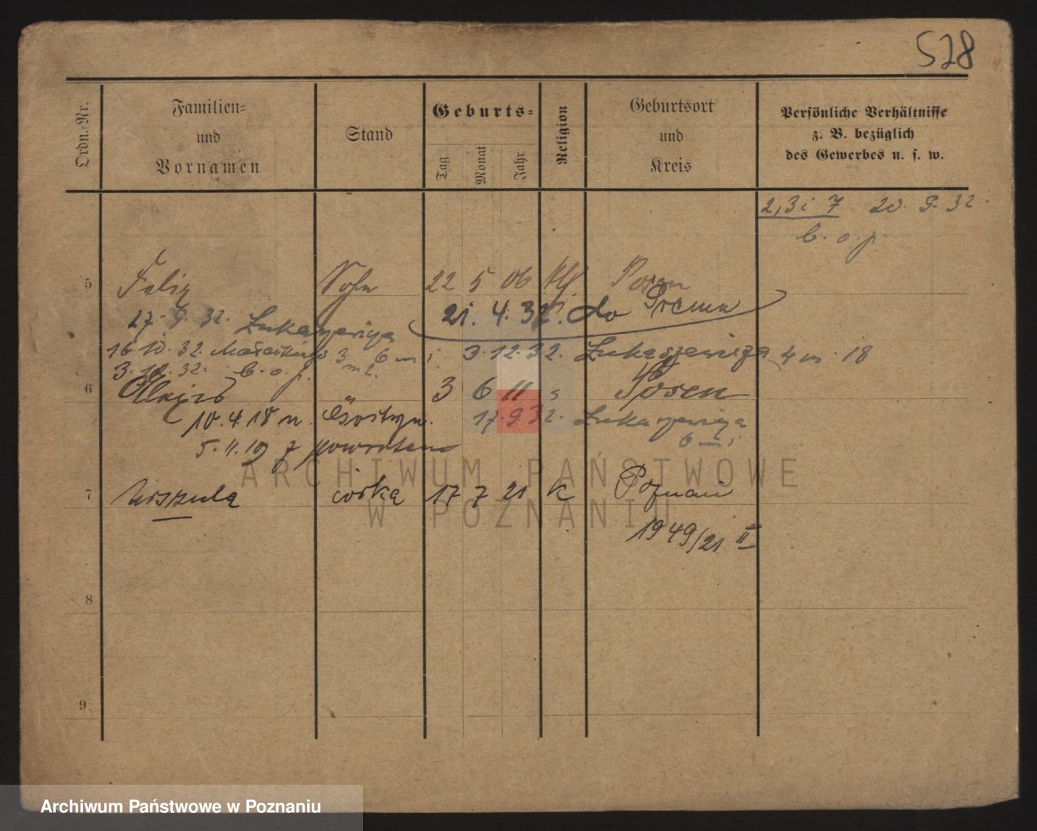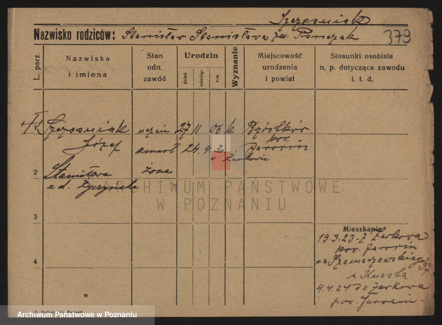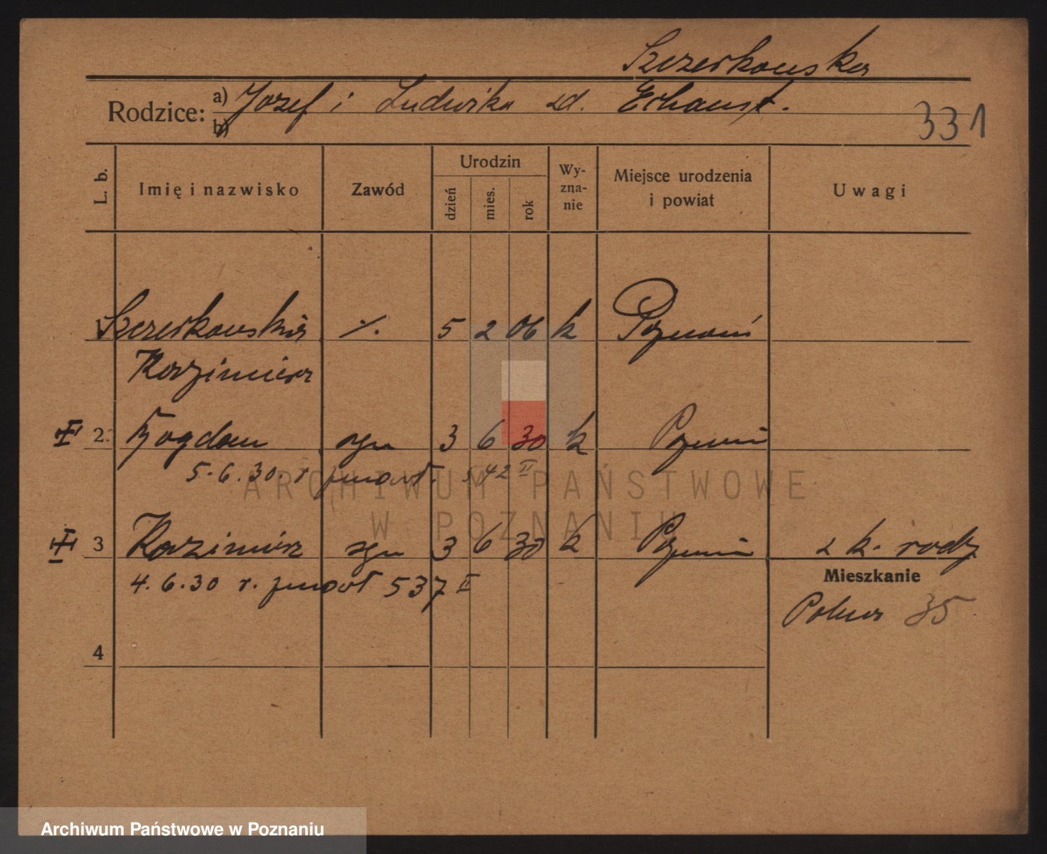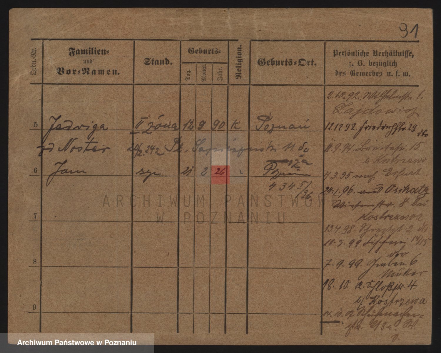 Podgląd karty osobowej dostępny jest po kliknięciu na nazwisko lub ikonkę karty. Można dokonywać powiększenia (ikony na górze) lub przechodzić między kolejnymi skanami (strzałki po bokach).