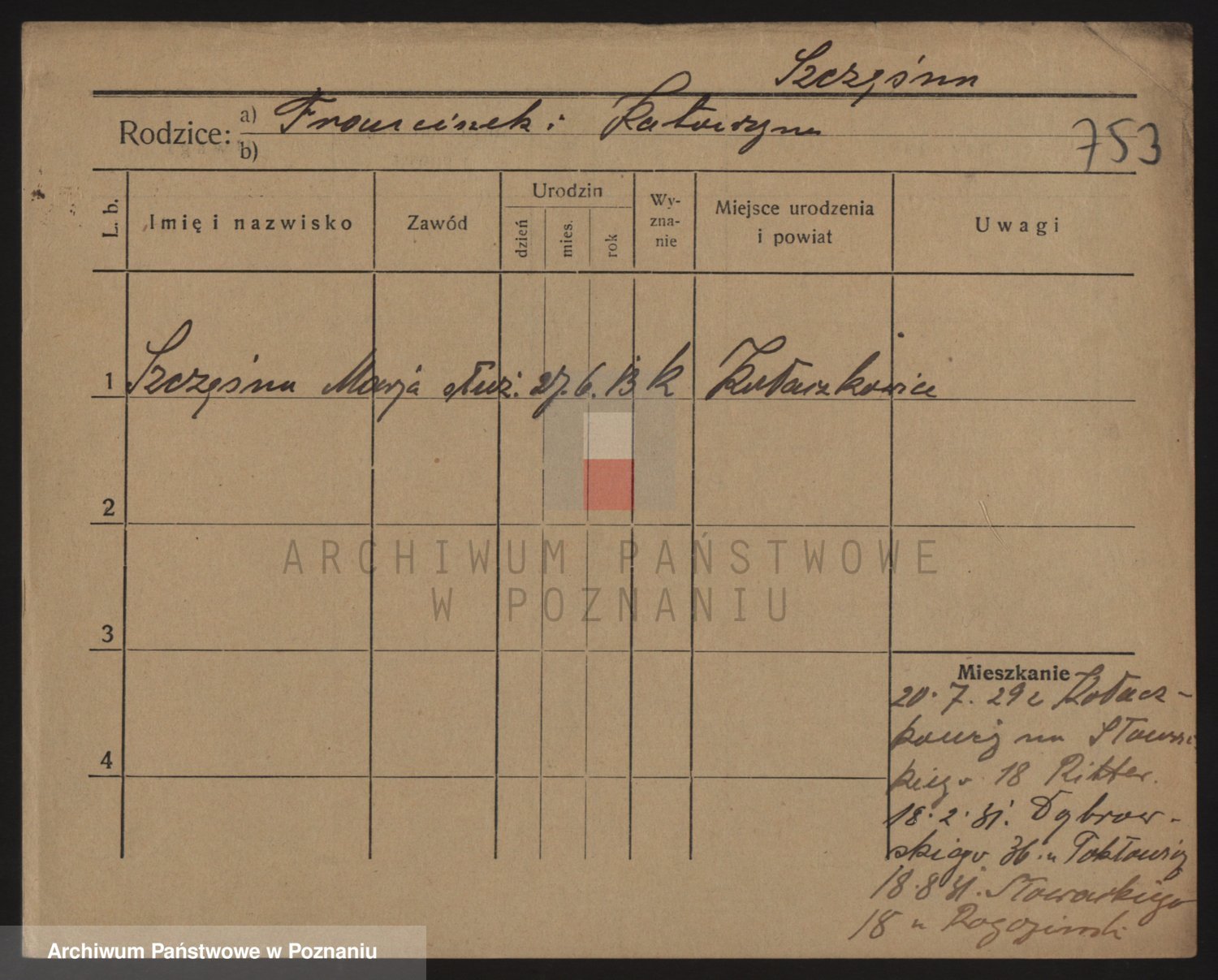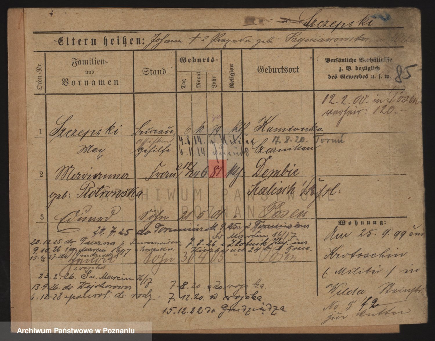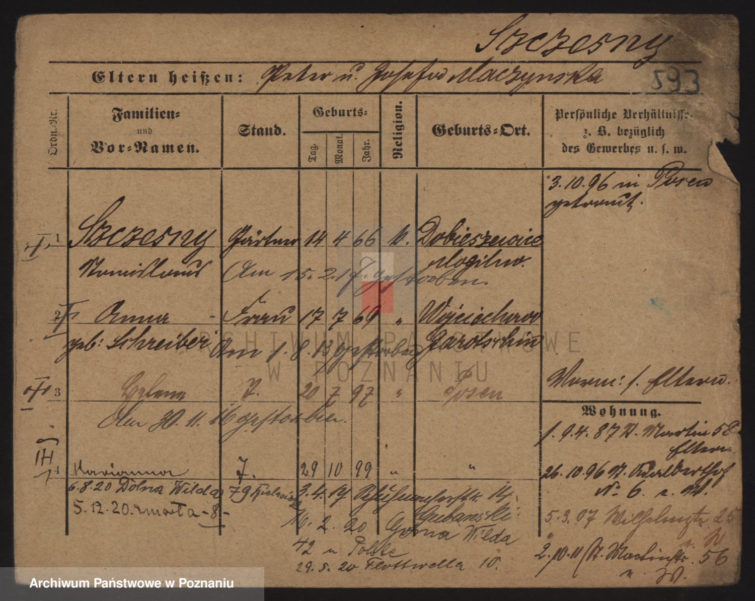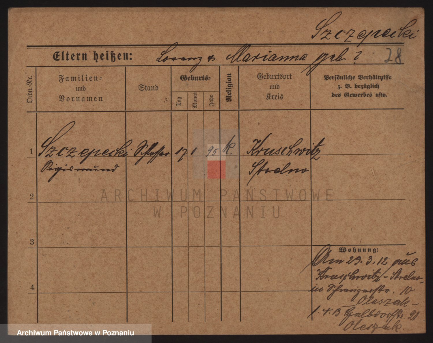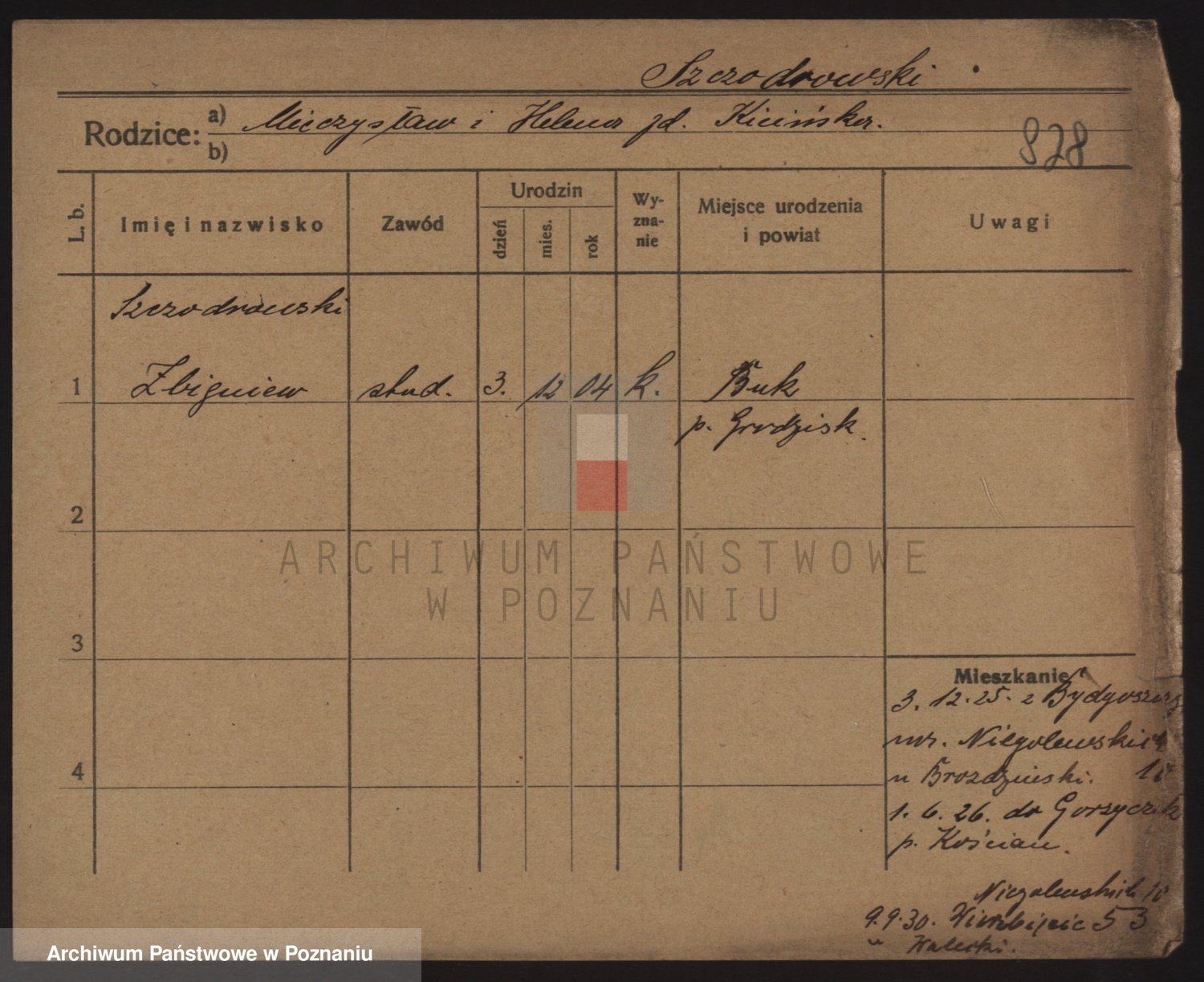 Podgląd karty osobowej dostępny jest po kliknięciu na nazwisko lub ikonkę karty. Można dokonywać powiększenia (ikony na górze) lub przechodzić między kolejnymi skanami (strzałki po bokach).