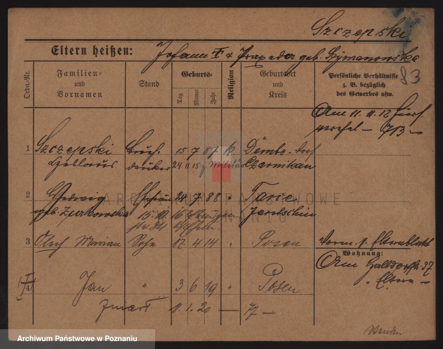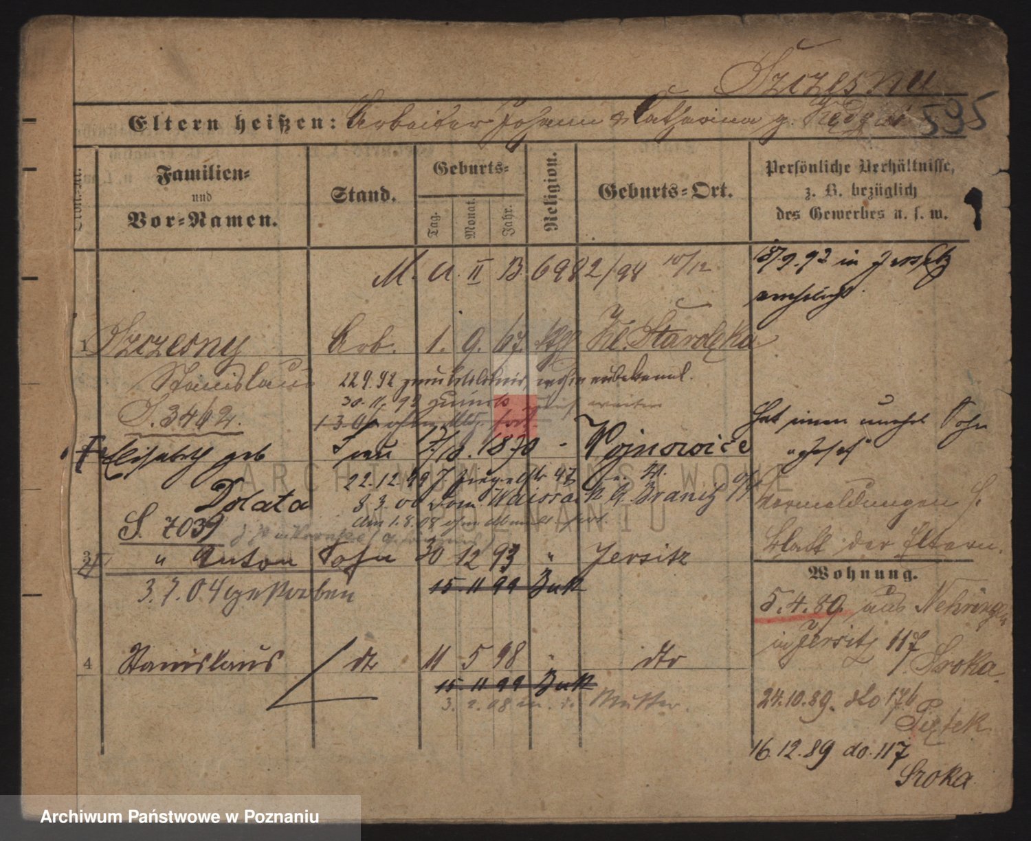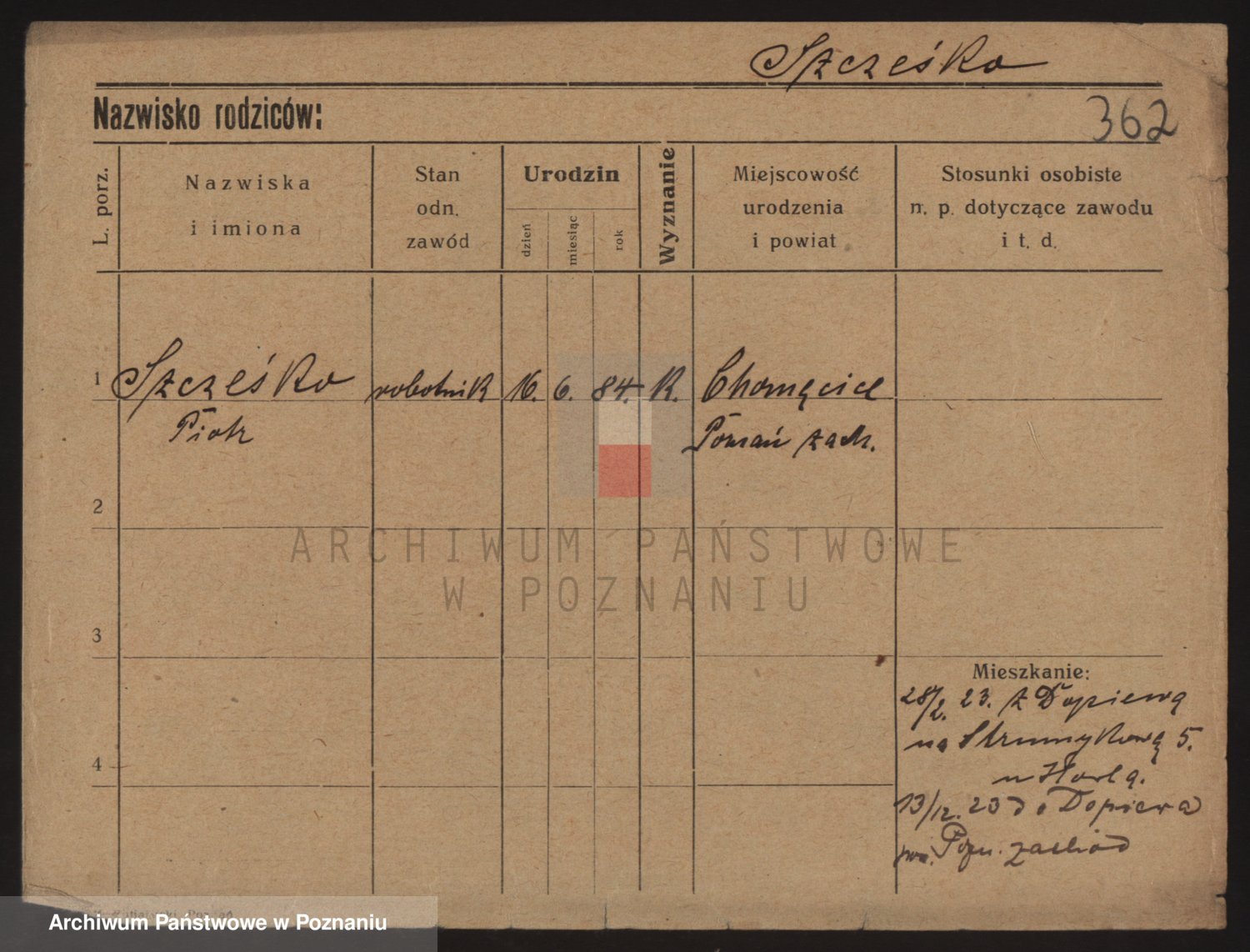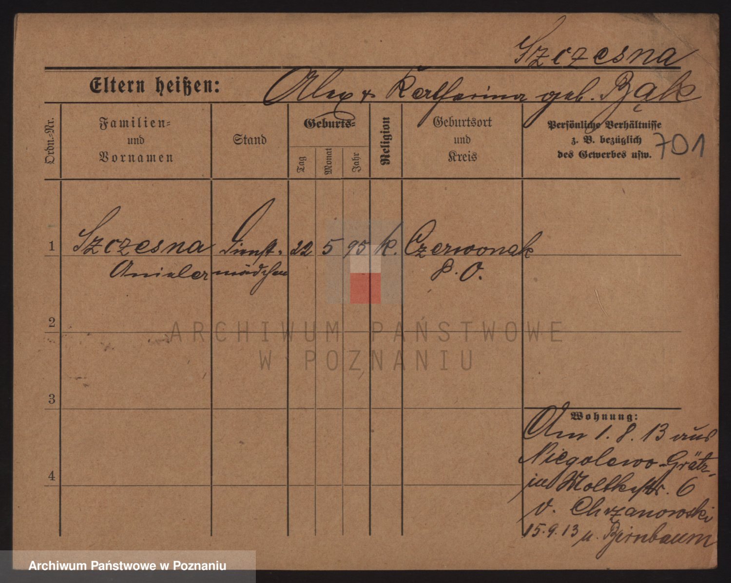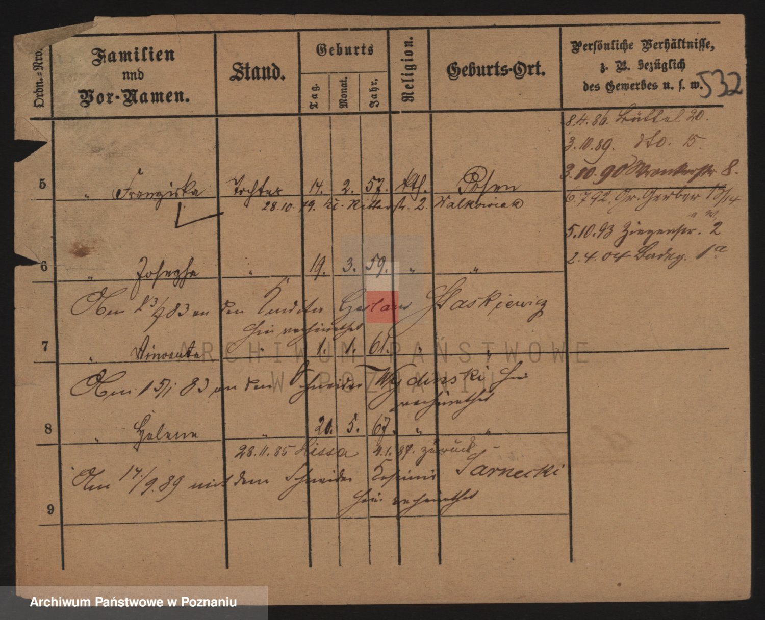 Podgląd karty osobowej dostępny jest po kliknięciu na nazwisko lub ikonkę karty. Można dokonywać powiększenia (ikony na górze) lub przechodzić między kolejnymi skanami (strzałki po bokach).