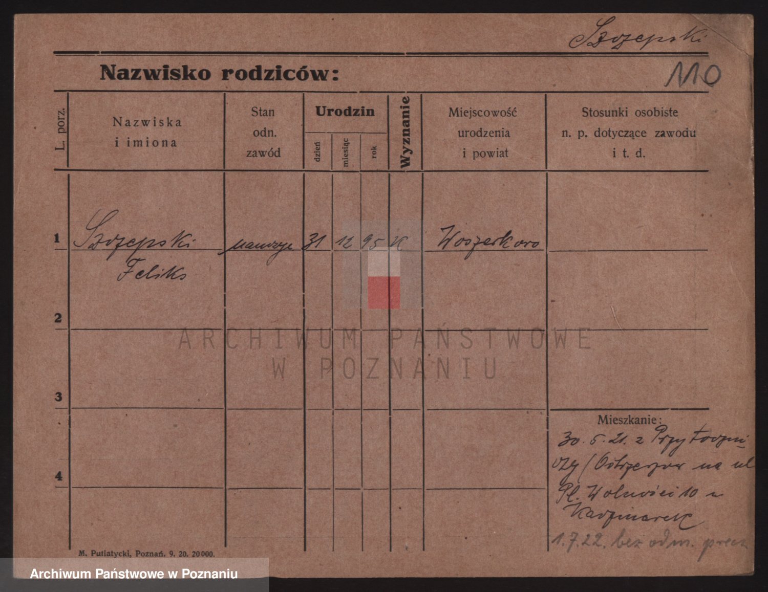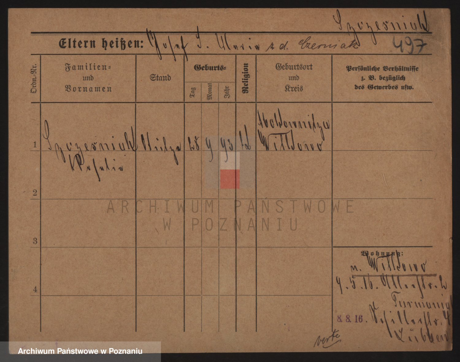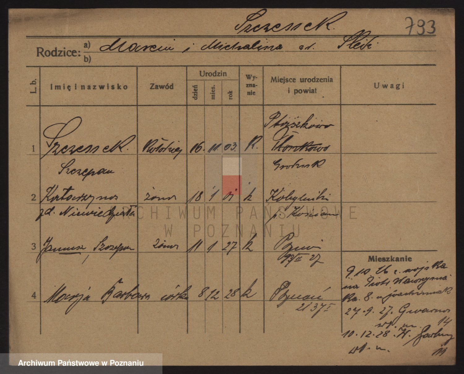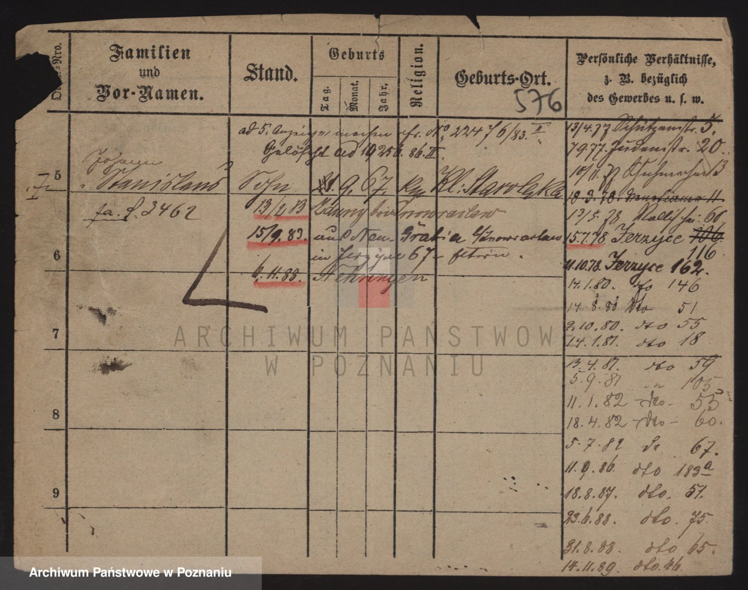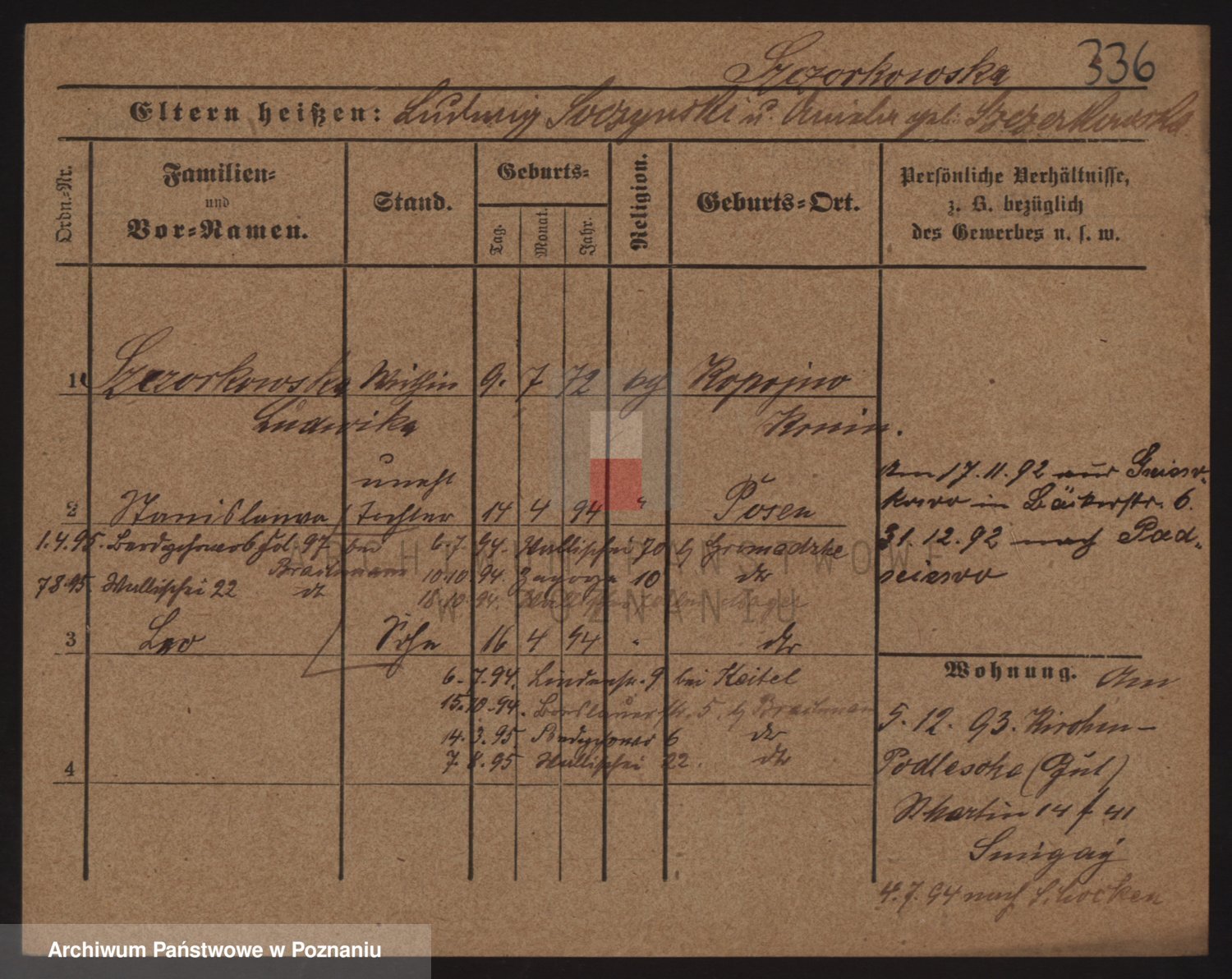 Podgląd karty osobowej dostępny jest po kliknięciu na nazwisko lub ikonkę karty. Można dokonywać powiększenia (ikony na górze) lub przechodzić między kolejnymi skanami (strzałki po bokach).