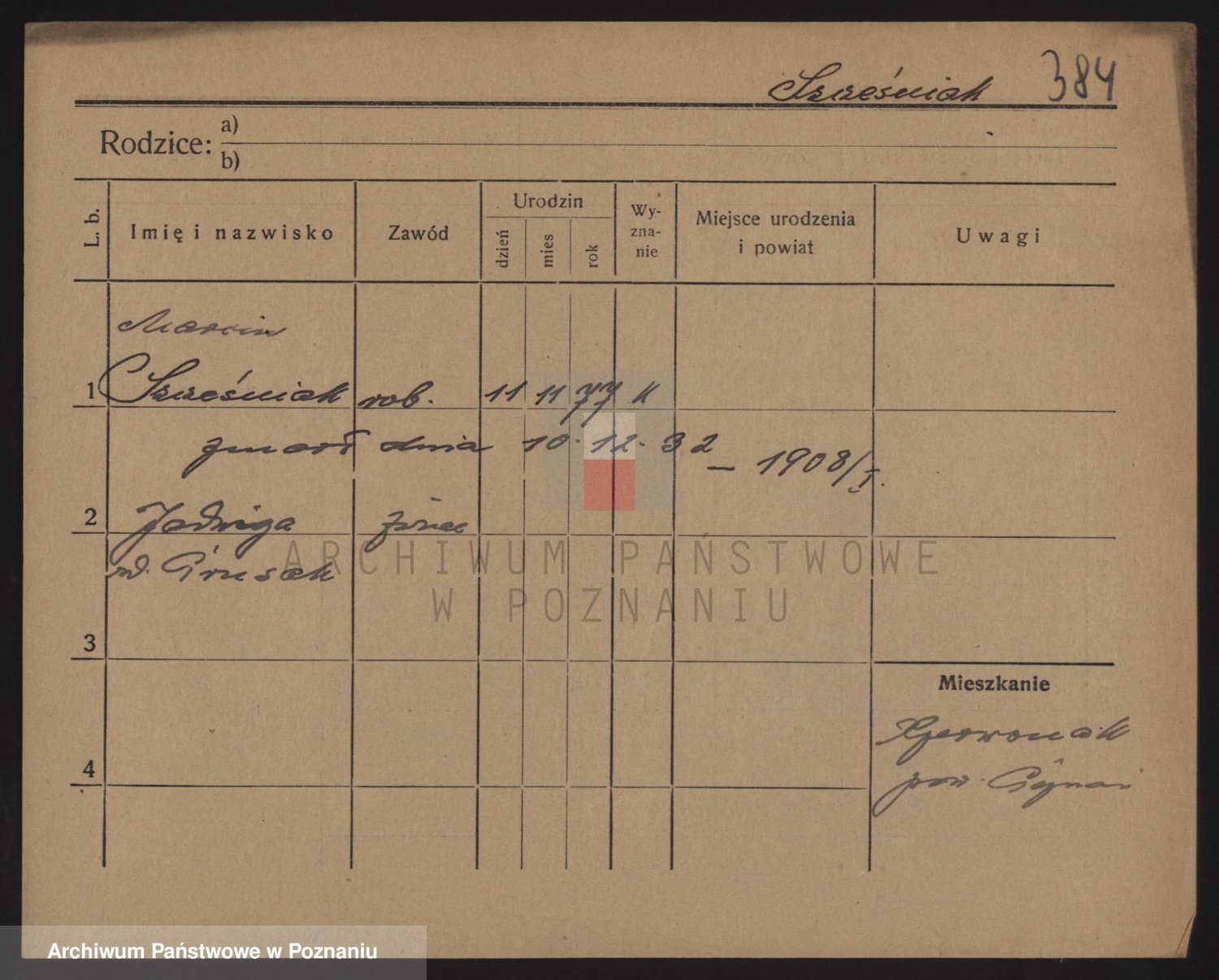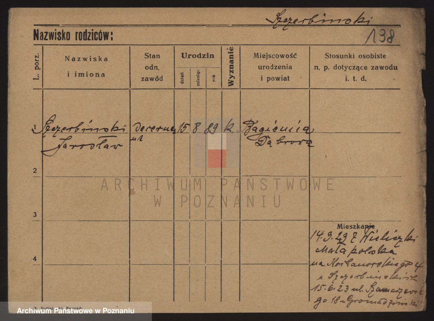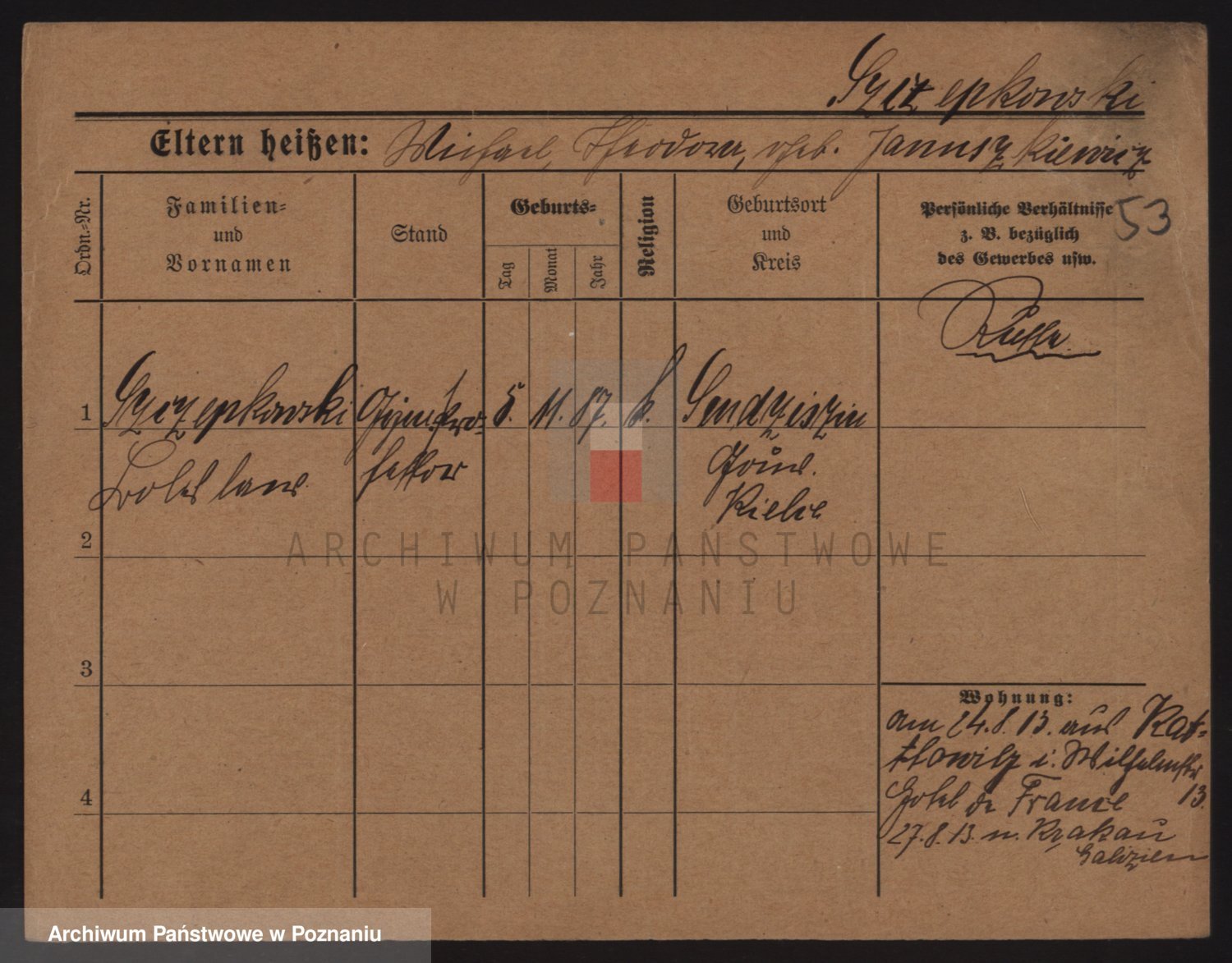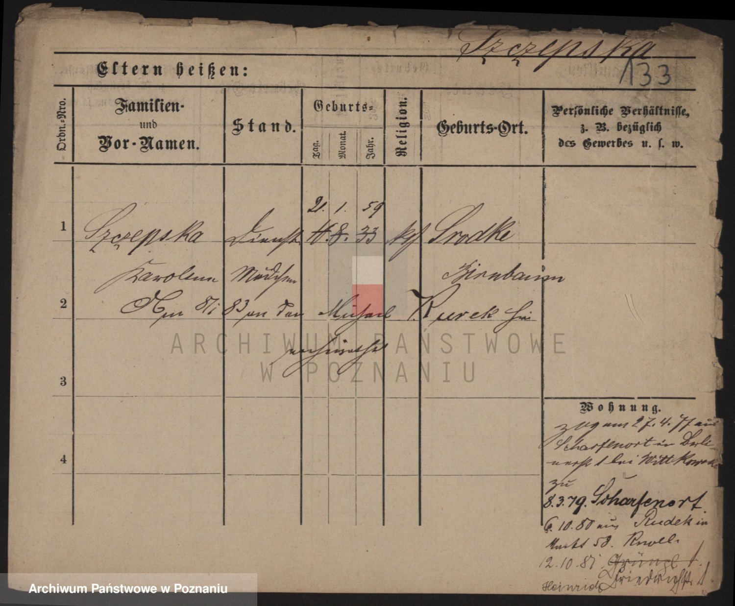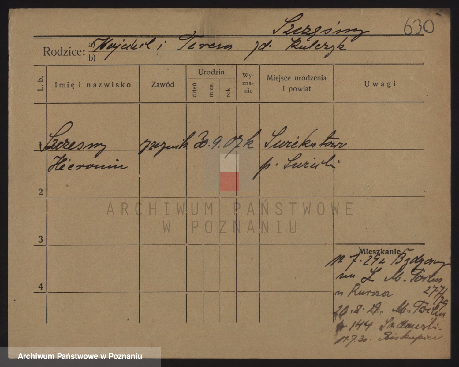 Podgląd karty osobowej dostępny jest po kliknięciu na nazwisko lub ikonkę karty. Można dokonywać powiększenia (ikony na górze) lub przechodzić między kolejnymi skanami (strzałki po bokach).