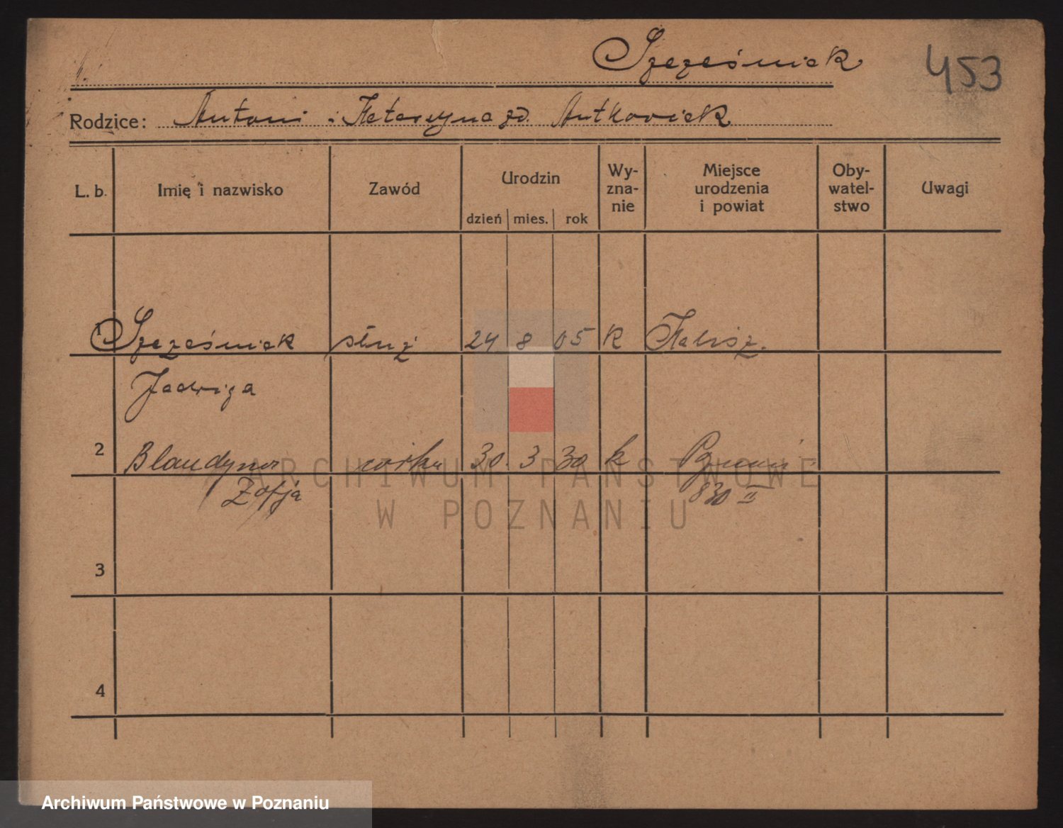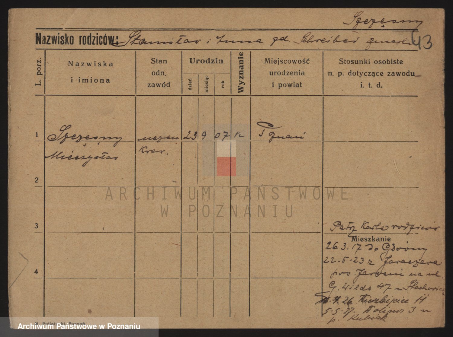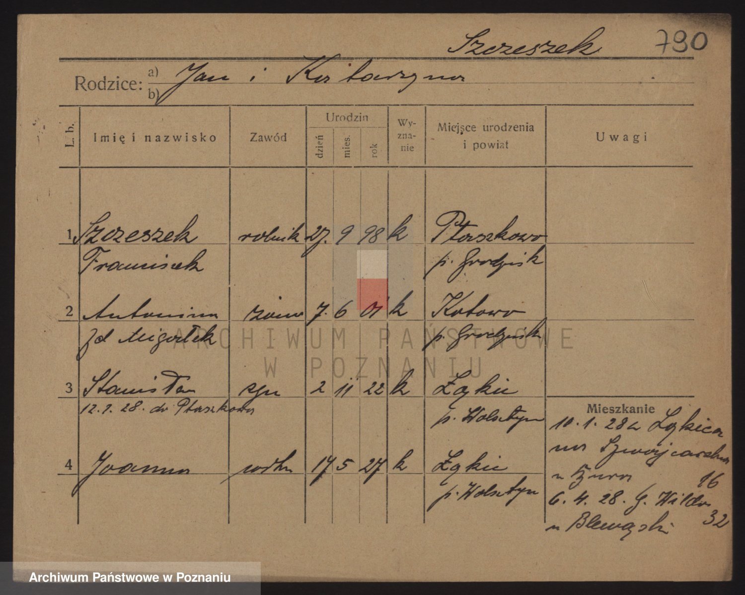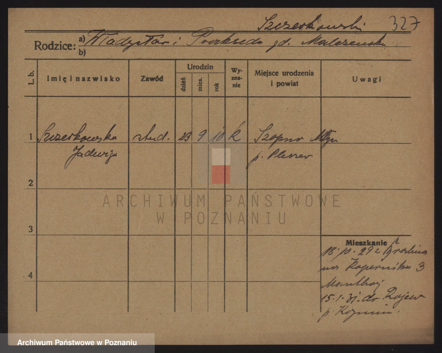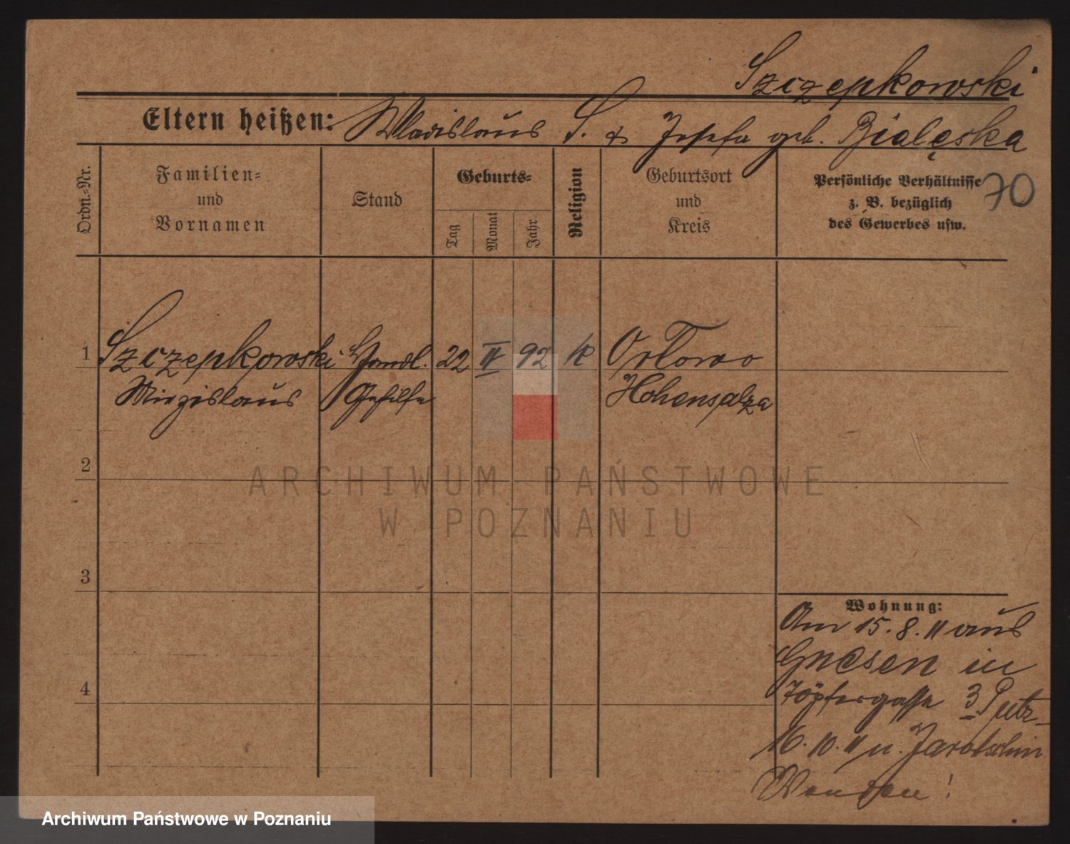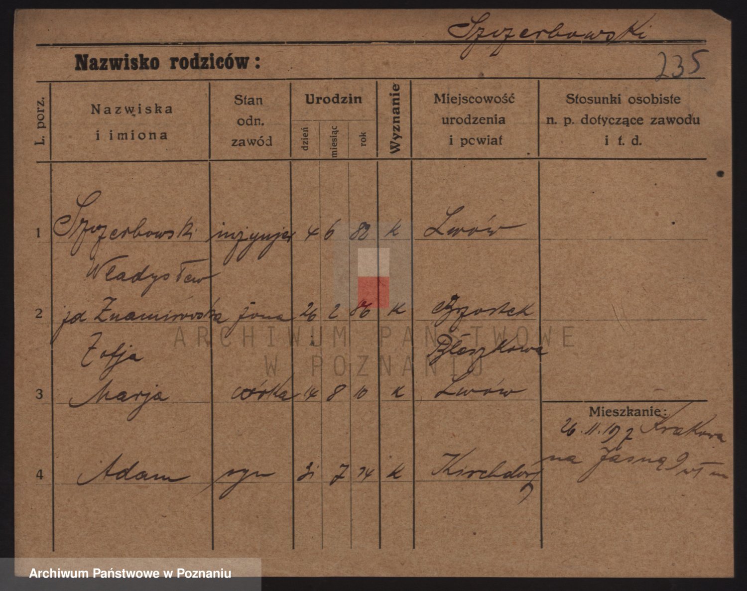 Podgląd karty osobowej dostępny jest po kliknięciu na nazwisko lub ikonkę karty. Można dokonywać powiększenia (ikony na górze) lub przechodzić między kolejnymi skanami (strzałki po bokach).