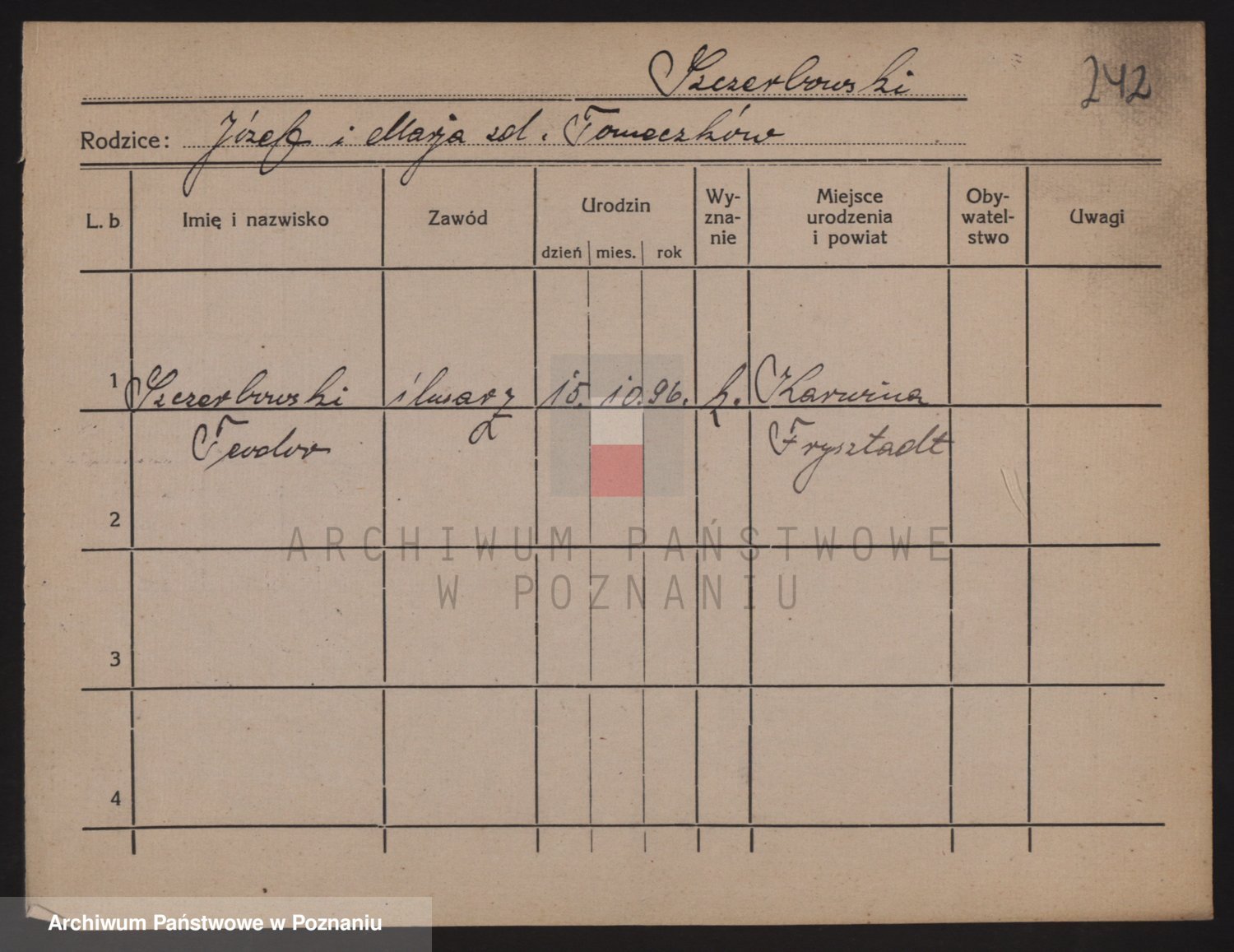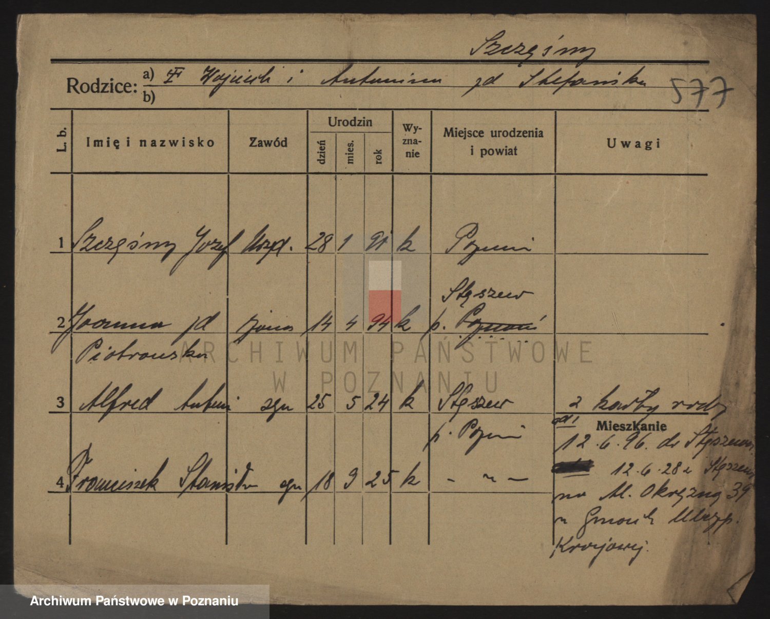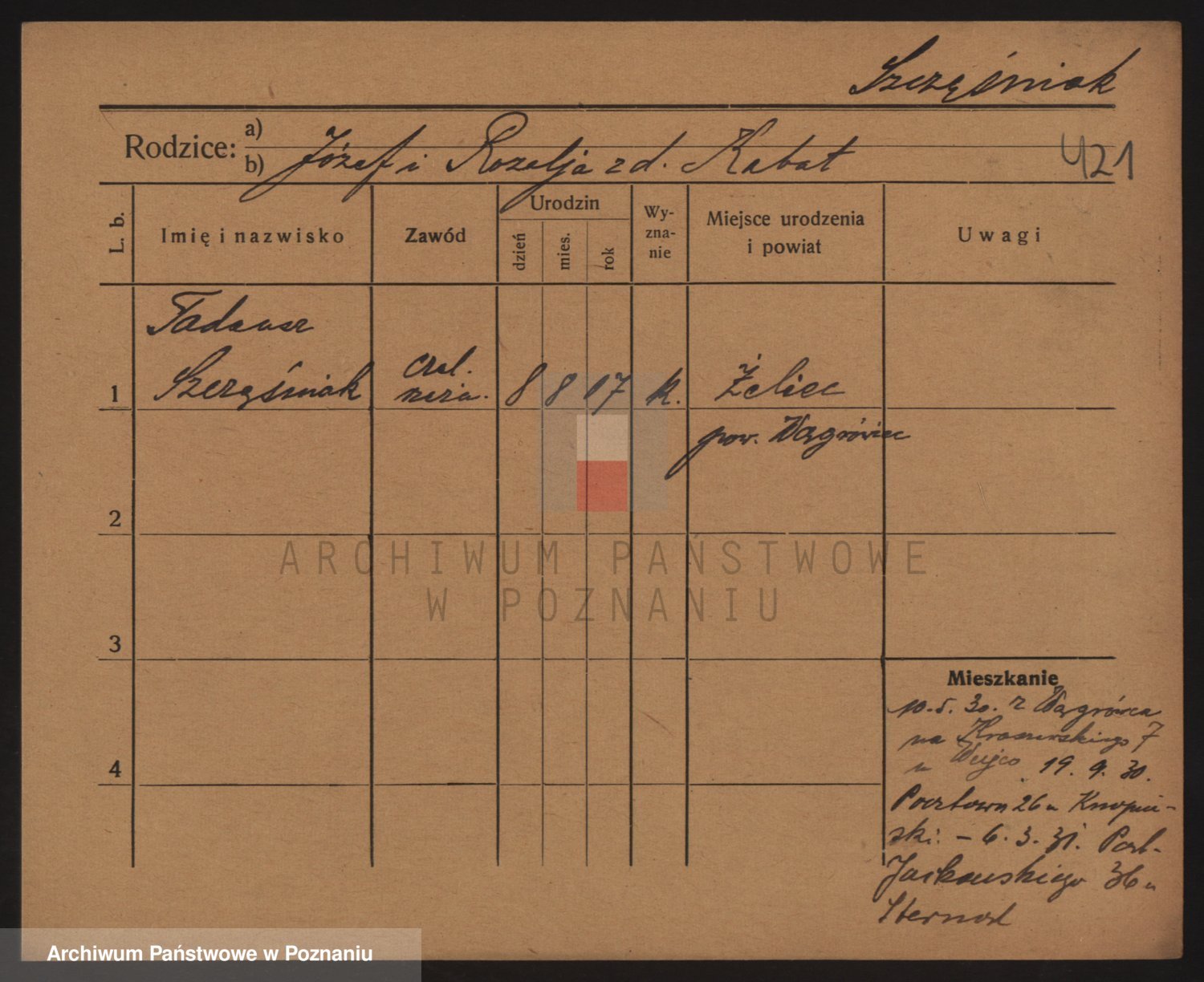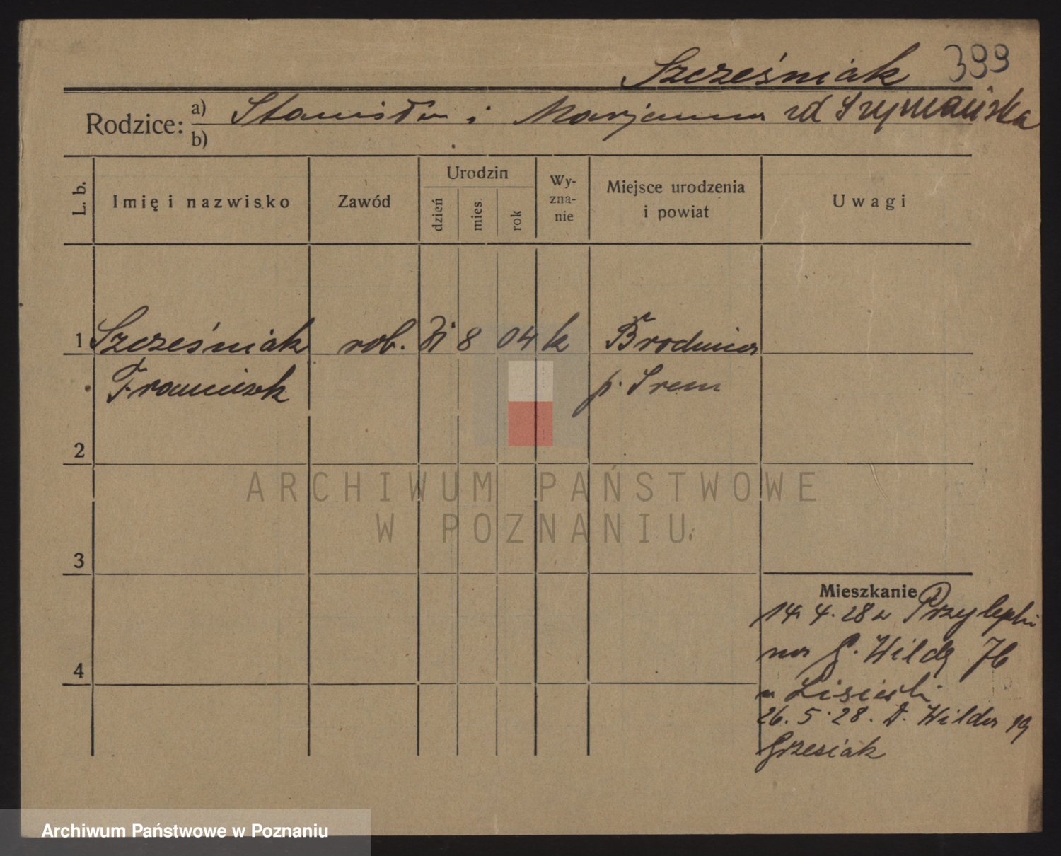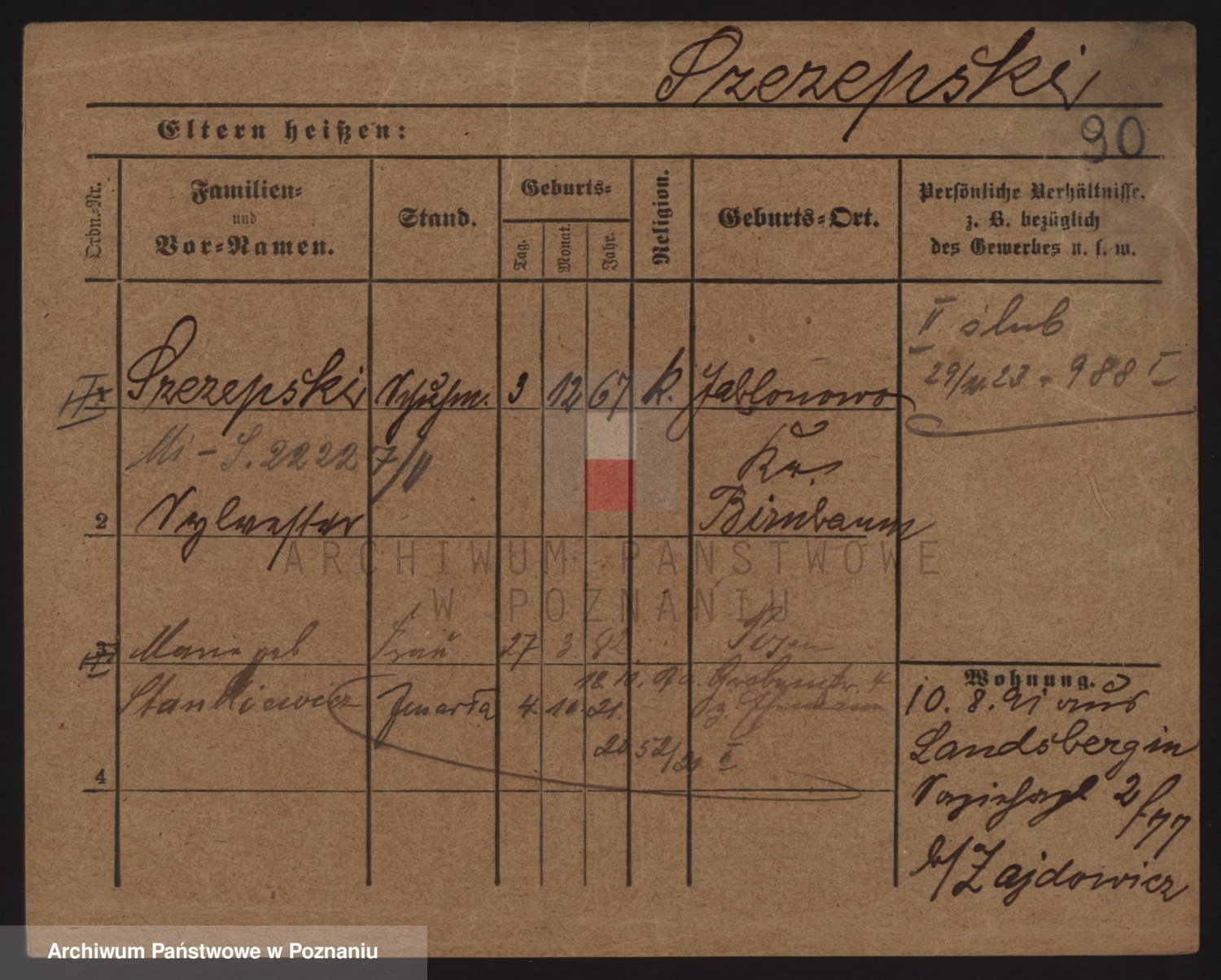 Podgląd karty osobowej dostępny jest po kliknięciu na nazwisko lub ikonkę karty. Można dokonywać powiększenia (ikony na górze) lub przechodzić między kolejnymi skanami (strzałki po bokach).