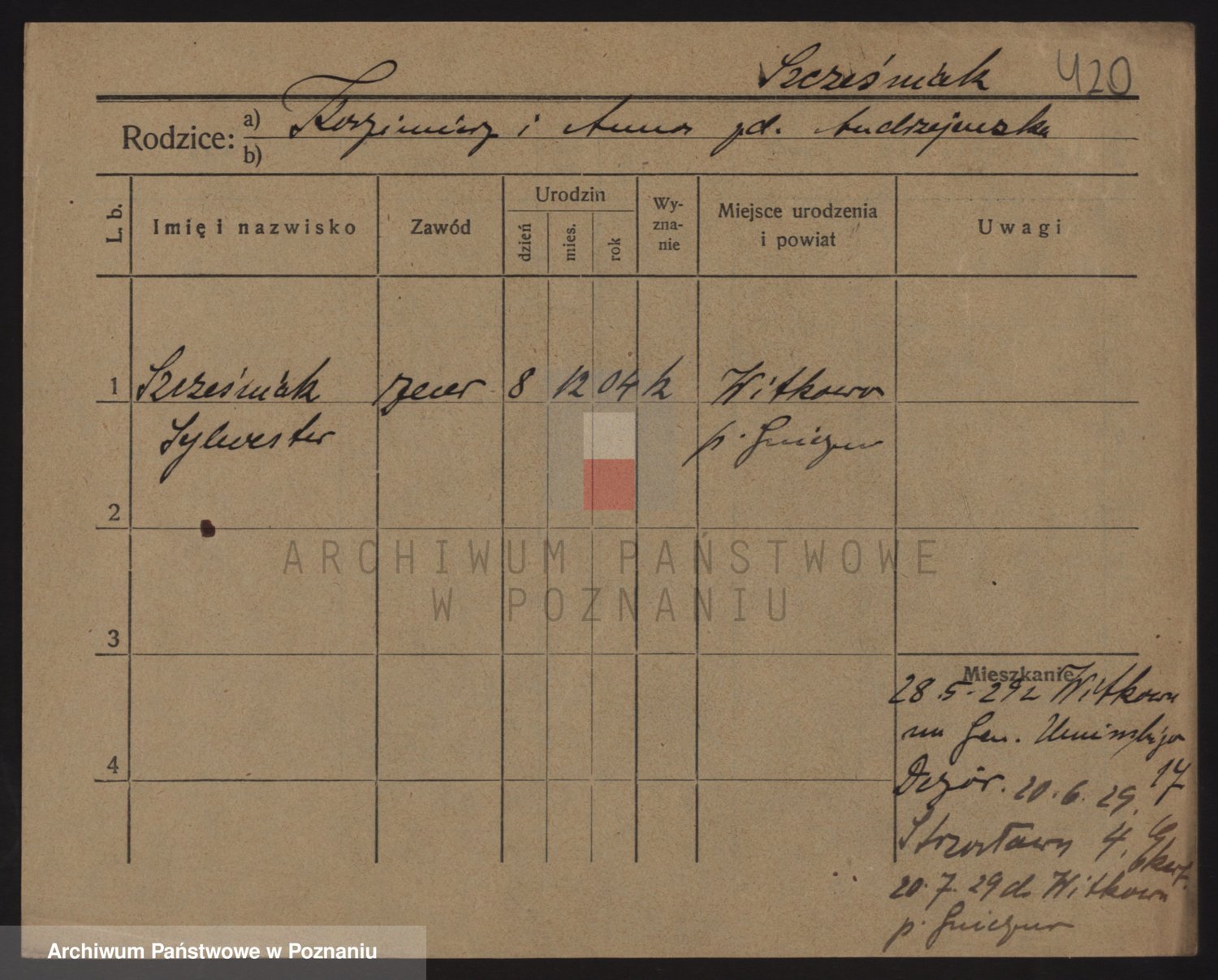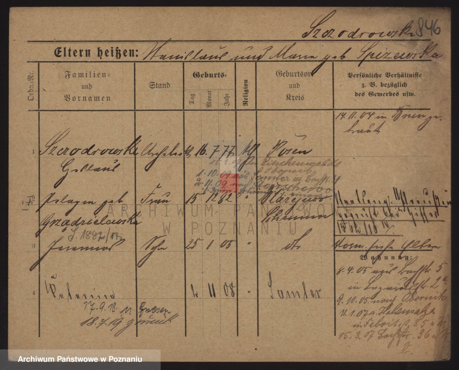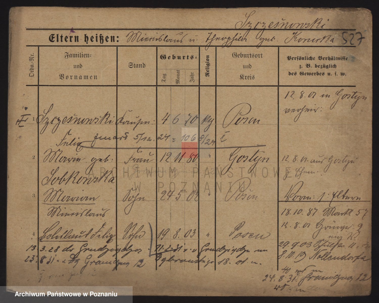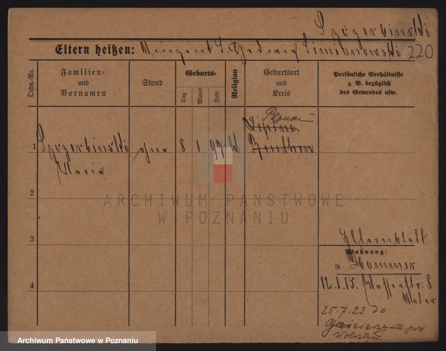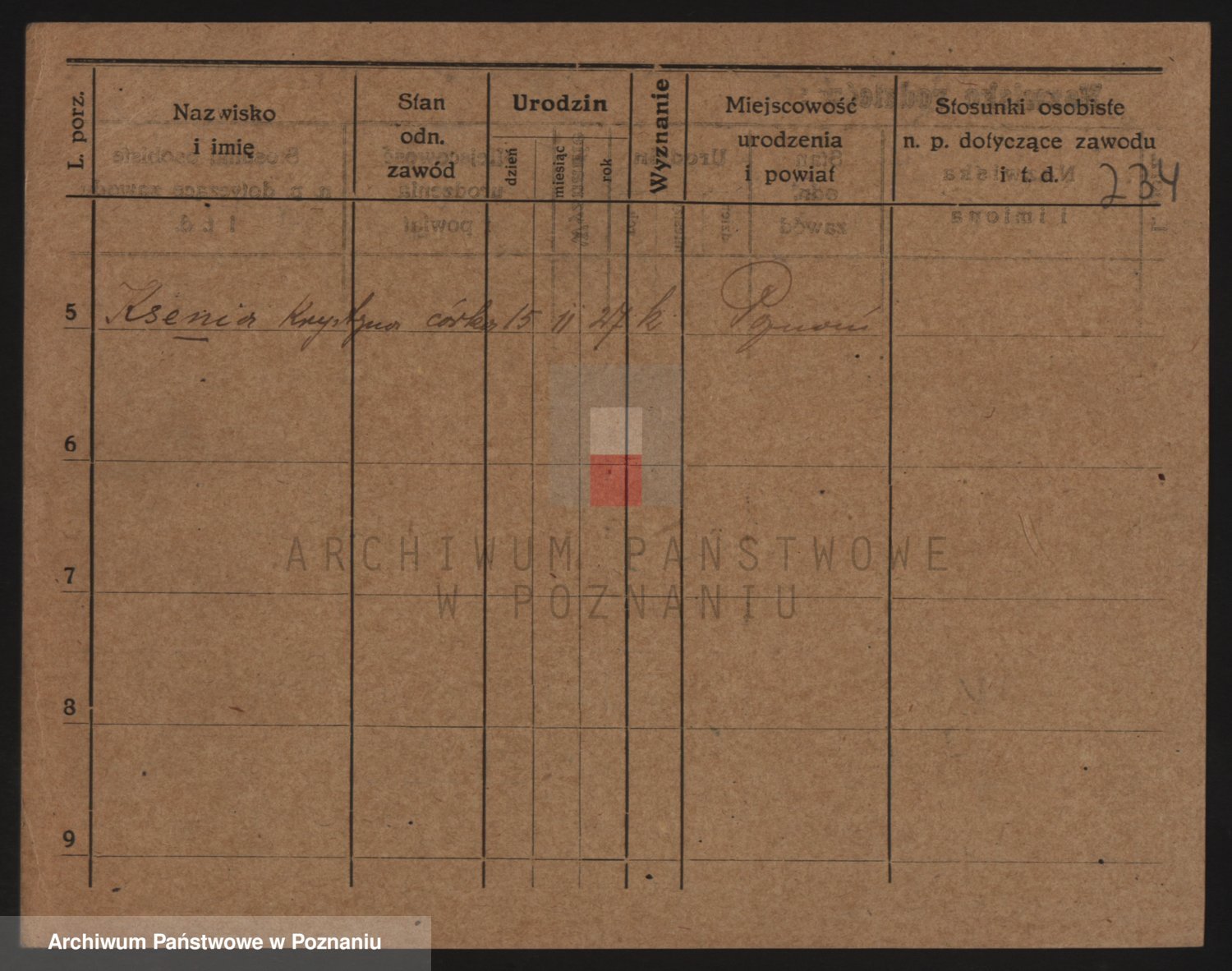 Podgląd karty osobowej dostępny jest po kliknięciu na nazwisko lub ikonkę karty. Można dokonywać powiększenia (ikony na górze) lub przechodzić między kolejnymi skanami (strzałki po bokach).