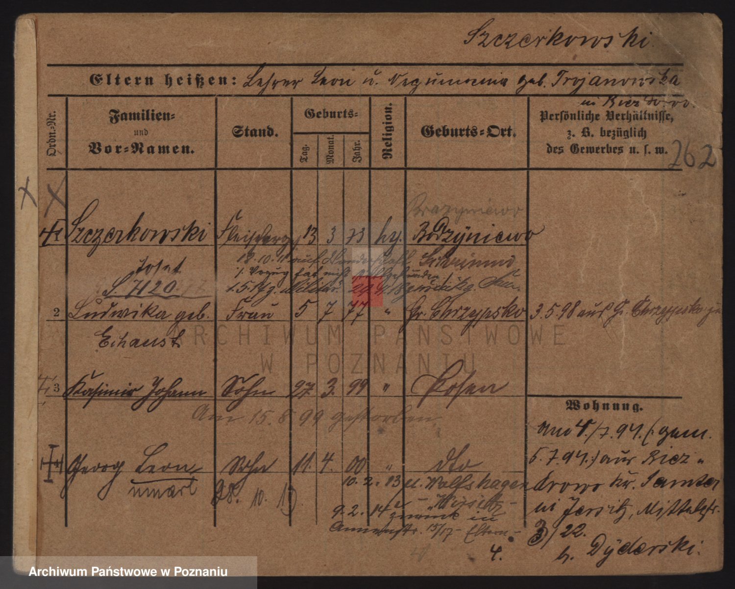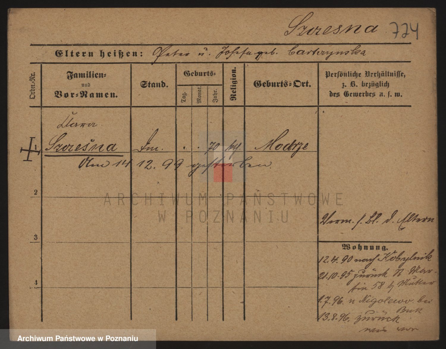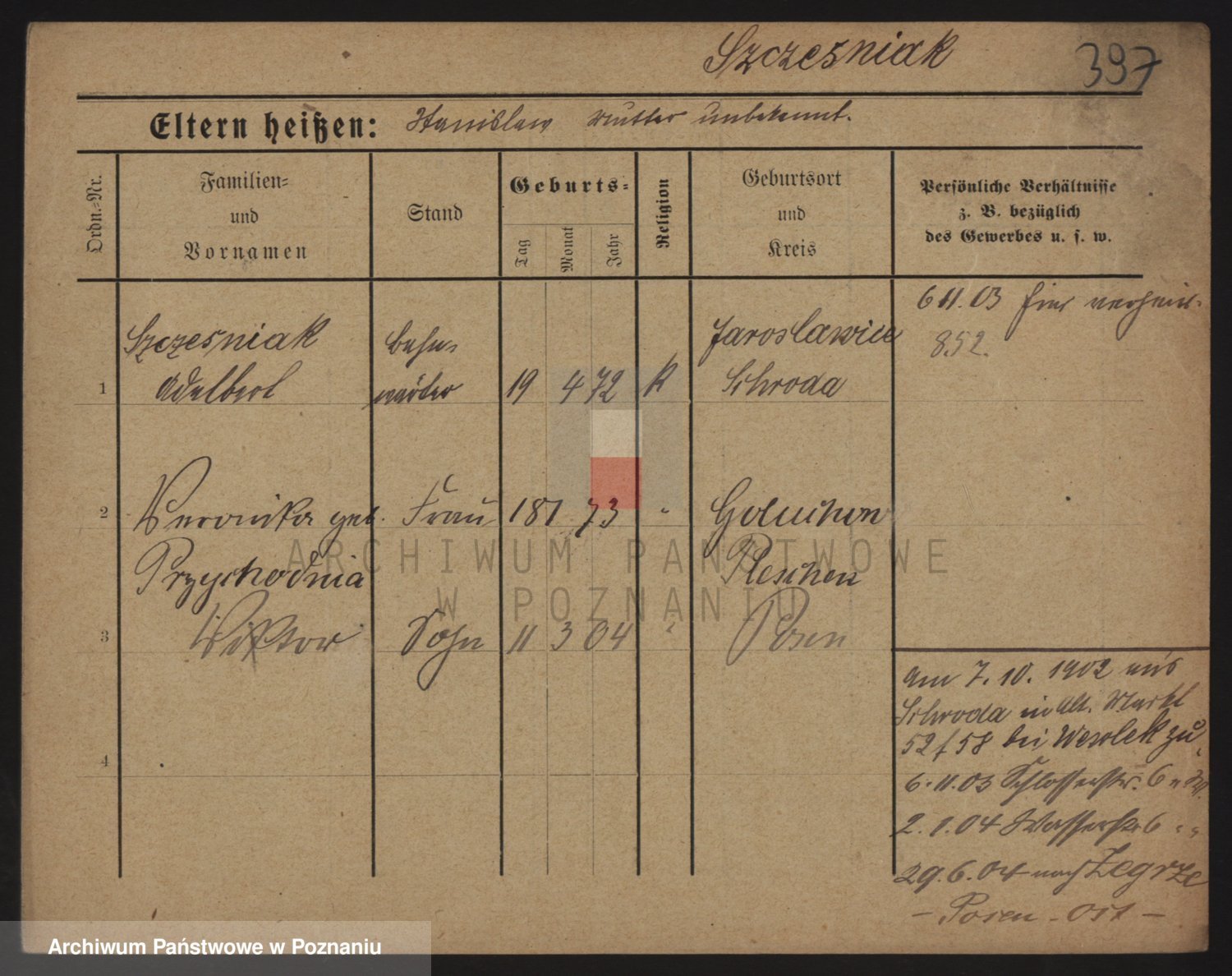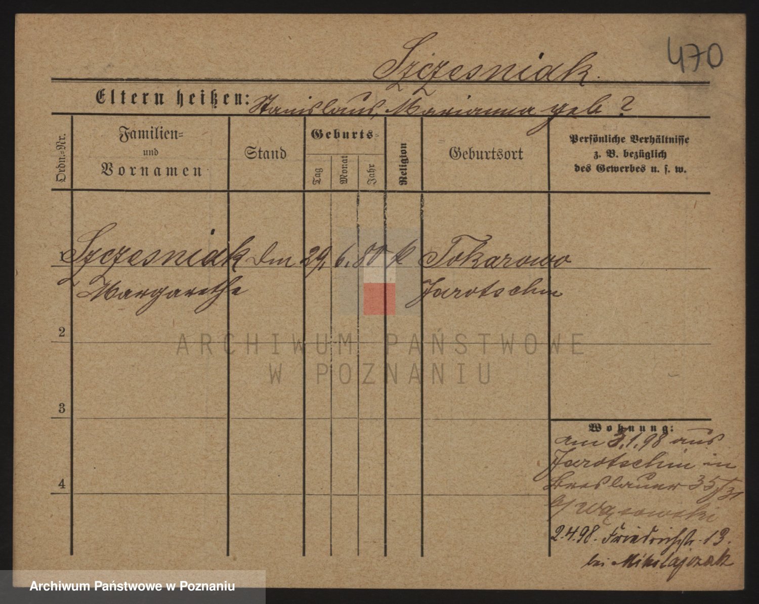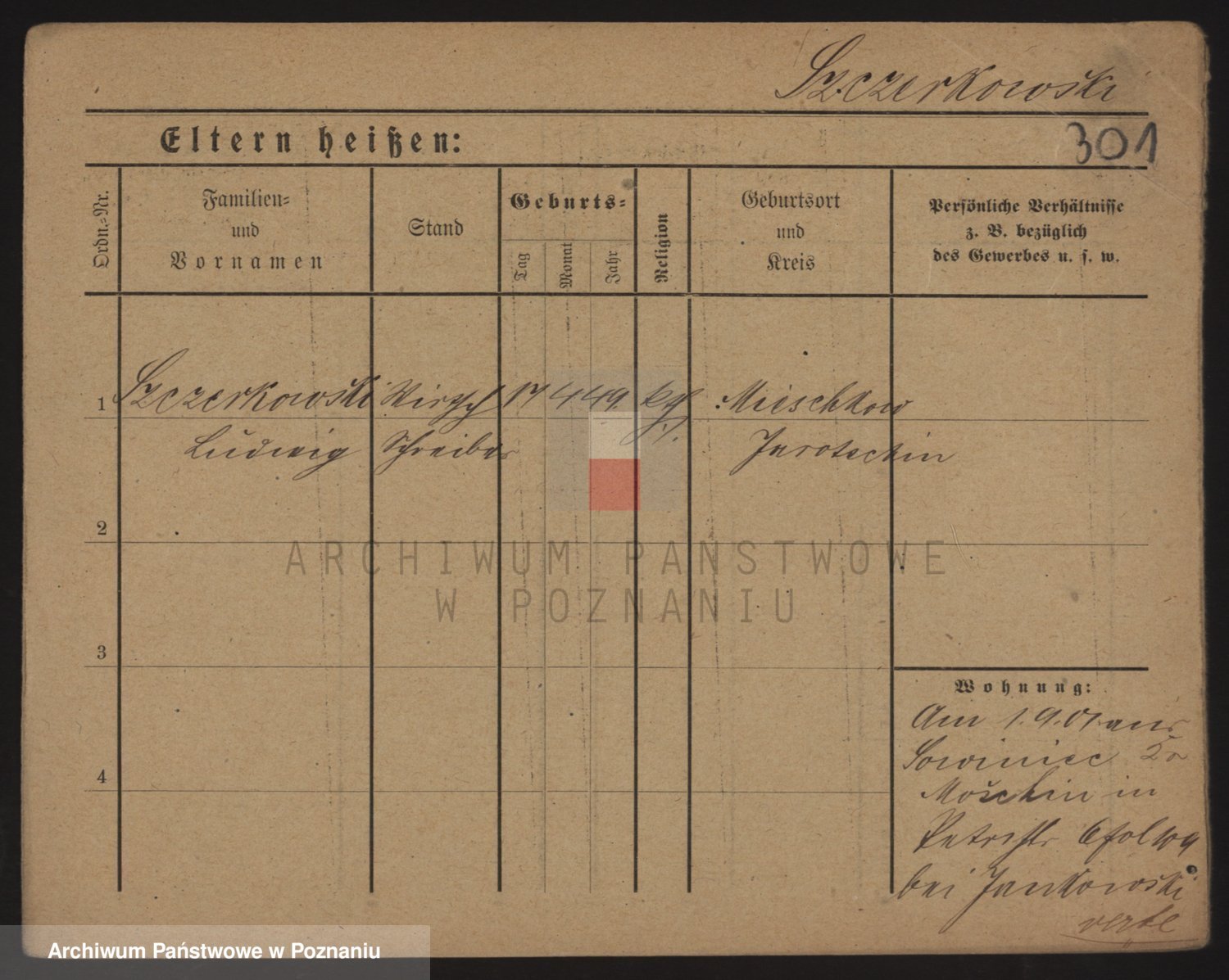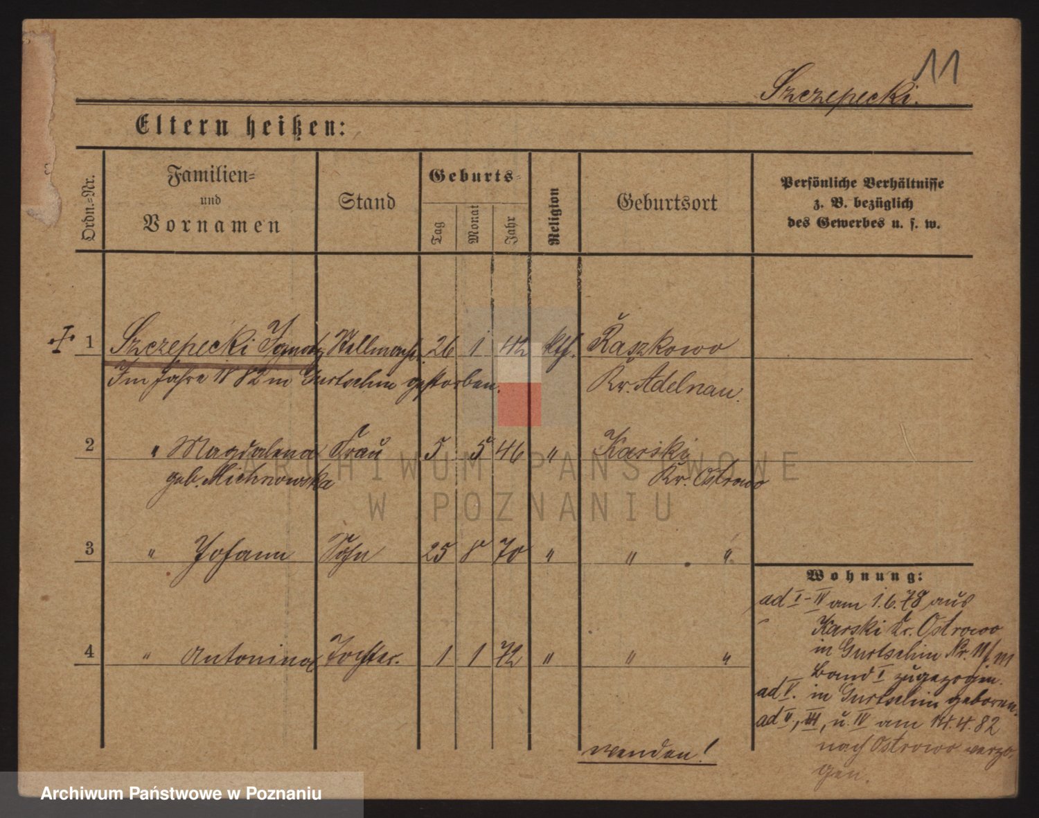 Podgląd karty osobowej dostępny jest po kliknięciu na nazwisko lub ikonkę karty. Można dokonywać powiększenia (ikony na górze) lub przechodzić między kolejnymi skanami (strzałki po bokach).