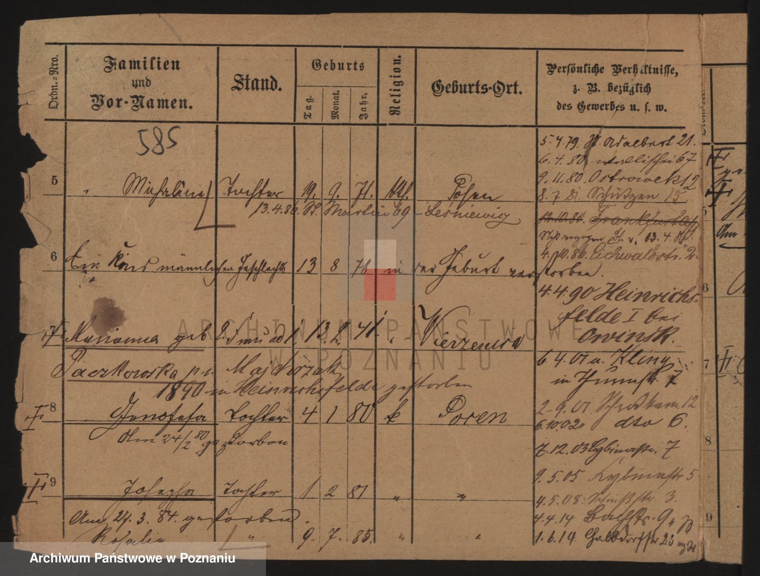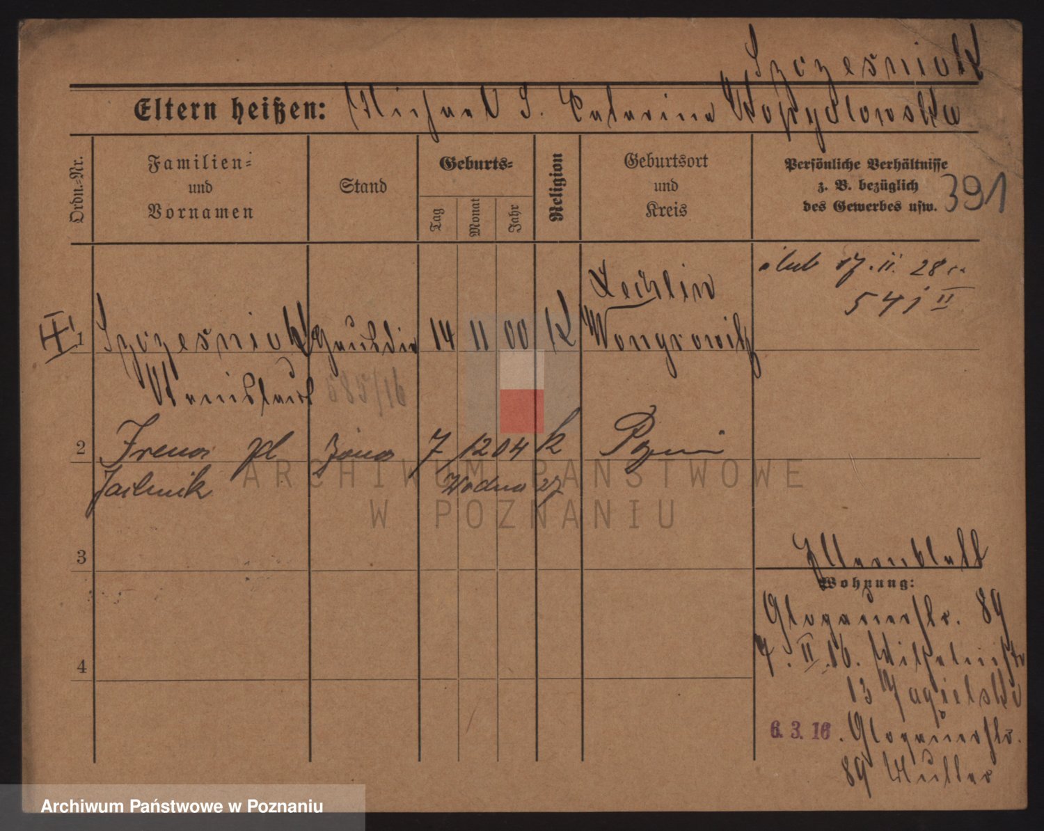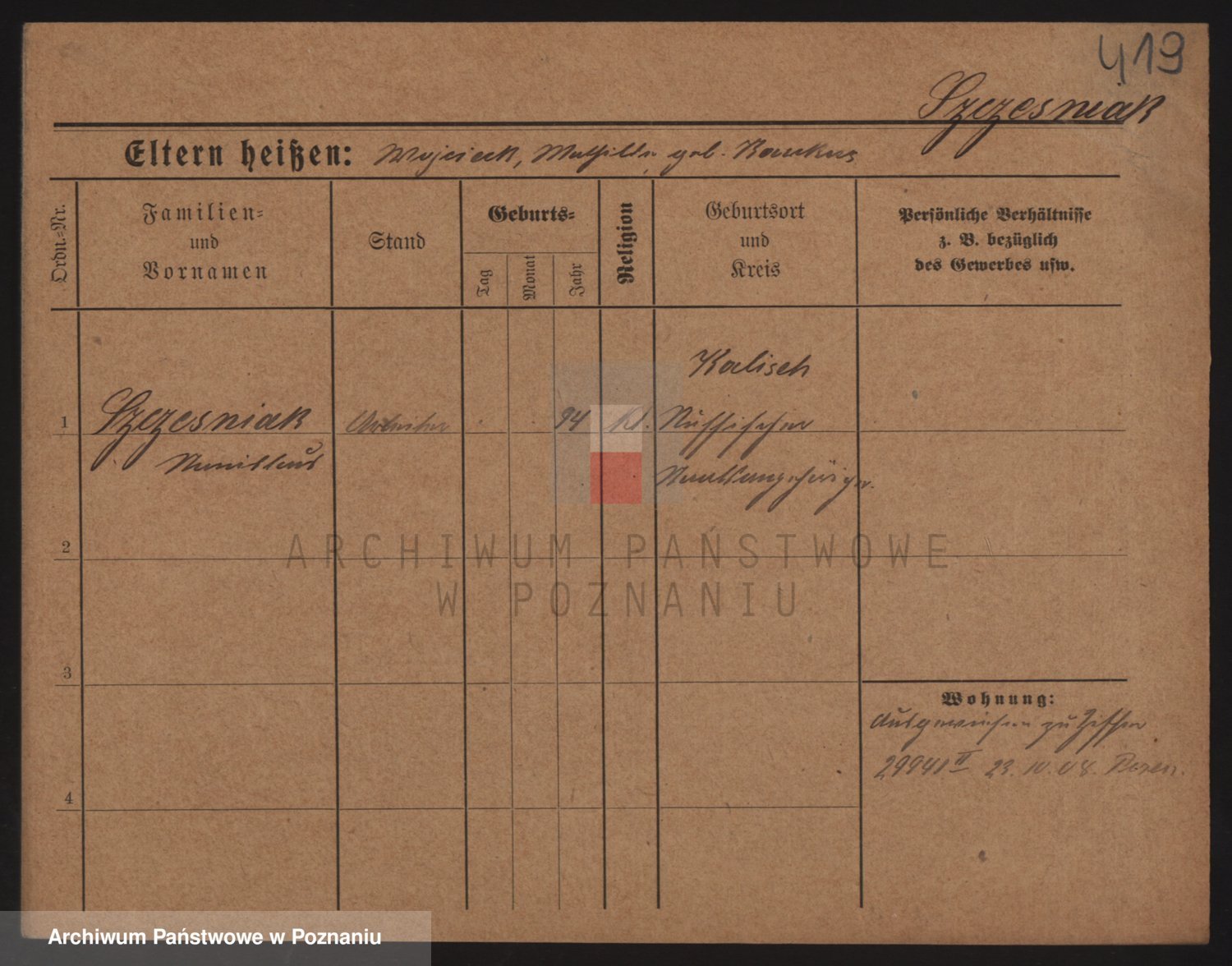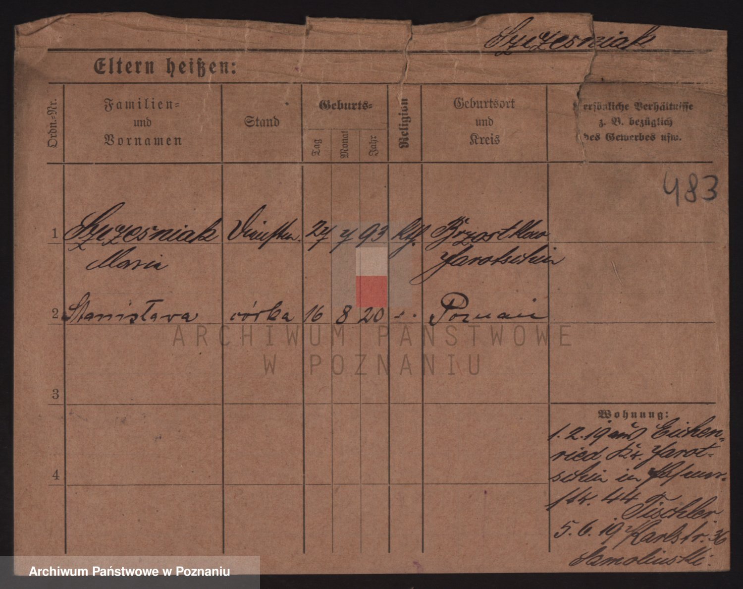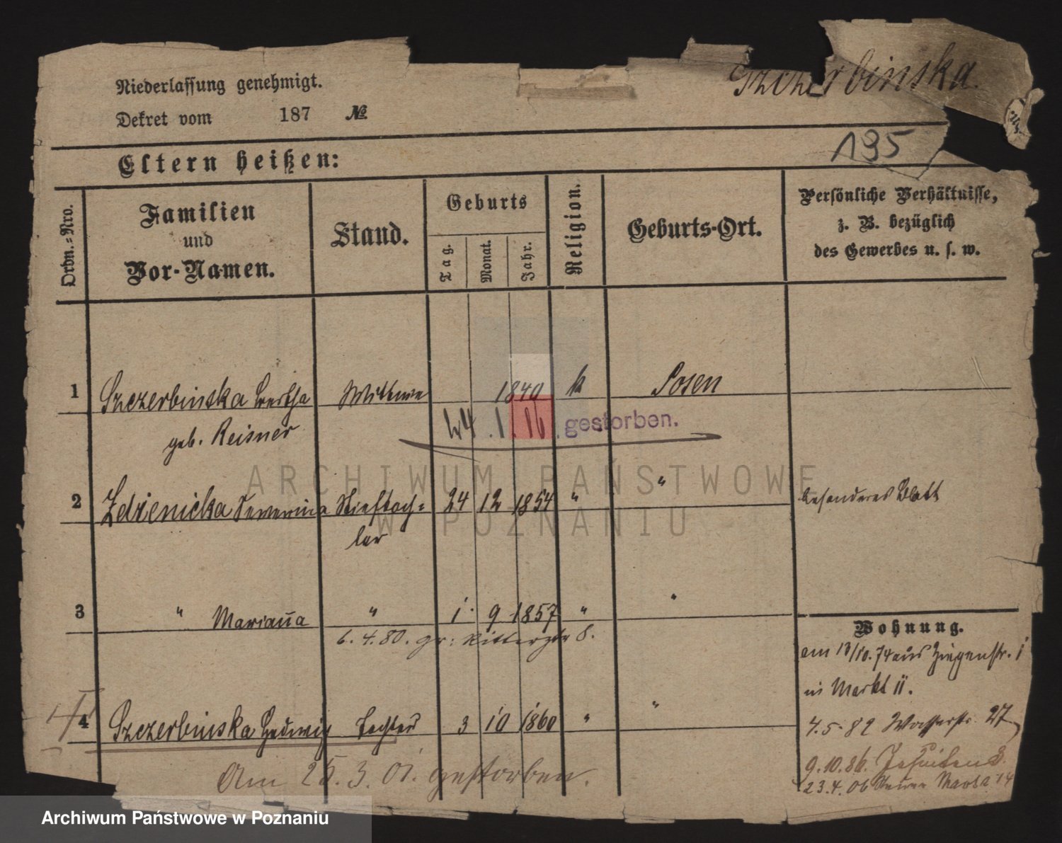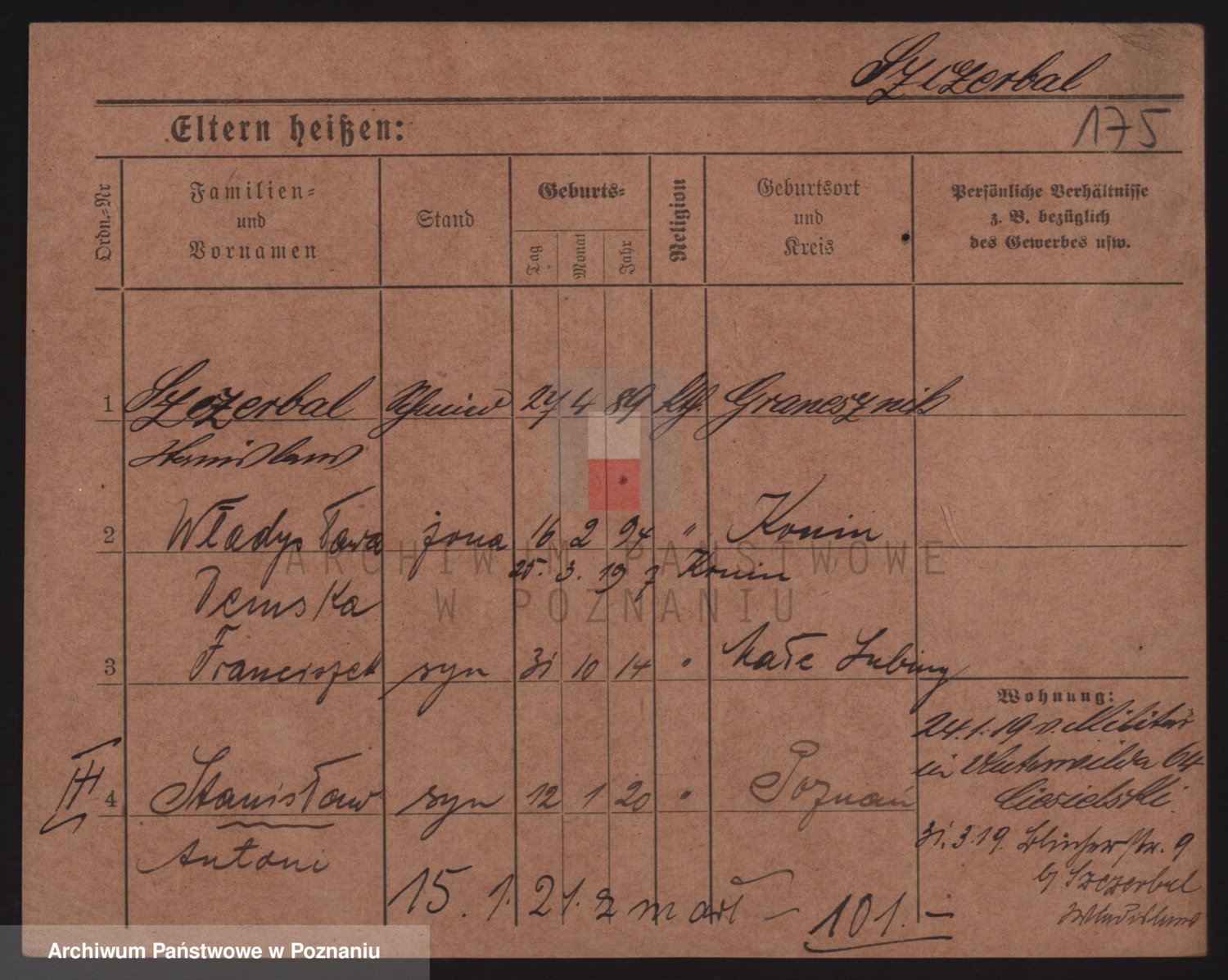 Podgląd karty osobowej dostępny jest po kliknięciu na nazwisko lub ikonkę karty. Można dokonywać powiększenia (ikony na górze) lub przechodzić między kolejnymi skanami (strzałki po bokach).