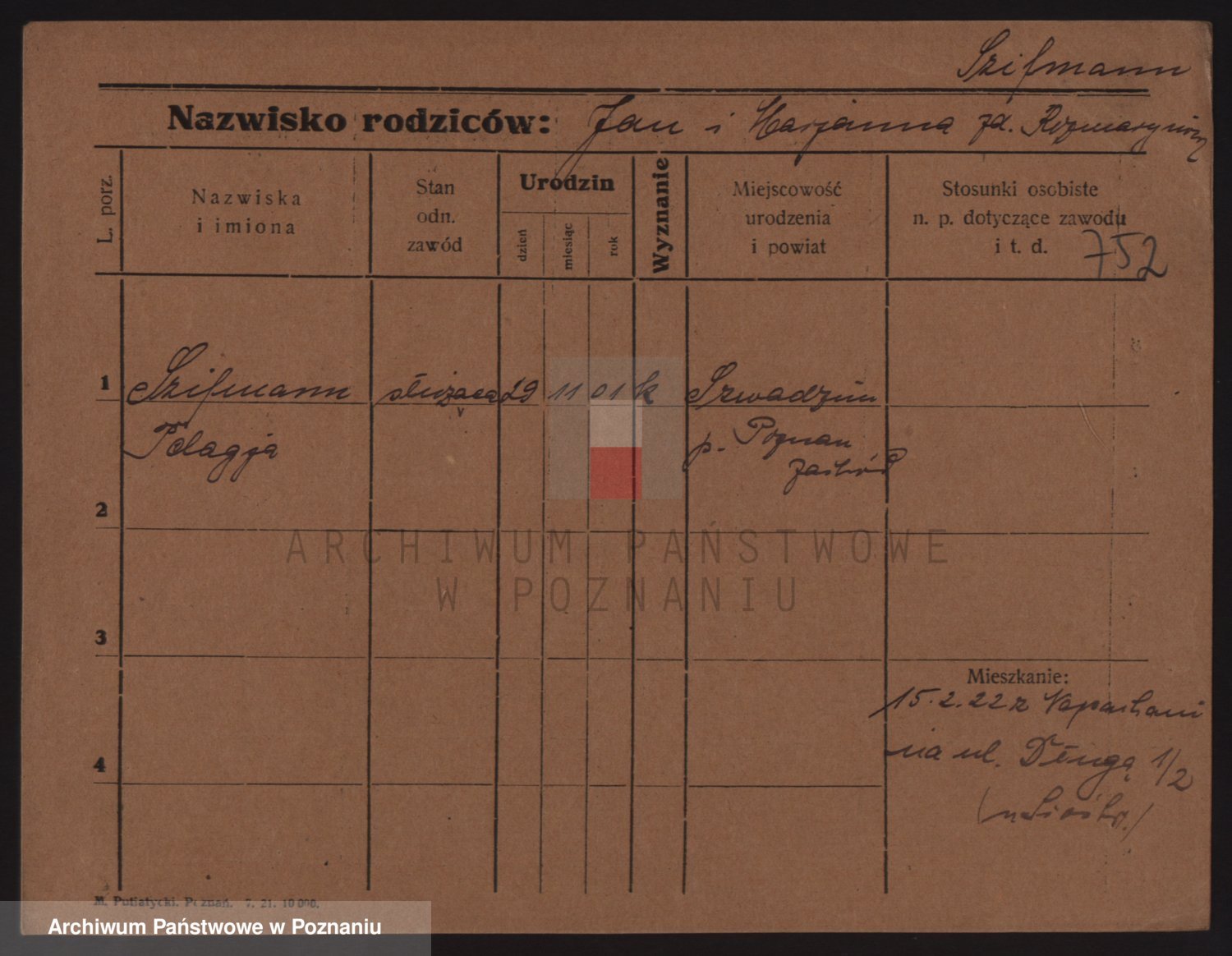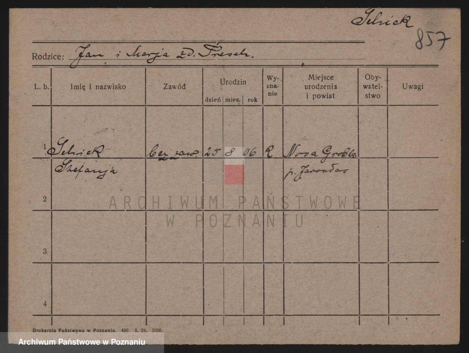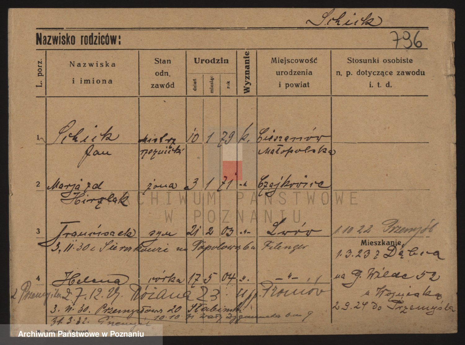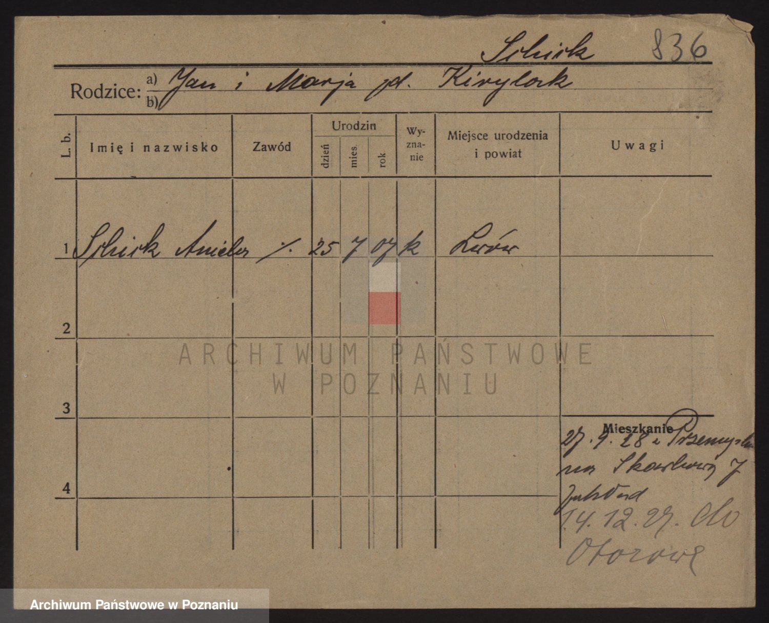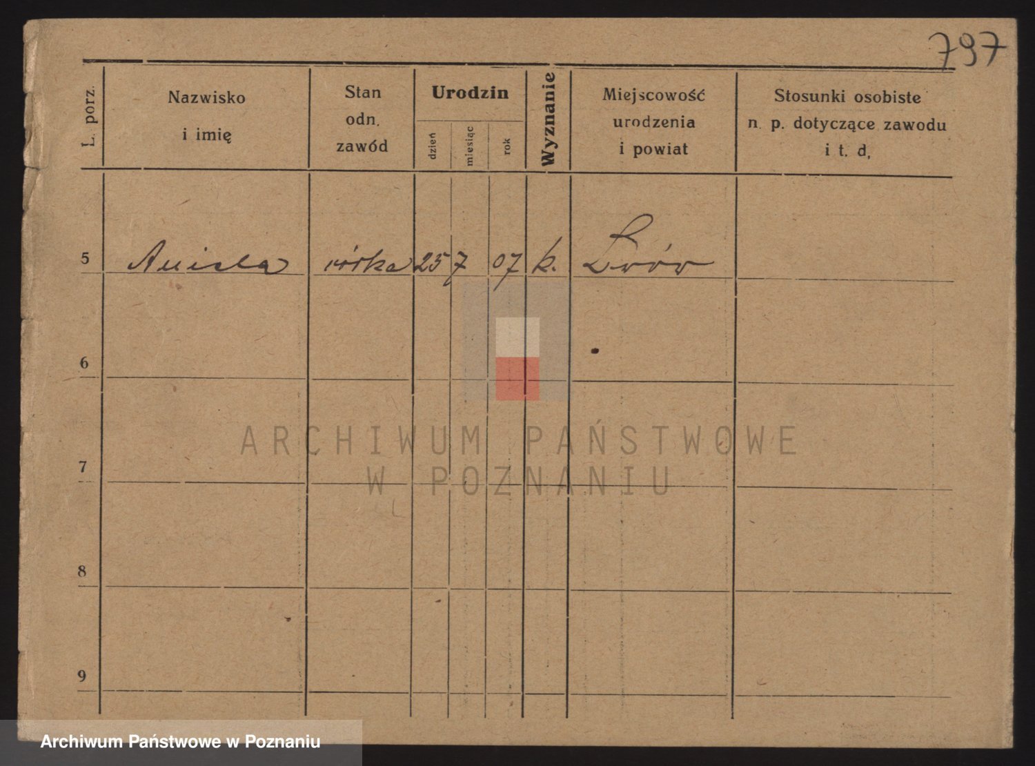 Podgląd karty osobowej dostępny jest po kliknięciu na nazwisko lub ikonkę karty. Można dokonywać powiększenia (ikony na górze) lub przechodzić między kolejnymi skanami (strzałki po bokach).