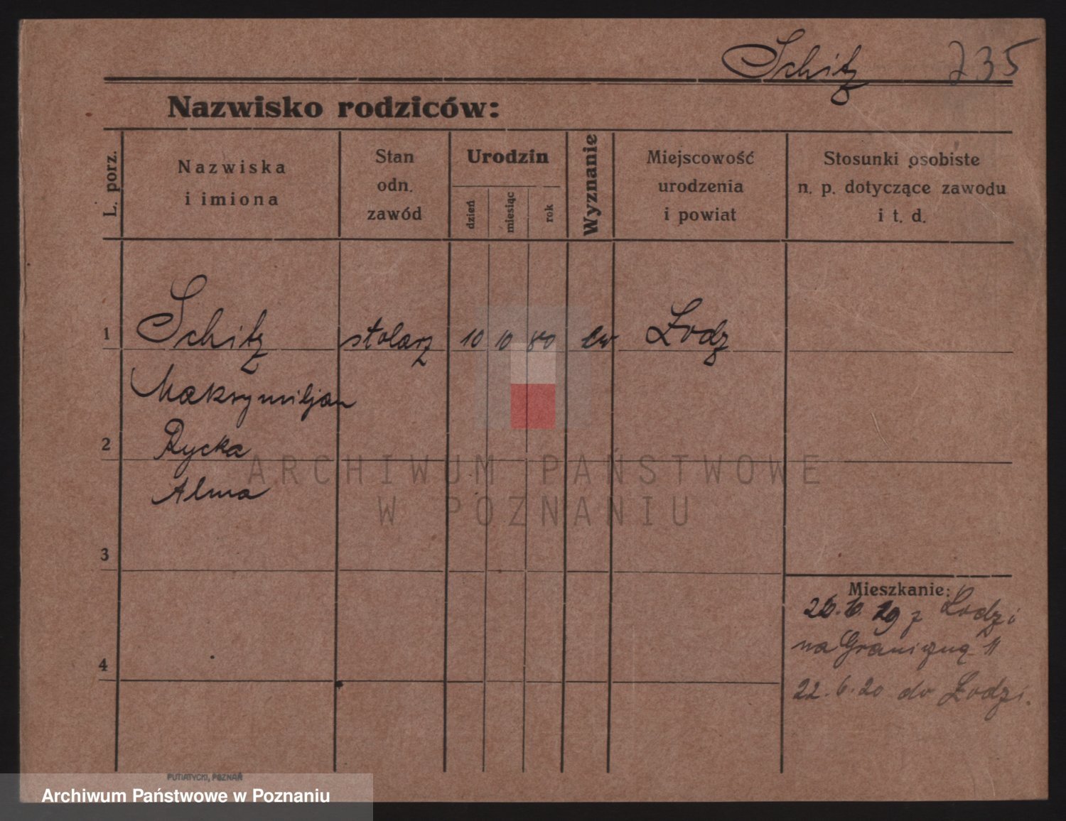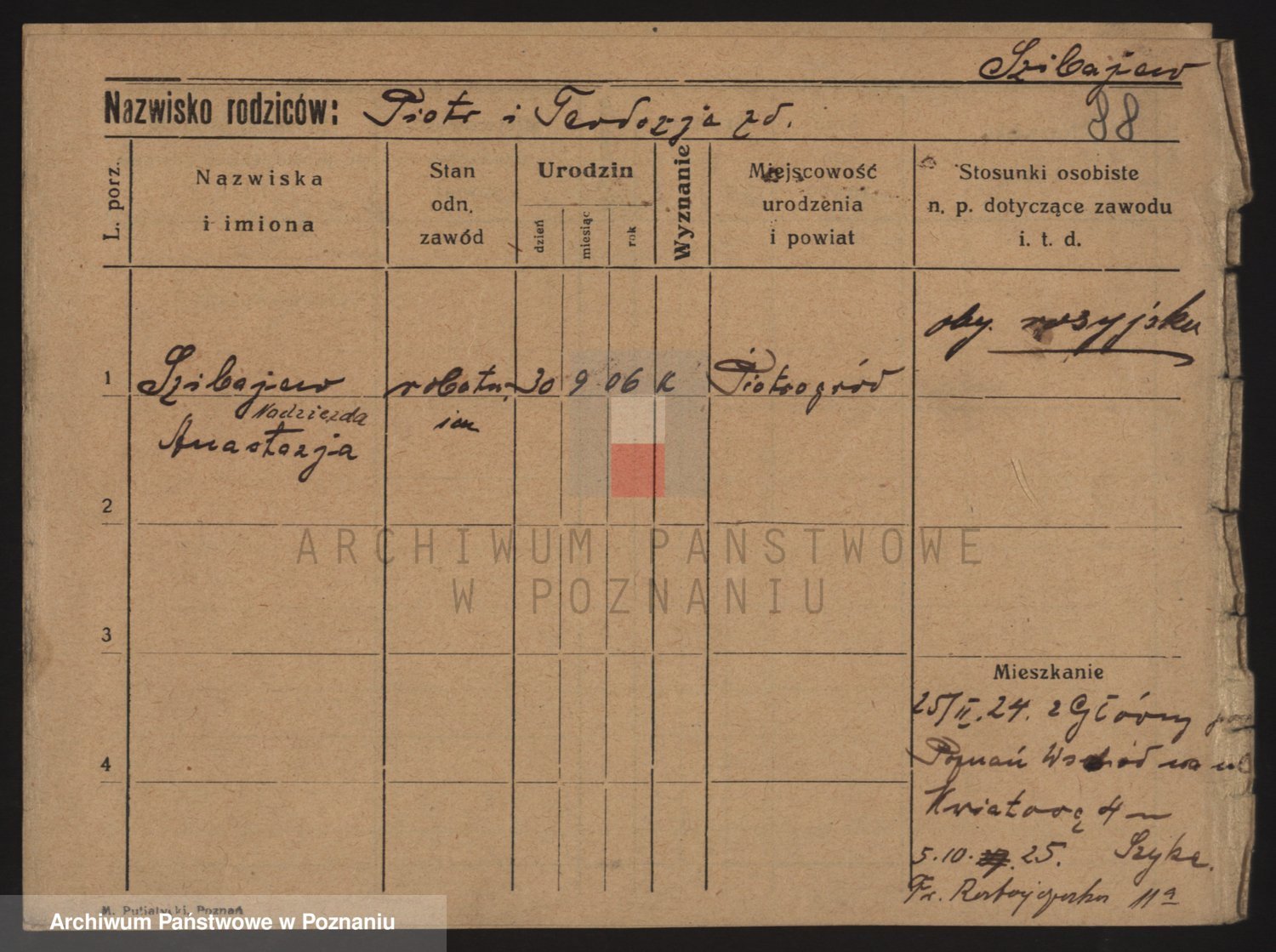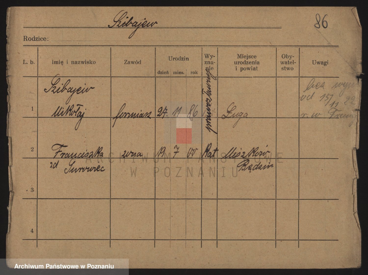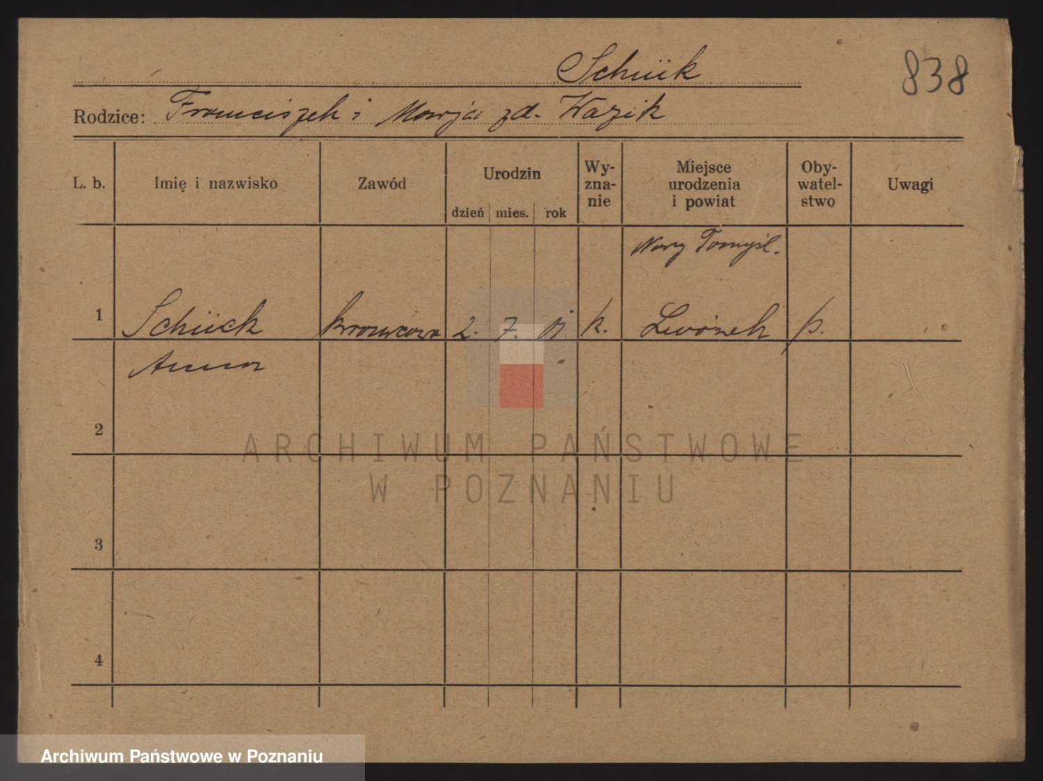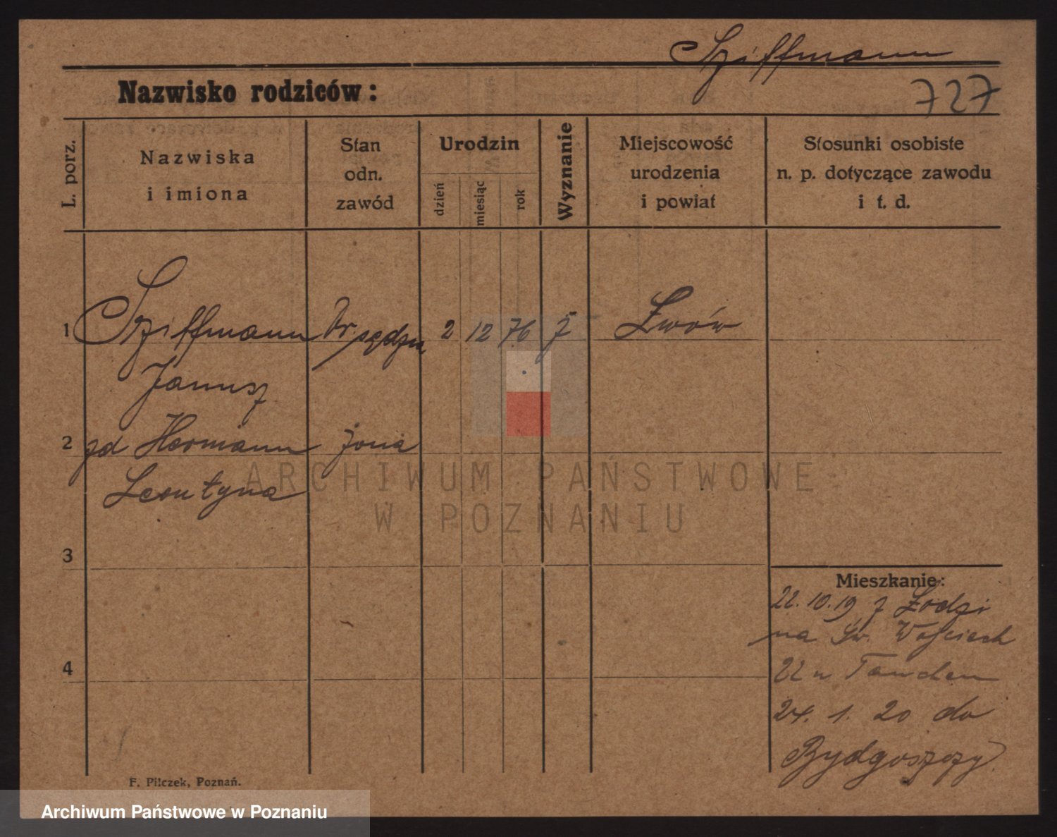 Podgląd karty osobowej dostępny jest po kliknięciu na nazwisko lub ikonkę karty. Można dokonywać powiększenia (ikony na górze) lub przechodzić między kolejnymi skanami (strzałki po bokach).