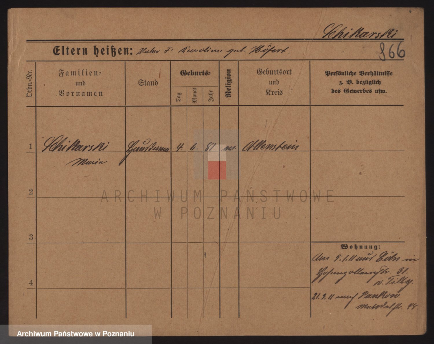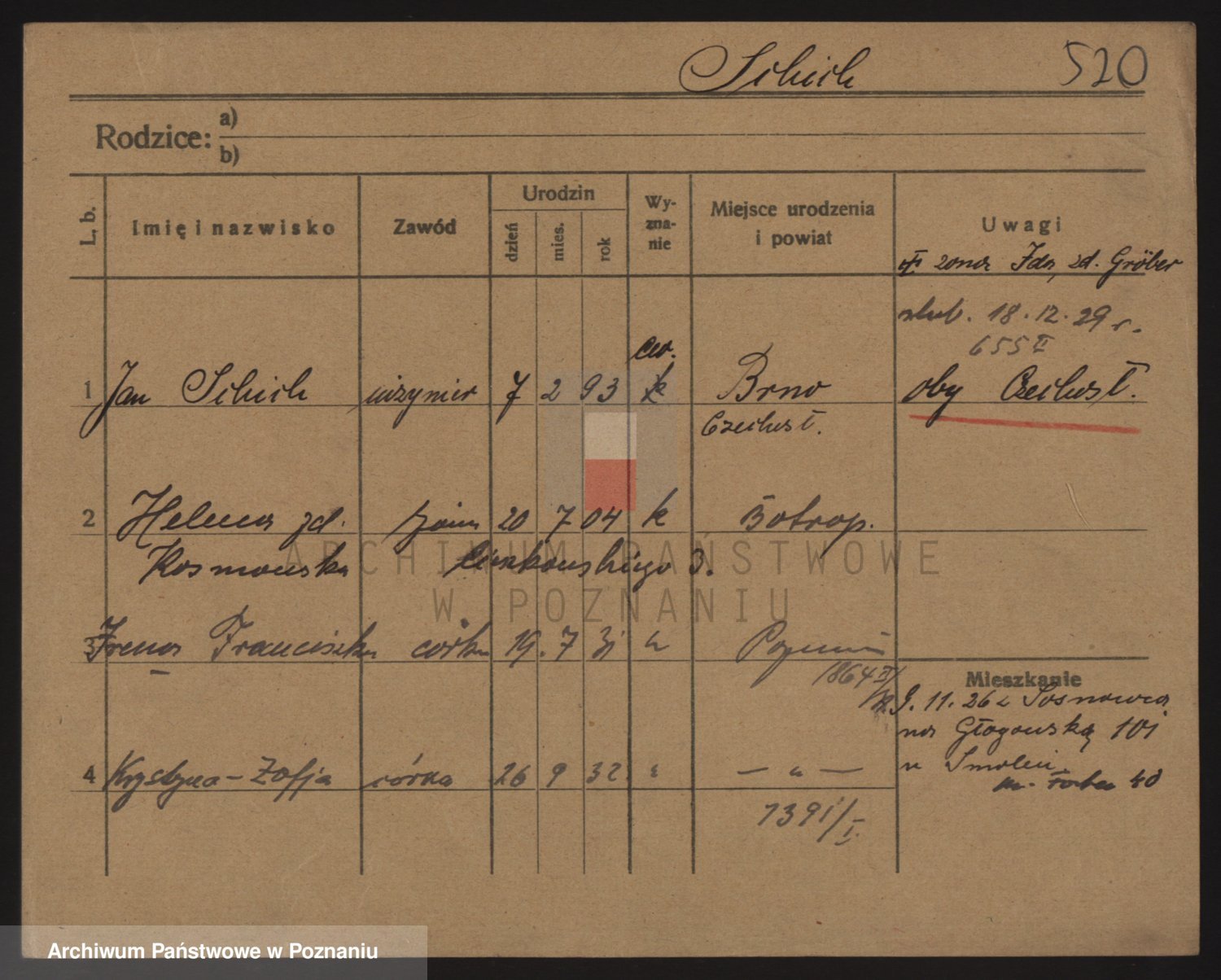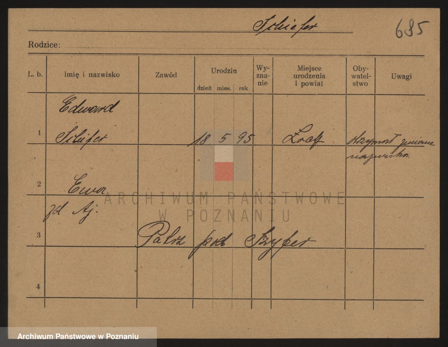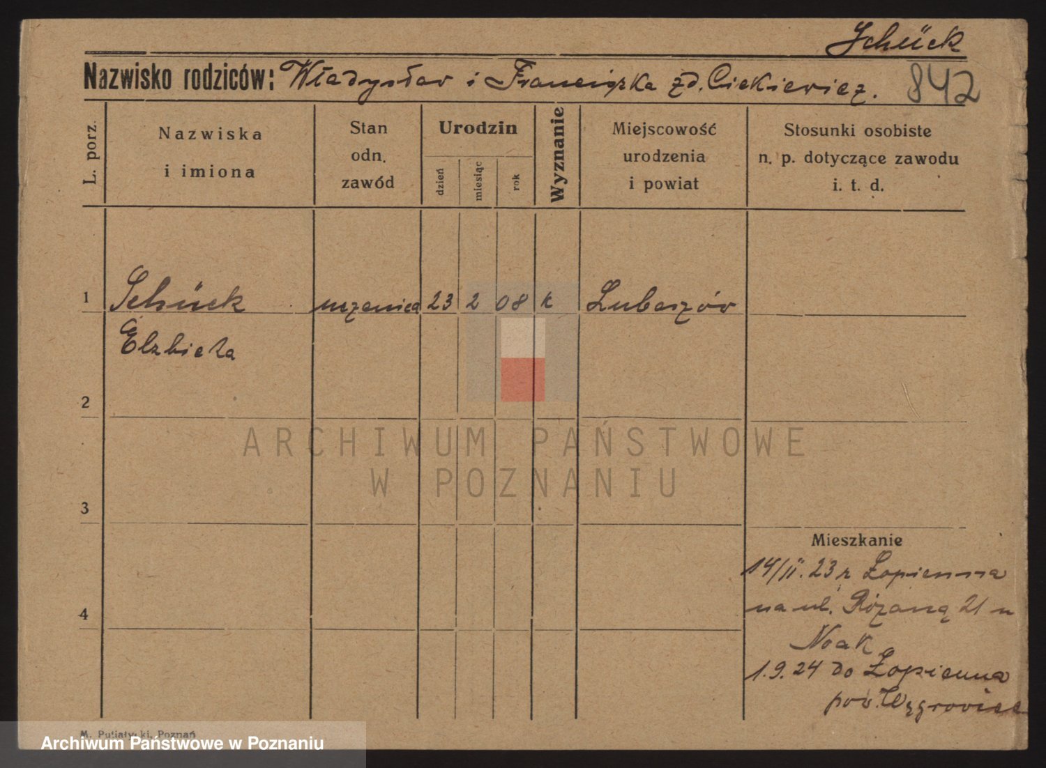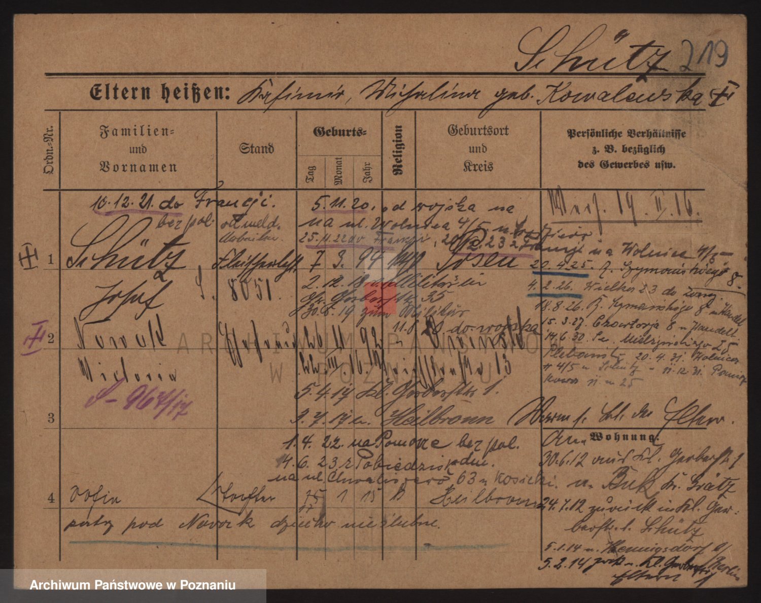 Podgląd karty osobowej dostępny jest po kliknięciu na nazwisko lub ikonkę karty. Można dokonywać powiększenia (ikony na górze) lub przechodzić między kolejnymi skanami (strzałki po bokach).