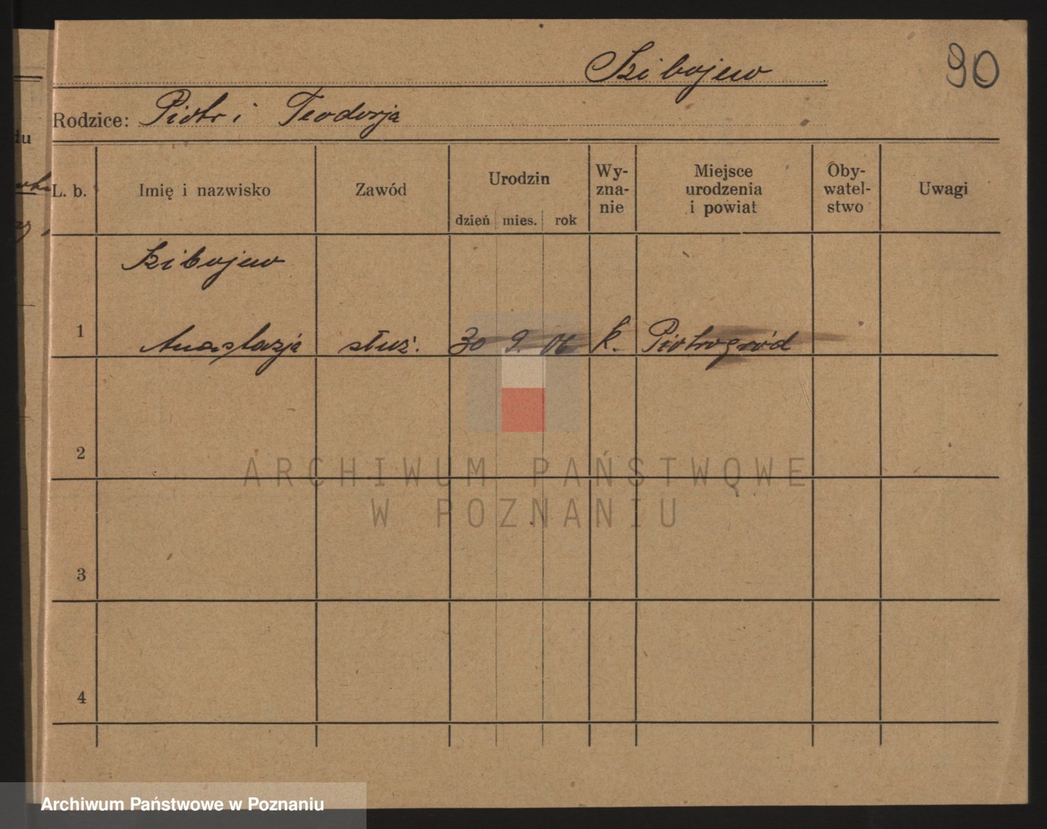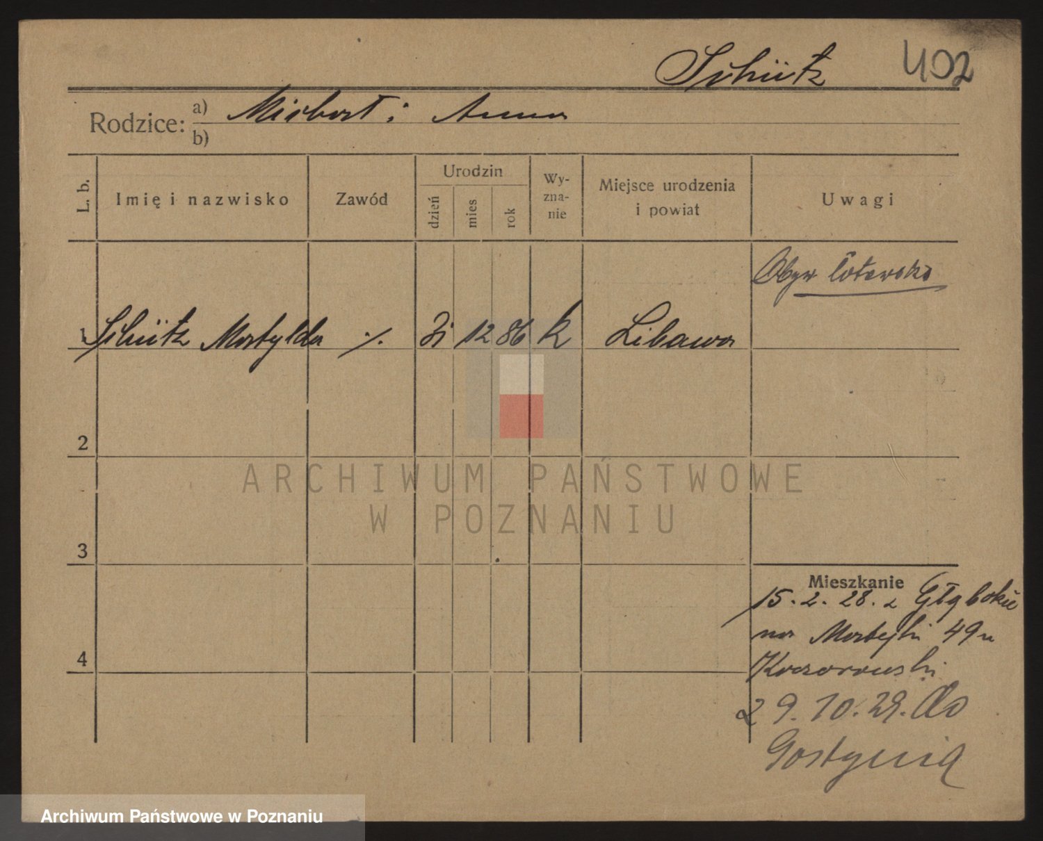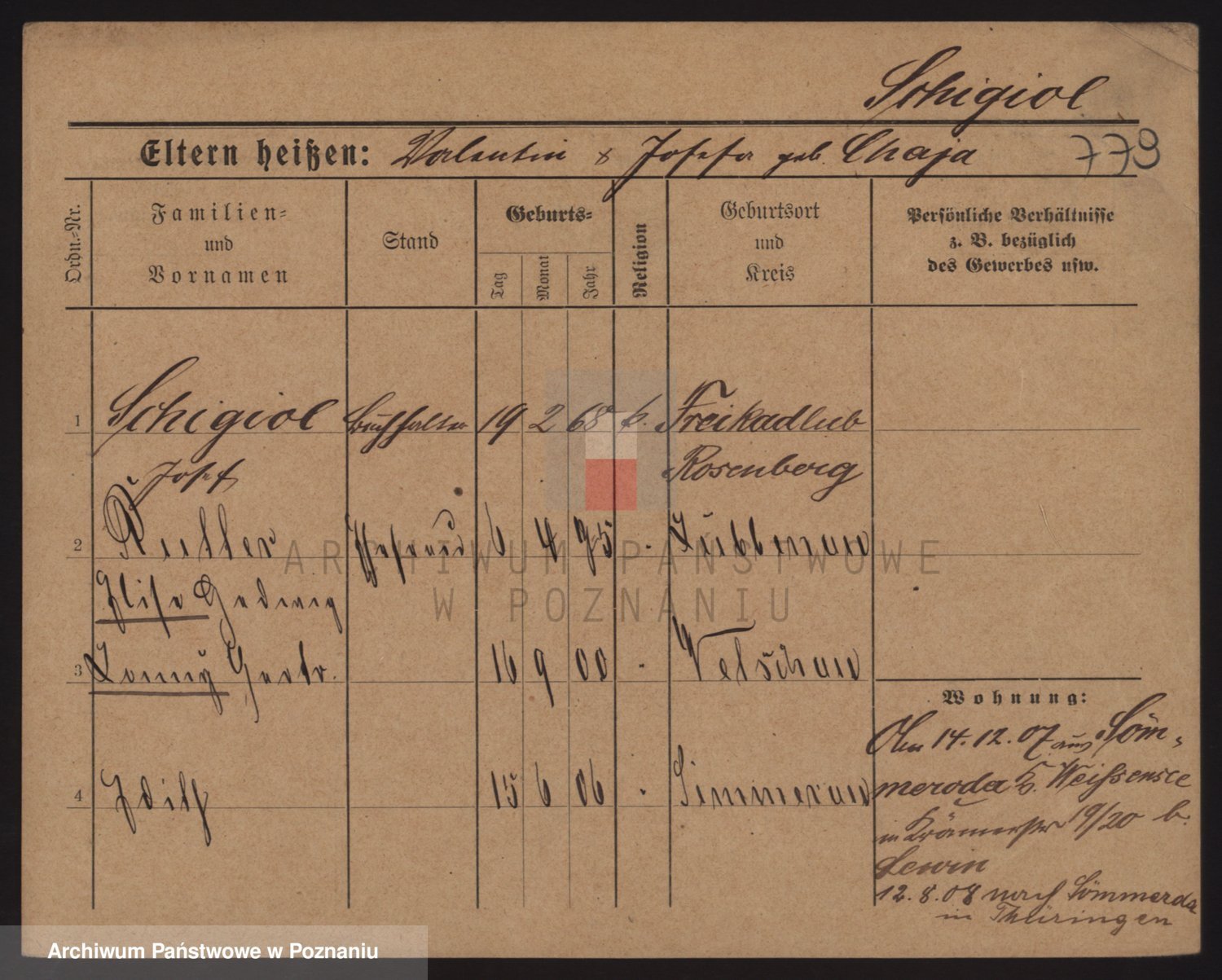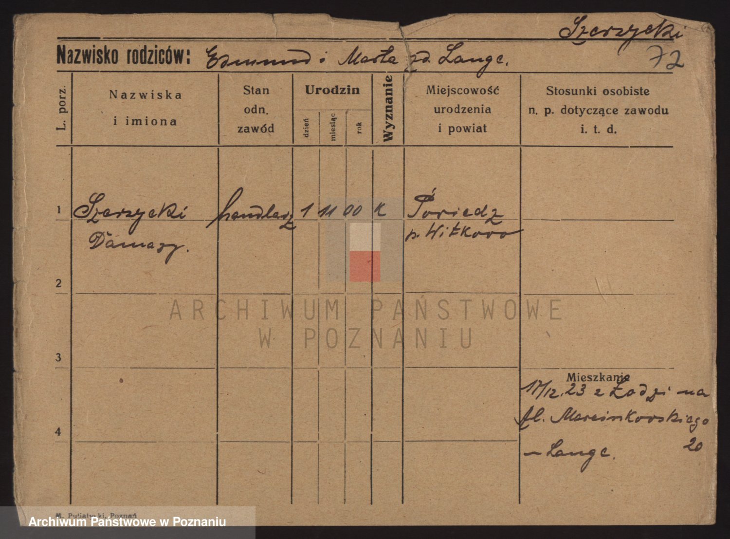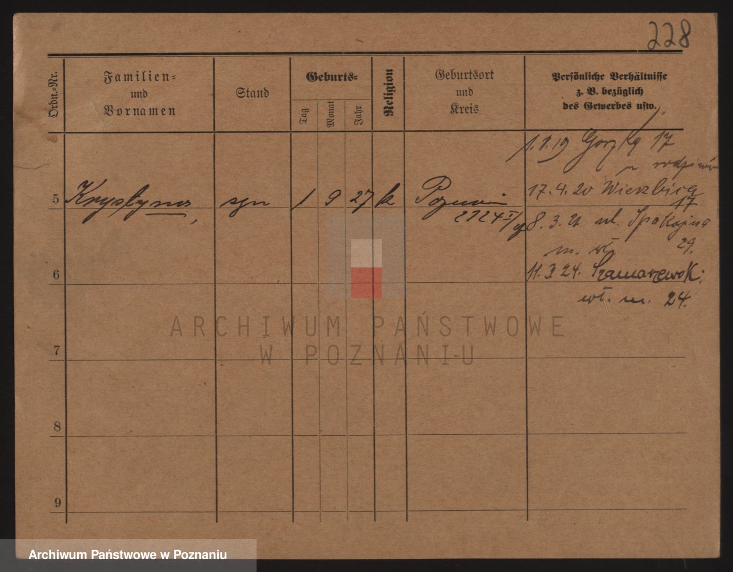 Podgląd karty osobowej dostępny jest po kliknięciu na nazwisko lub ikonkę karty. Można dokonywać powiększenia (ikony na górze) lub przechodzić między kolejnymi skanami (strzałki po bokach).